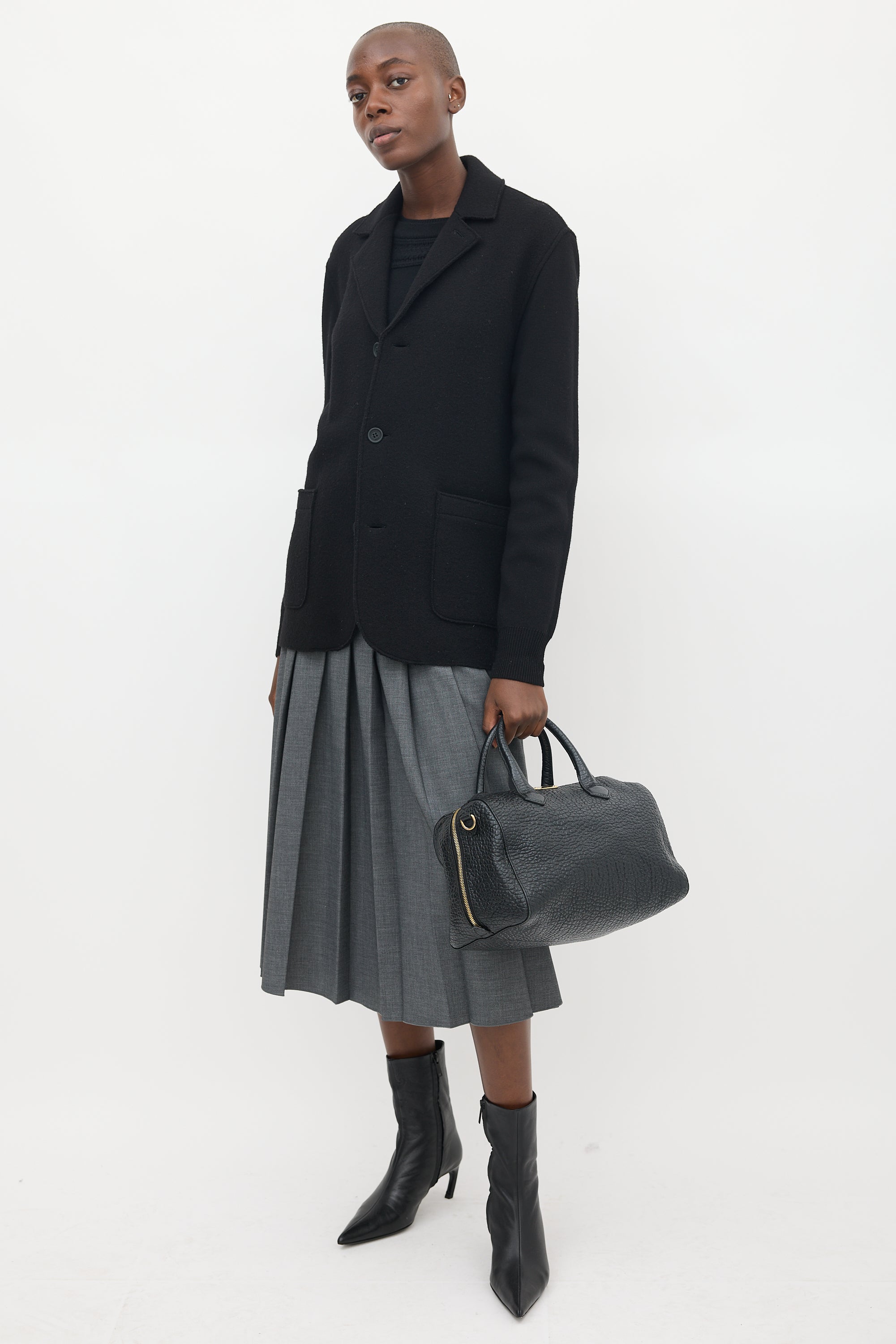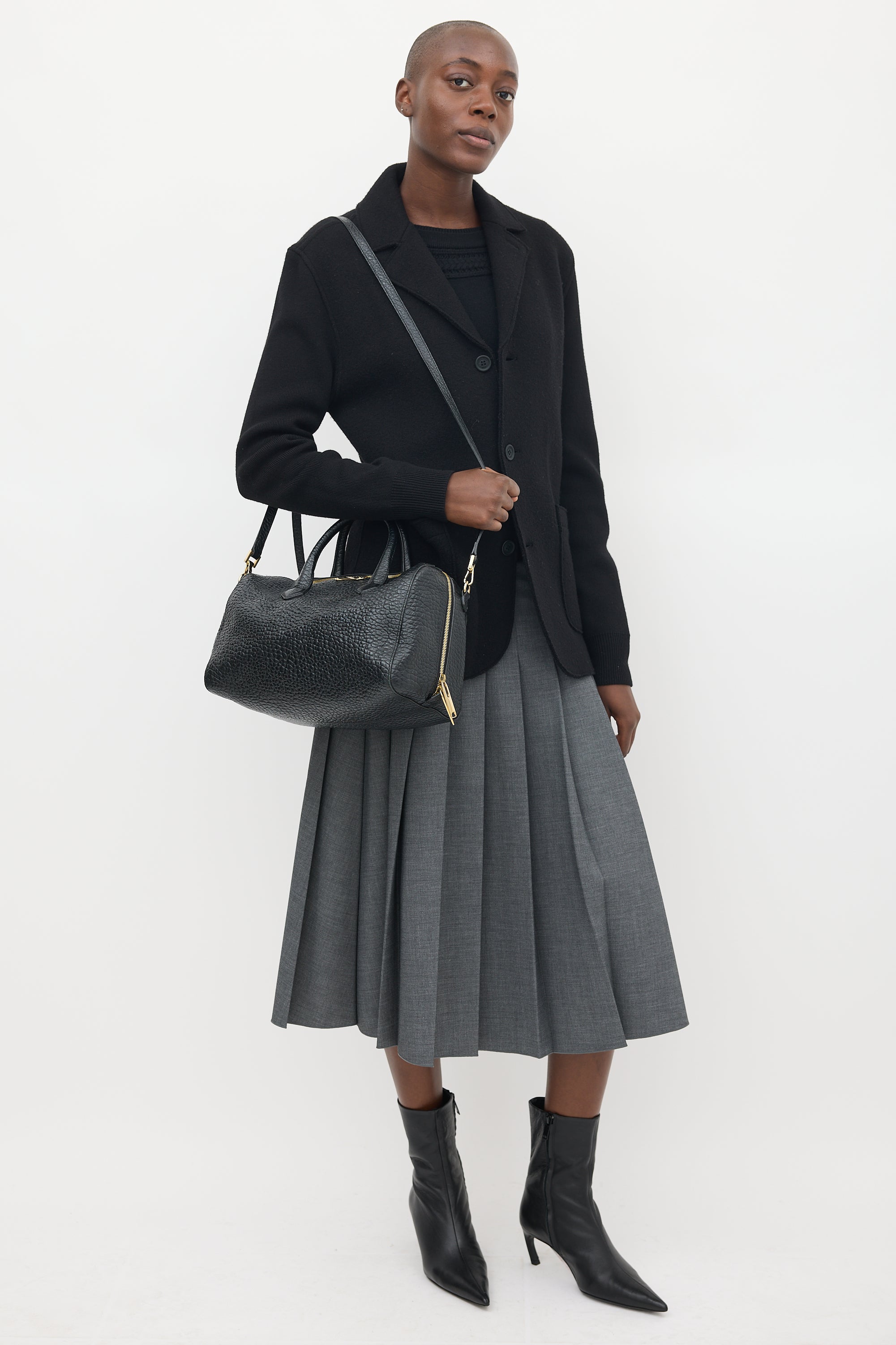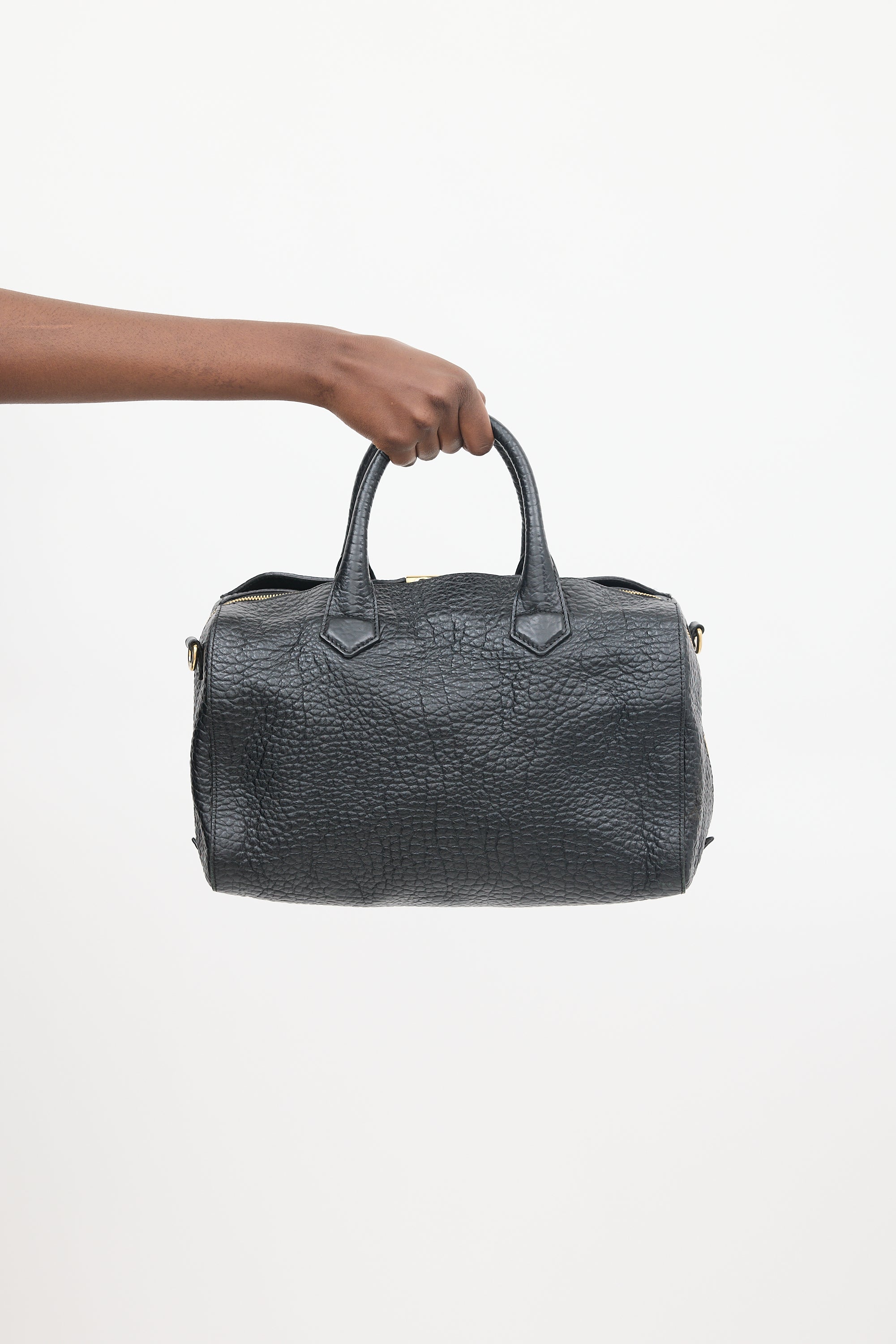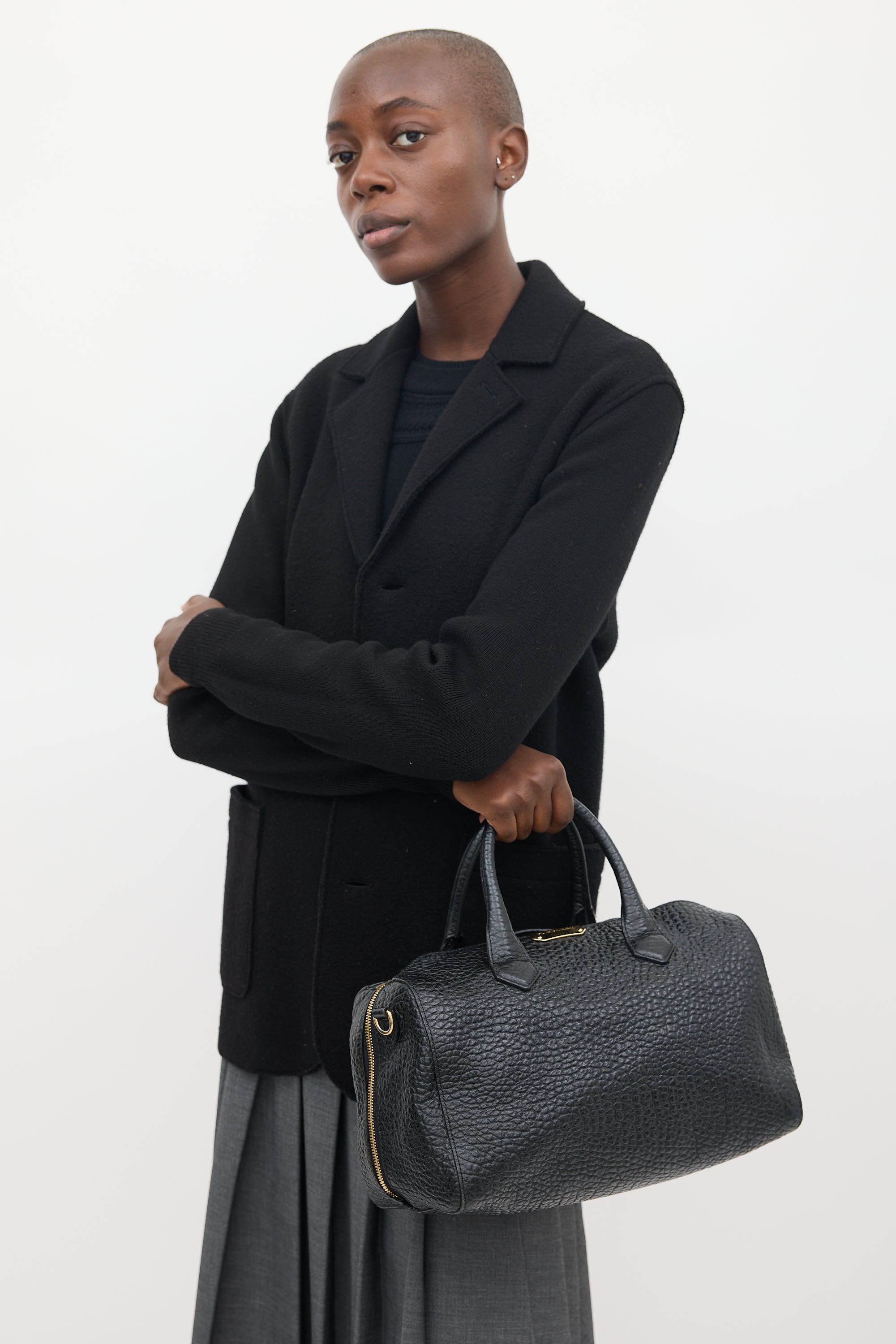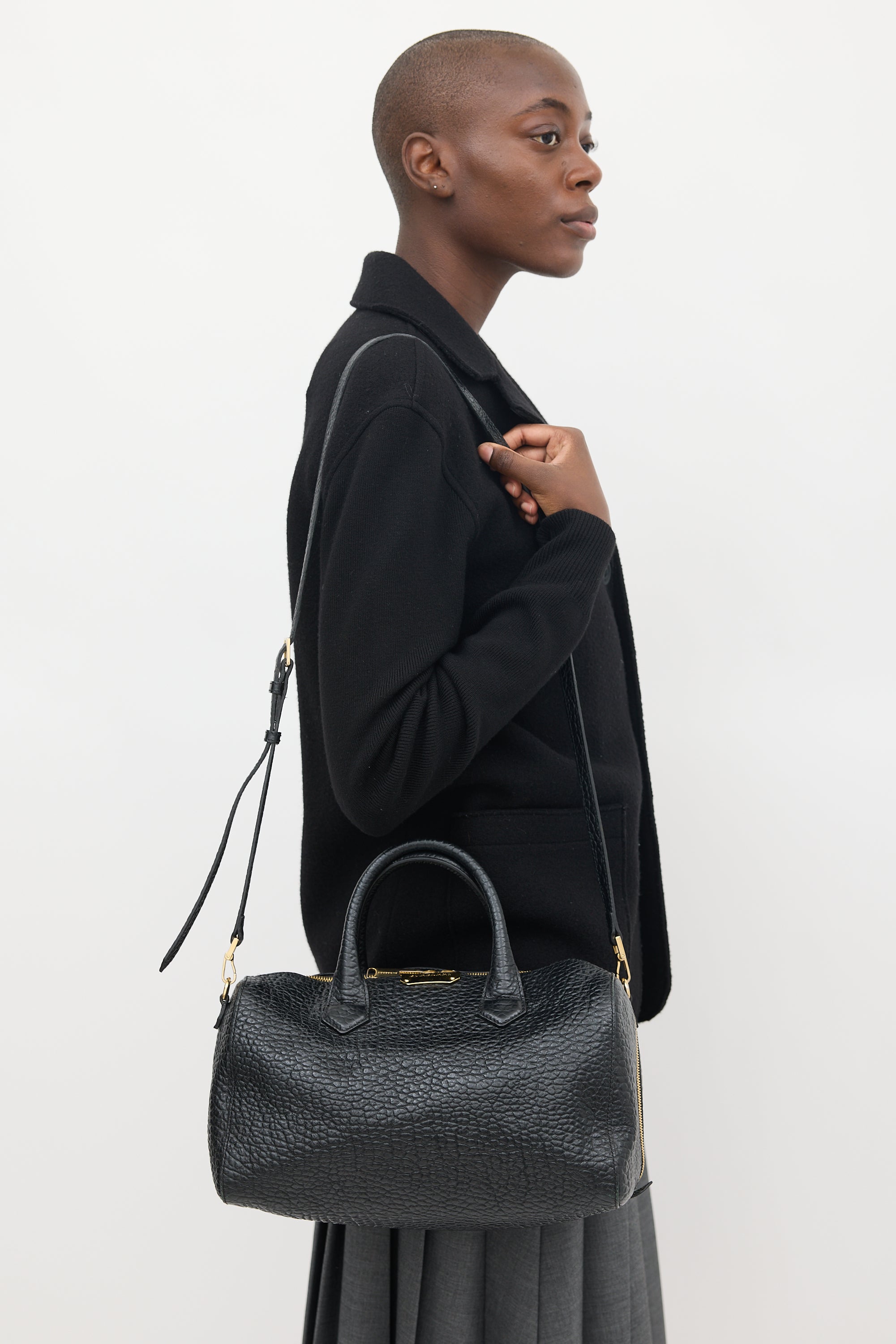 Pre-owned Burberry black grained leather Alchester bowling bag featuring tonal stitching, gold tone hardware, stamped logo hardware accent and exterior slip compartment at front, dual rolled top handles, detachable and adjustable shoulder strap, dual top zip closure, and one lined main compartment with one zip pocket and two slip pockets. Comes with original dust bag.