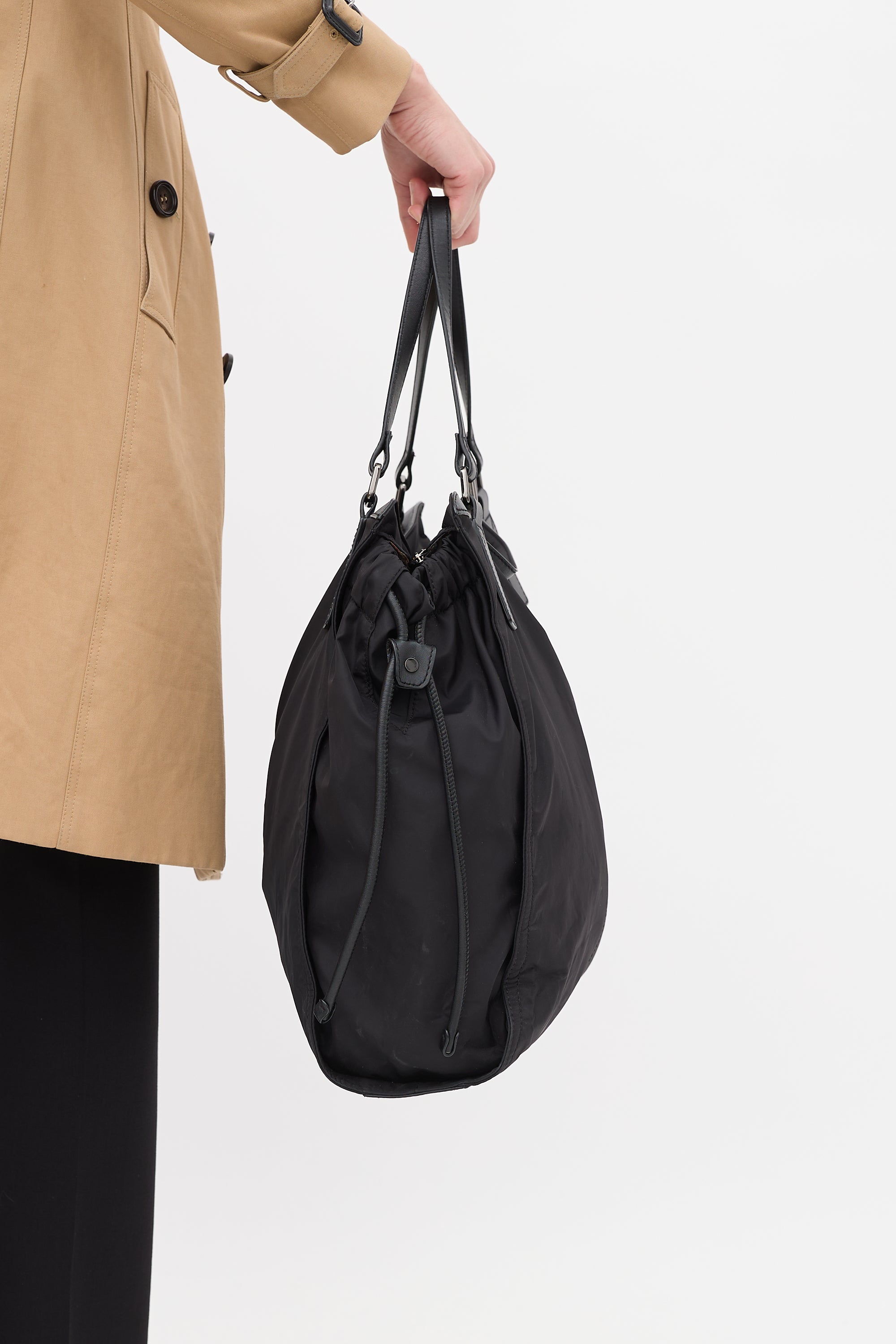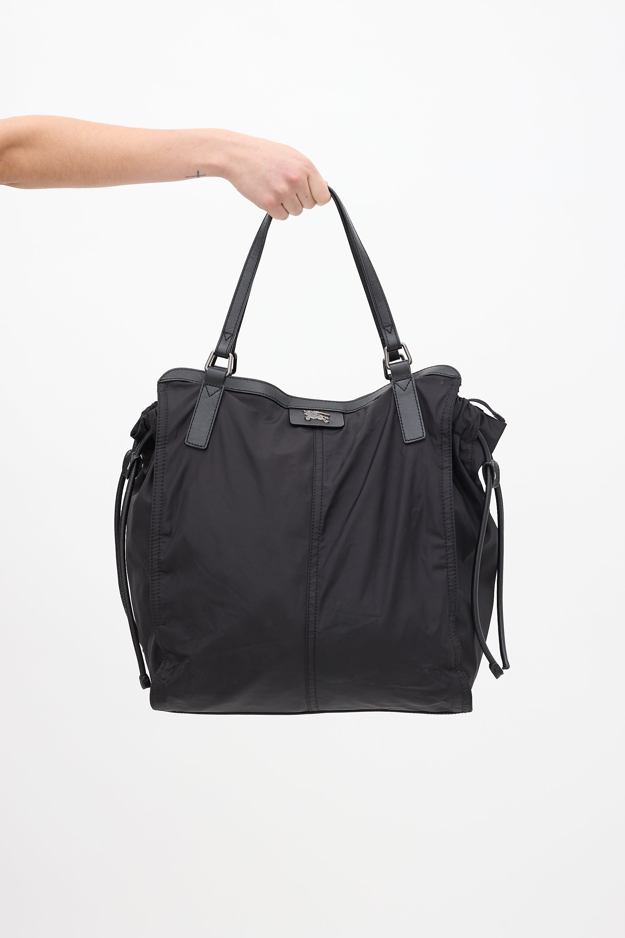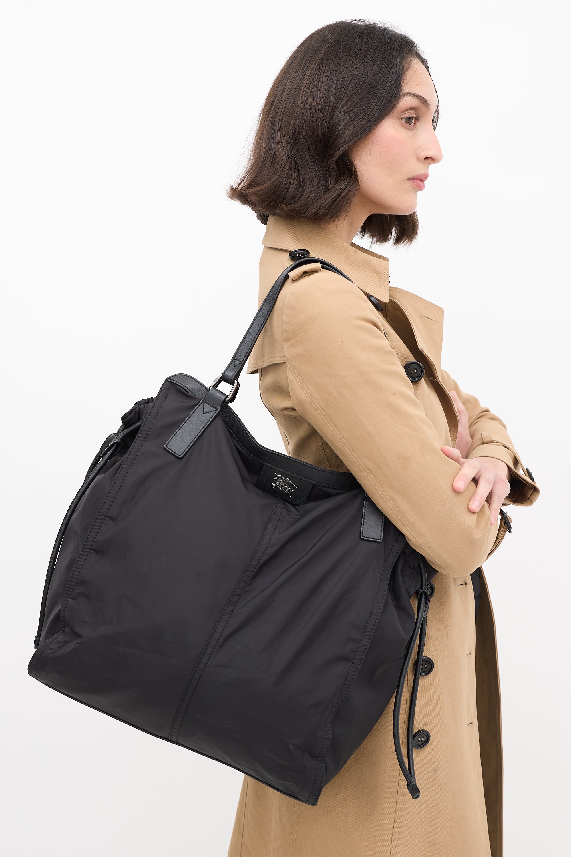 Pre-owned Burberry black nylon Buckleigh tote bag featuring tonal leather trim, dual flat top handles, gunmetal Equestrian Knight Design logo at front, cinched sides, zip closure at top, signature Nova Check printed lining, and zip pocket inside.