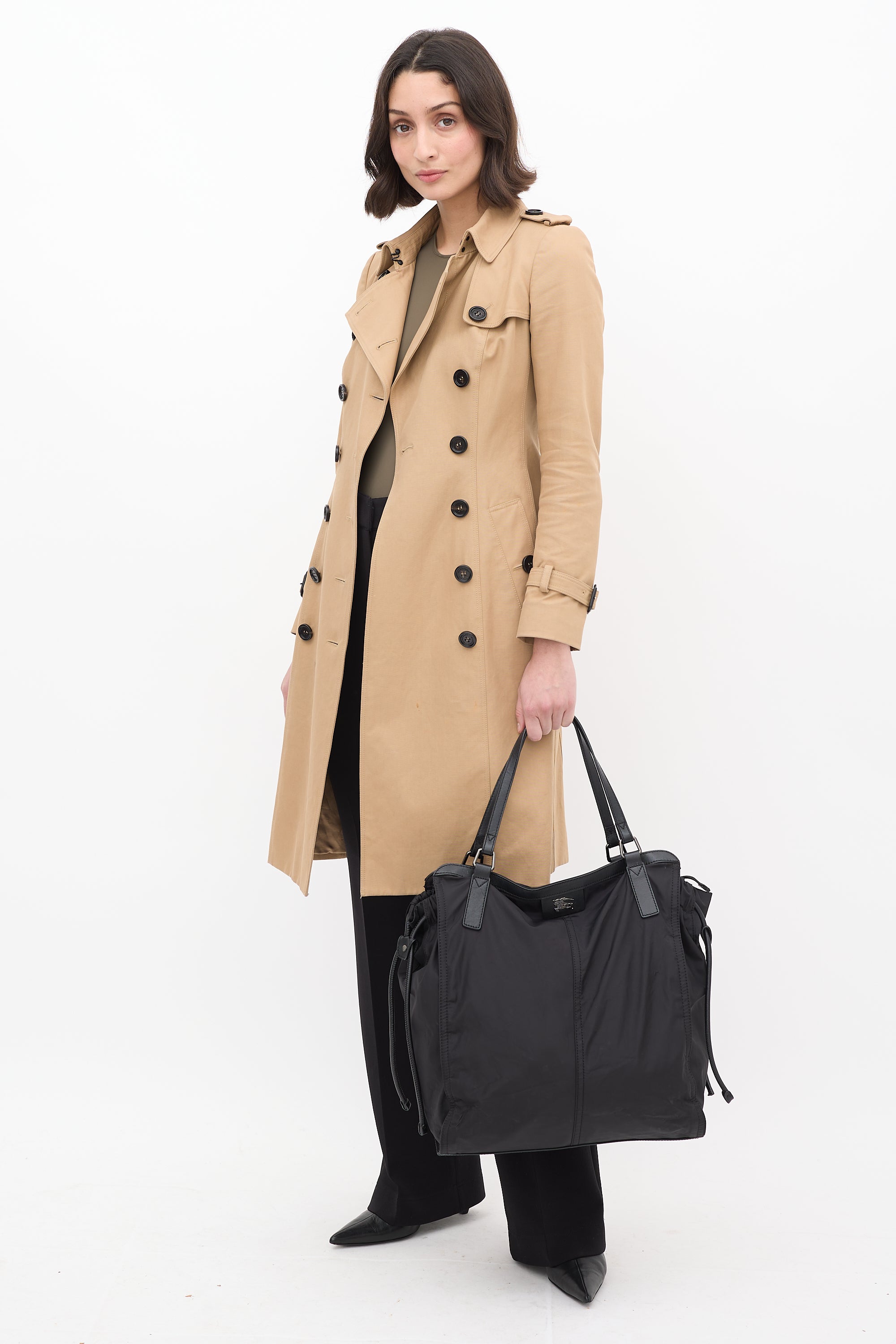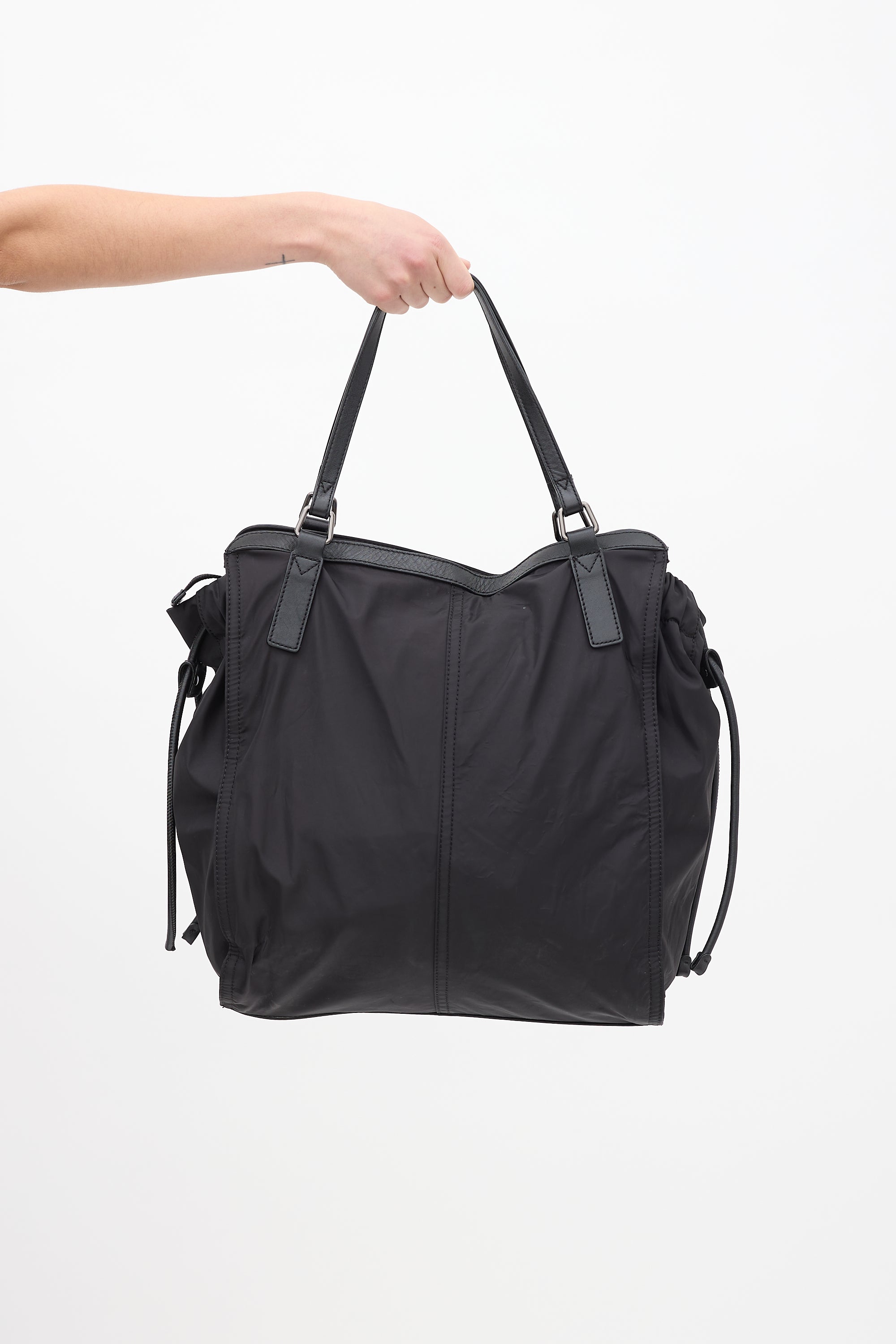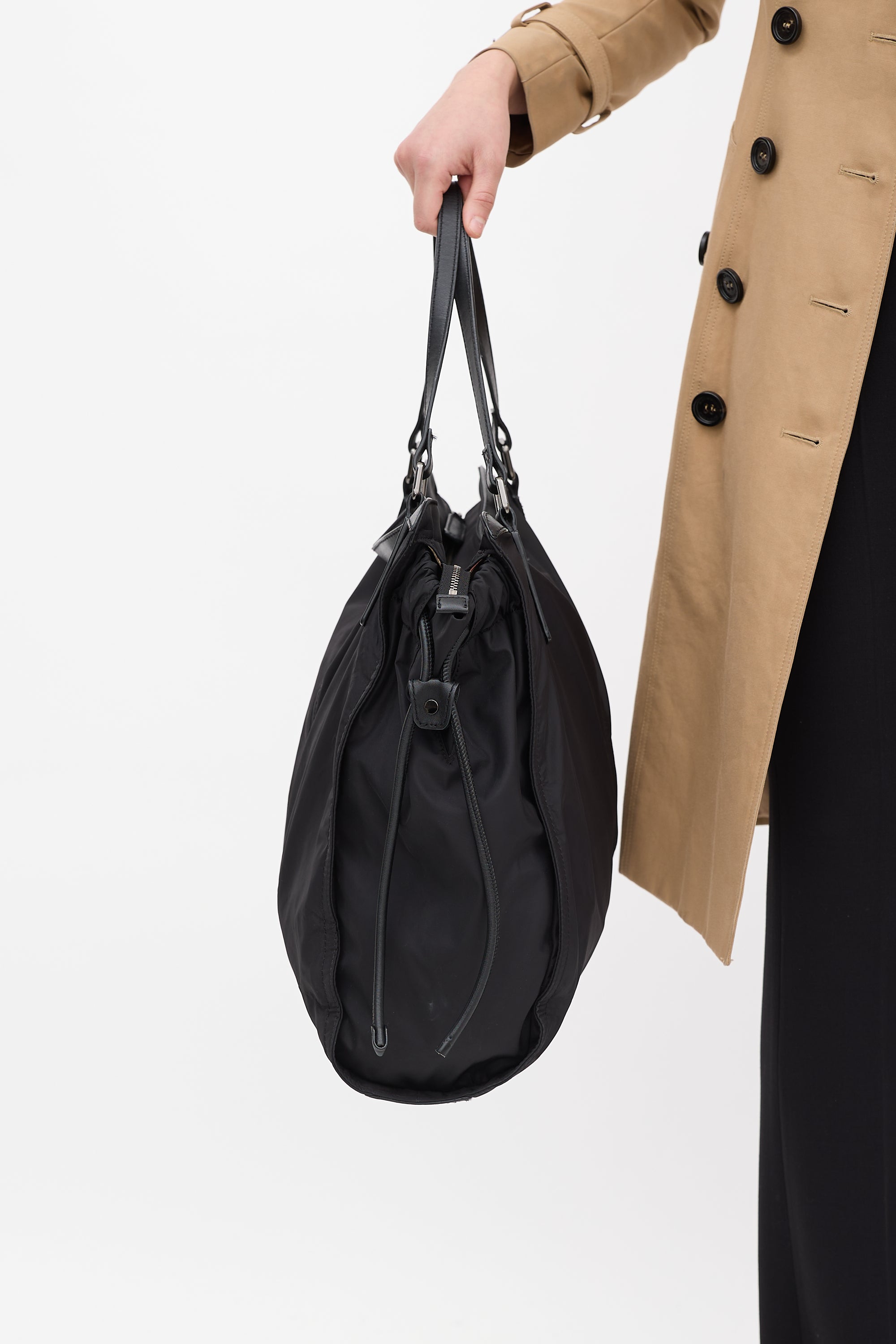 Pre-owned Burberry black nylon Buckleigh tote bag featuring tonal leather trim, dual flat top handles, gunmetal Equestrian Knight Design logo at front, cinched sides, zip closure at top, signature Nova Check printed lining, and zip pocket inside.
