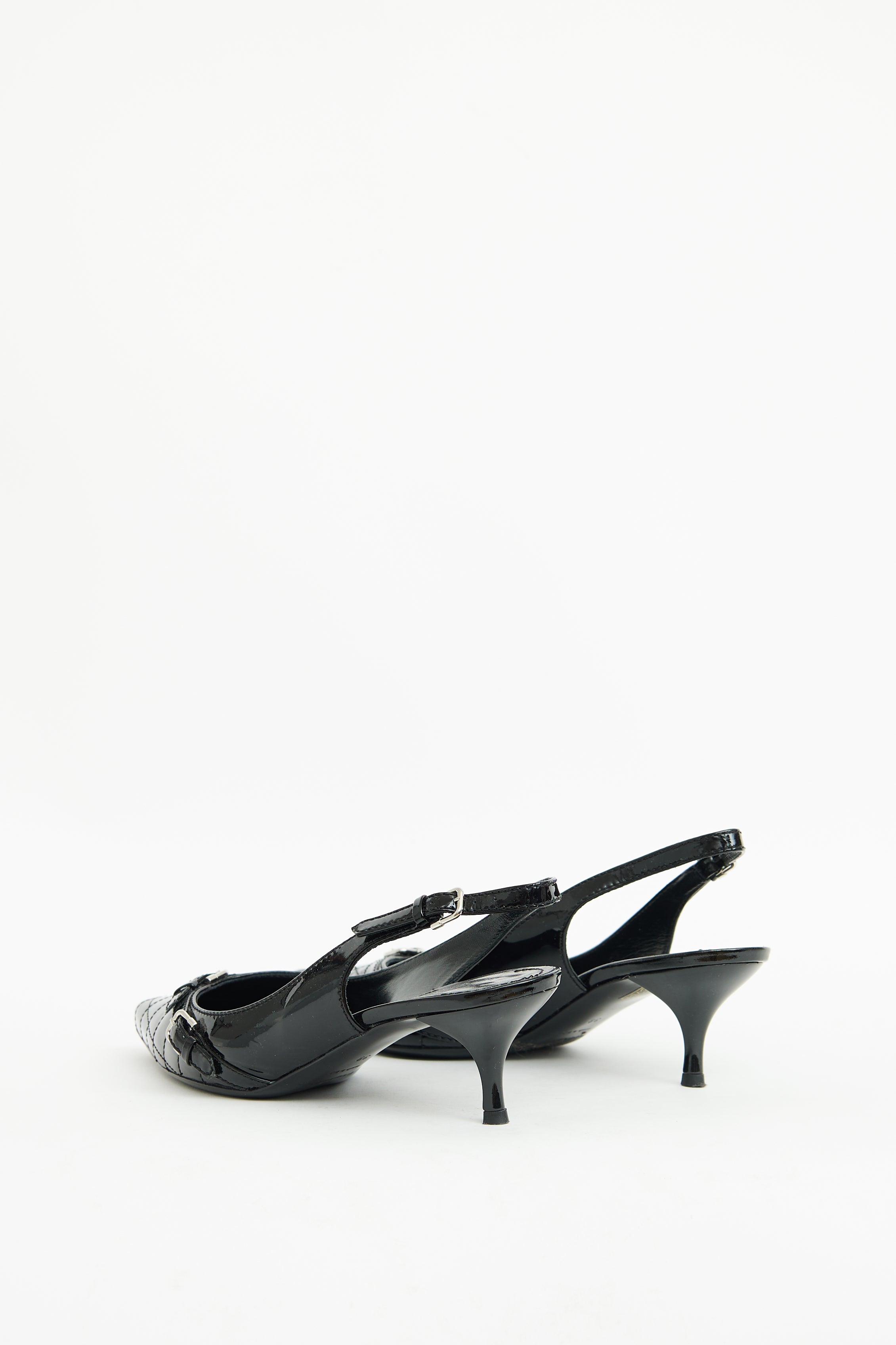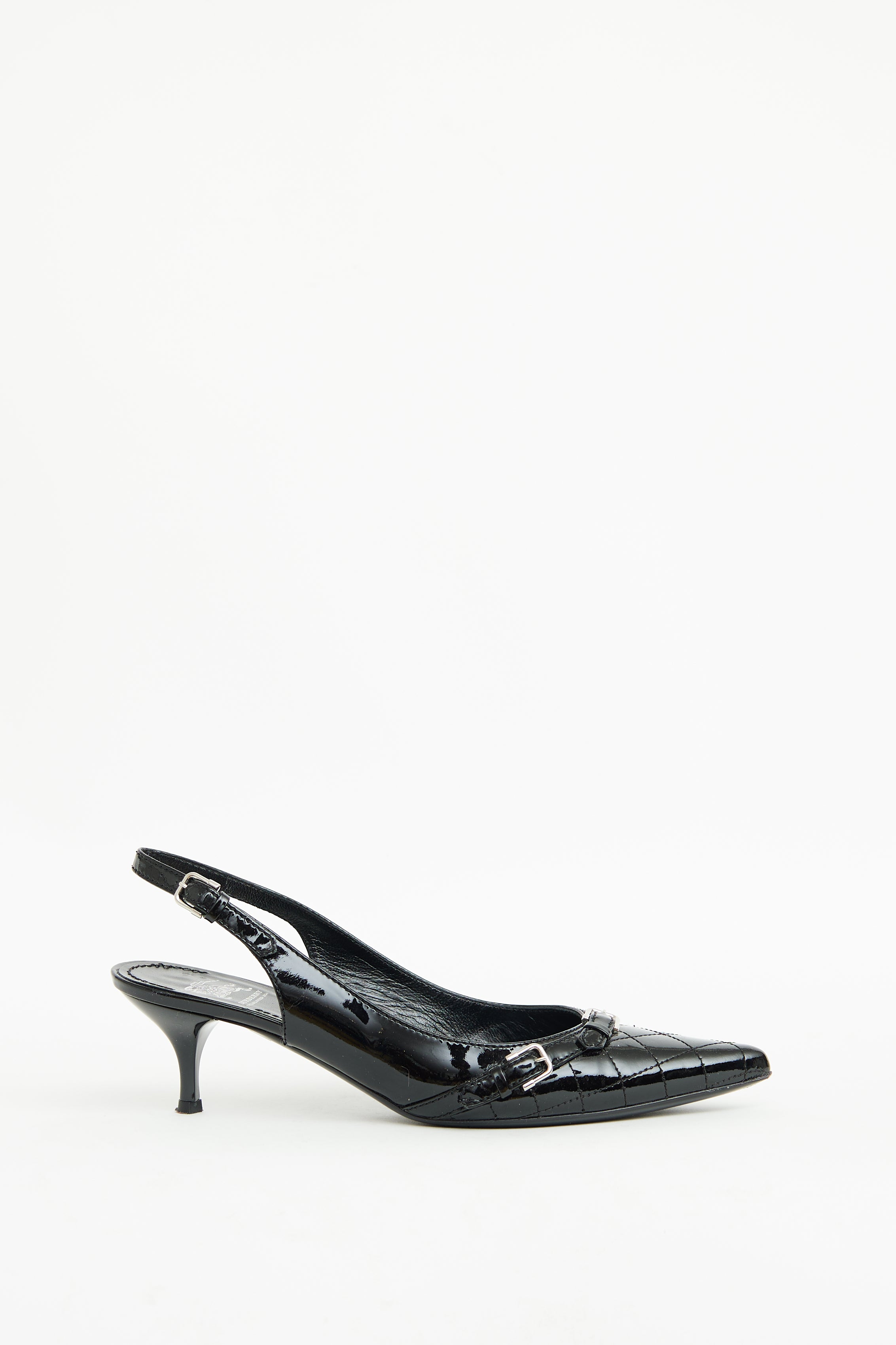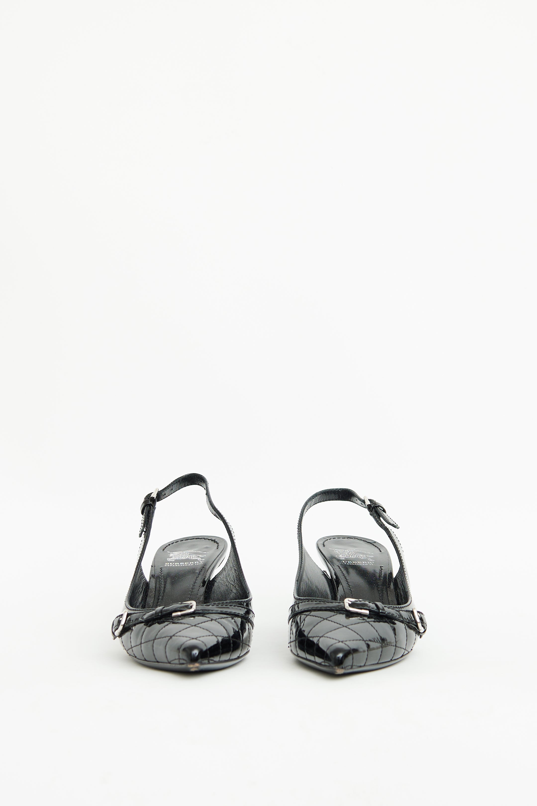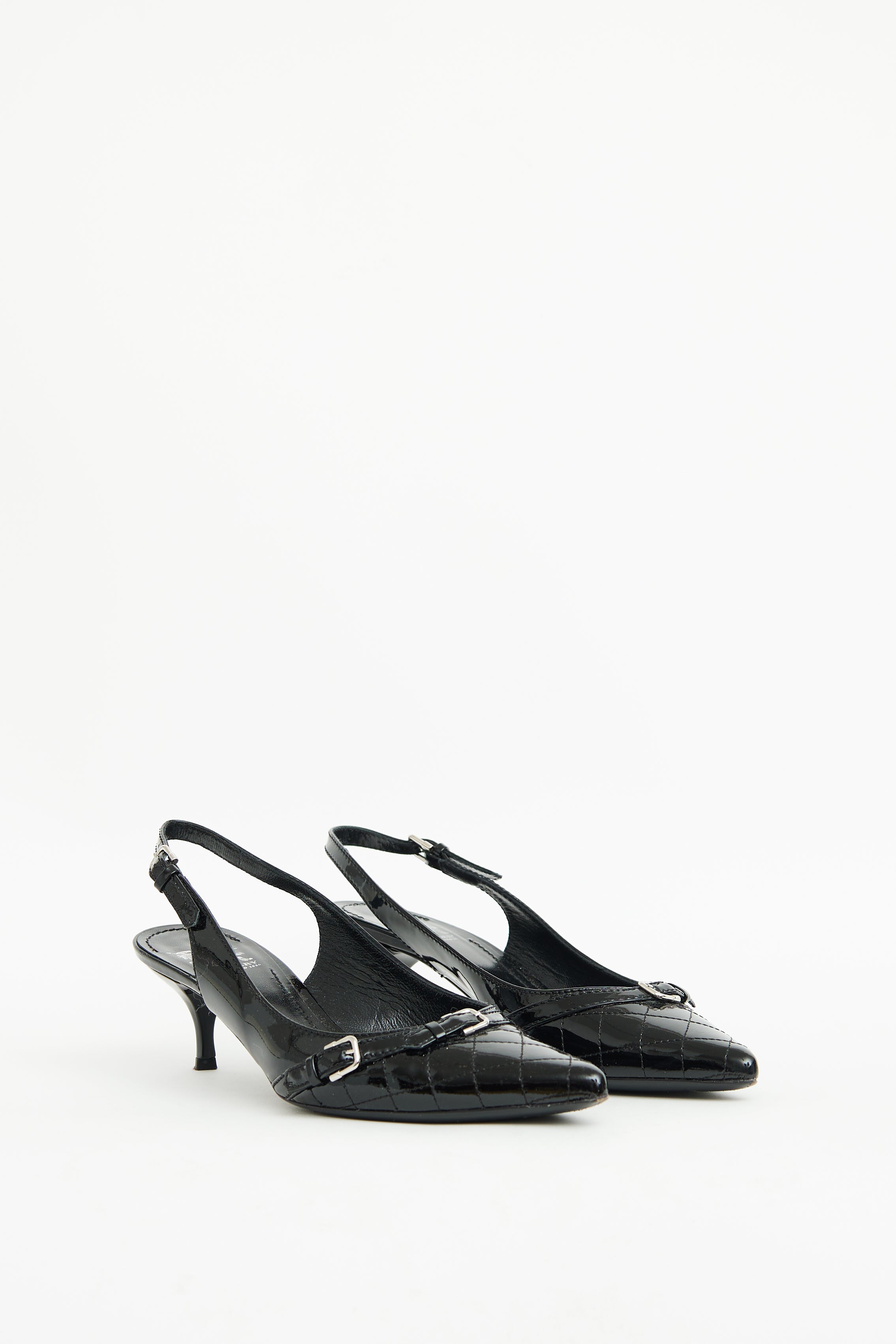 Pre-owned Burberry black patent kitten heels featuring pointed toe, quilted stitching, silver tone hardware, buckle detailing on toe box and adjustable strap on counter.