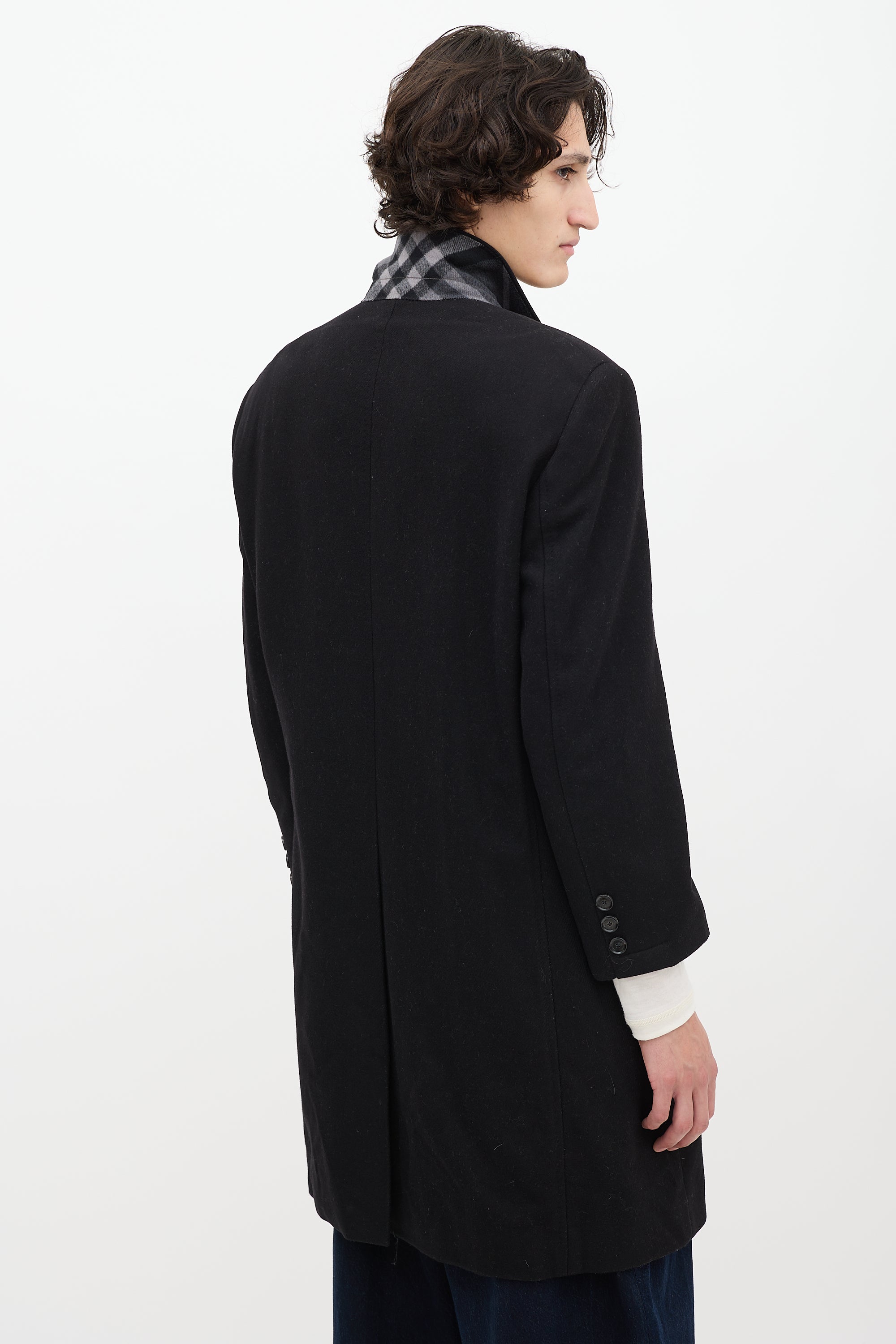 Pre-owned Burberry black wool blend mid length coat featuring a notched collar with grey signature Nova Check facing, button up front, welt pocket at left chest, flap pockets at front hip, two interior welt pockets at chest, buttoned back vent, padded shoulders, and long sleeves with buttoned cuffs.