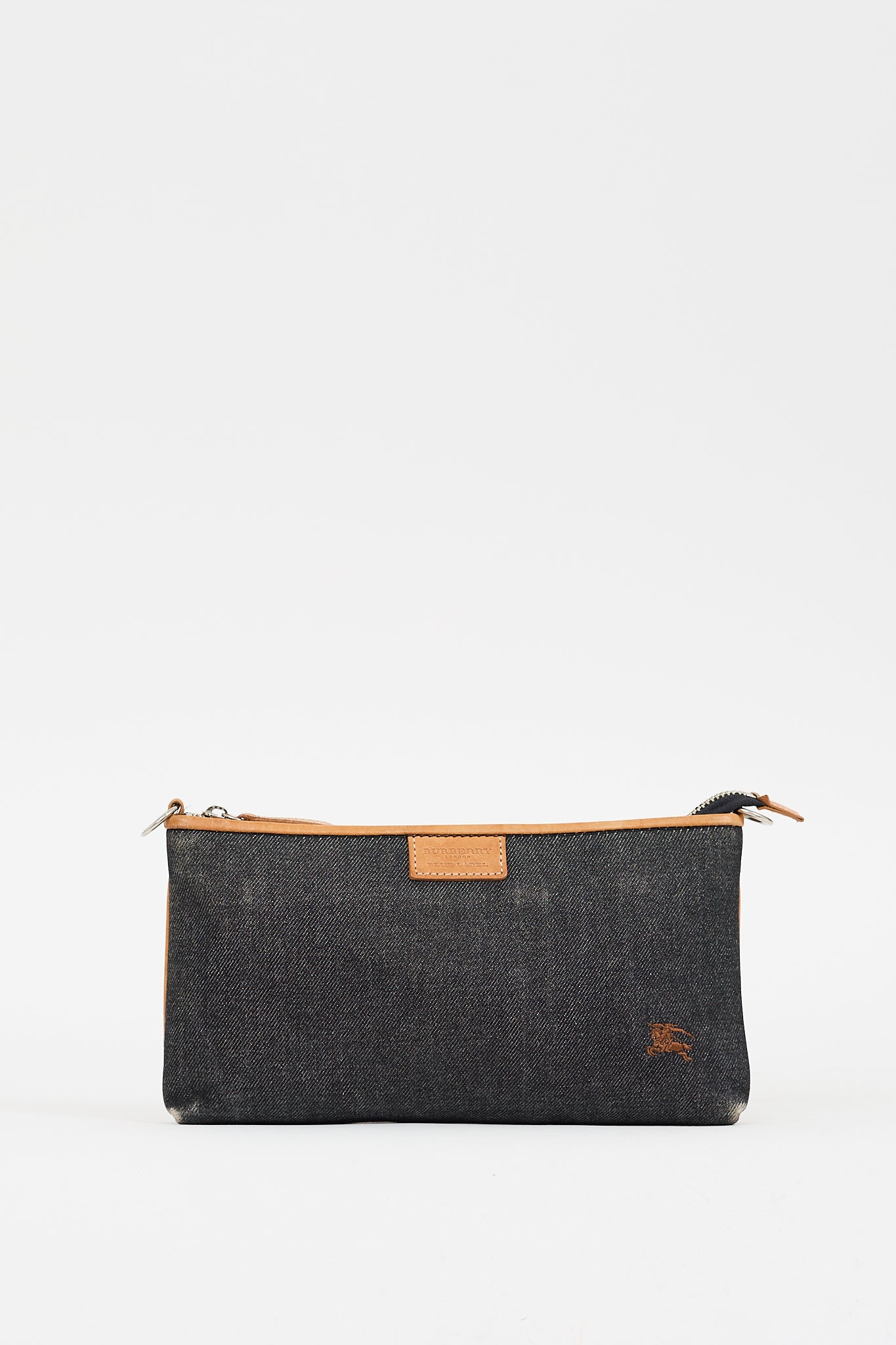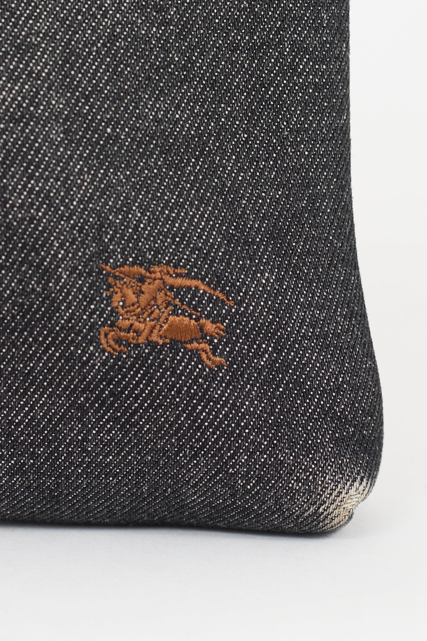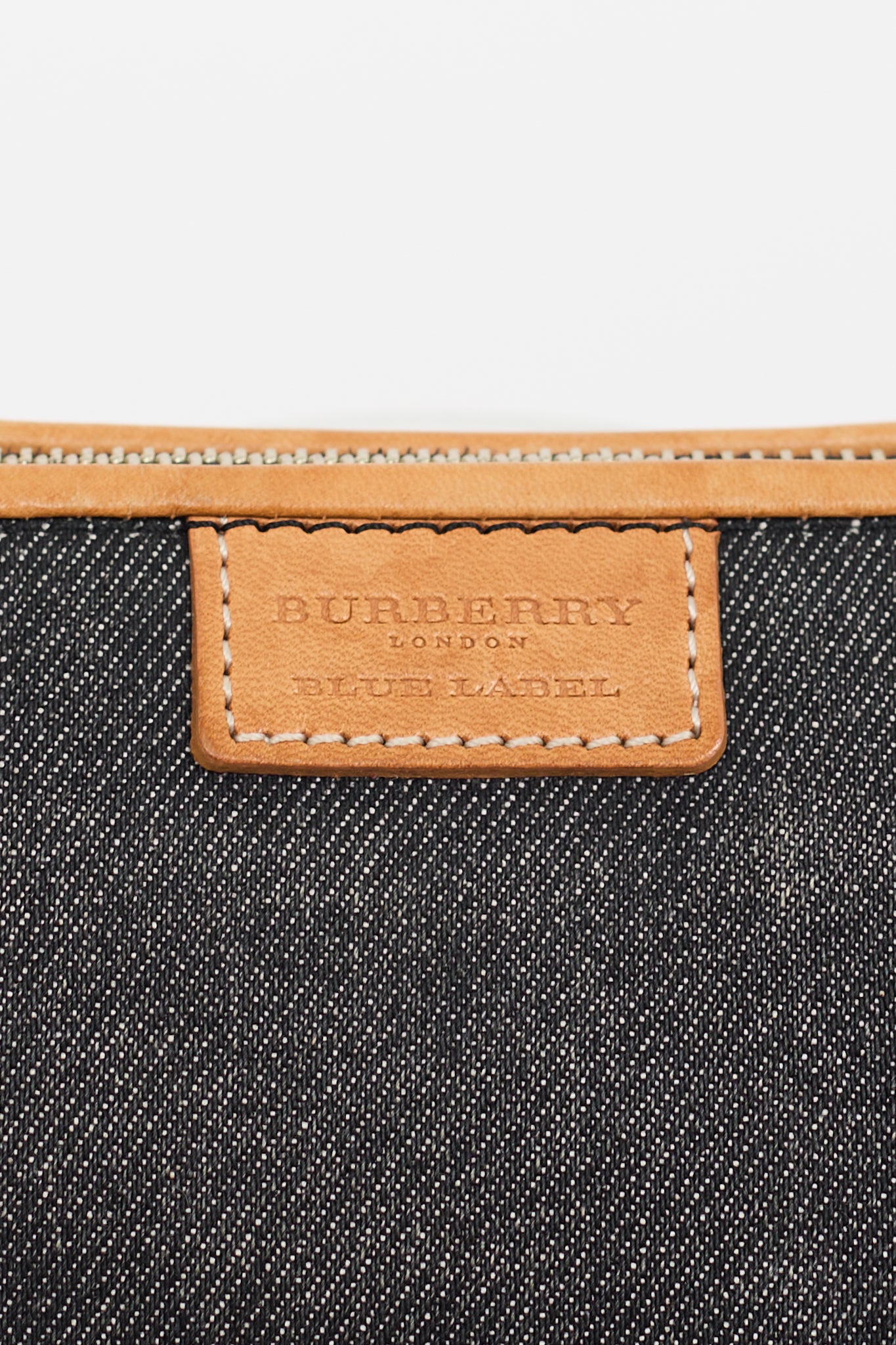 Pre-owned Burberry Blue Label vintage black denim bag featuring brown leather trim, embroidered EKD logo at front, zip closure at top, one zip pocket at back, one detachable fixed and one adjustable straps, one main compartment, and two pockets inside.
