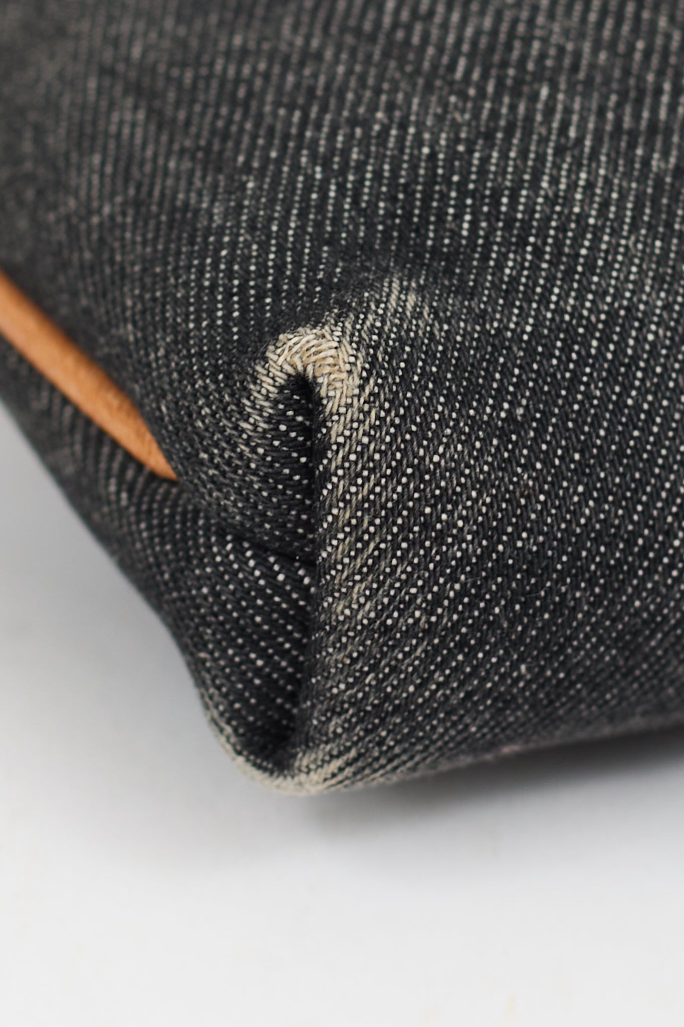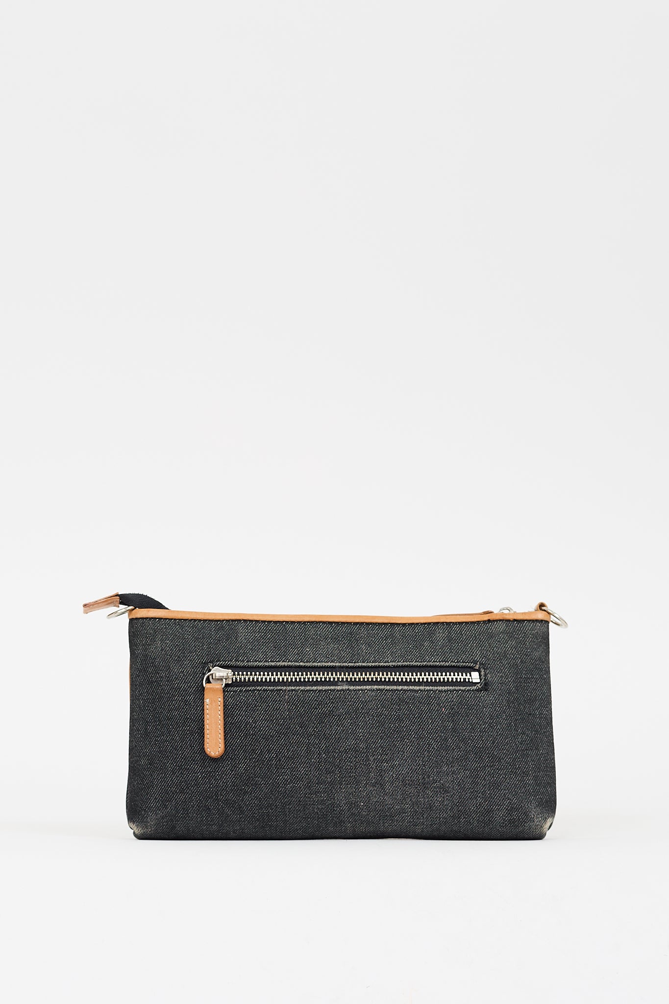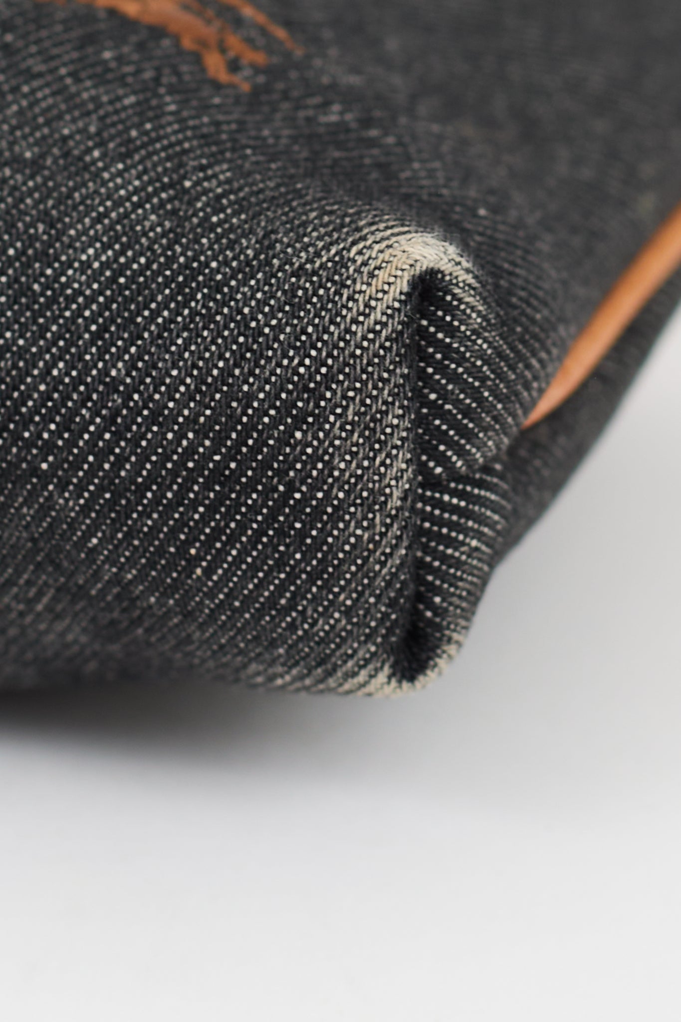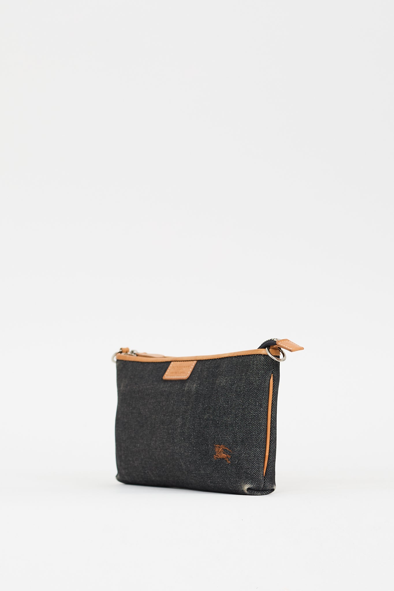 Pre-owned Burberry Blue Label vintage black denim bag featuring brown leather trim, embroidered EKD logo at front, zip closure at top, one zip pocket at back, one detachable fixed and one adjustable straps, one main compartment, and two pockets inside.