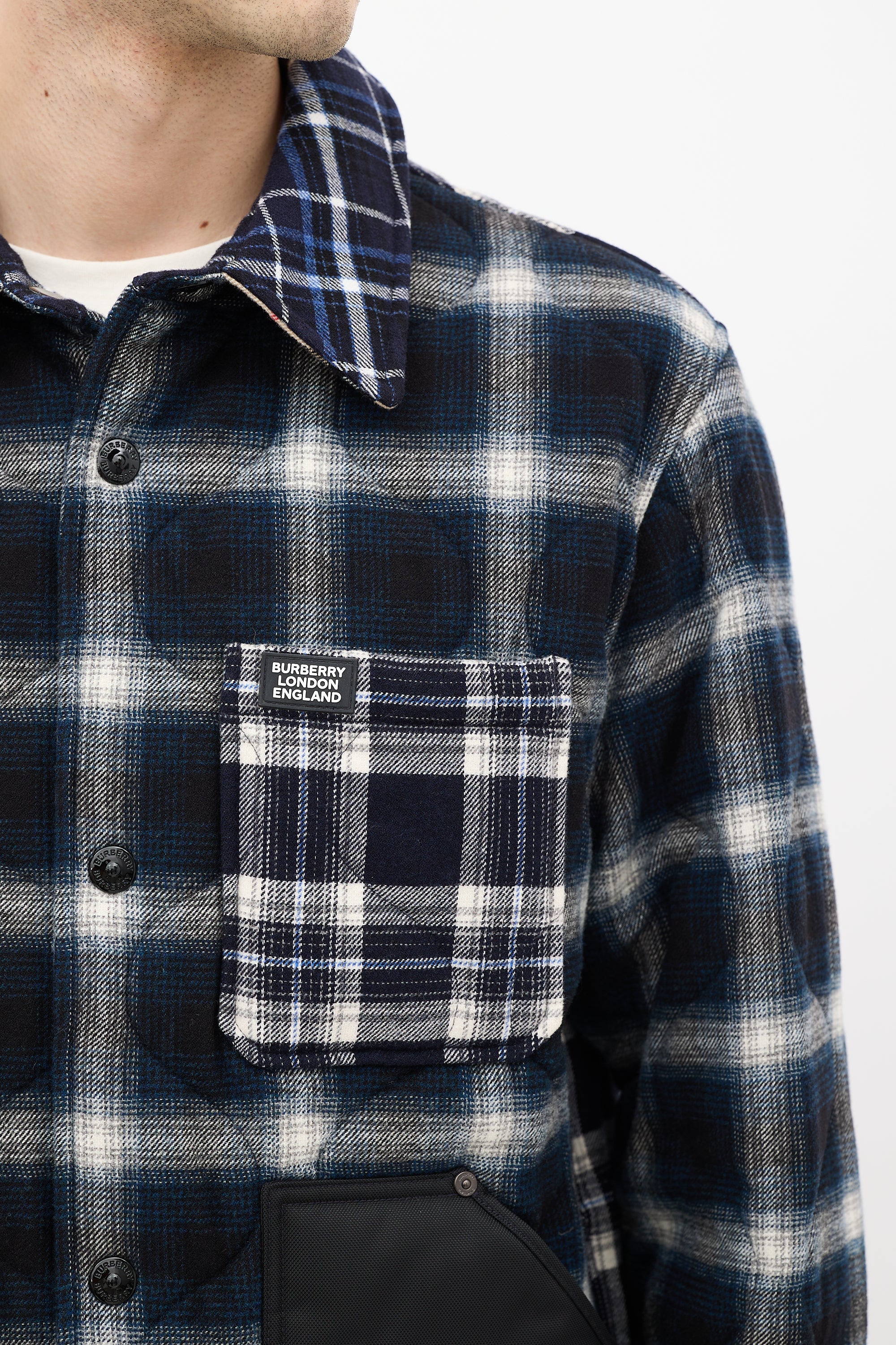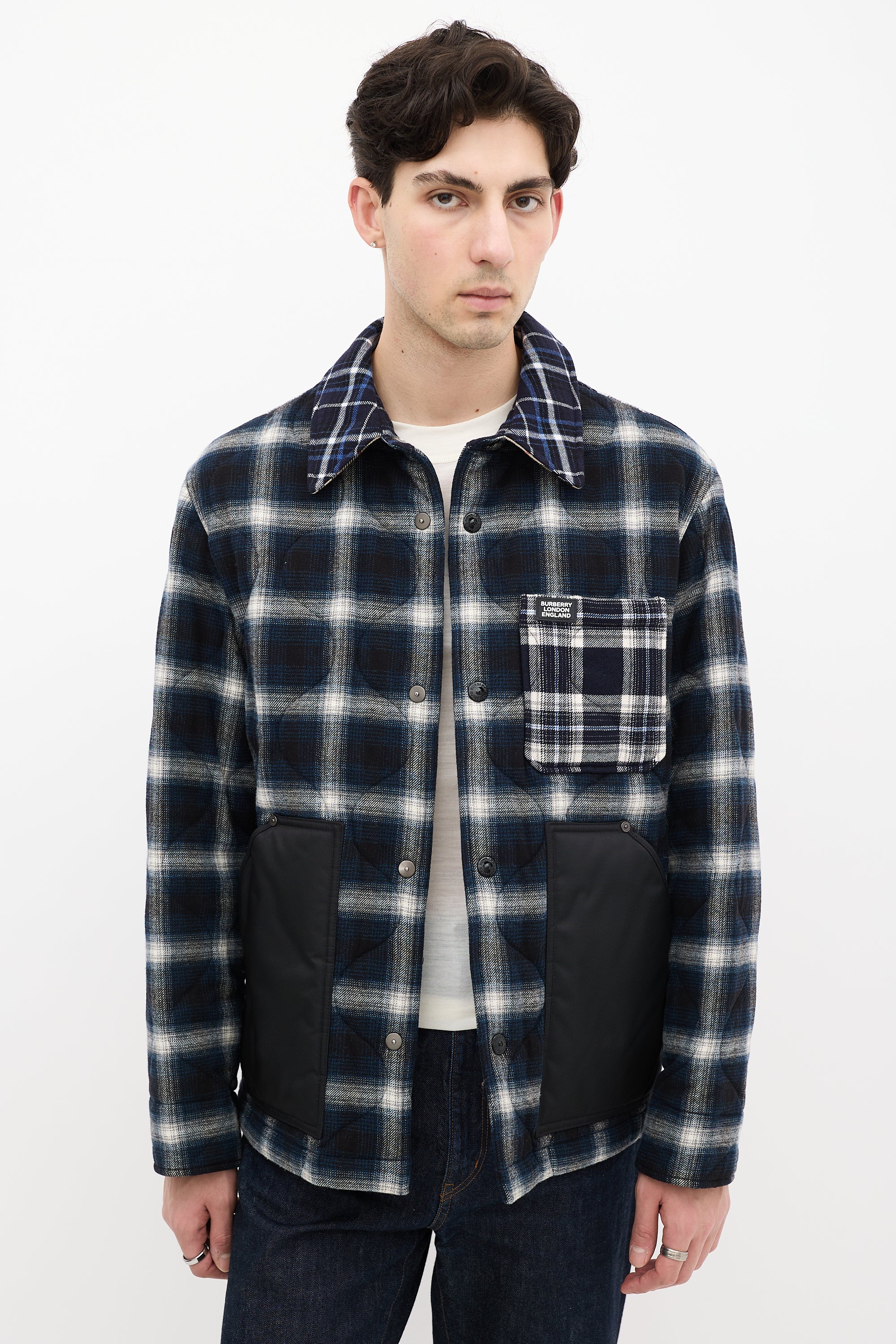 Pre-owned Burberry blue and white wool quilted plaid jacket featuring contrast plaid pointed collar, button up front, patch pocket at left chest with rubberized logo, two black slip patch pockets at waist, long sleeves with snap buttoned cuffs, one interior patch pocket, and contrast plaid back. Lined.
