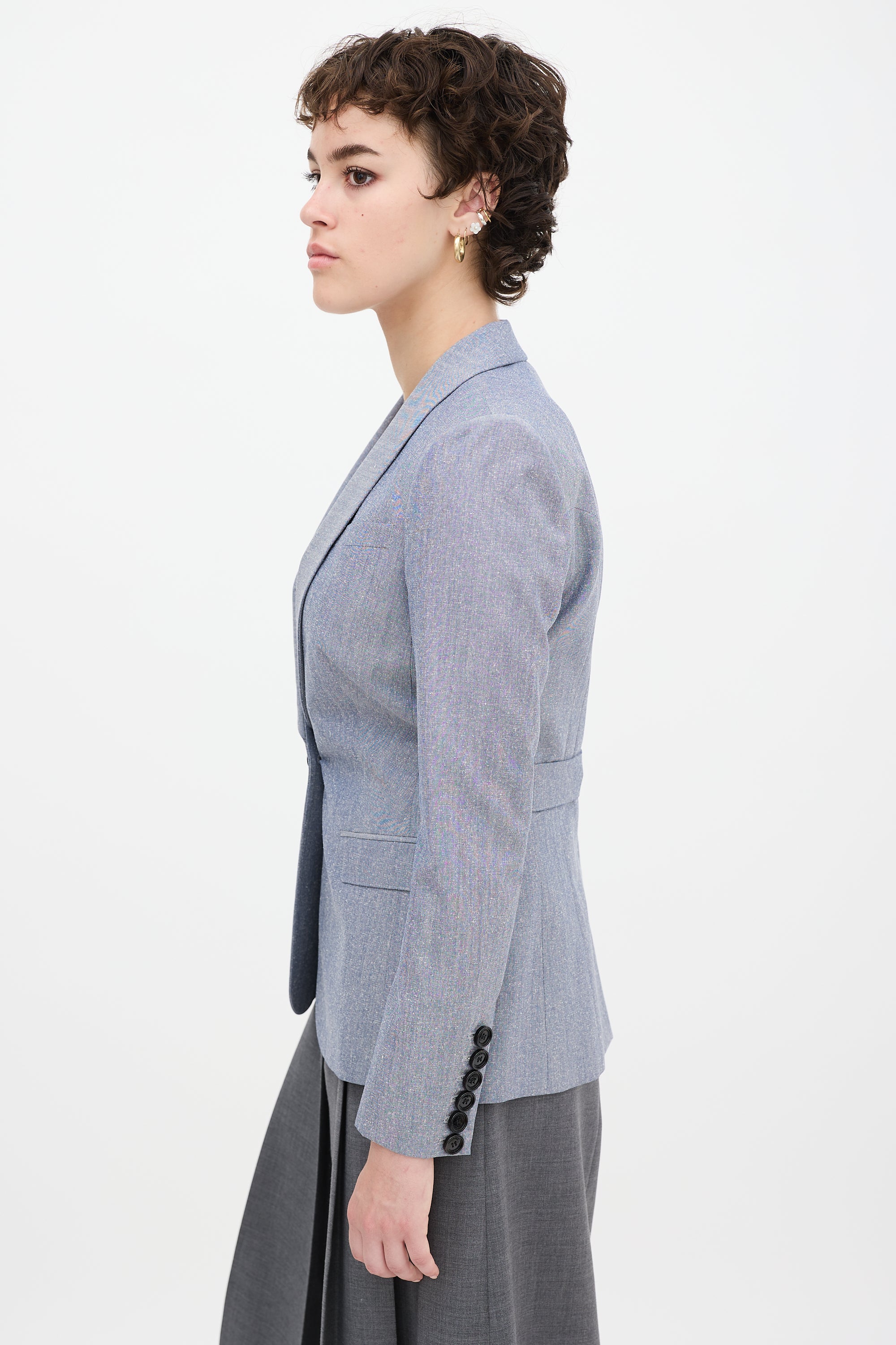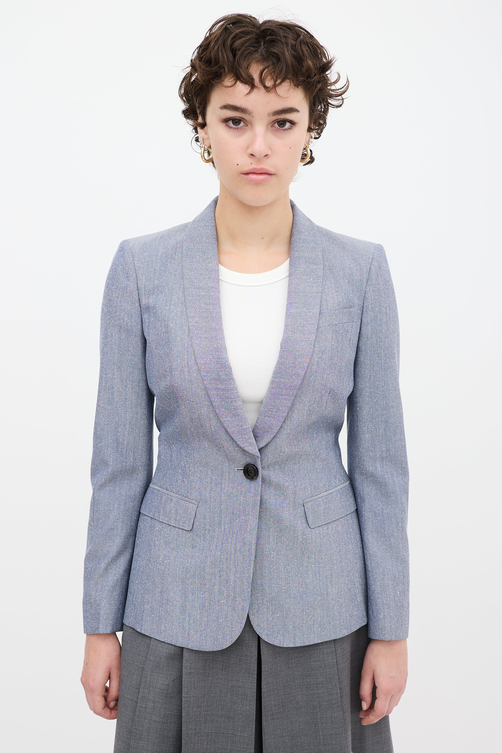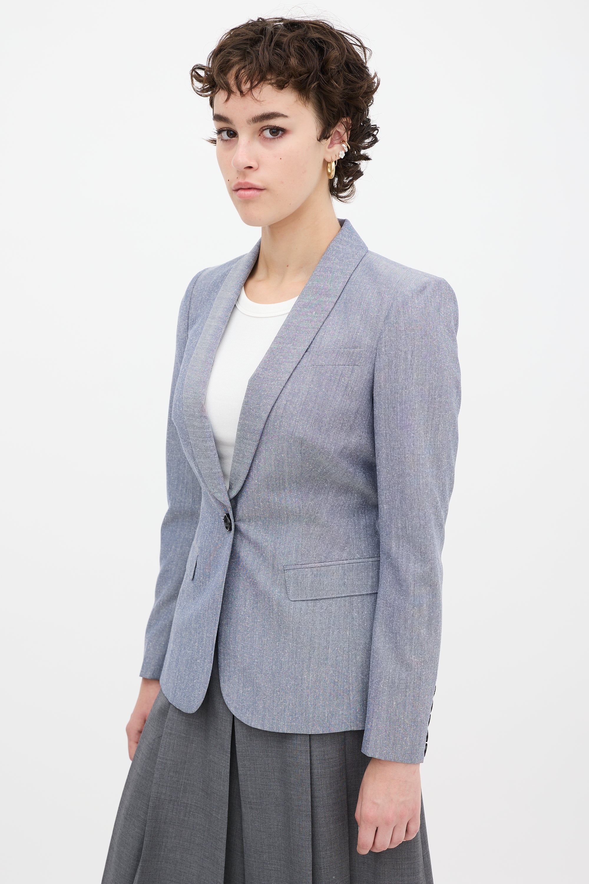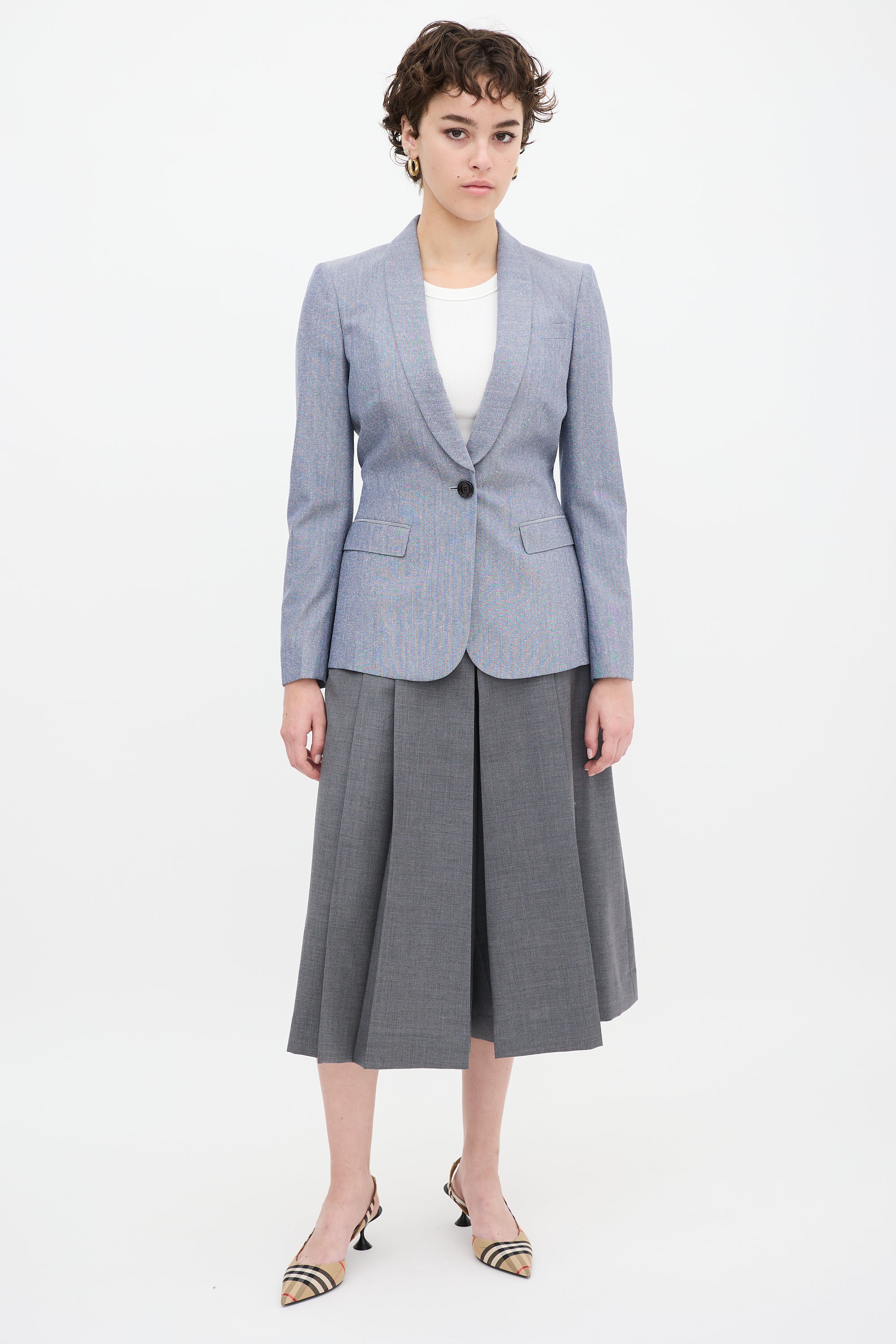 Pre-owned Burberry blue wool and silk blend blazer featuring a shawl collar, single front button, slip pocket at left chest, two front flap pockets, back martingale strap, back vent, padded shoulders, and long sleeves with buttoned cuffs. Lined.