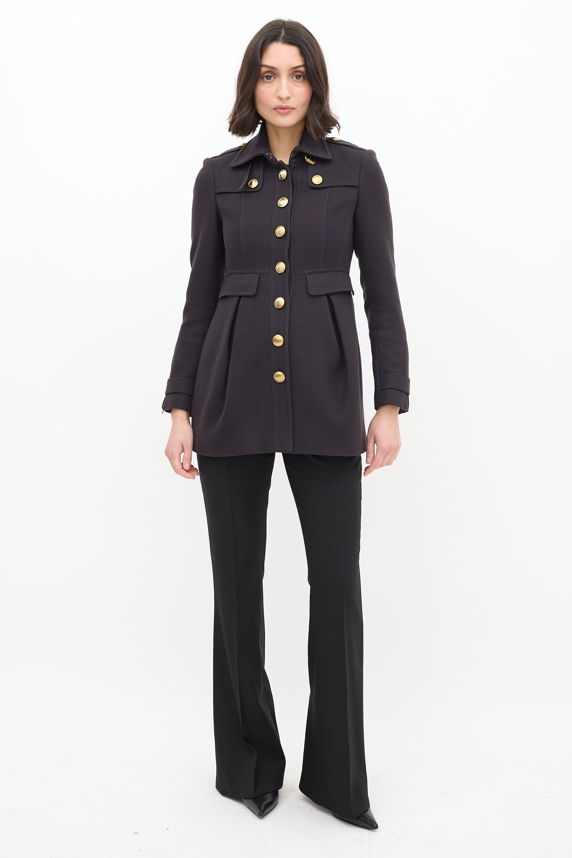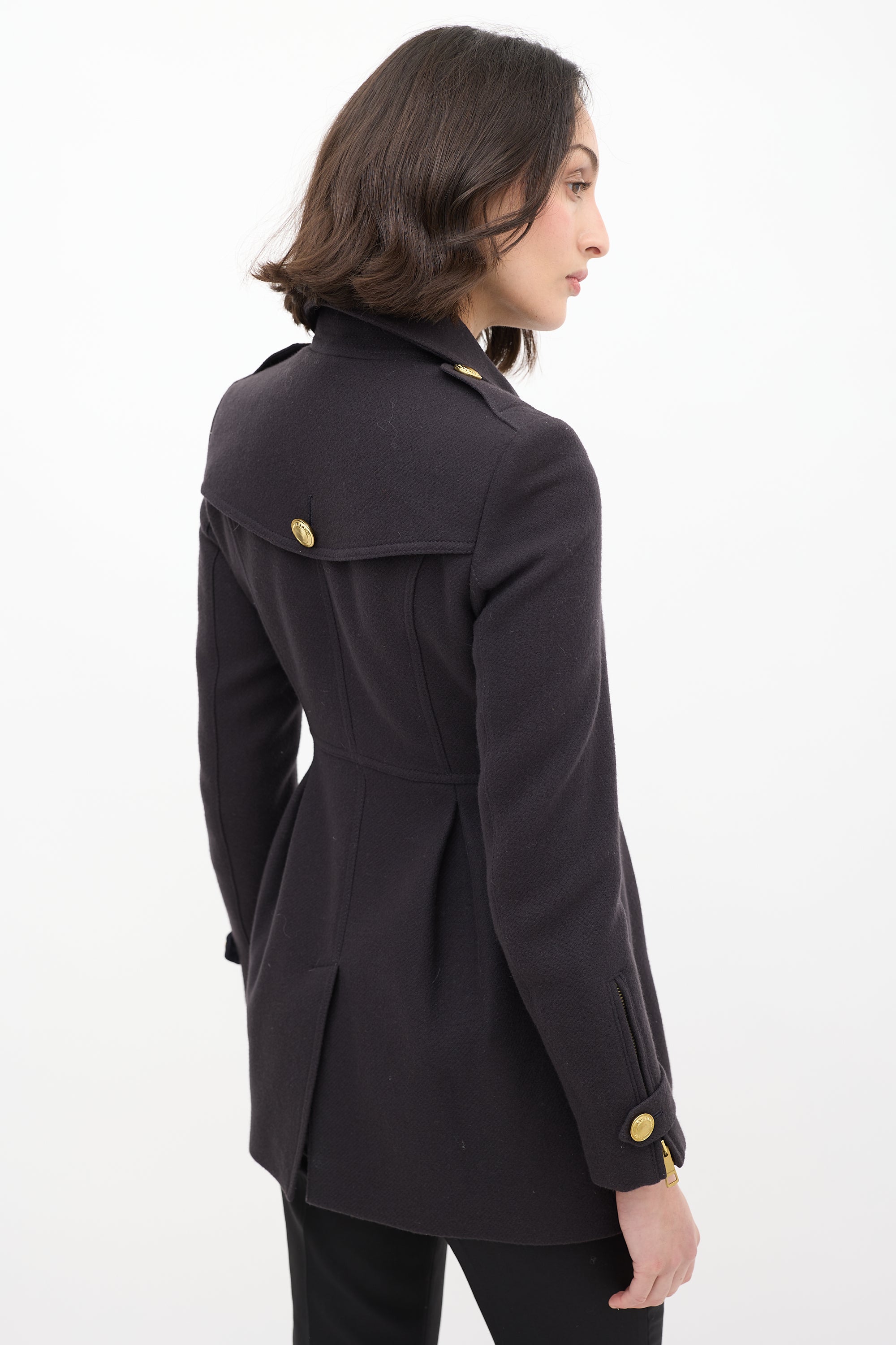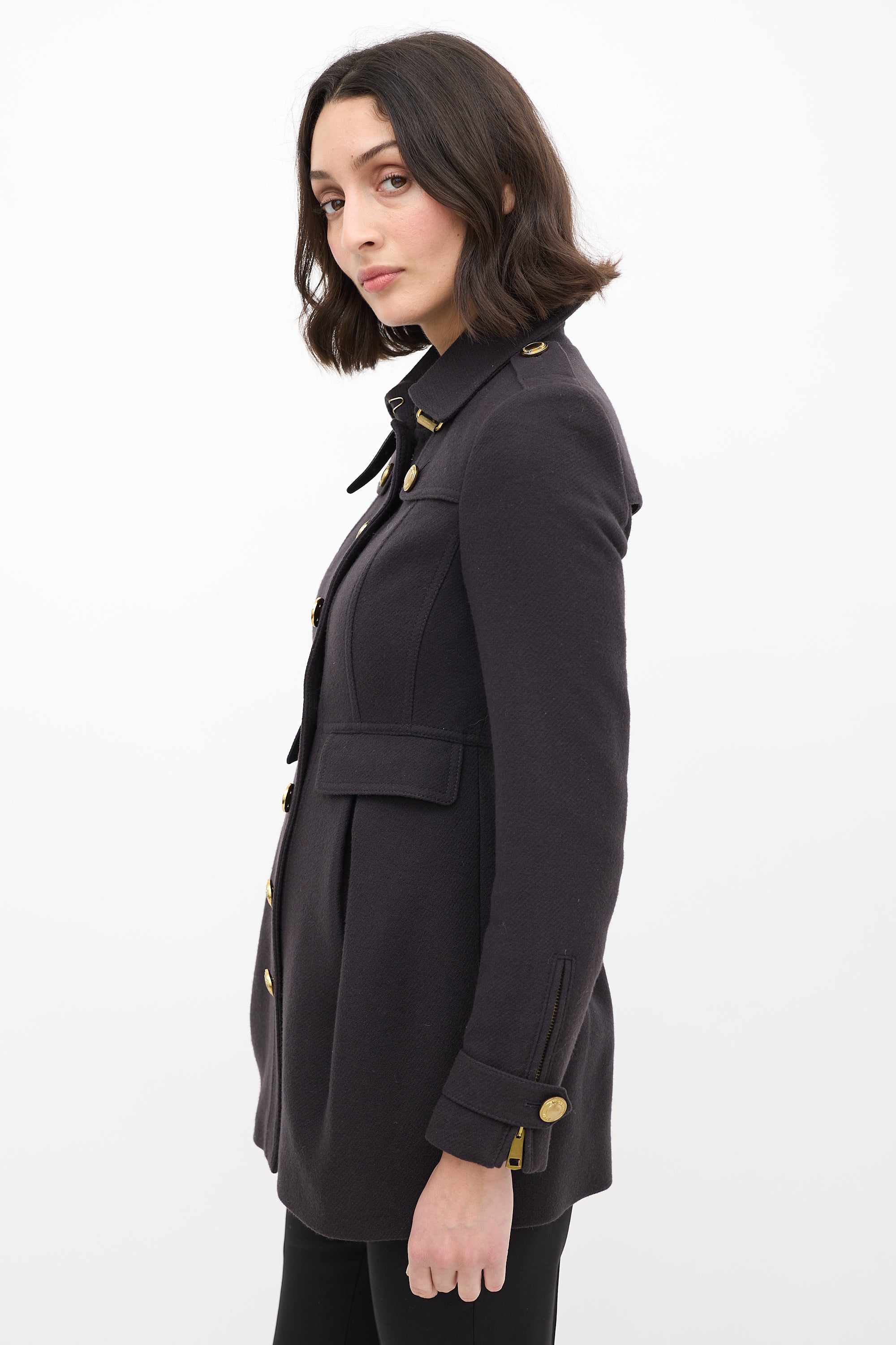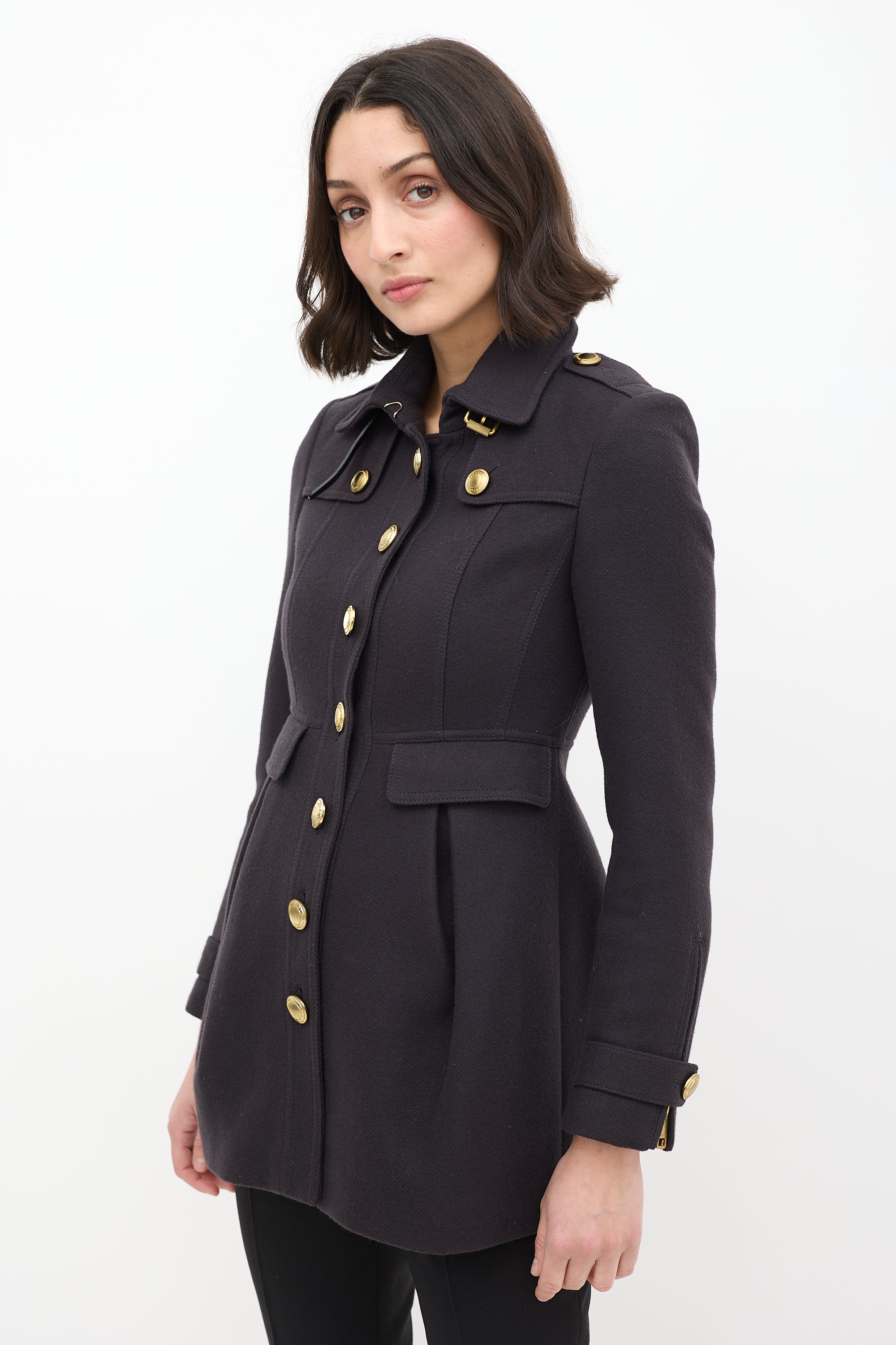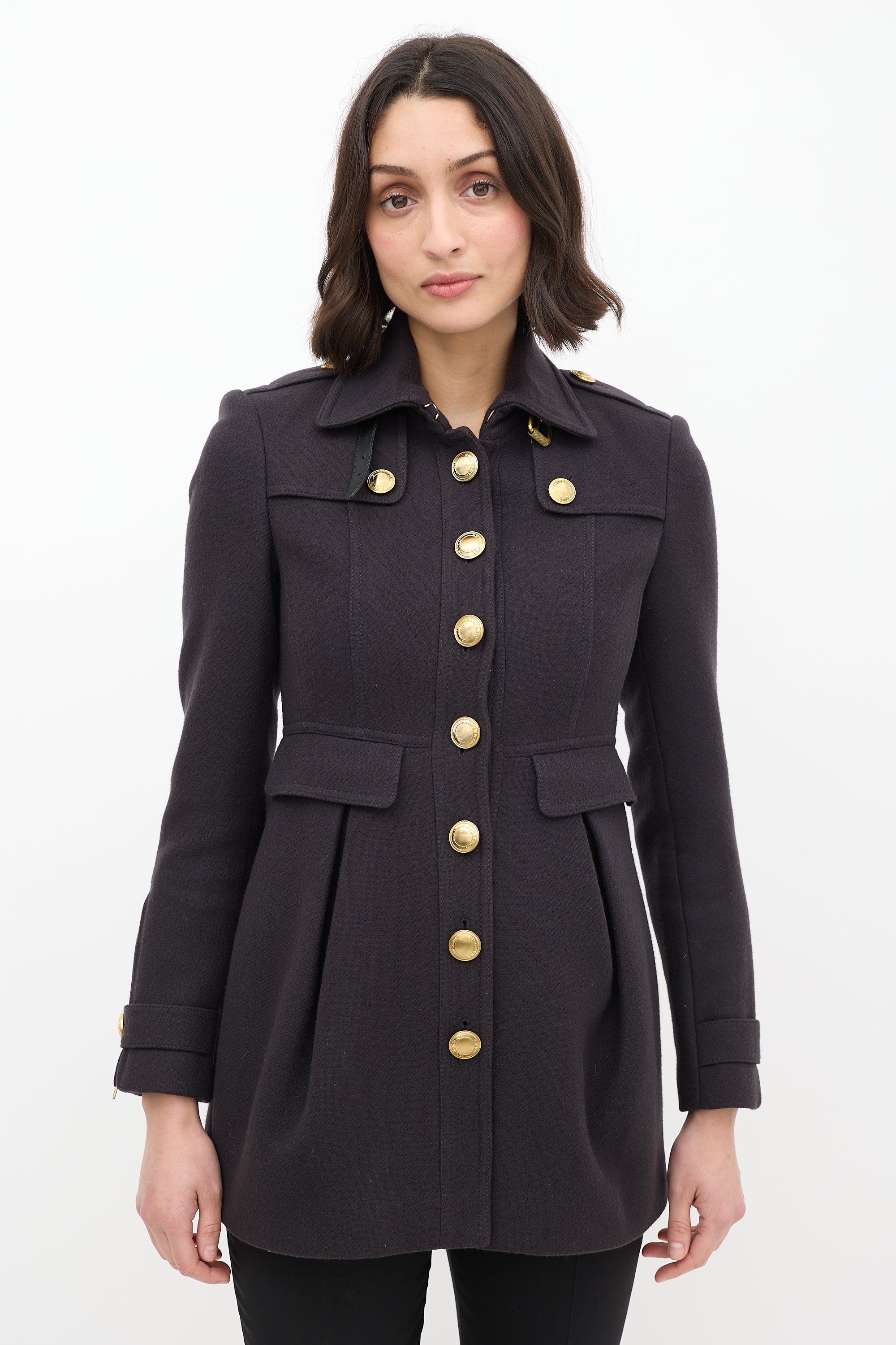 Pre-owned Burberry Brit navy wool coat featuring classic collar with clasp and strap fastening, gold tone crest button up front, two flap pockets at hips, peplum hem, and zip cuffs. Lined.