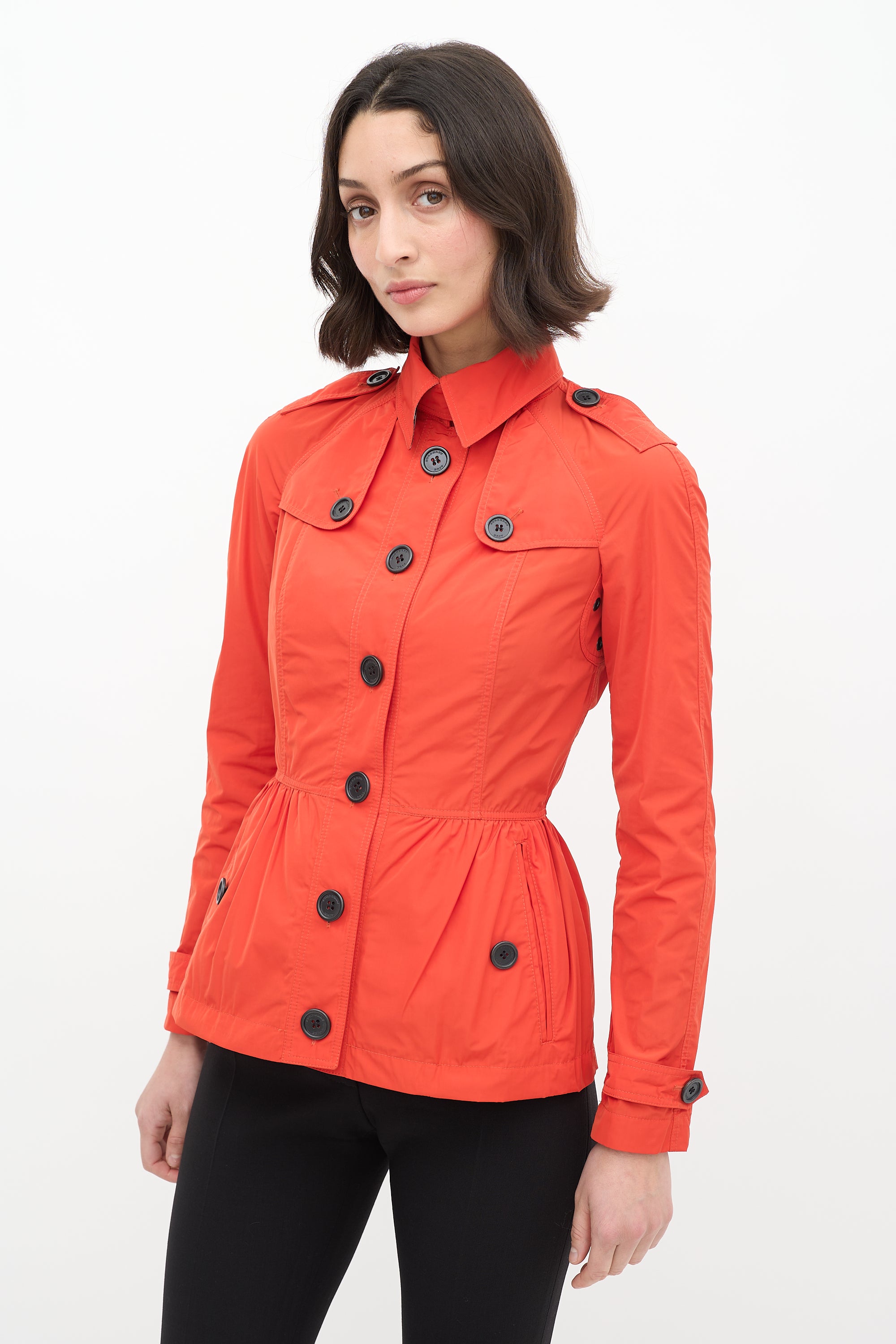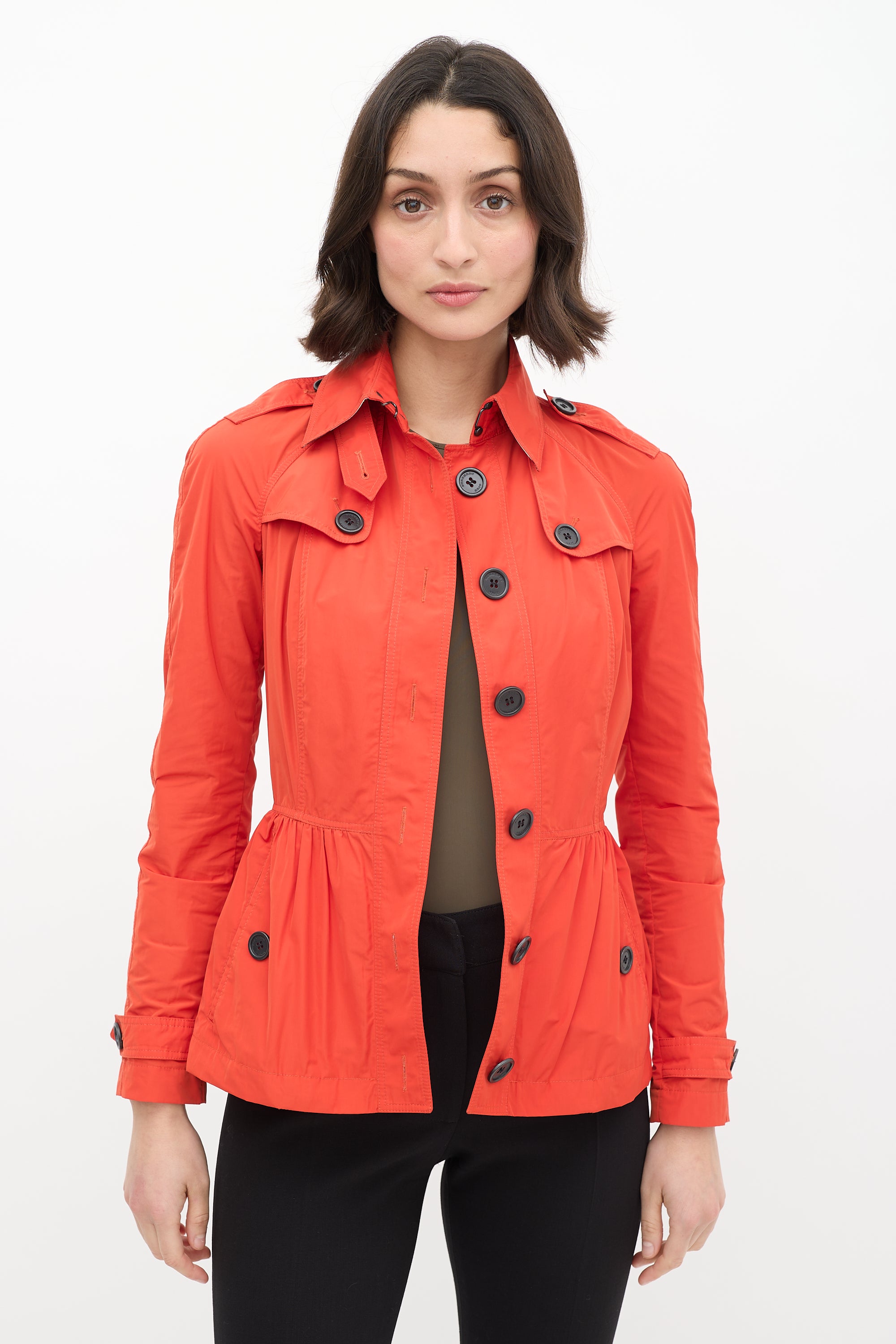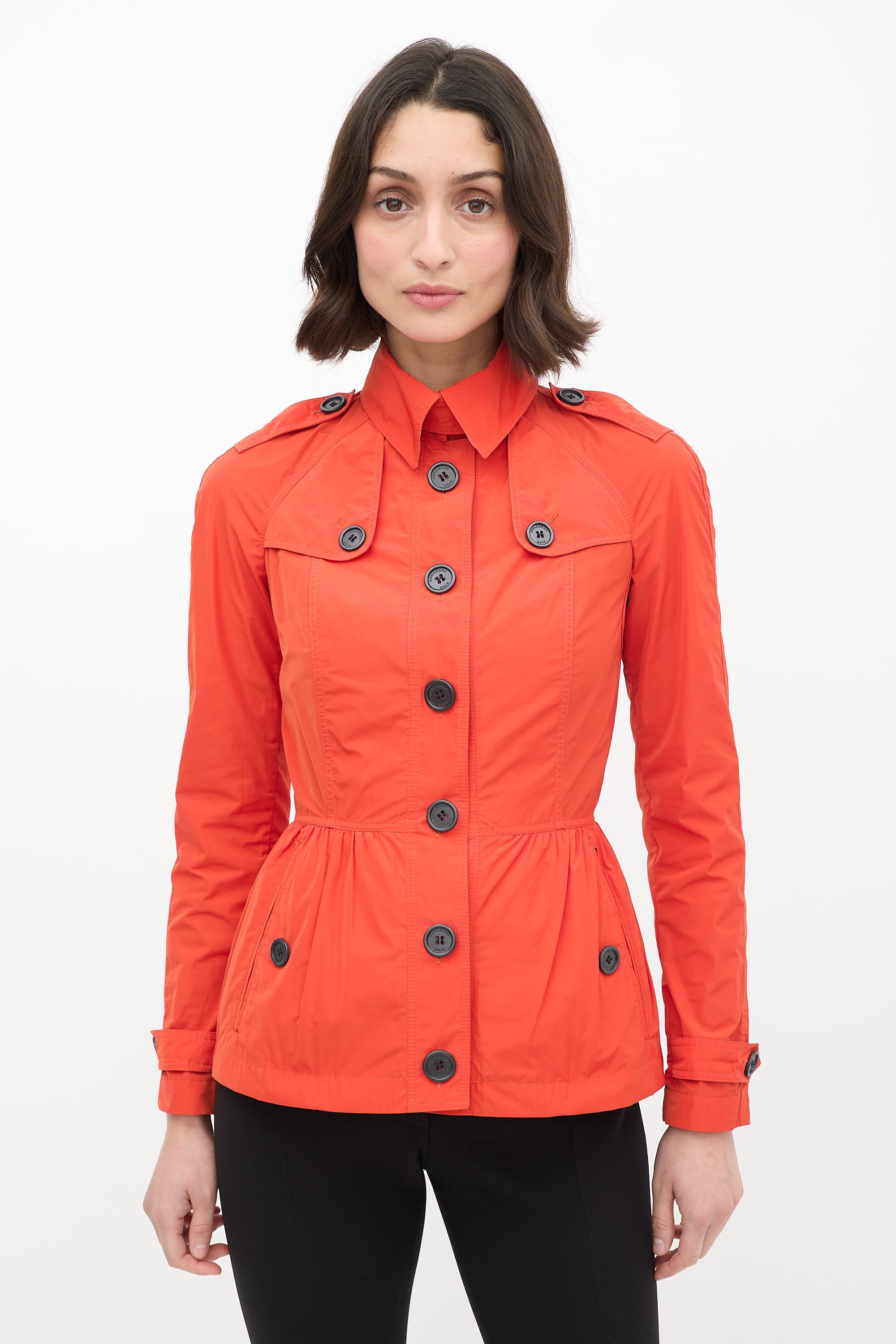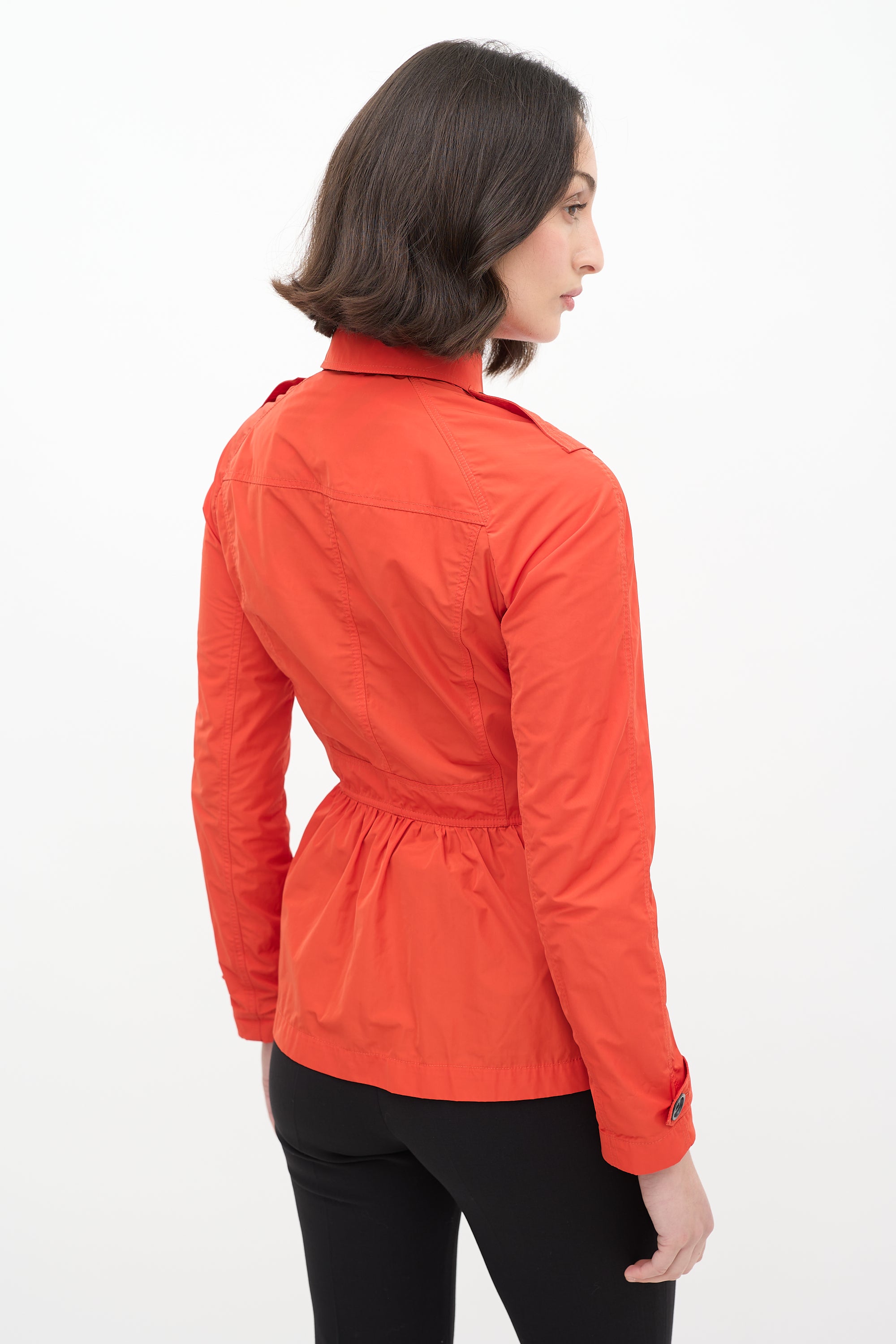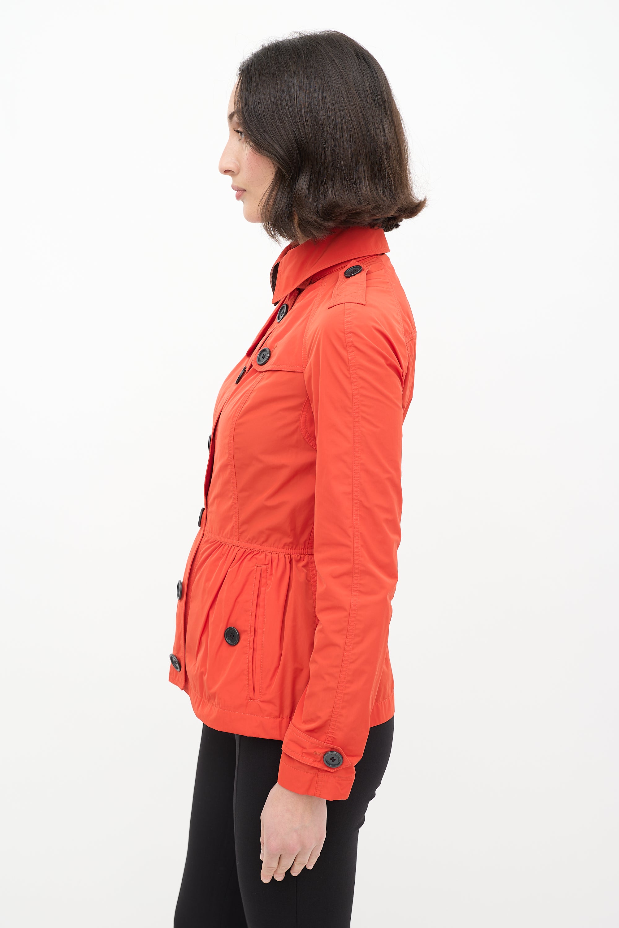 Pre-owned Burberry Brit orange nylon jacket featuring classic collar with clasp fastening, button up front, peplum hem, and cinched waist. Unlined.