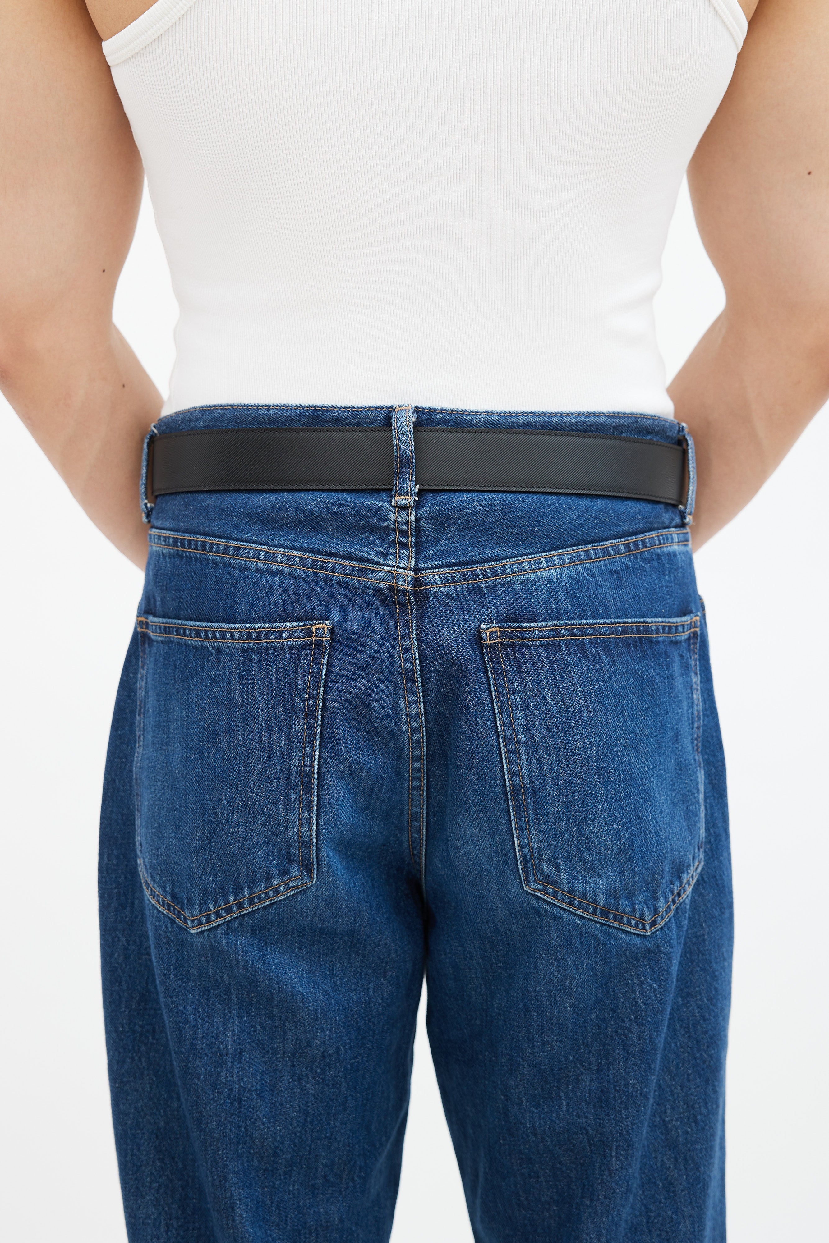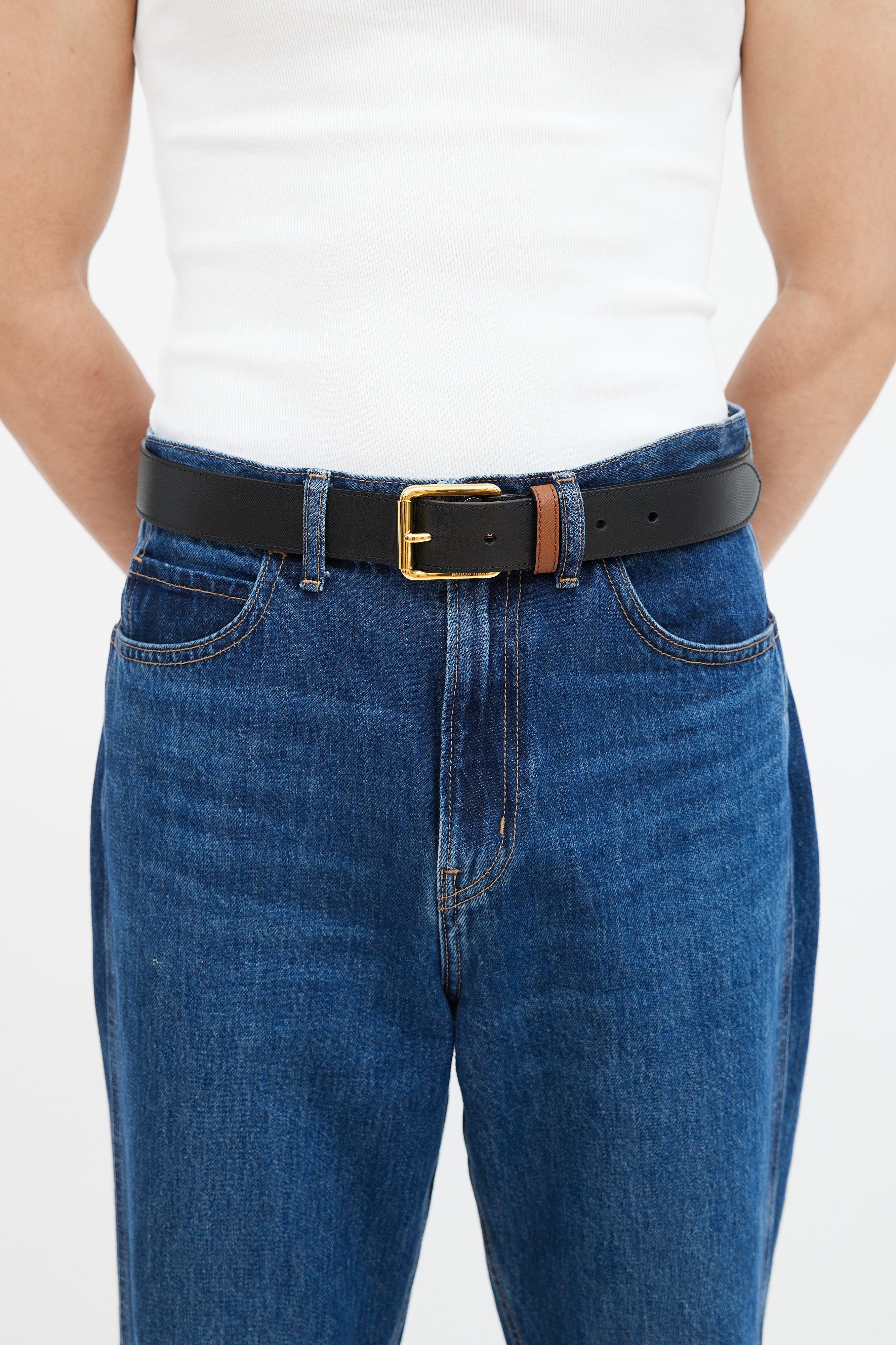 Pre-owned Burberry brown and black belt featuring brass buckle, logo engraved at buckle, single contrasting brown belt loop, and tonal topstitching throughout.