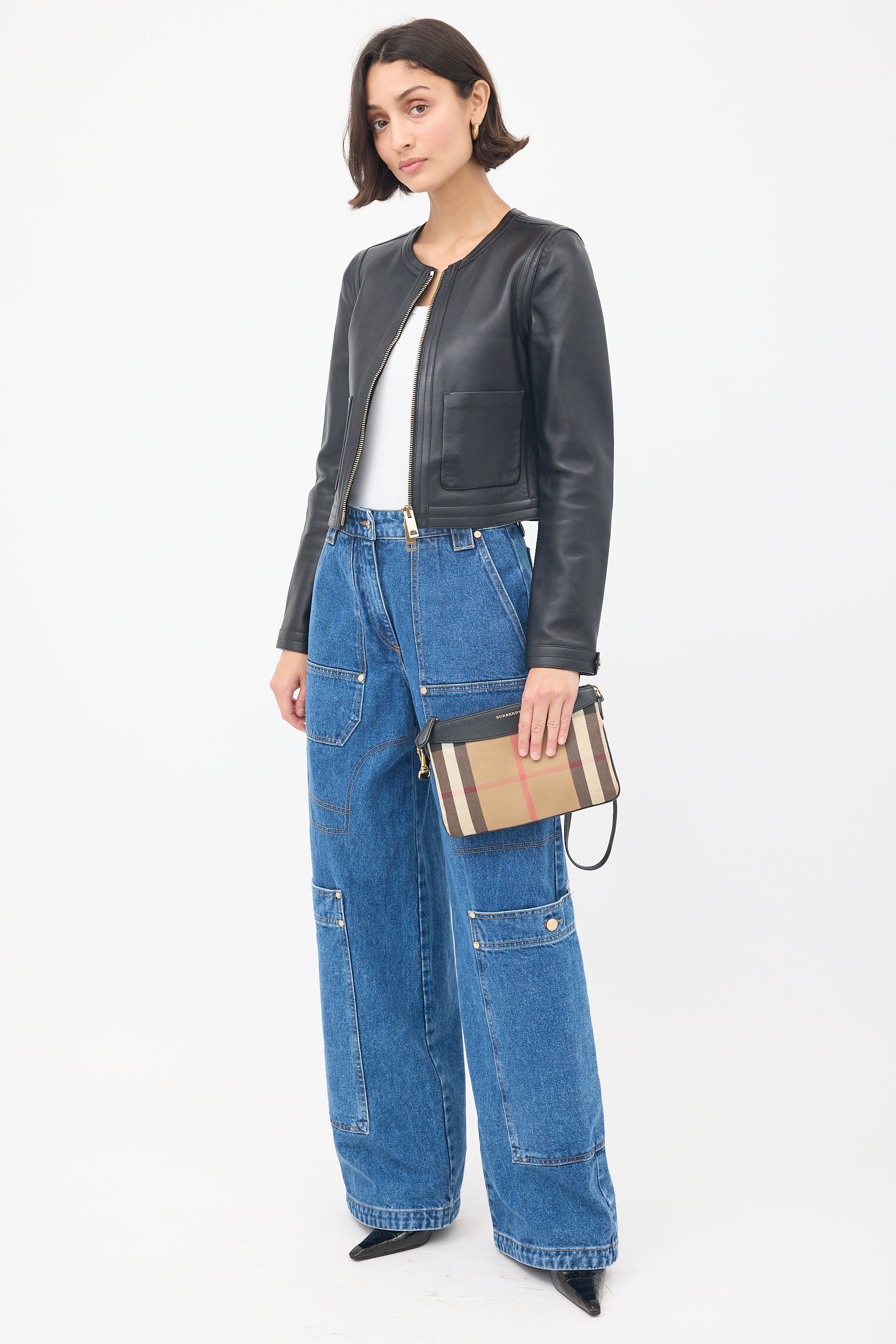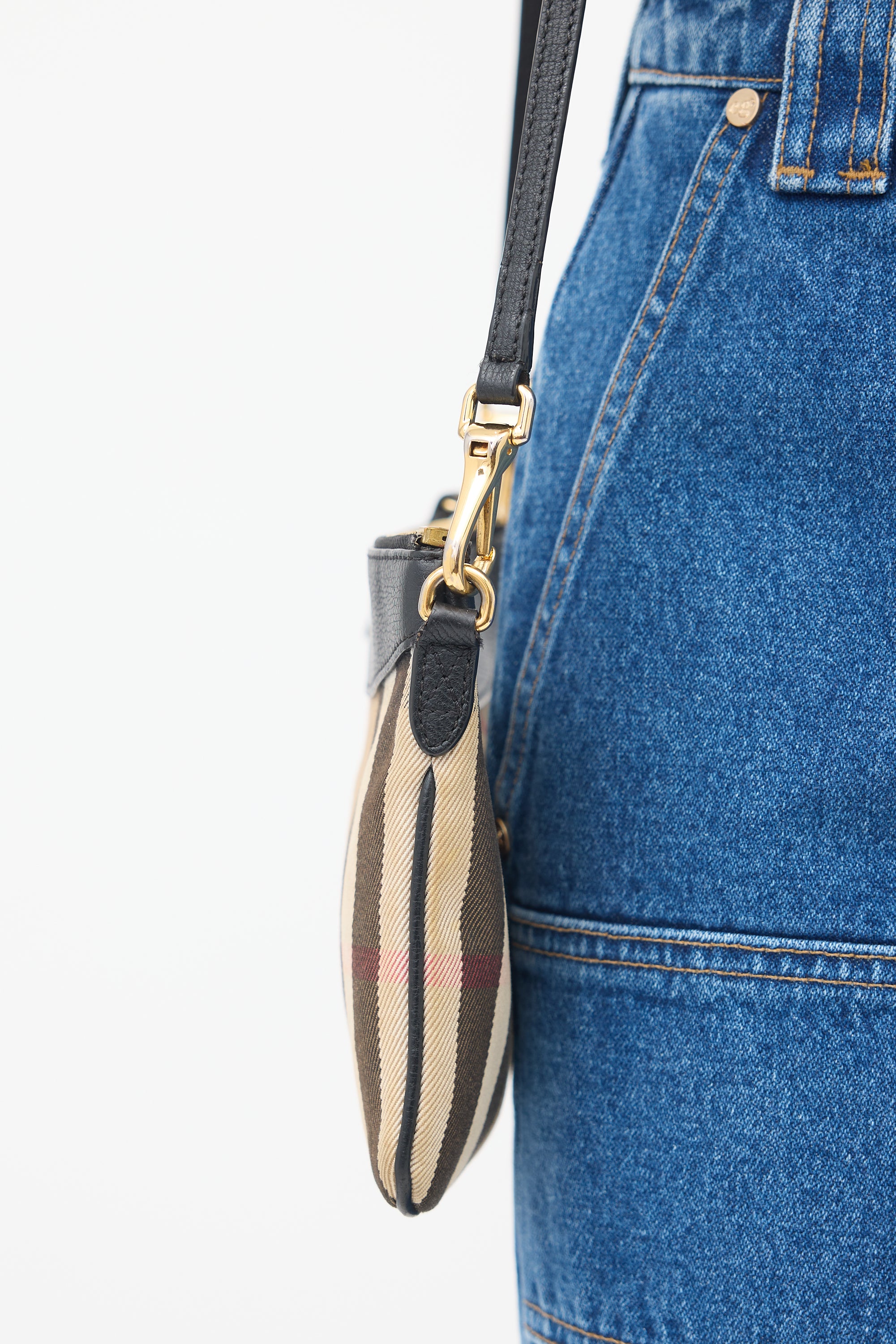 Pre-owned Burberry Peyton crossbody bag featuring brown Nova Check canvas body with black pebbled leather trim and panelling, tonal stitching, gold tone hardware, detachable and adjustable shoulder strap, top zip, and one lined main compartment with four card slots. Comes with original dust bag.