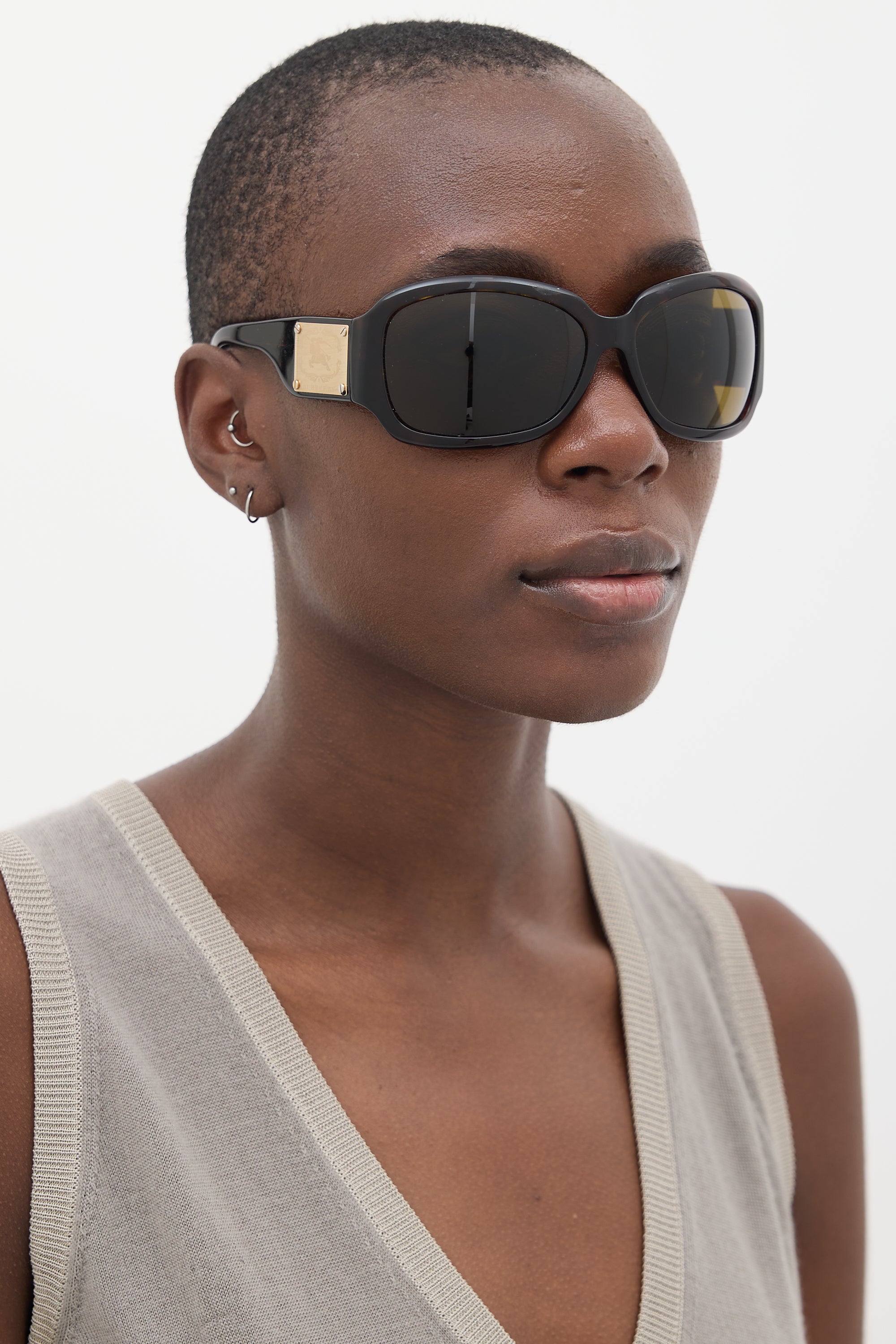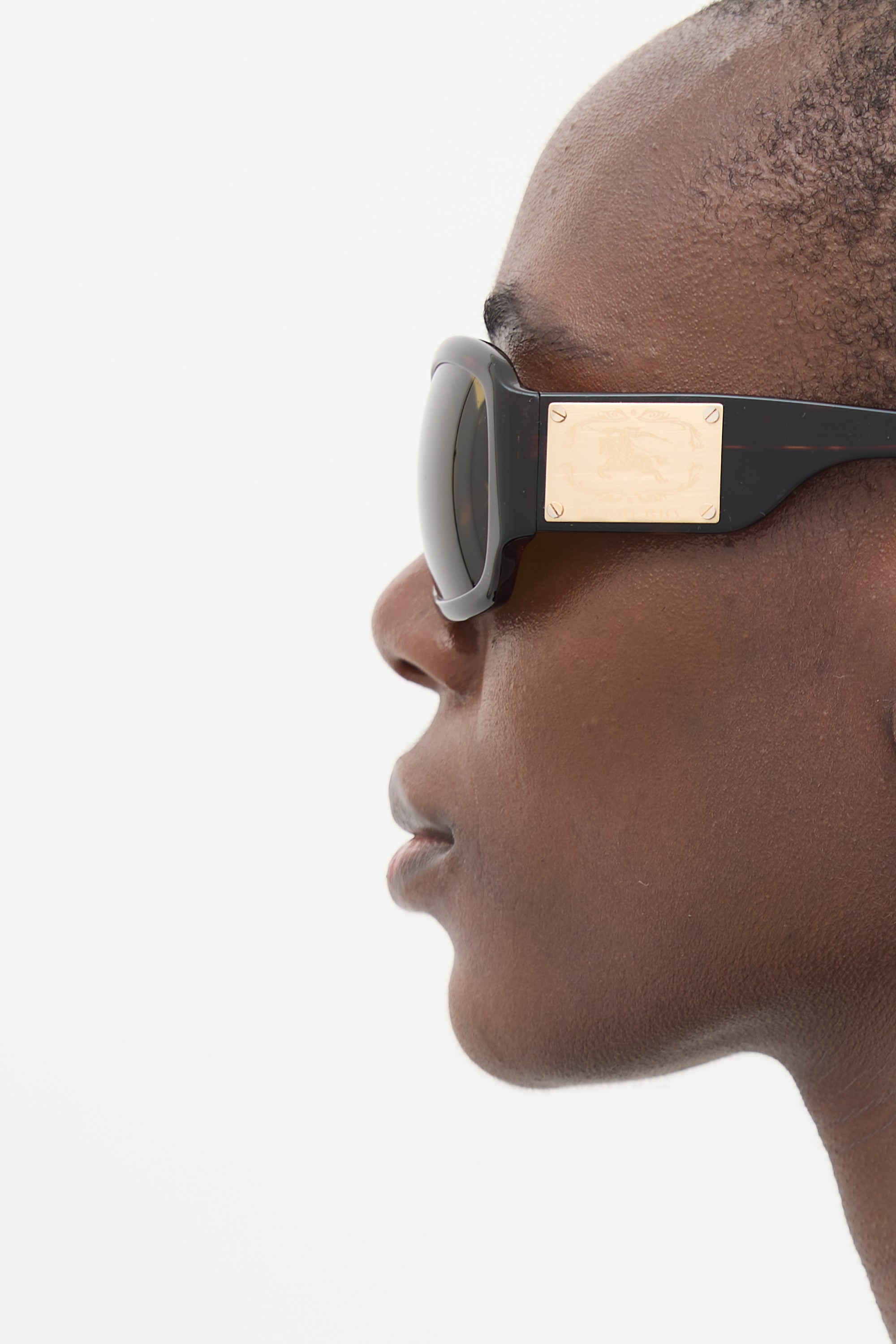 Pre-owned Burberry B4035 sunglasses featuring brown tinted lenses, brown tortoiseshell rectangle frame, and brushed gold tone metal logo plaque at temples. Comes with original case and wipe cloth.