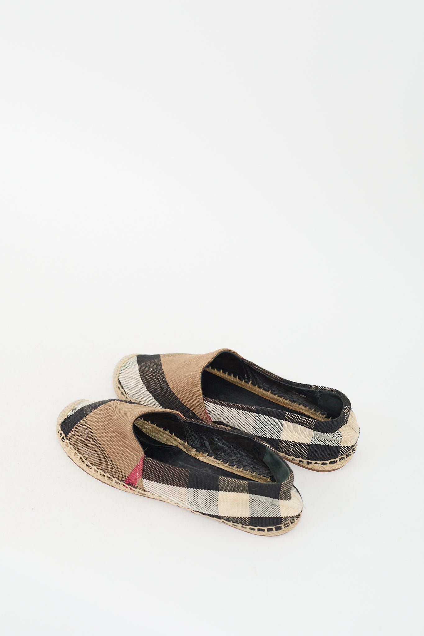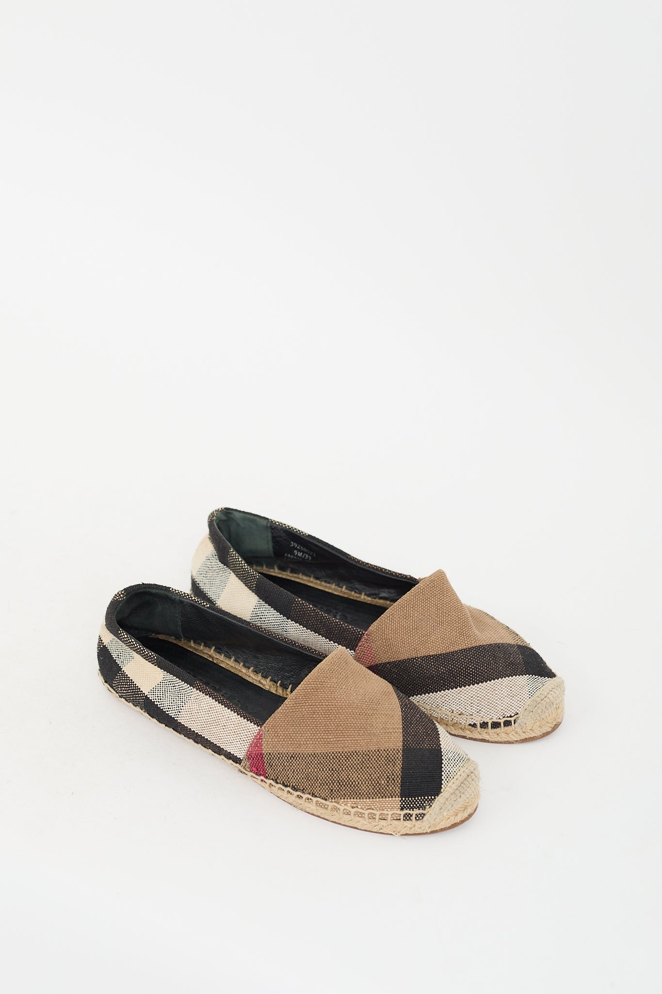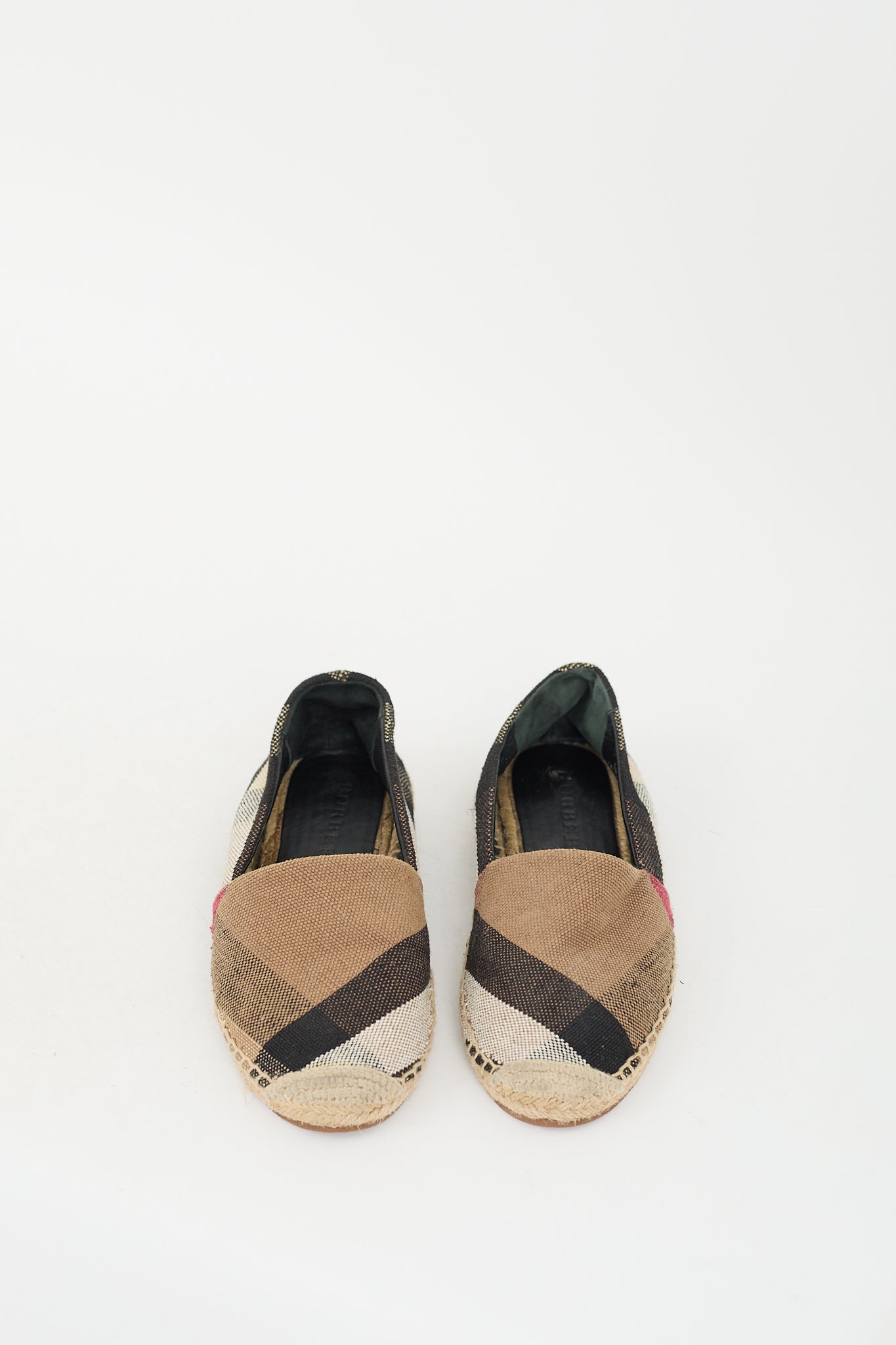 Pre-owned Burberry brown and multicolour espadrilles featuring rounded toe, Nova Check pattern upper, braided midsole, slip on entry, and rubber outsole.