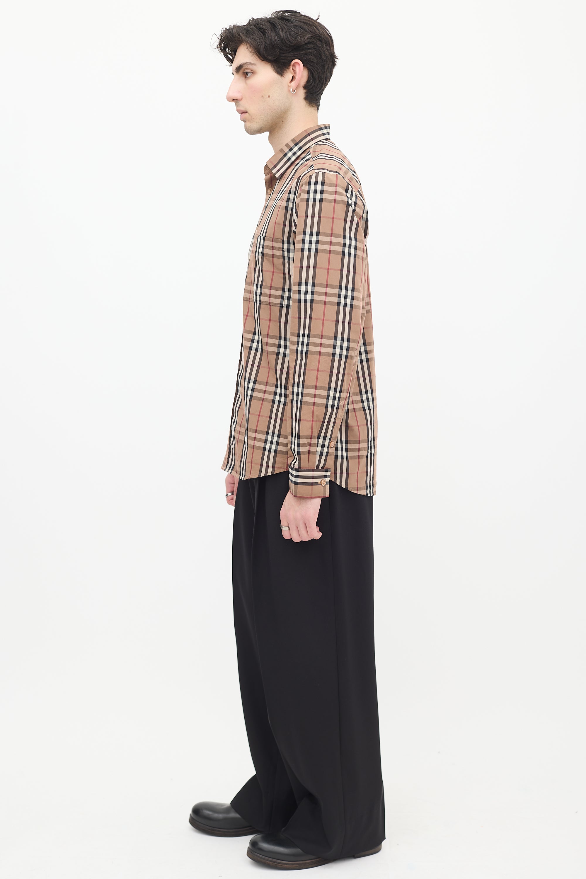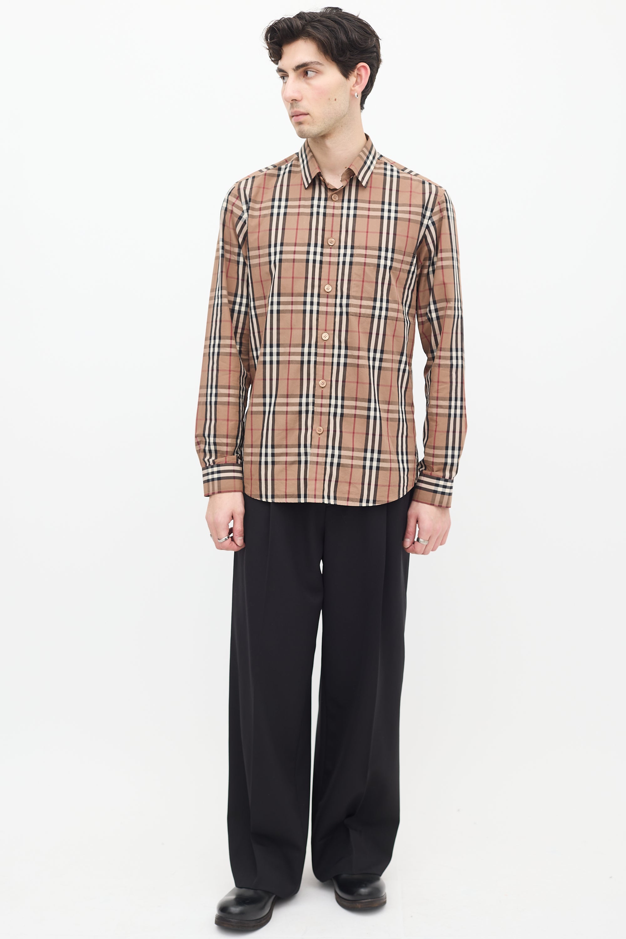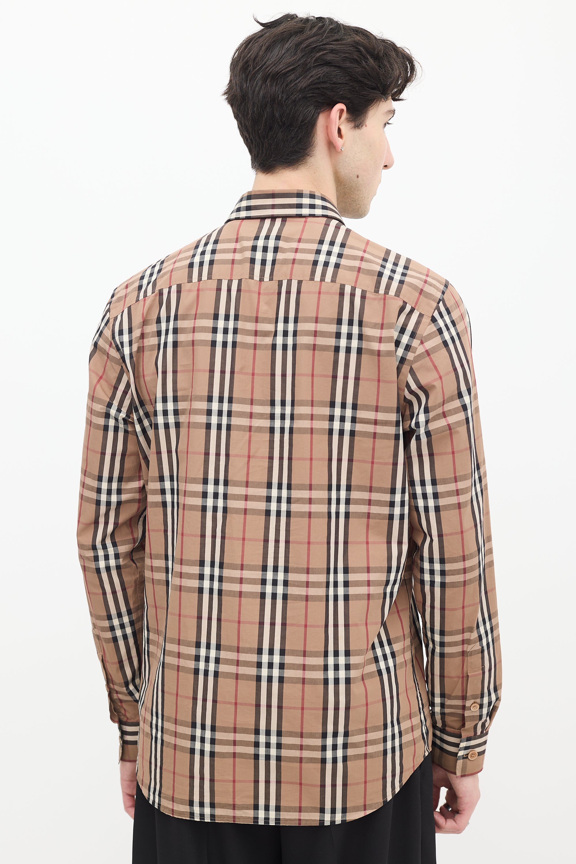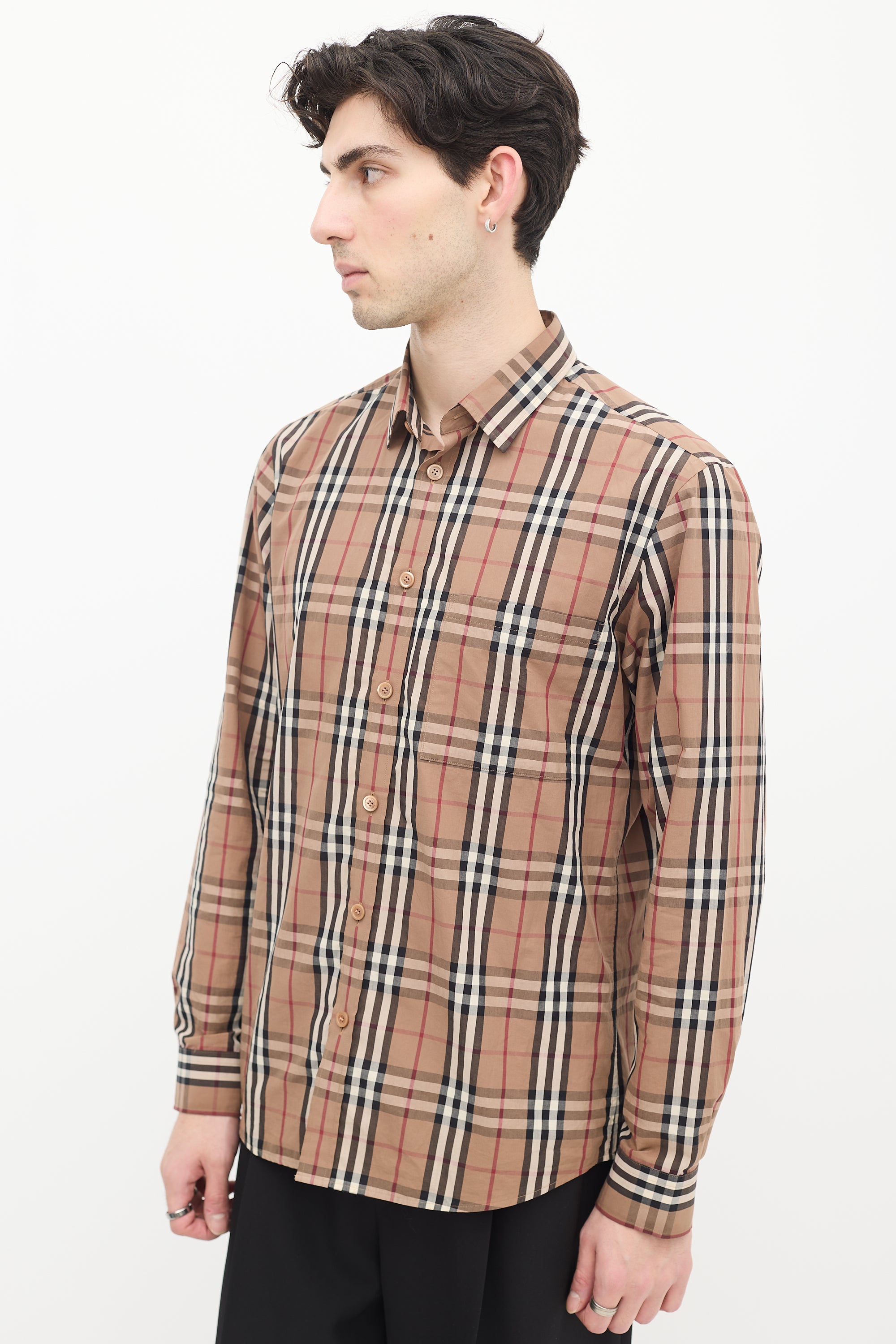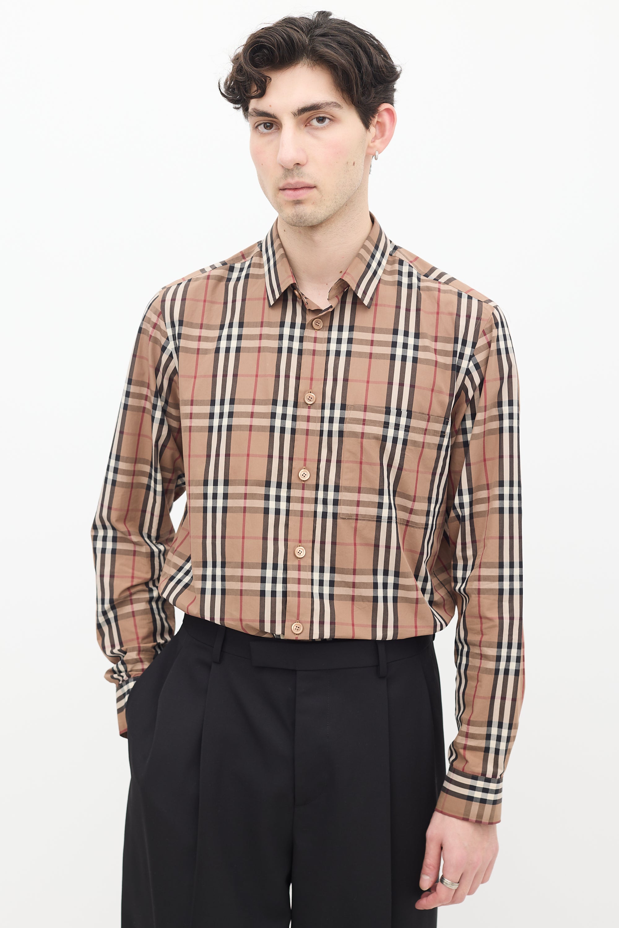 Pre-owned Burberry brown and multicolour shirt featuring classic collar, Nova Check print, buttoned front, and one chest pocket.