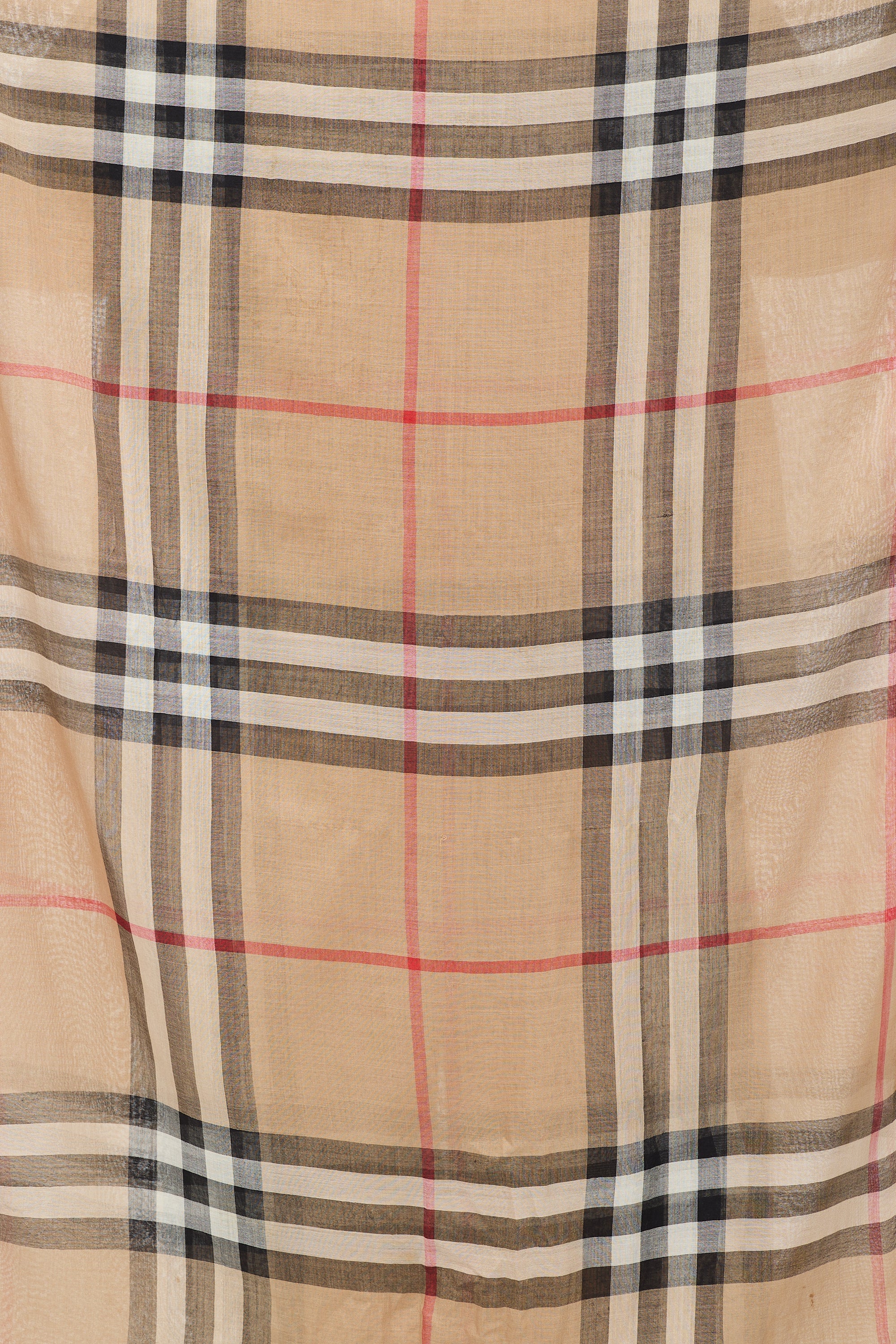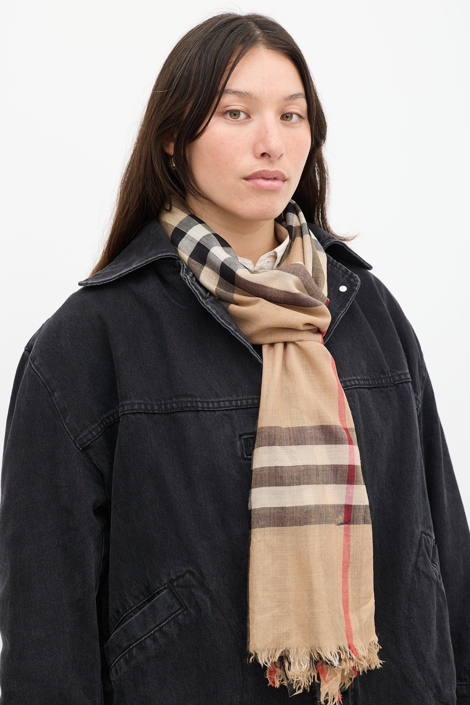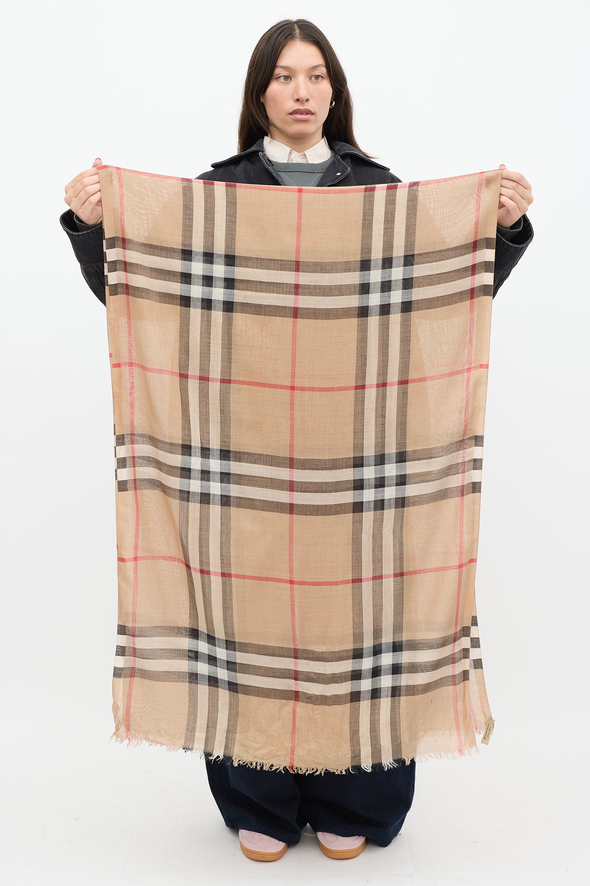 Pre-owned Burberry lightweight brown scarf featuring a multicolour nova check pattern throughout, and fringe hem. Comes with original box.