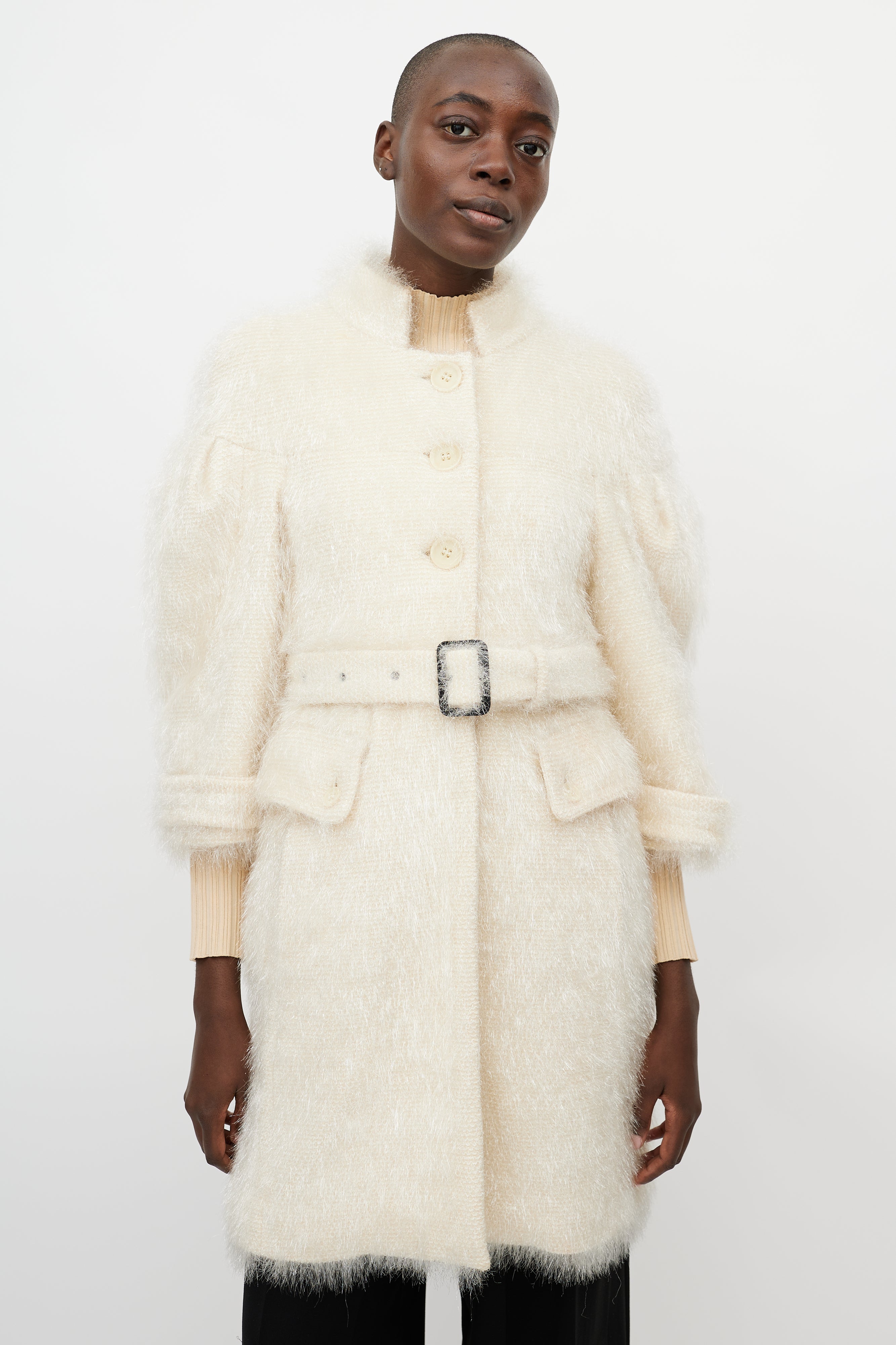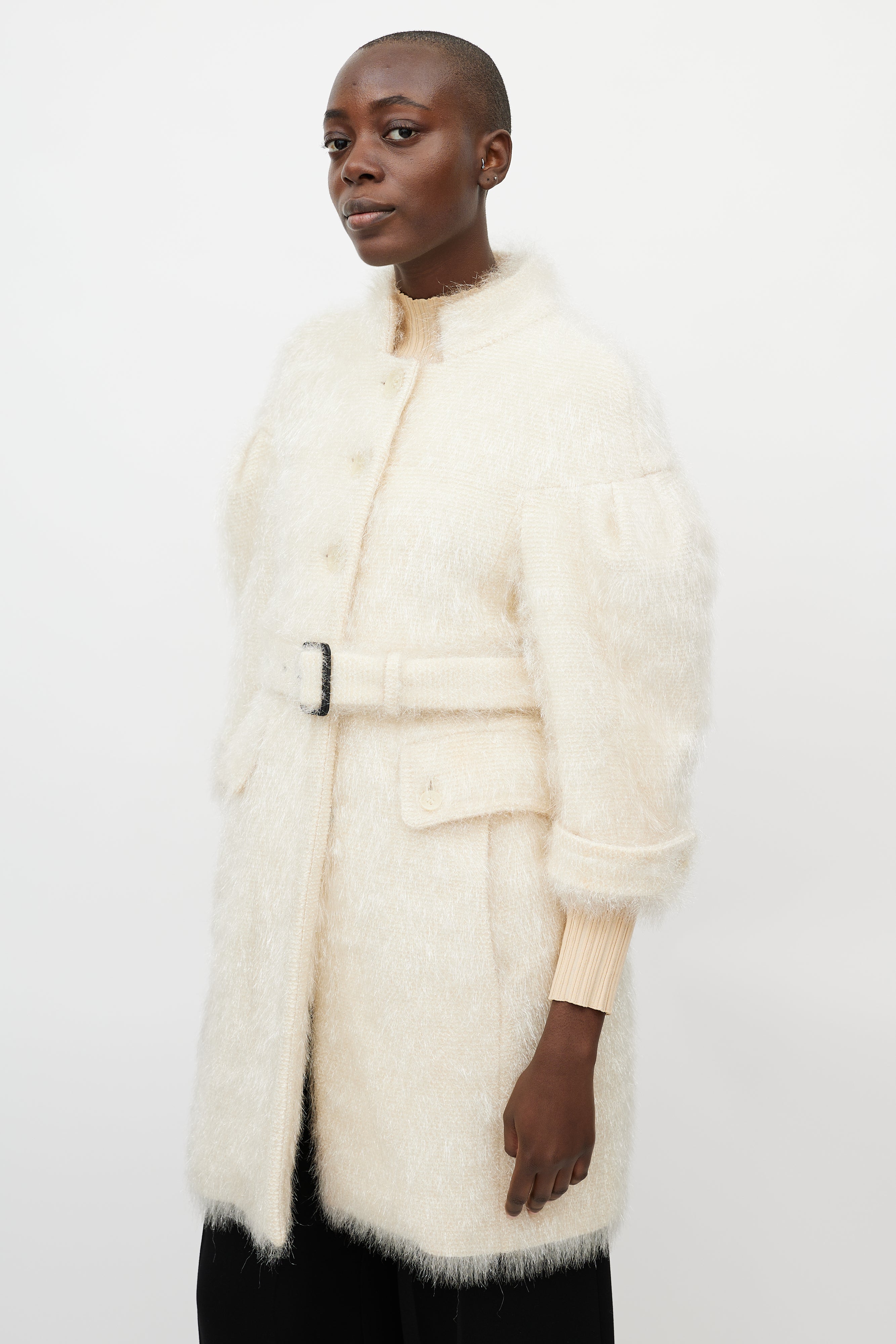 Pre-owned Burberry cream wool coat featuring nylon metallic shag throughout outer, drop shoulders with puff sleeves, mock neck, button closure, matching adjustable belt, buttoned cuffs and extra long vent at back. Lined.