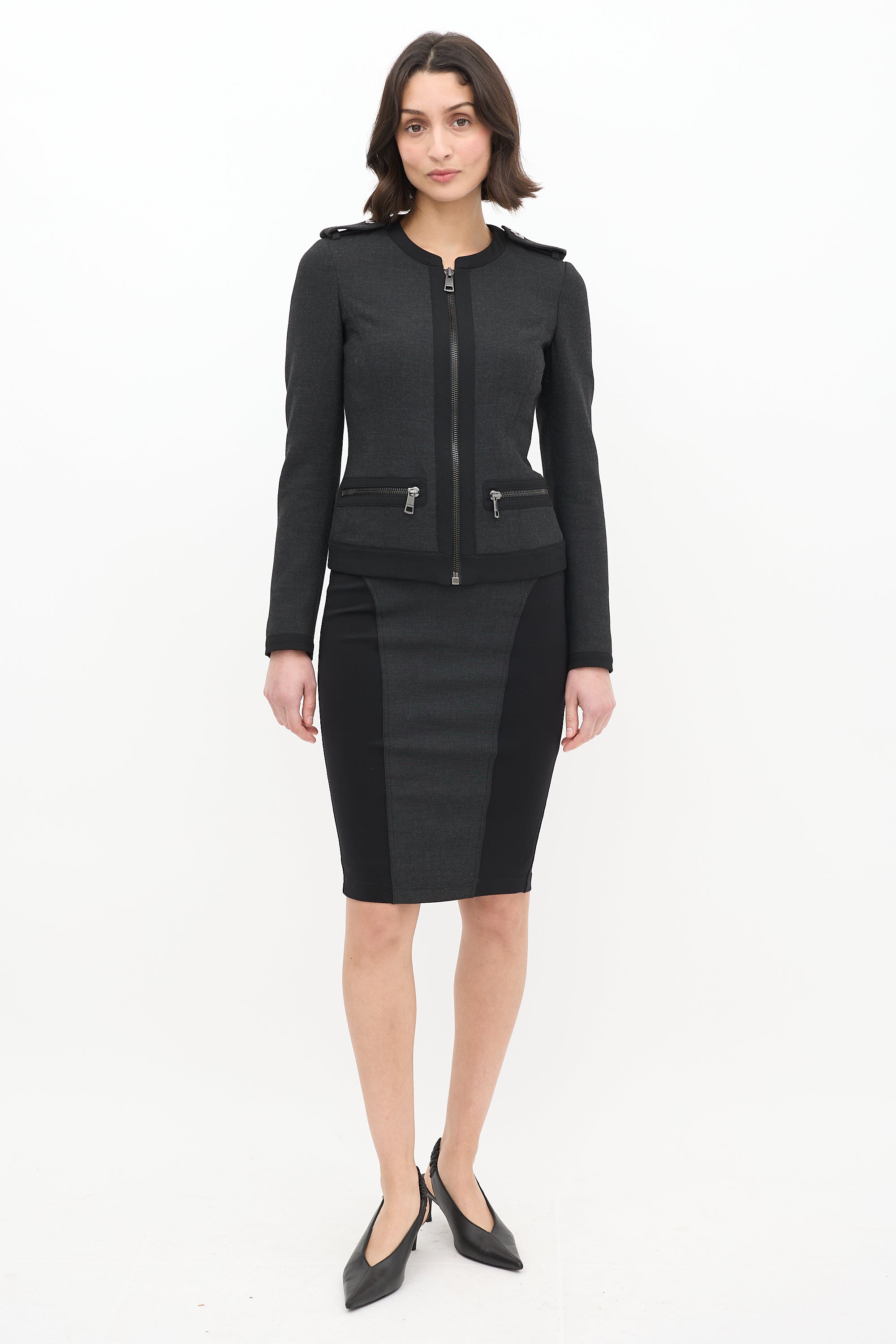 Pre-owned Burberry dark grey pencil skirt featuring black panelled hips, back vent, and zip closure at back.