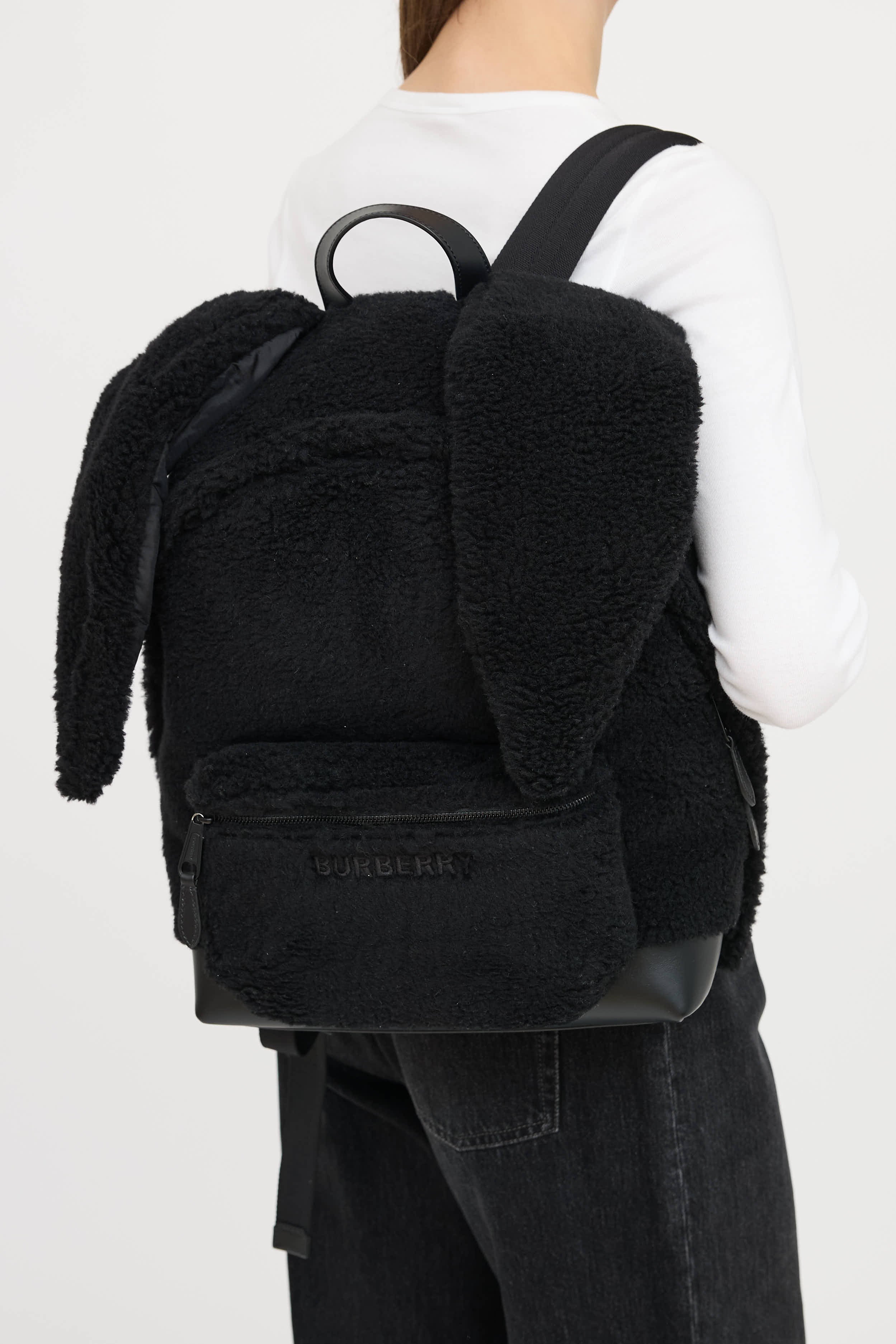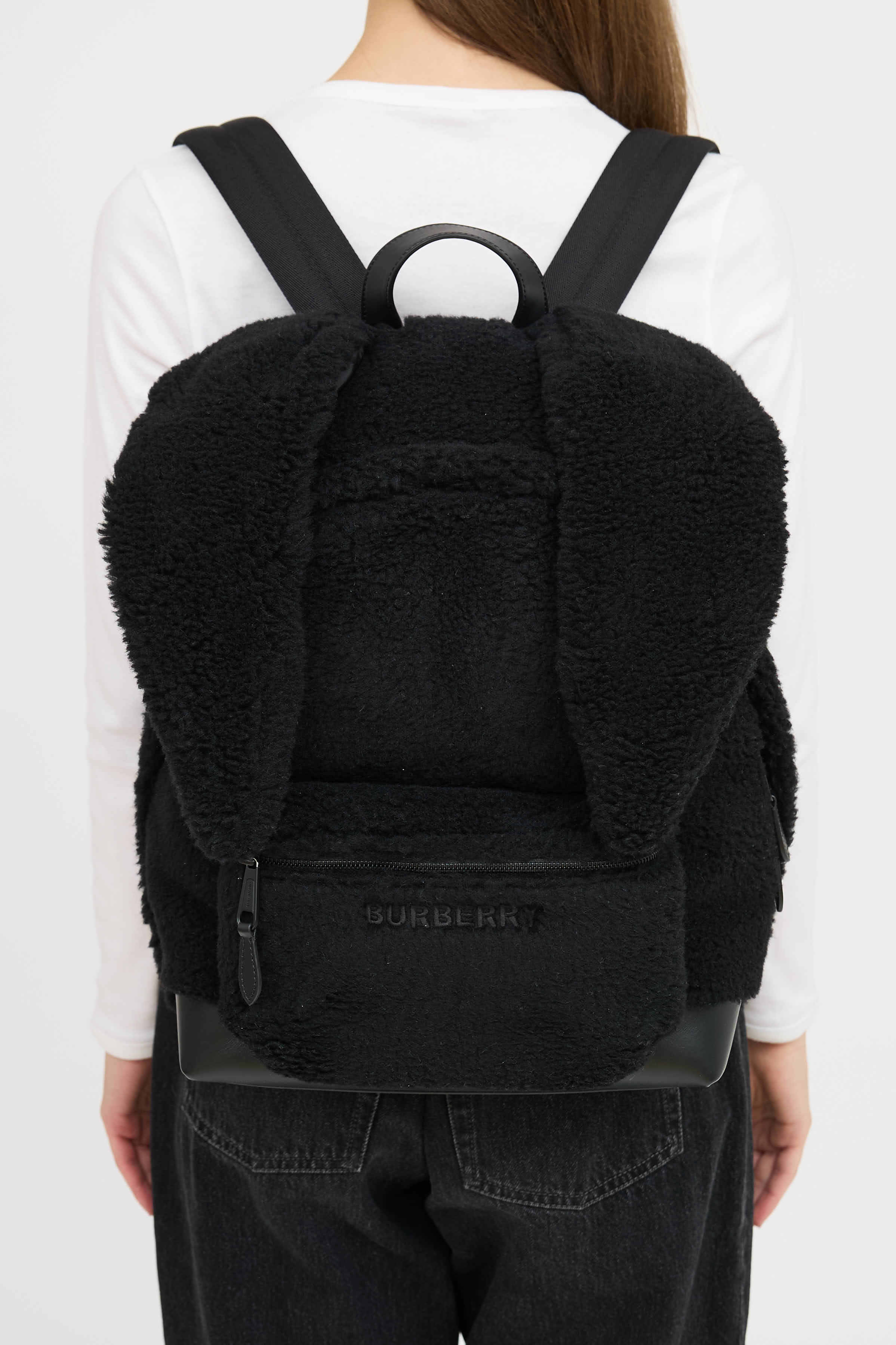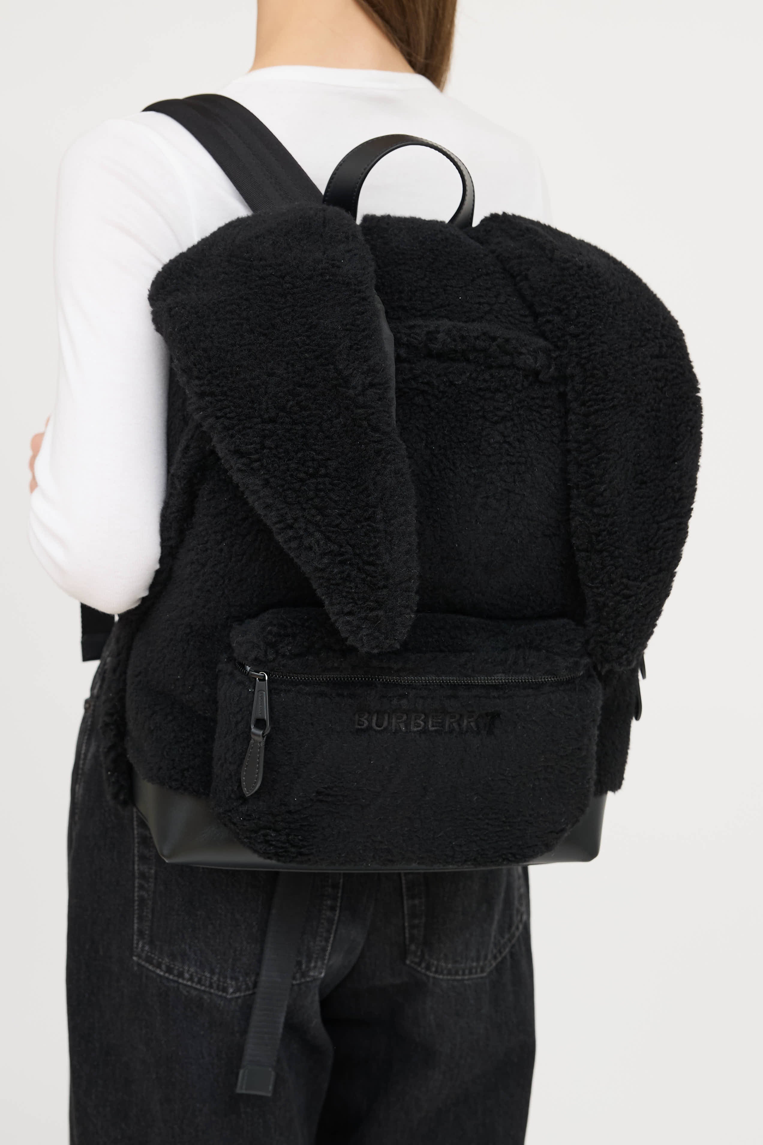 Pre-owned Burberry black fleece Year of the Rabbit backpack featuring attached Rabbit ears, leather flat top handle, adjustable webbed straps, front zip pocket with embroidered logo, top zip closure, and one main compartment with one slip pocket.