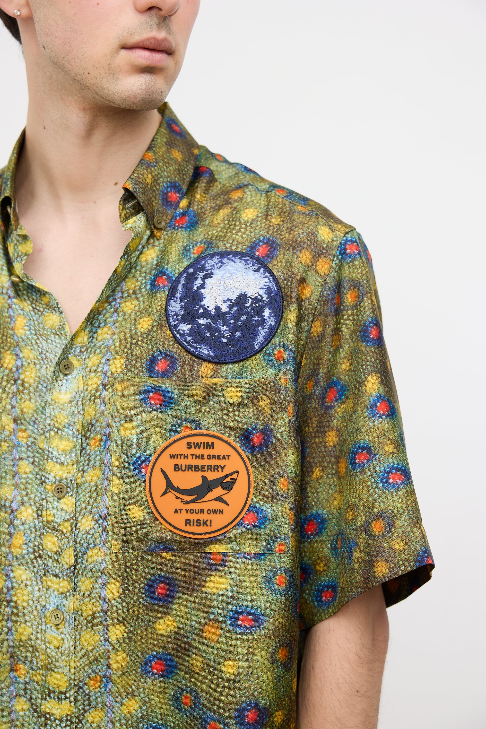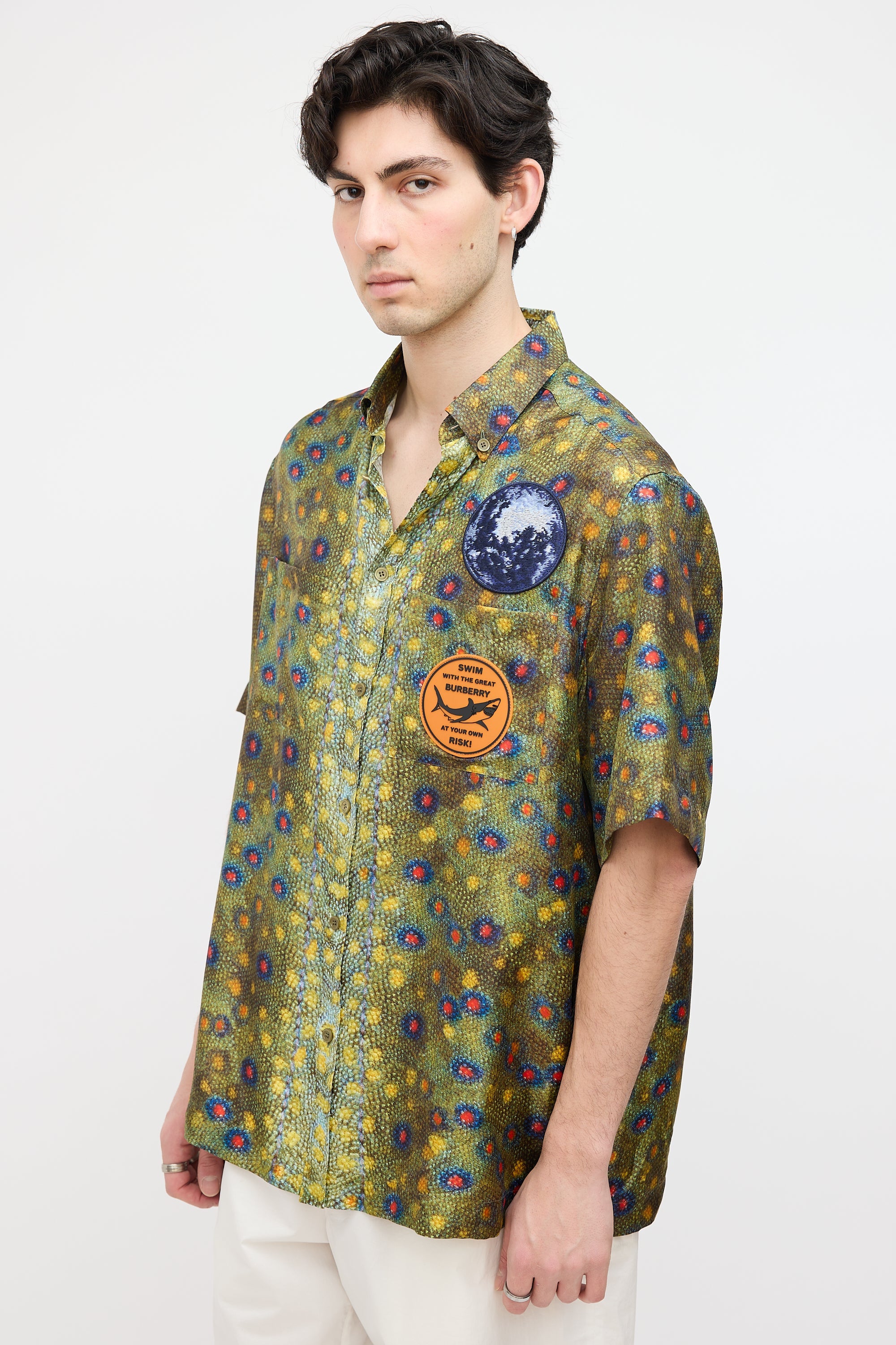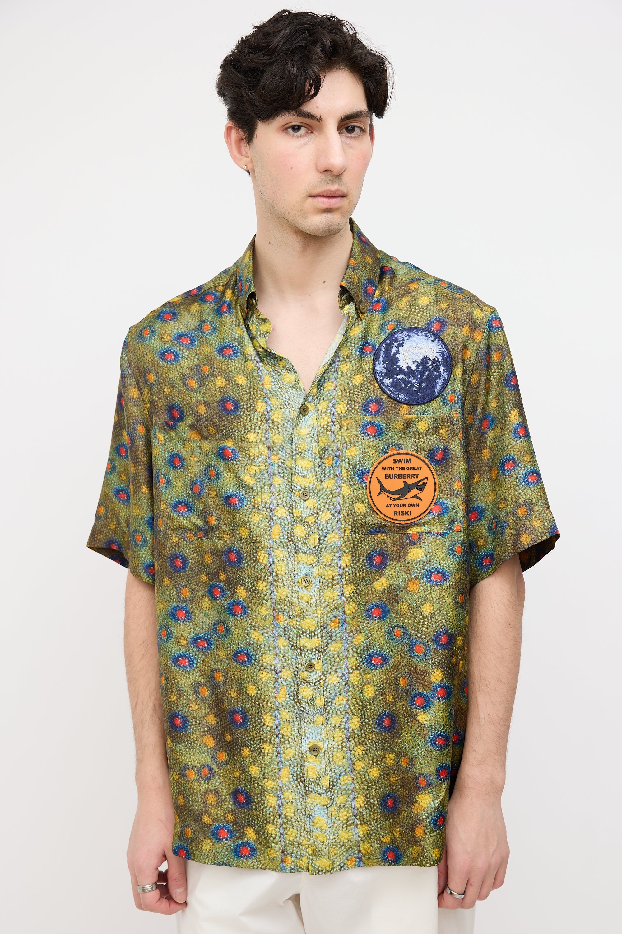 Pre-owned Burberry green and multicolour silk printed shirt featuring pointed collar, button up front, two chest patch pockets, blue embroidered circle patch and rubberized " Swim With The Great Burberry" patch at left chest, and short sleeves.