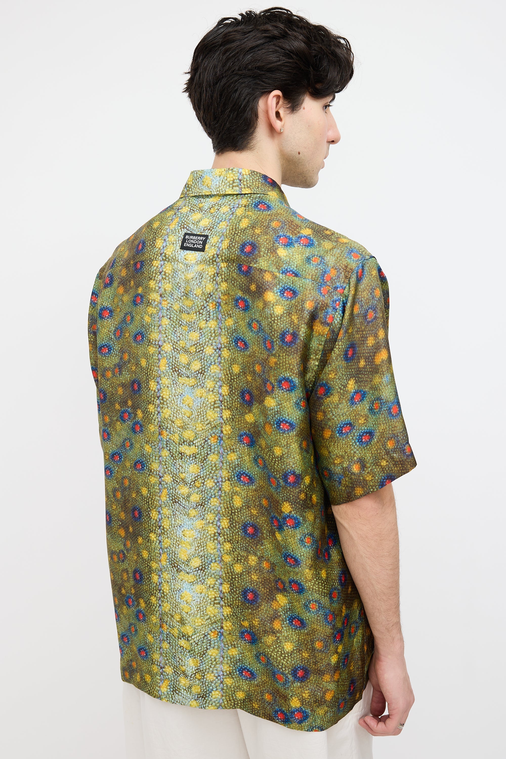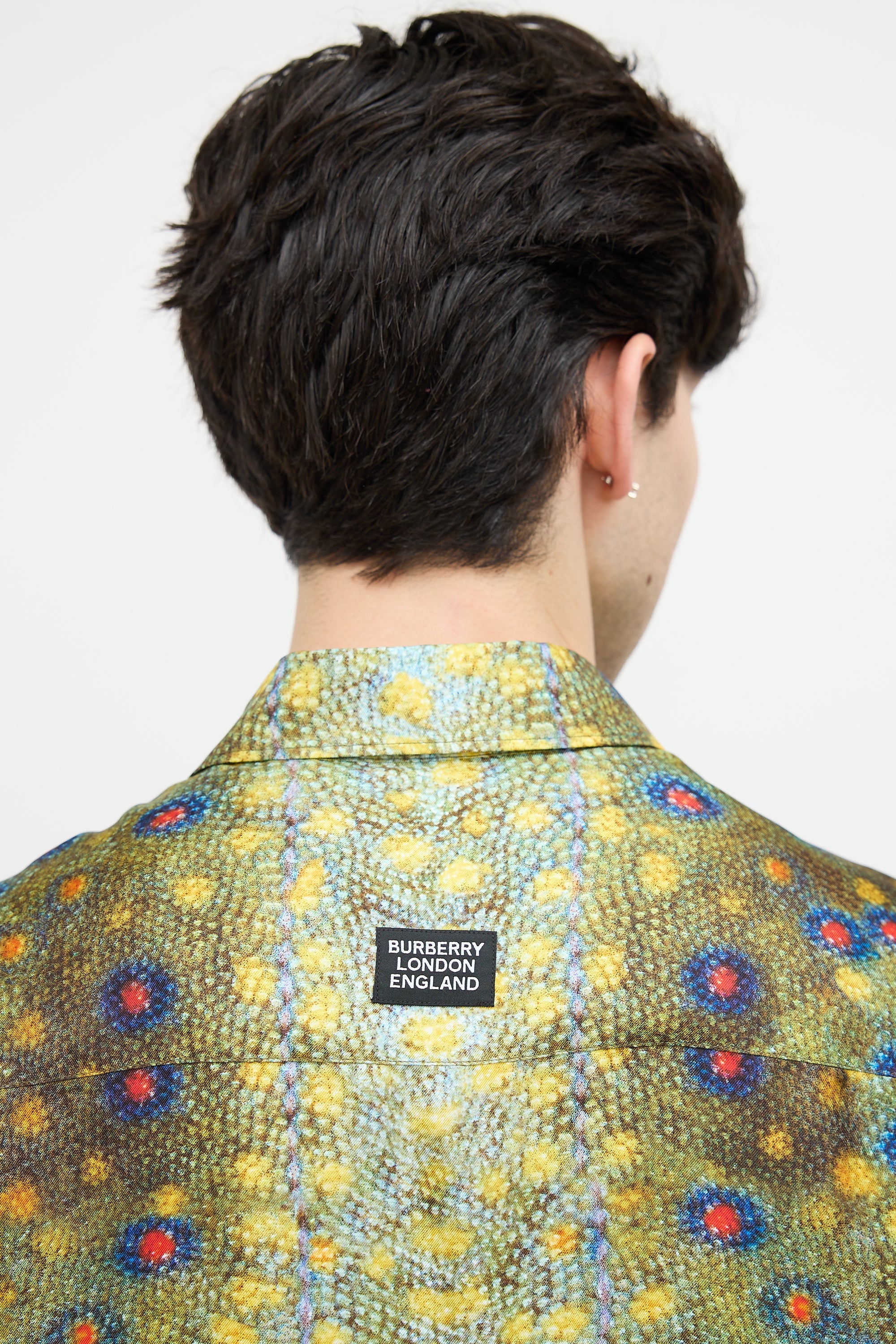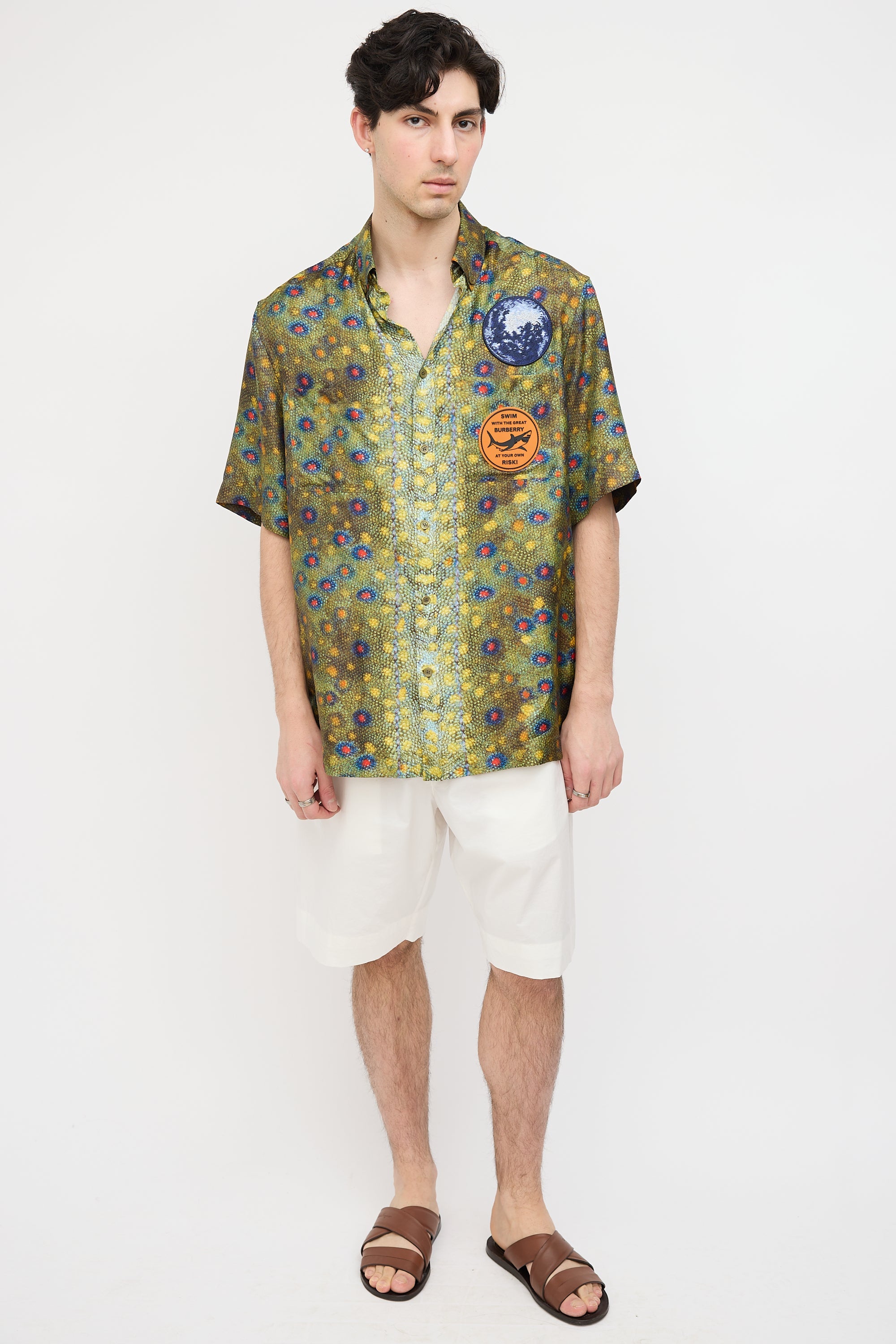 Pre-owned Burberry green and multicolour silk printed shirt featuring pointed collar, button up front, two chest patch pockets, blue embroidered circle patch and rubberized " Swim With The Great Burberry" patch at left chest, and short sleeves.