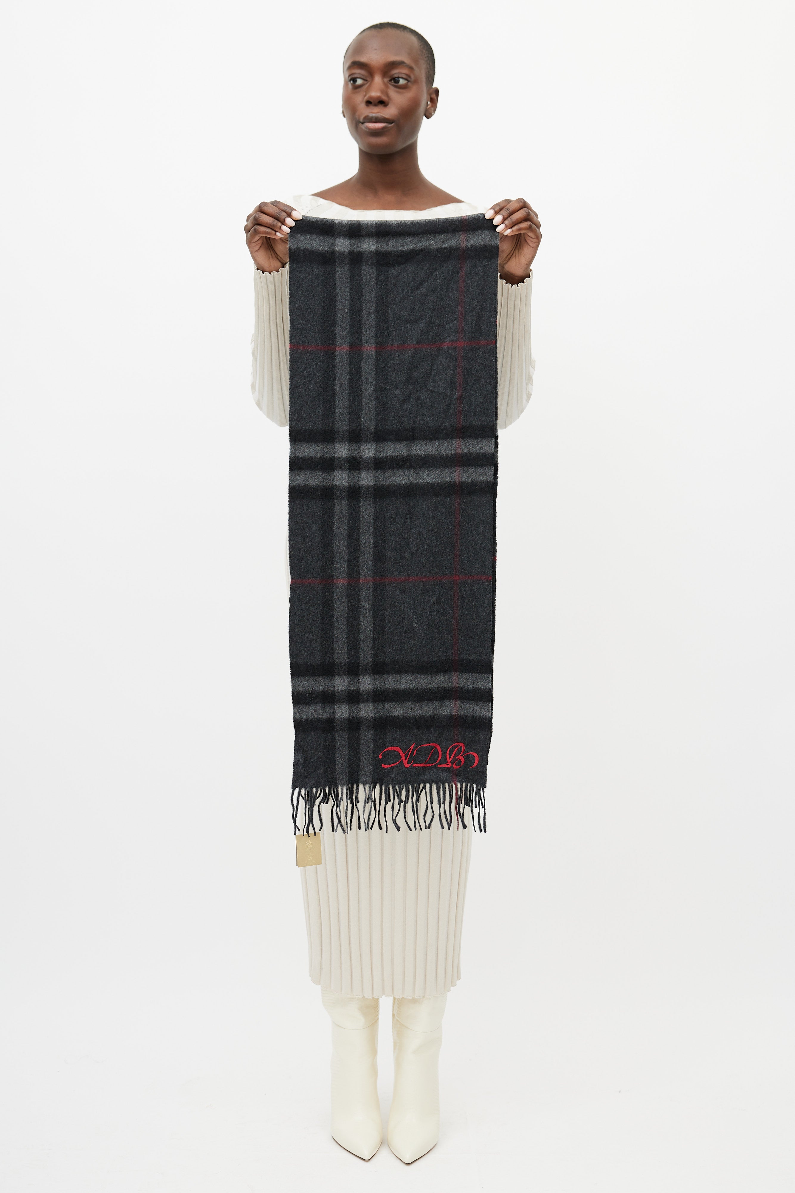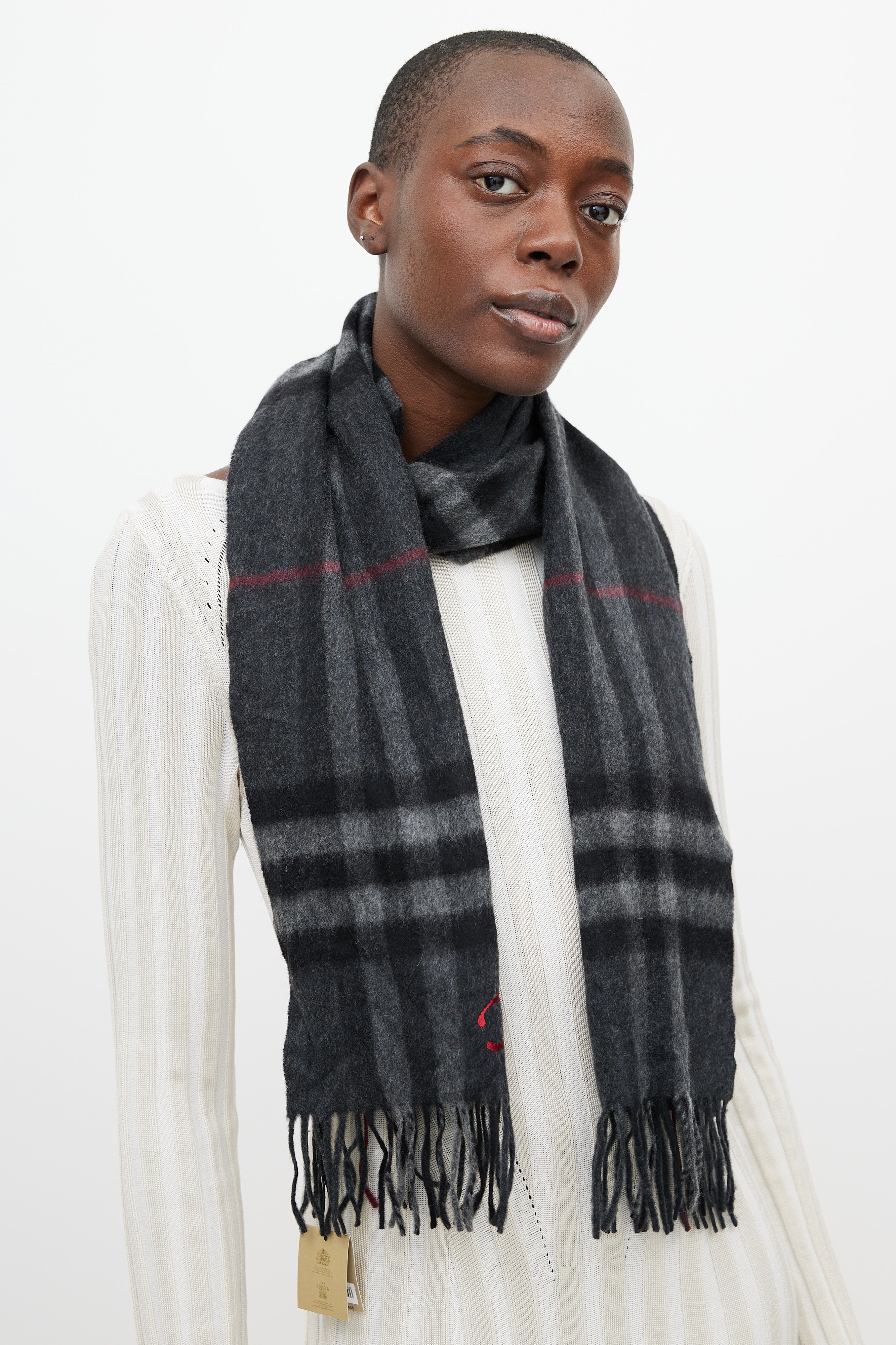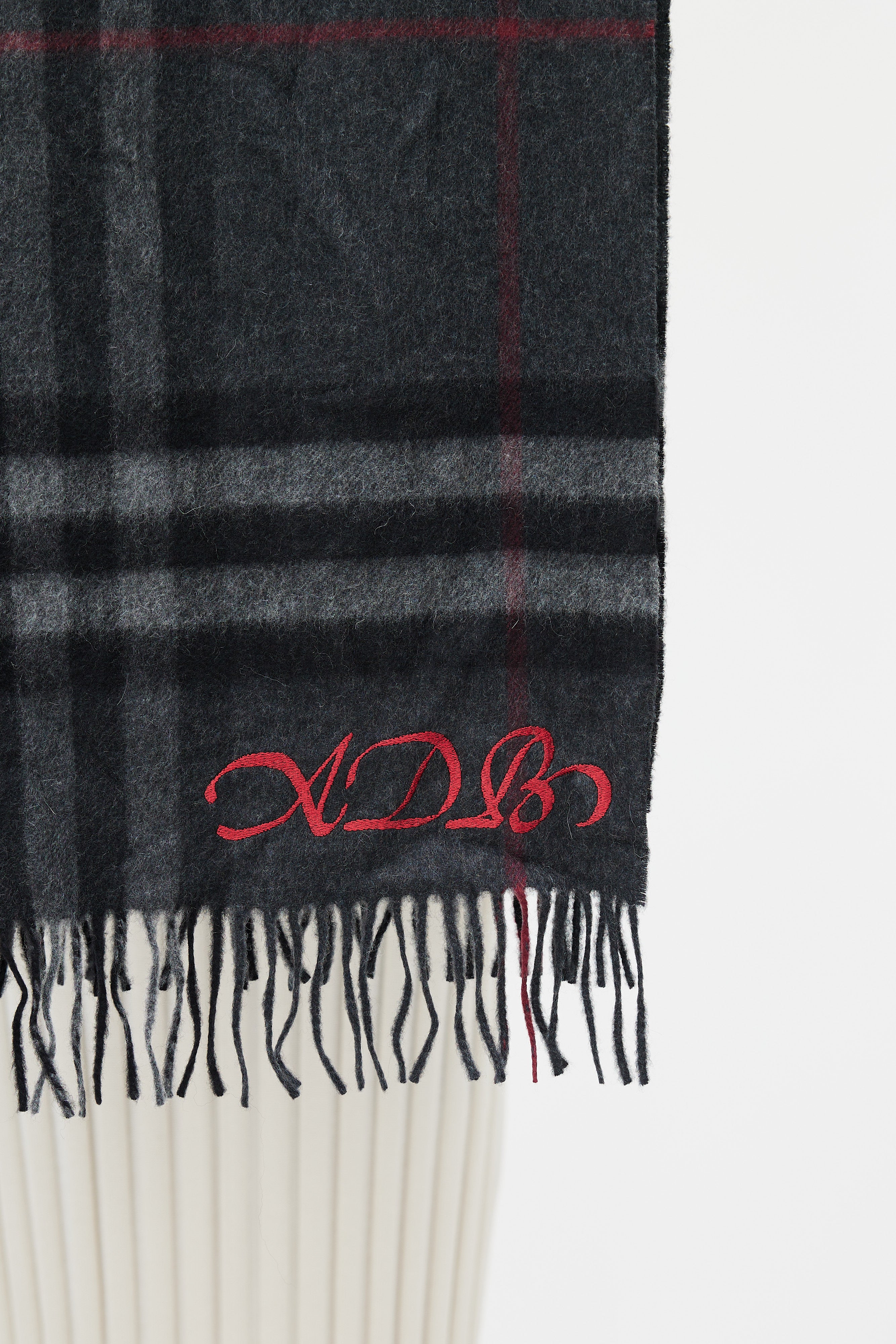 Burberry grey cashmere scarf featuring a red Nova Check pattern throughout, embroidered detail at corner, and fringe trim.