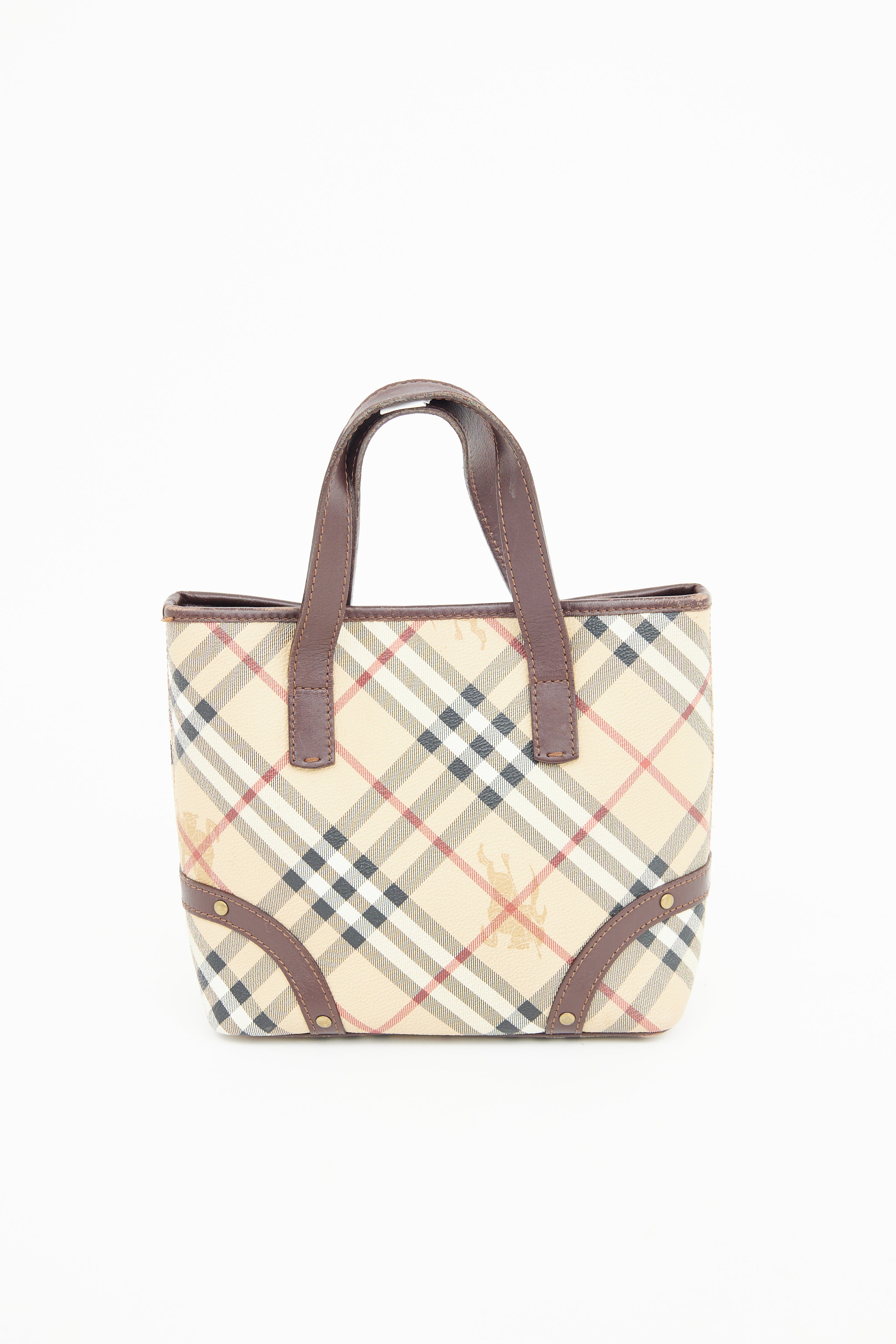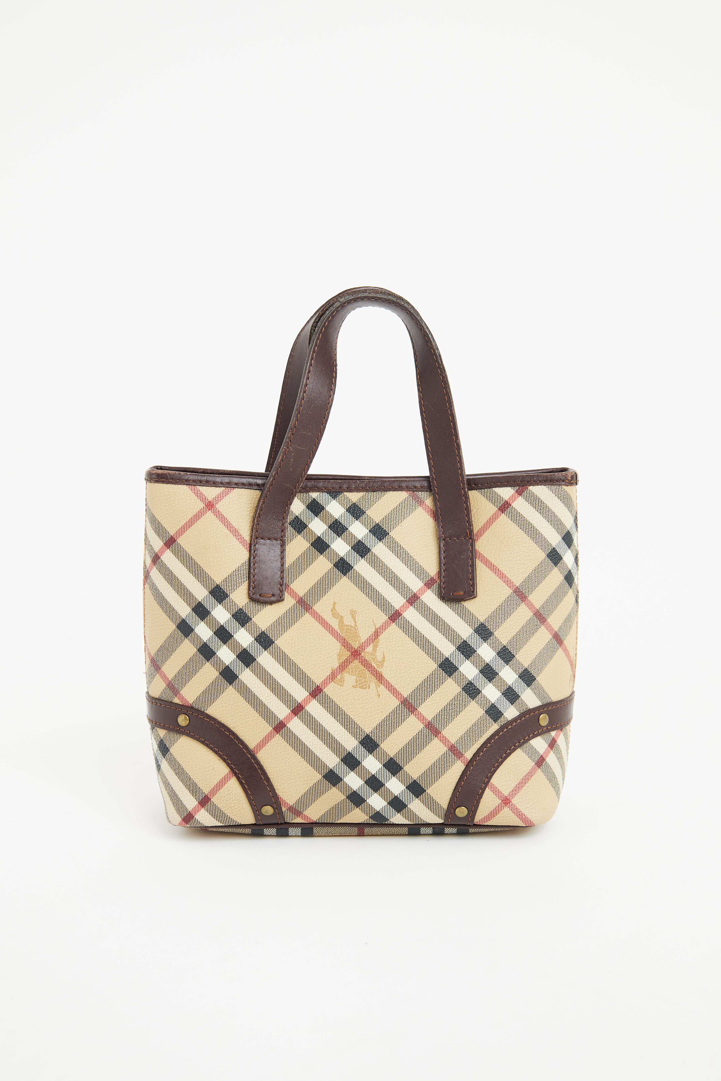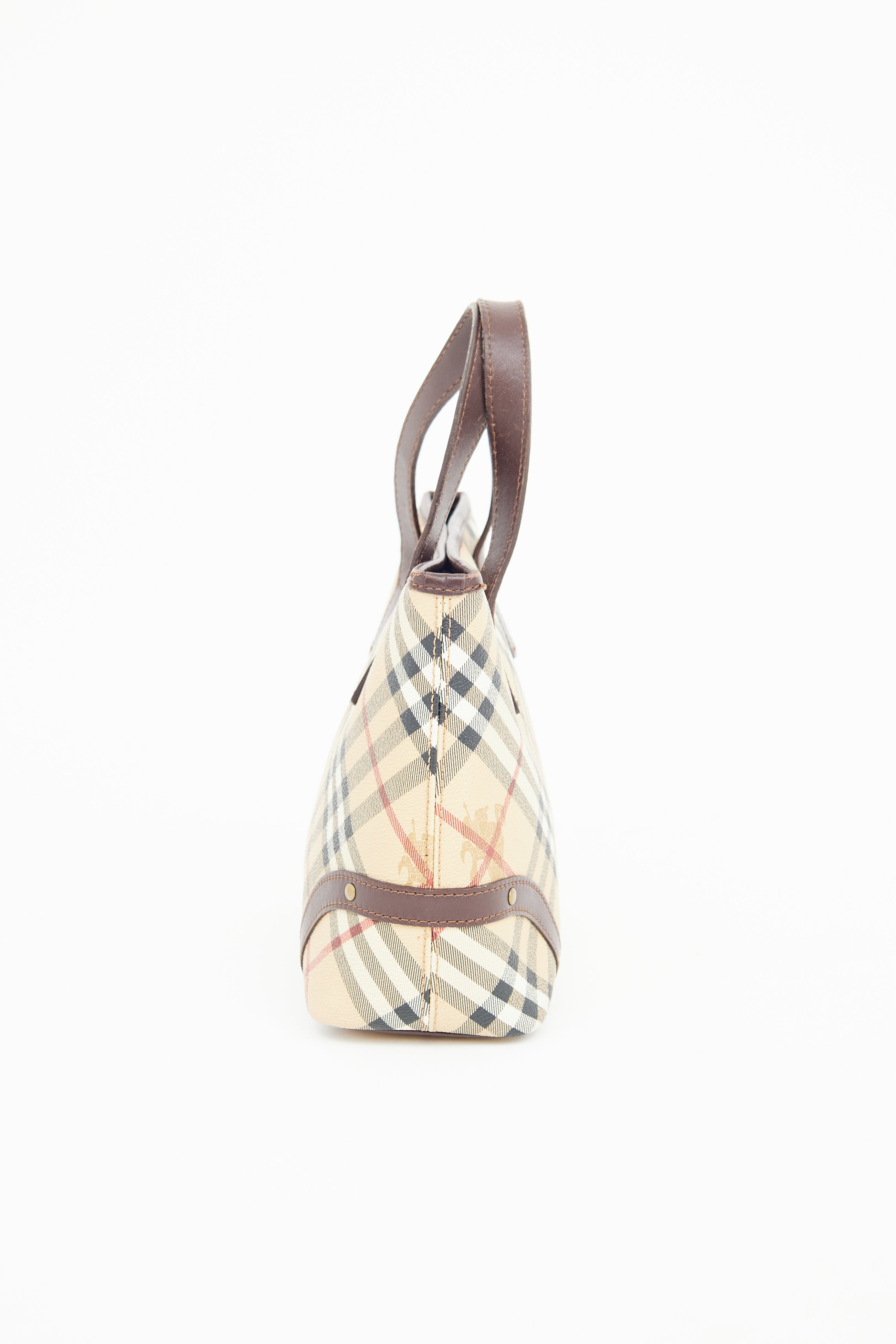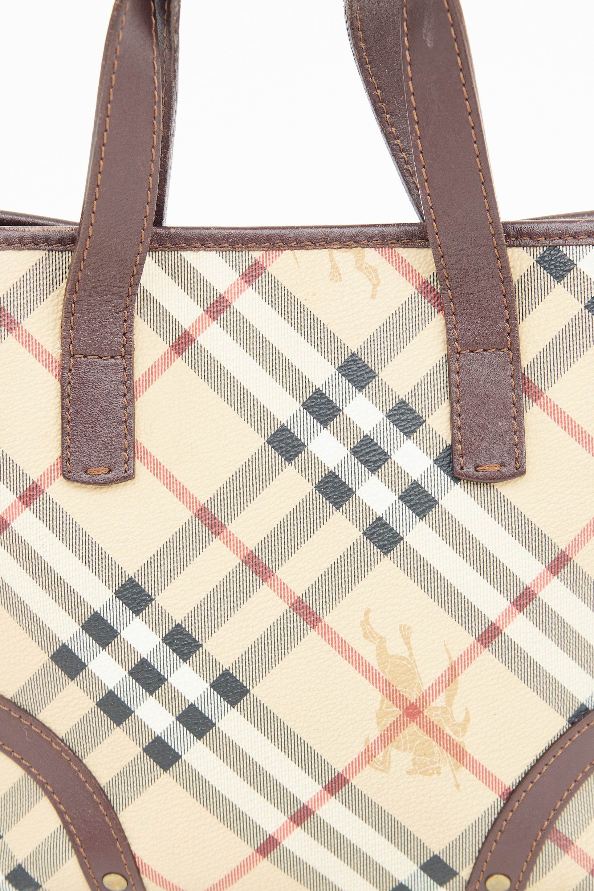 Pre-owned Burberry Haymarket check tote bag featuring dual flat top handles, signature Nova Check print, gold tone stud detailing and magnetic button closure top. Canvas lined main compartment and single zip pocket.