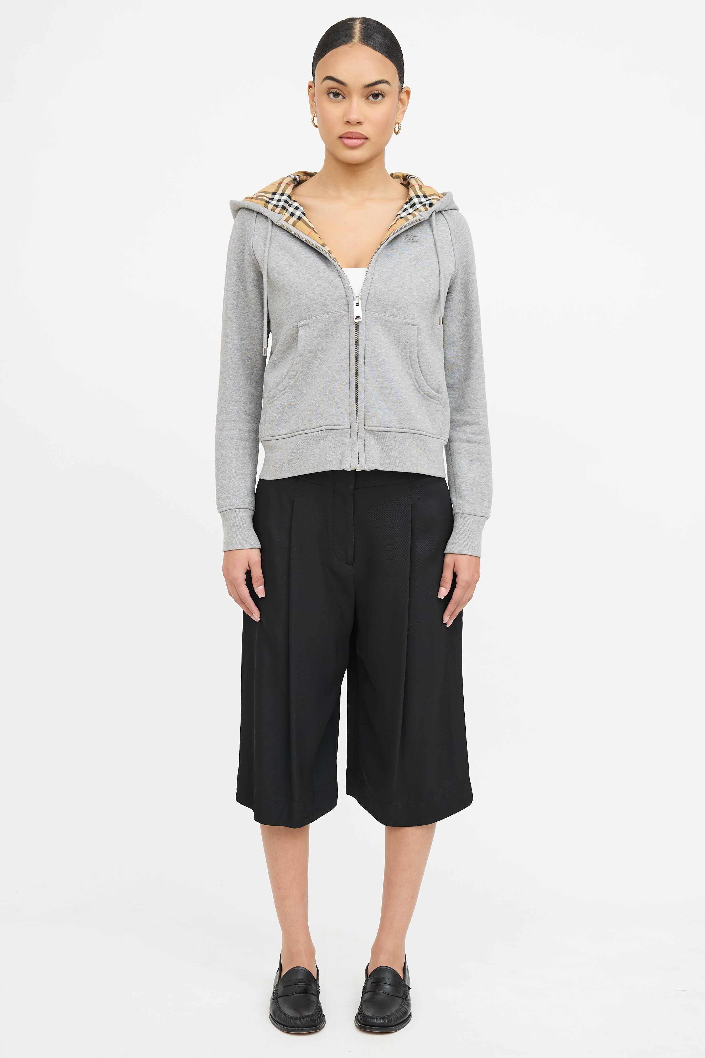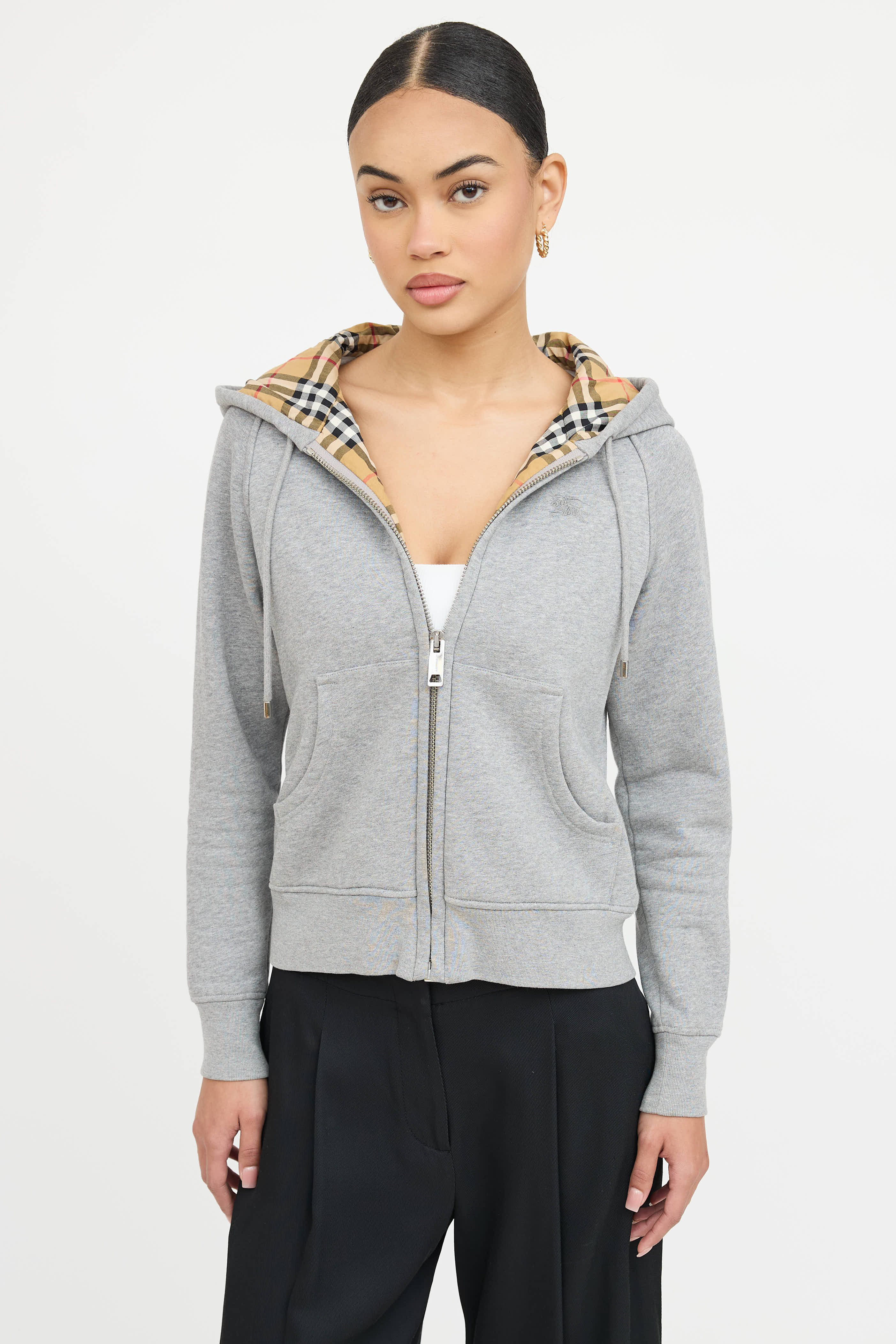 Pre-owned Burberry grey long sleeve hoodie featuring House Check lining, attached drawstring hood, zip front, embroiderd logo at chest, raglan sleeves, slit pockets at front, and ribbed cuffs.