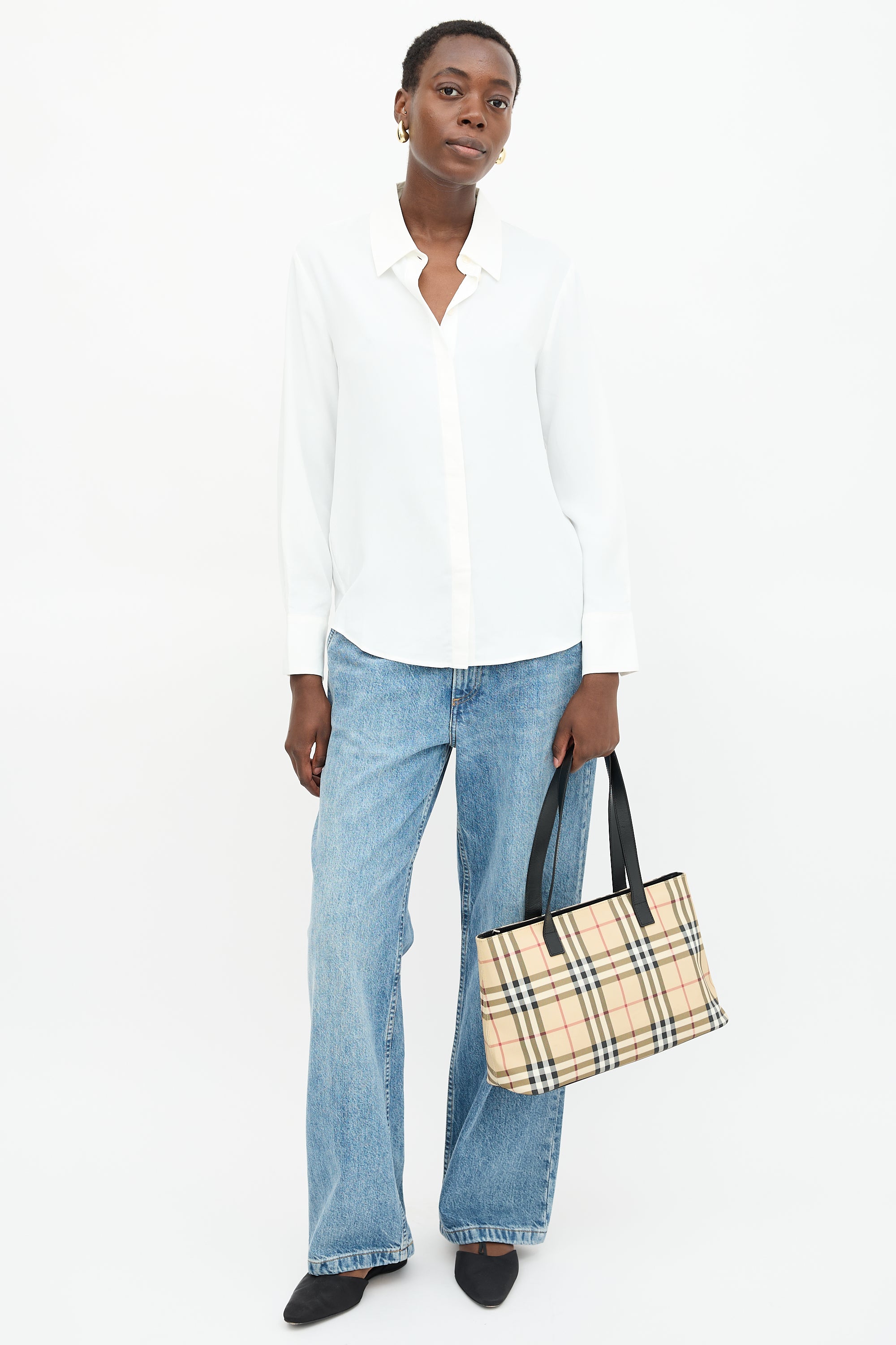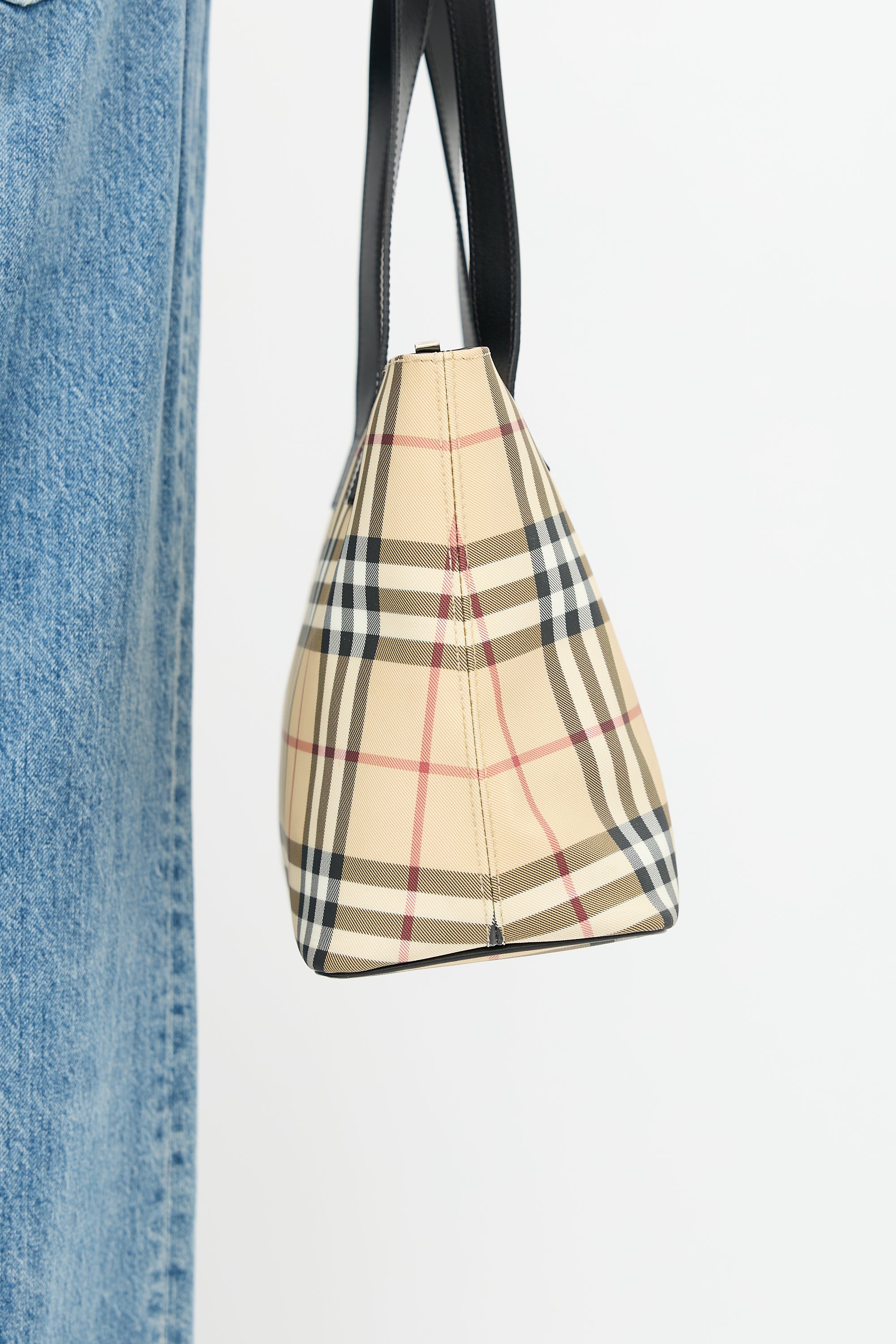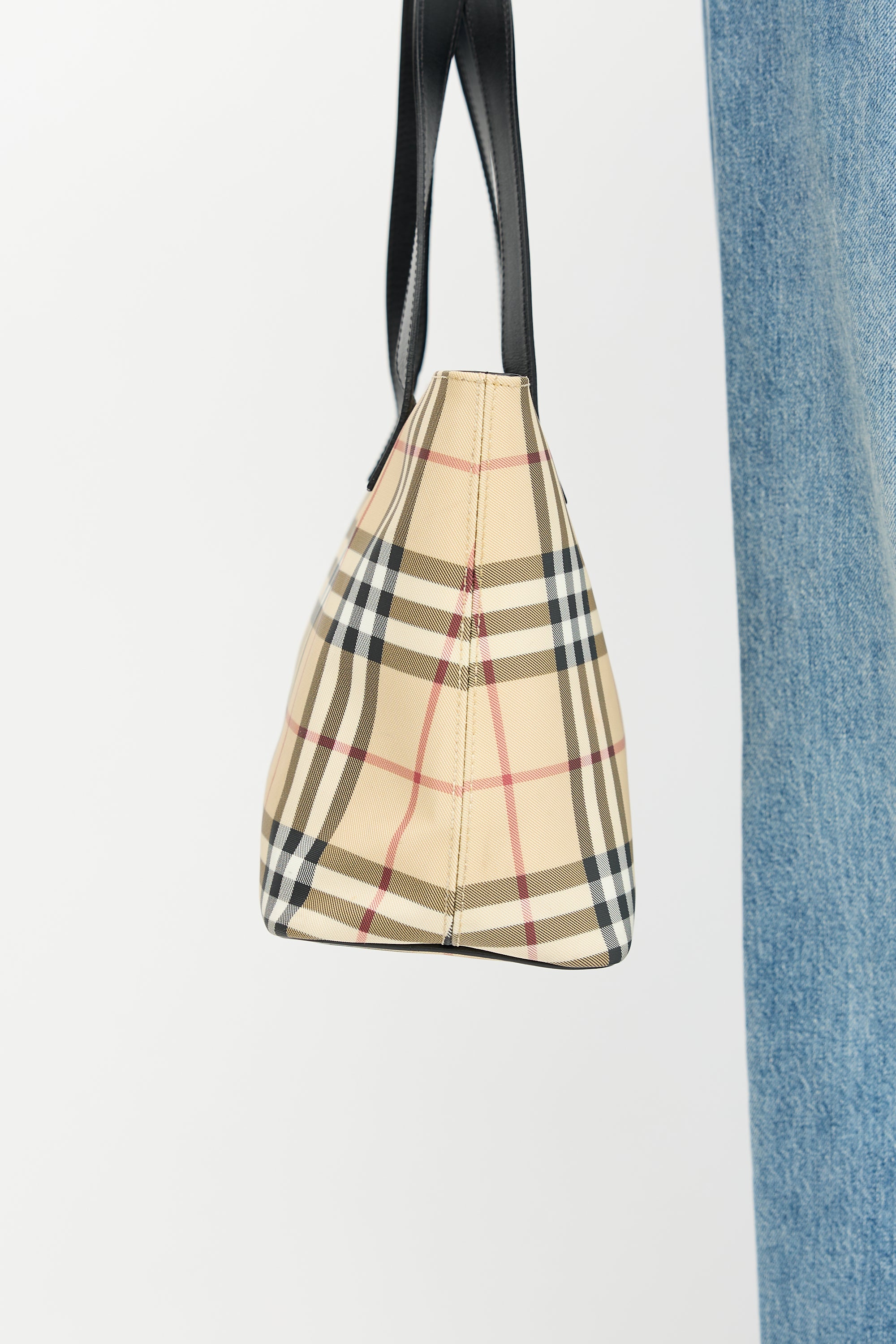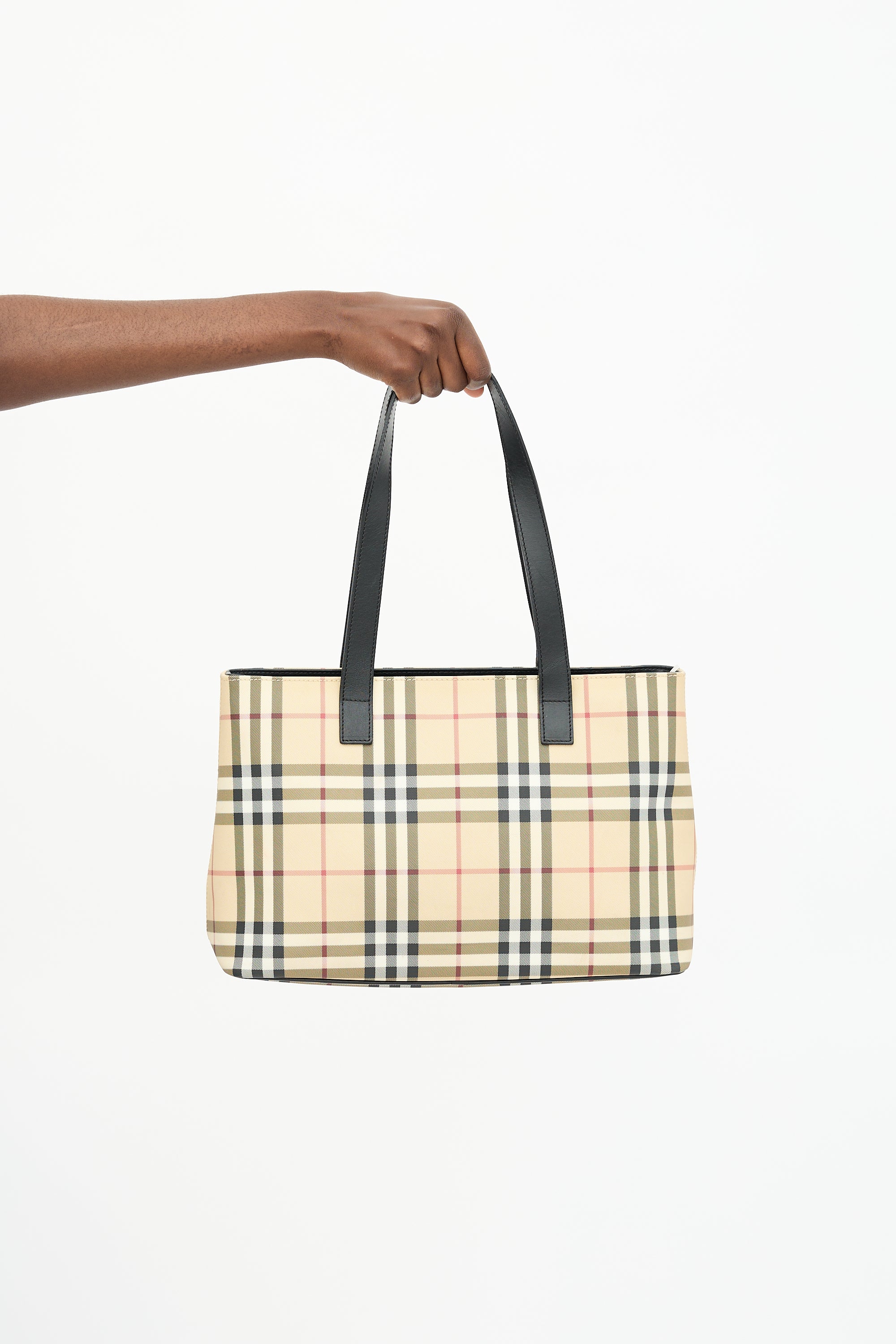 Pre-owned Burberry tote bag featuring House Check coated canvas, black leather handles, top zip closure, and one lined main compartment with one zip pocket. Comes with original dust bag.
