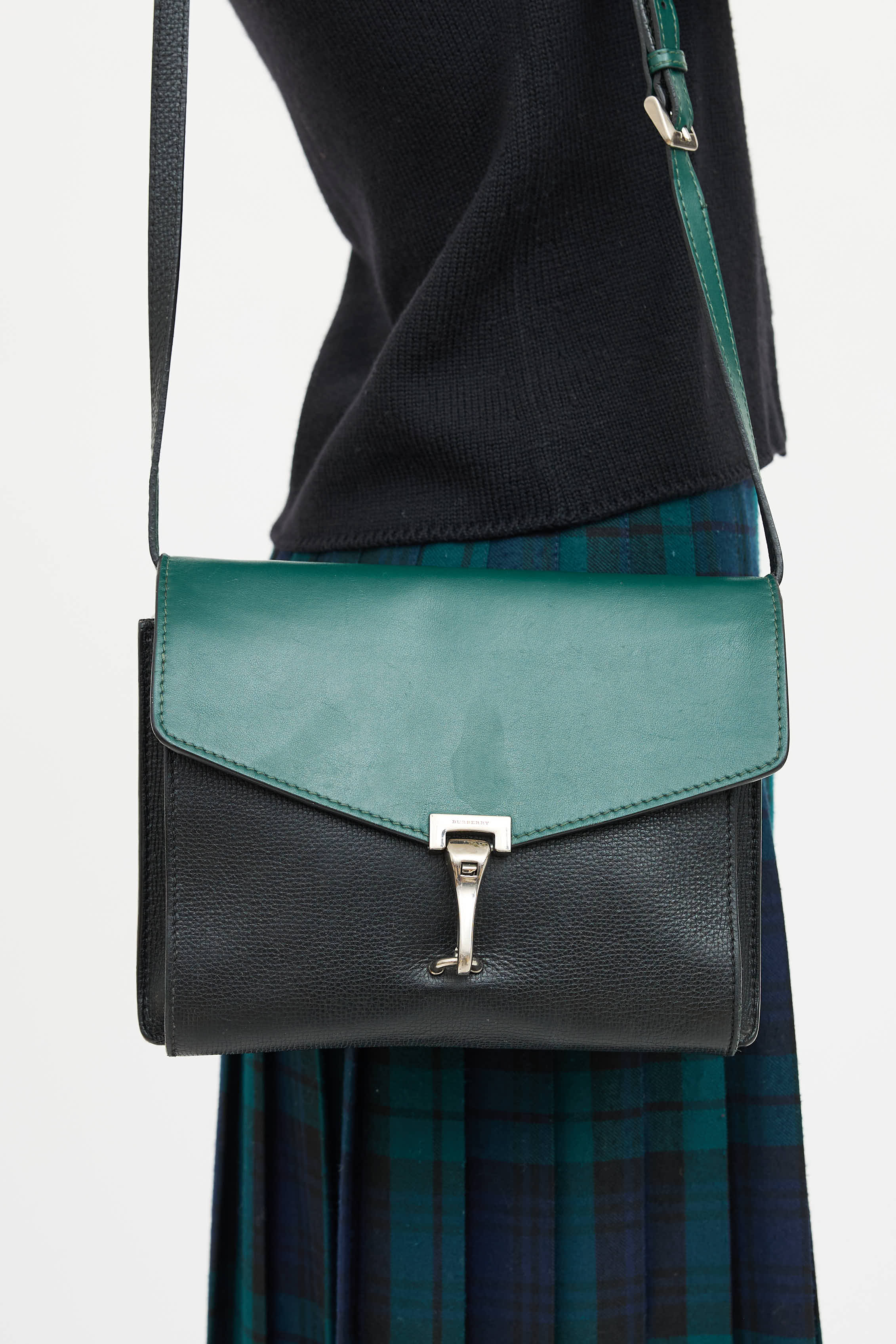 Pre-owned Burberry black and green Macken crossbody bag featuring silver tone hardware, hook clasp closure, adjustable crossbody strap, zip pocket at back, interior slip pocket, and one main compartment with one slip pocket.