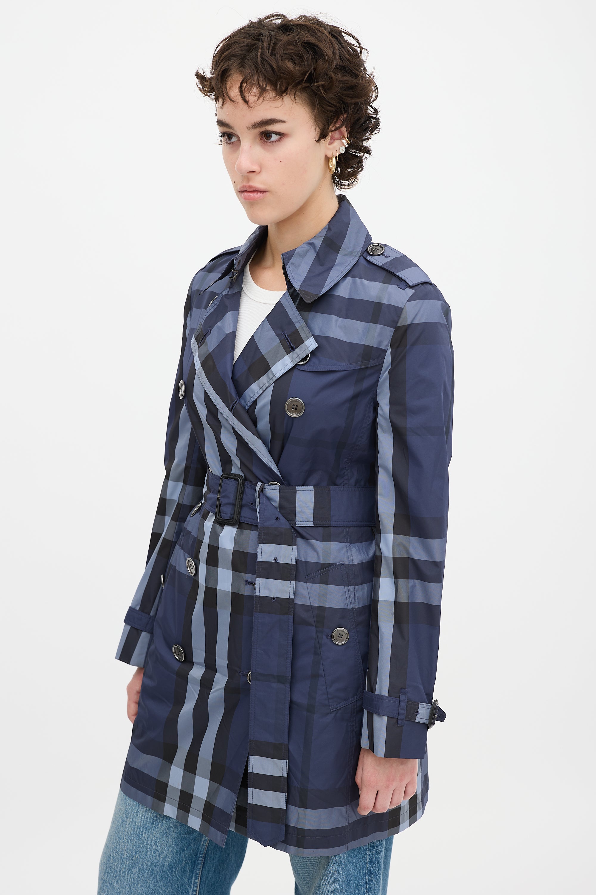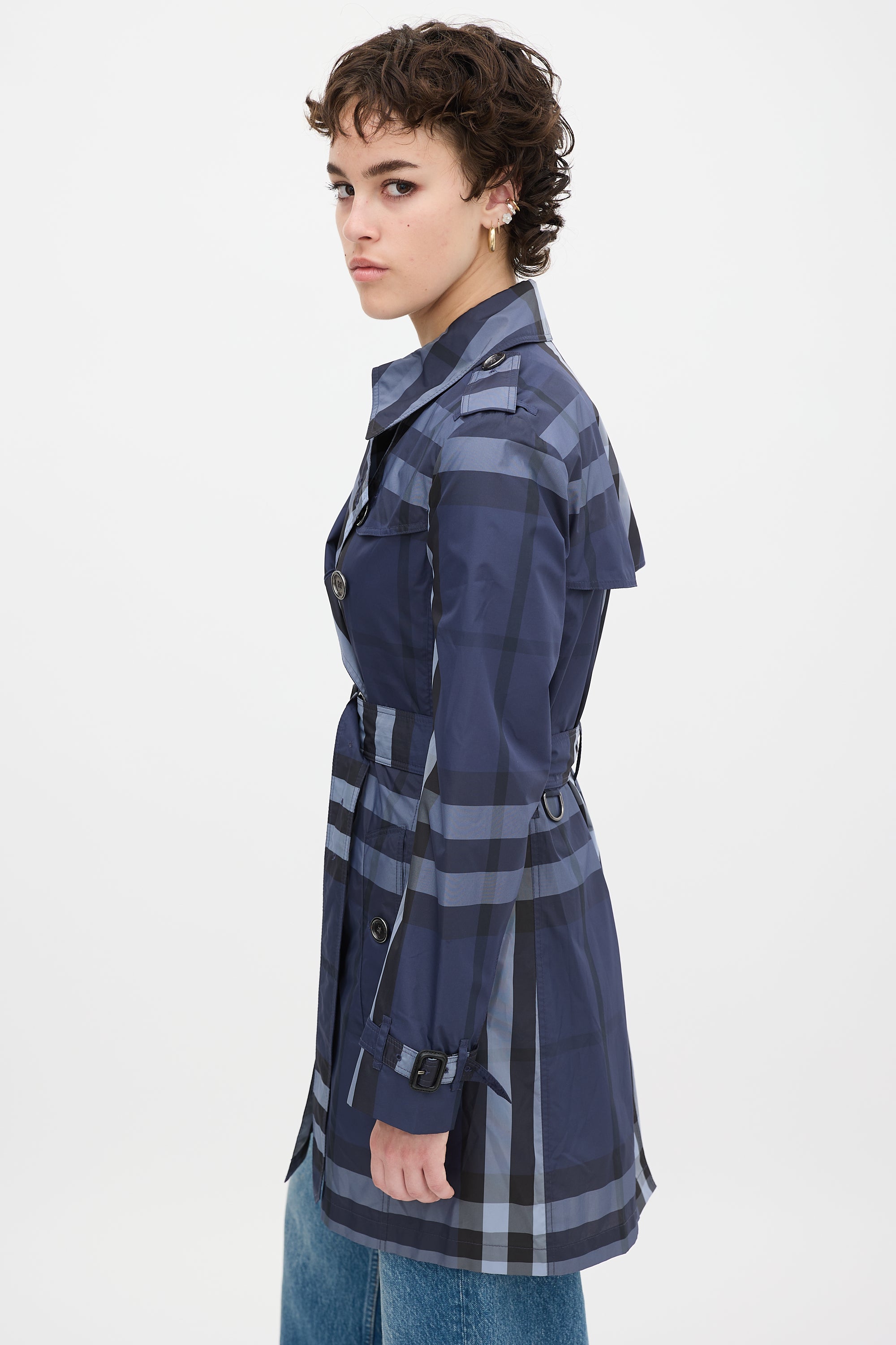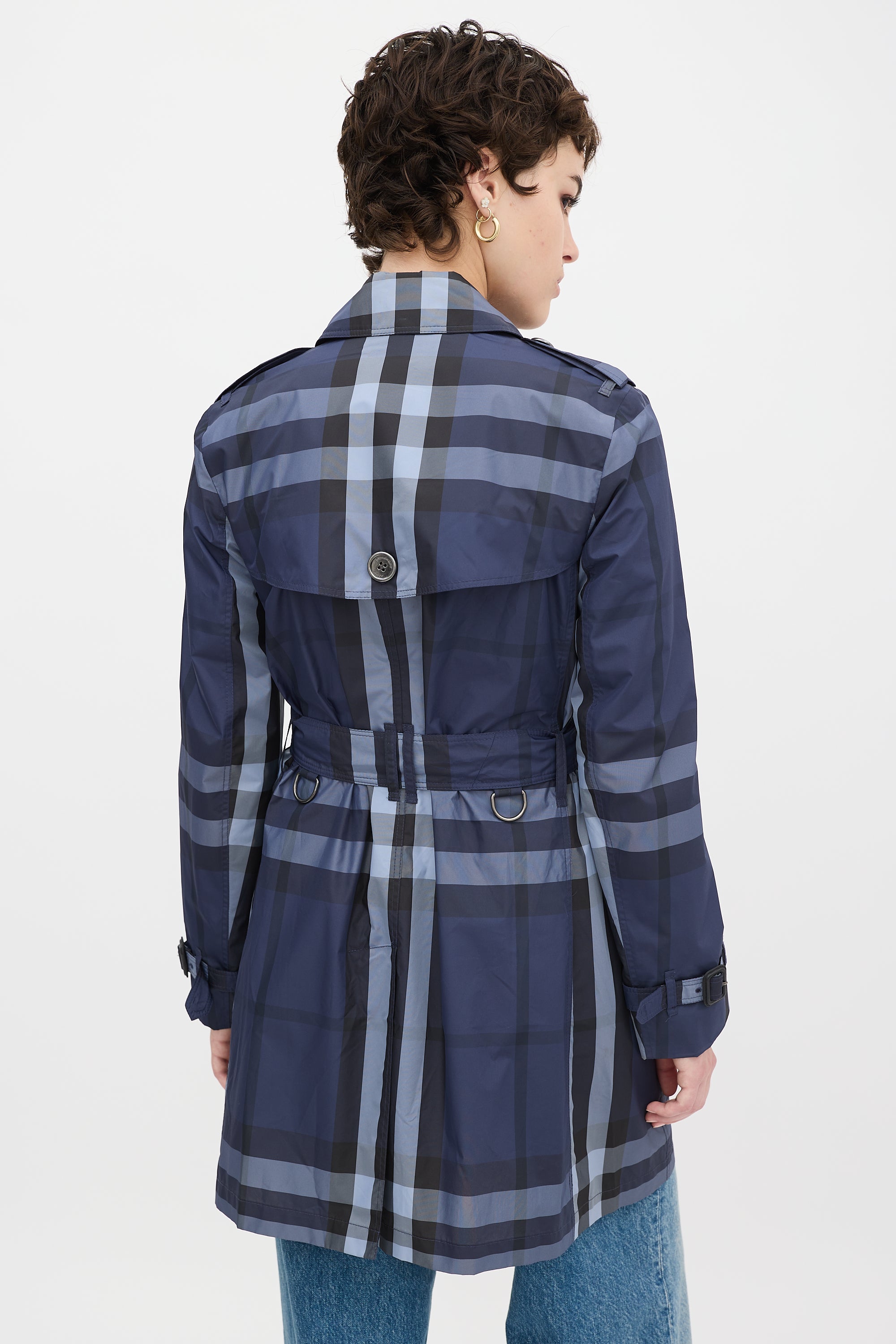 Pre-owned Burberry navy mid length trench coat featuring a convertible collar, double breasted button up front, signature Nova Check print throughout, two front buttoned slip pockets, storm flap at left shoulder, buttoned back storm shield, back vent, belted waist with silver tone D-ring hardware, epaulettes at shoulders, and long sleeves with buckle strapped cuffs. Lined sleeves.