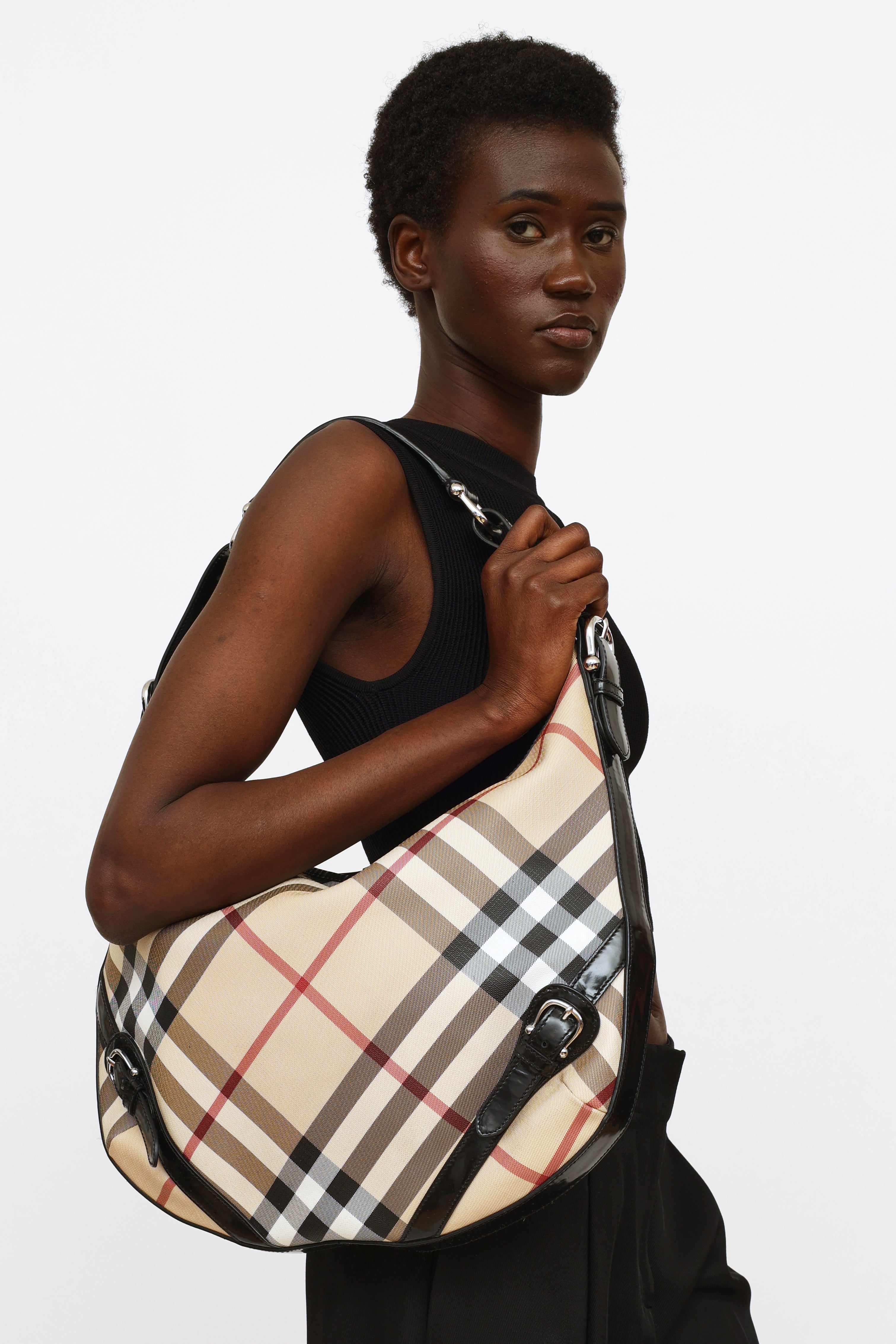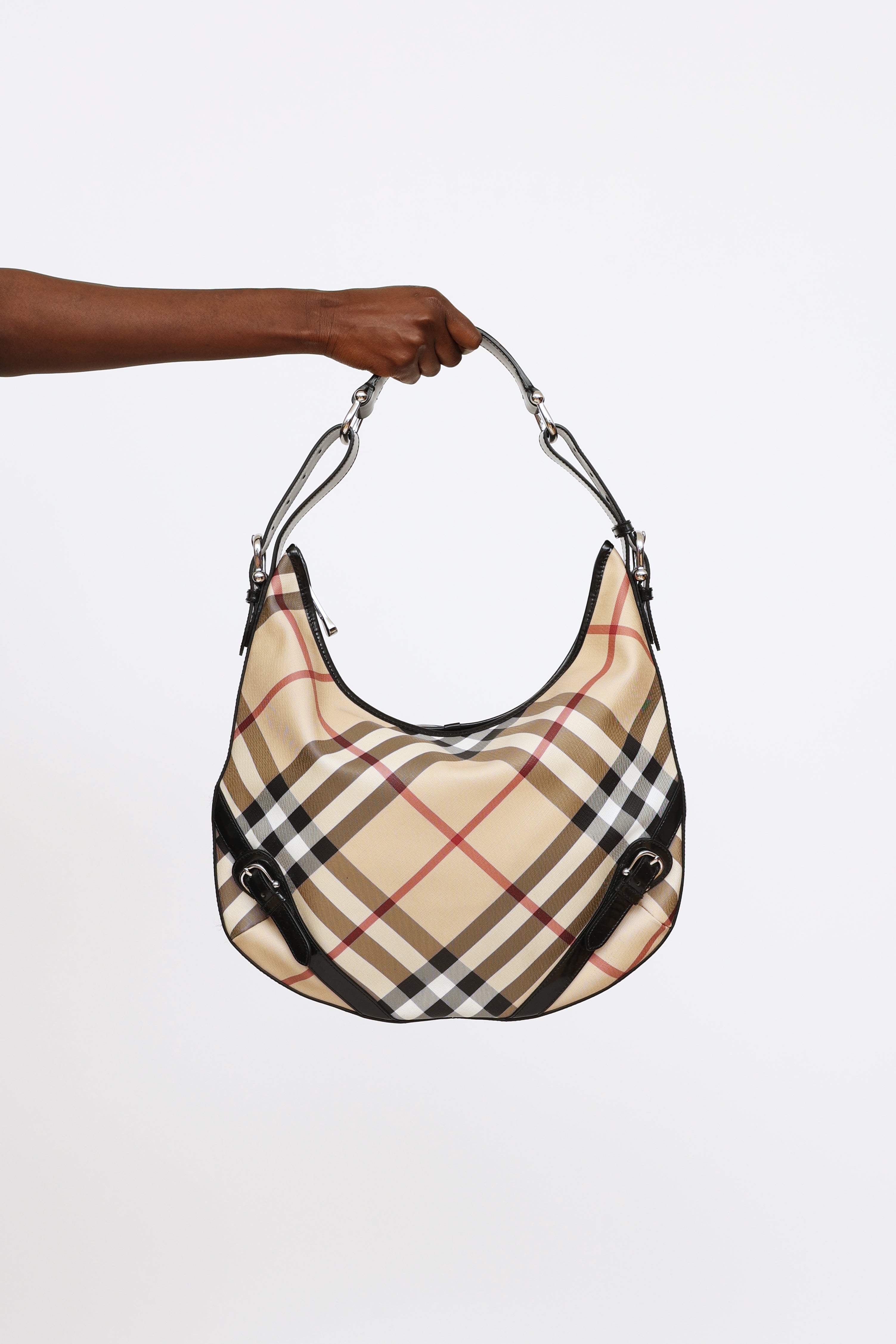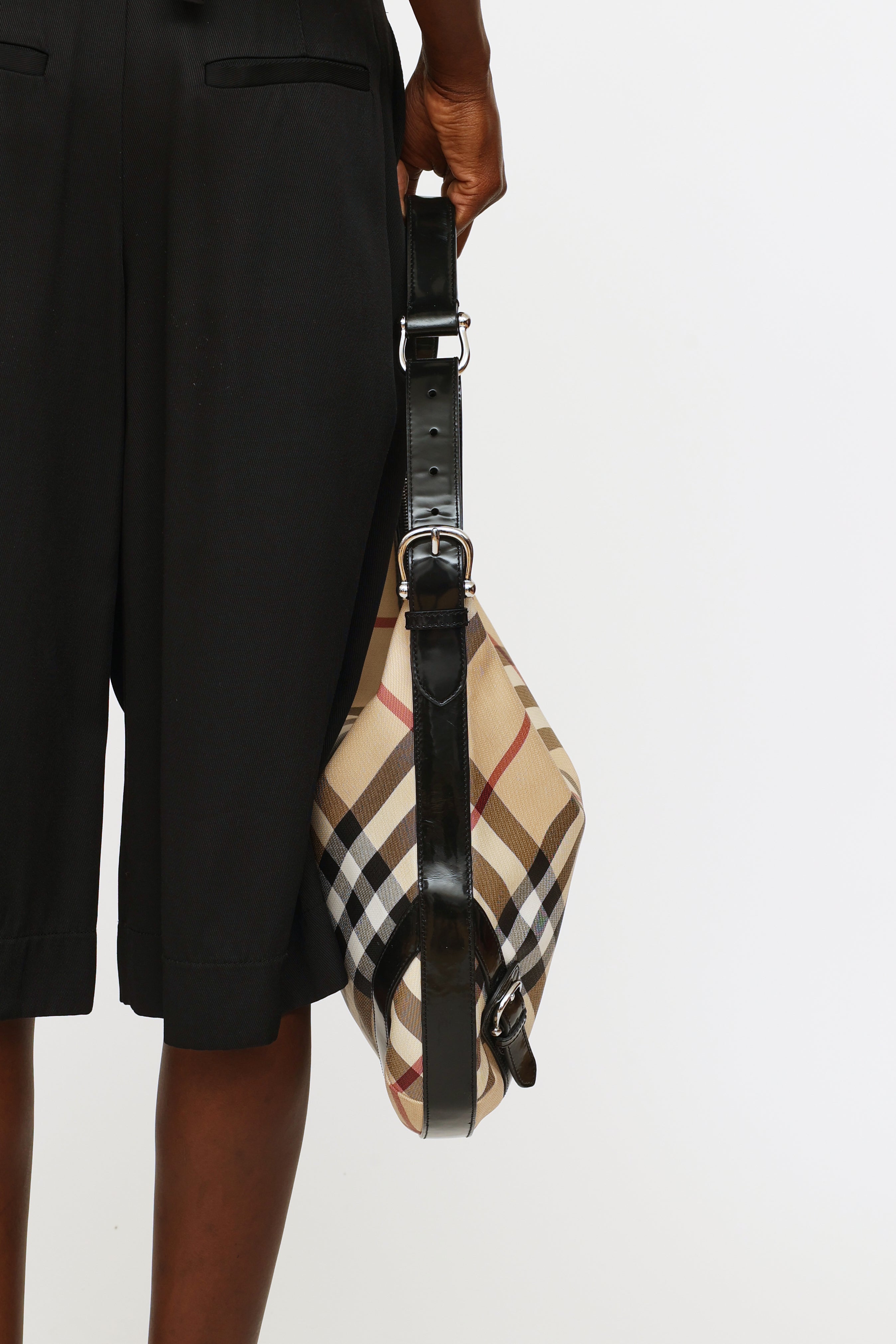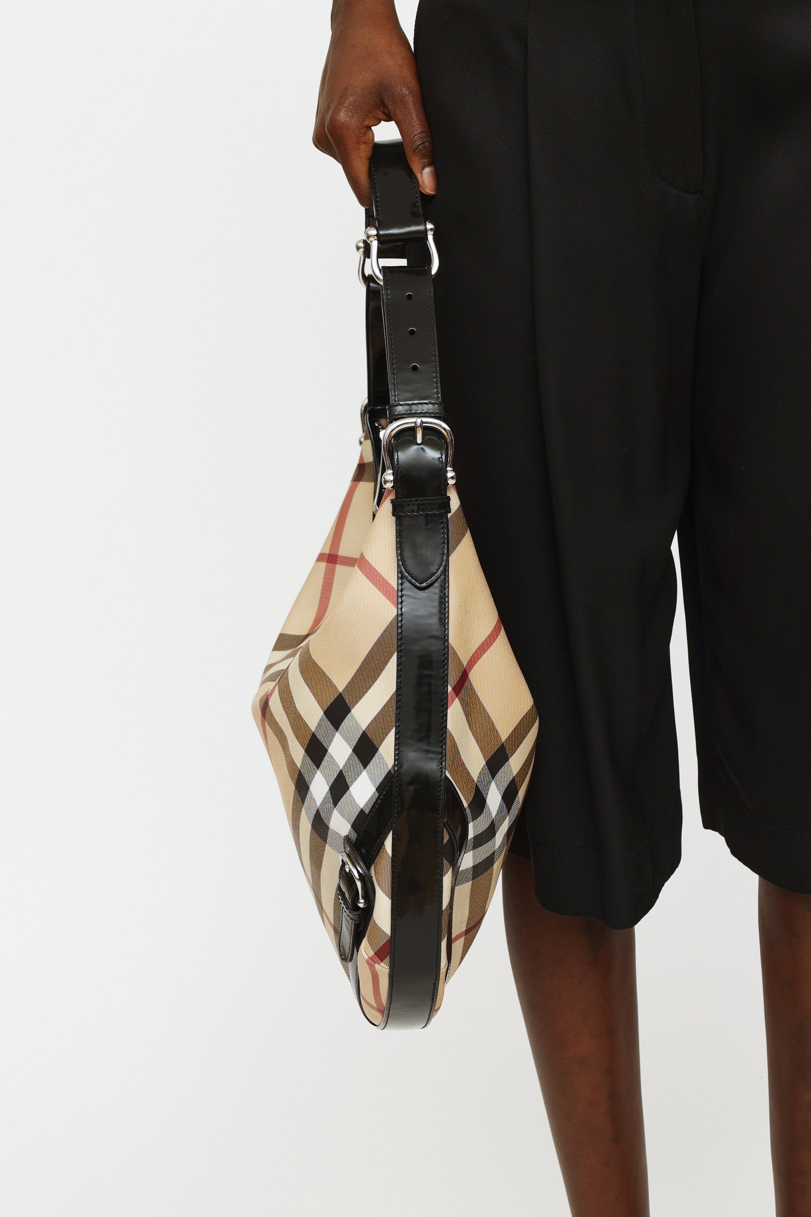 Pre-loved Burberry Nova Check Barton shoulder bag featuring signature nova check exterior with black leather trim, rounded shape, single shoulder strap with adjustable buckle and horse-bit detailing, zip closure at top, dual faux buckles on bottom front and silver-tone hardware. Interior features one main compartment and three slip pockets.