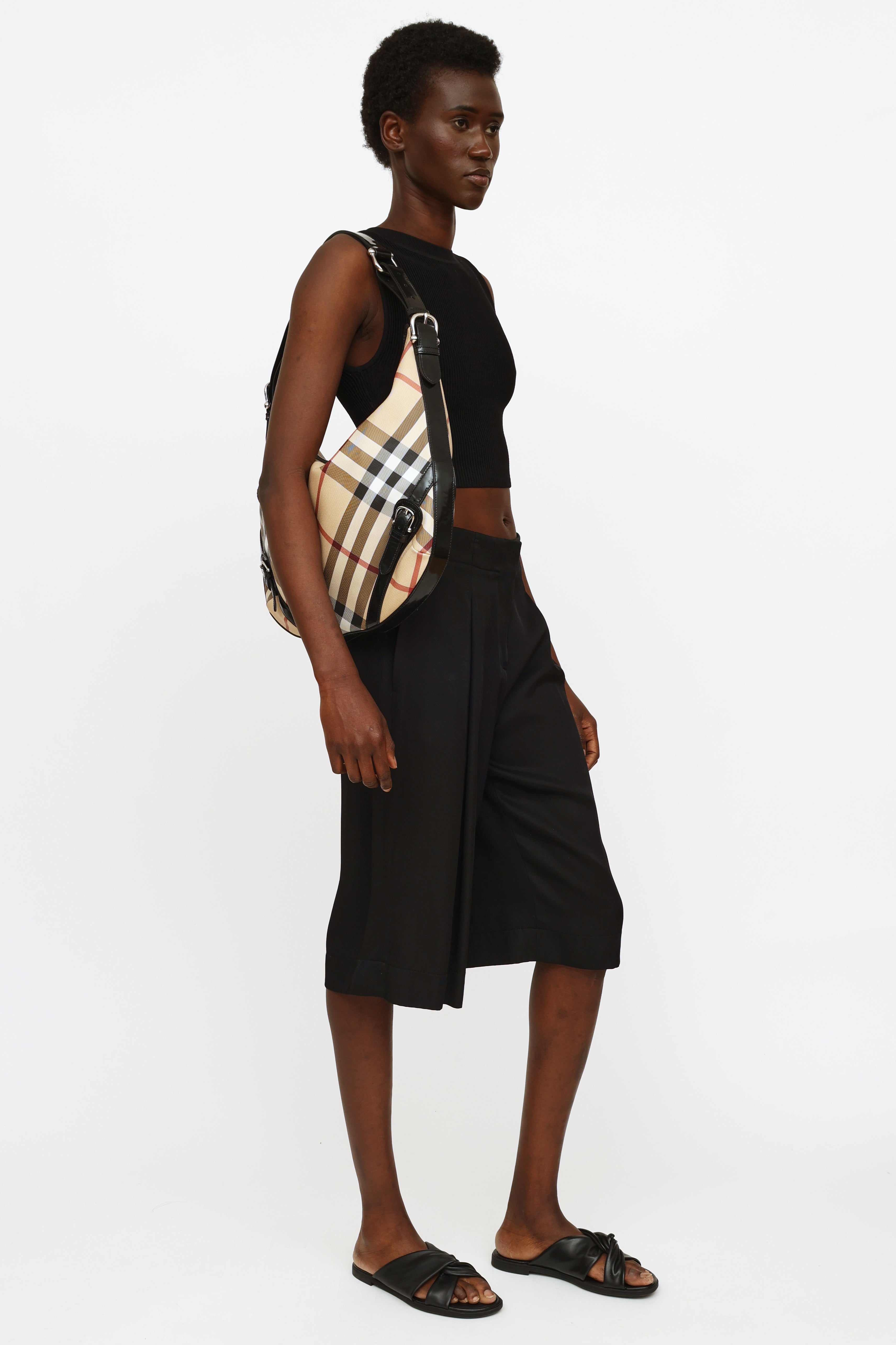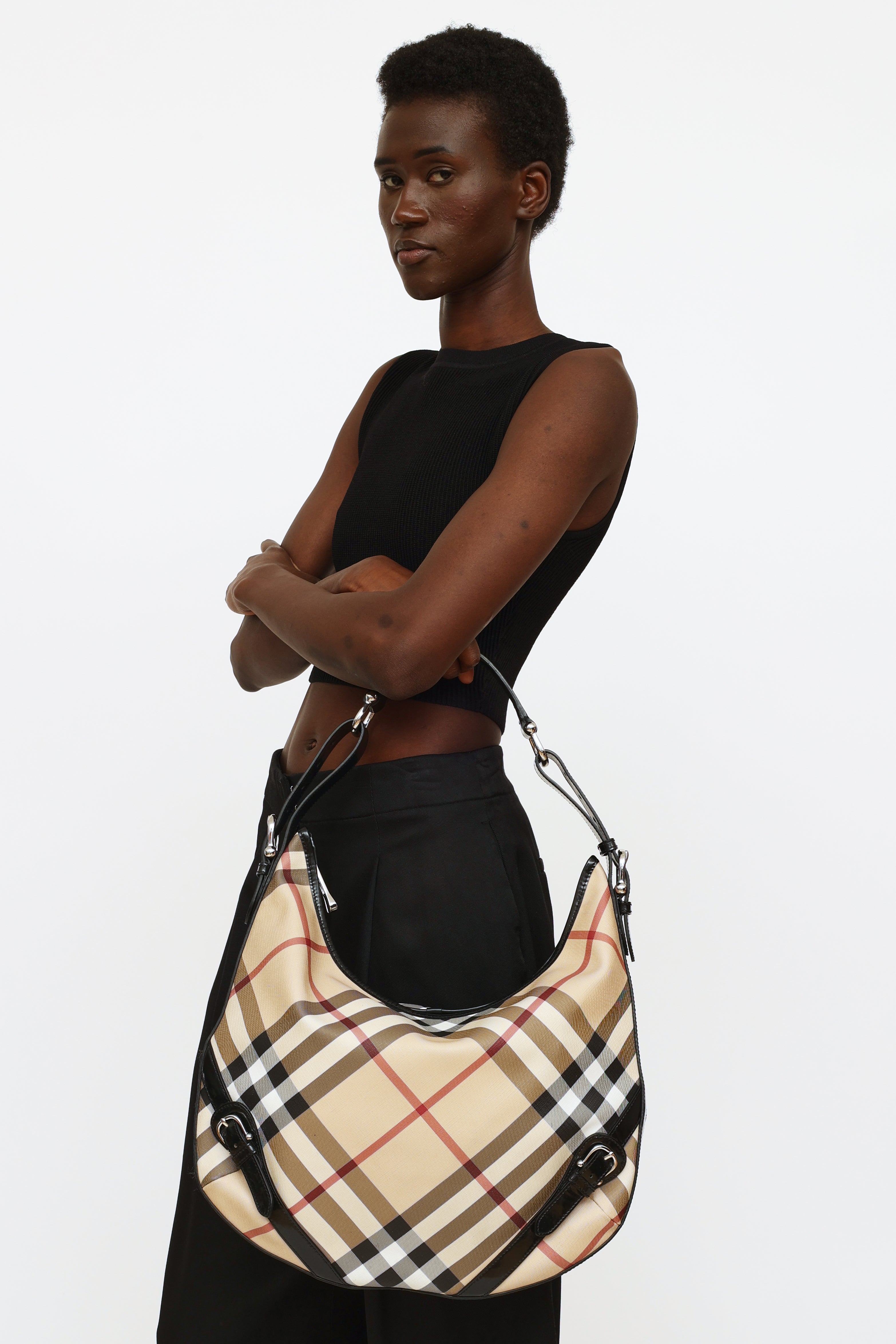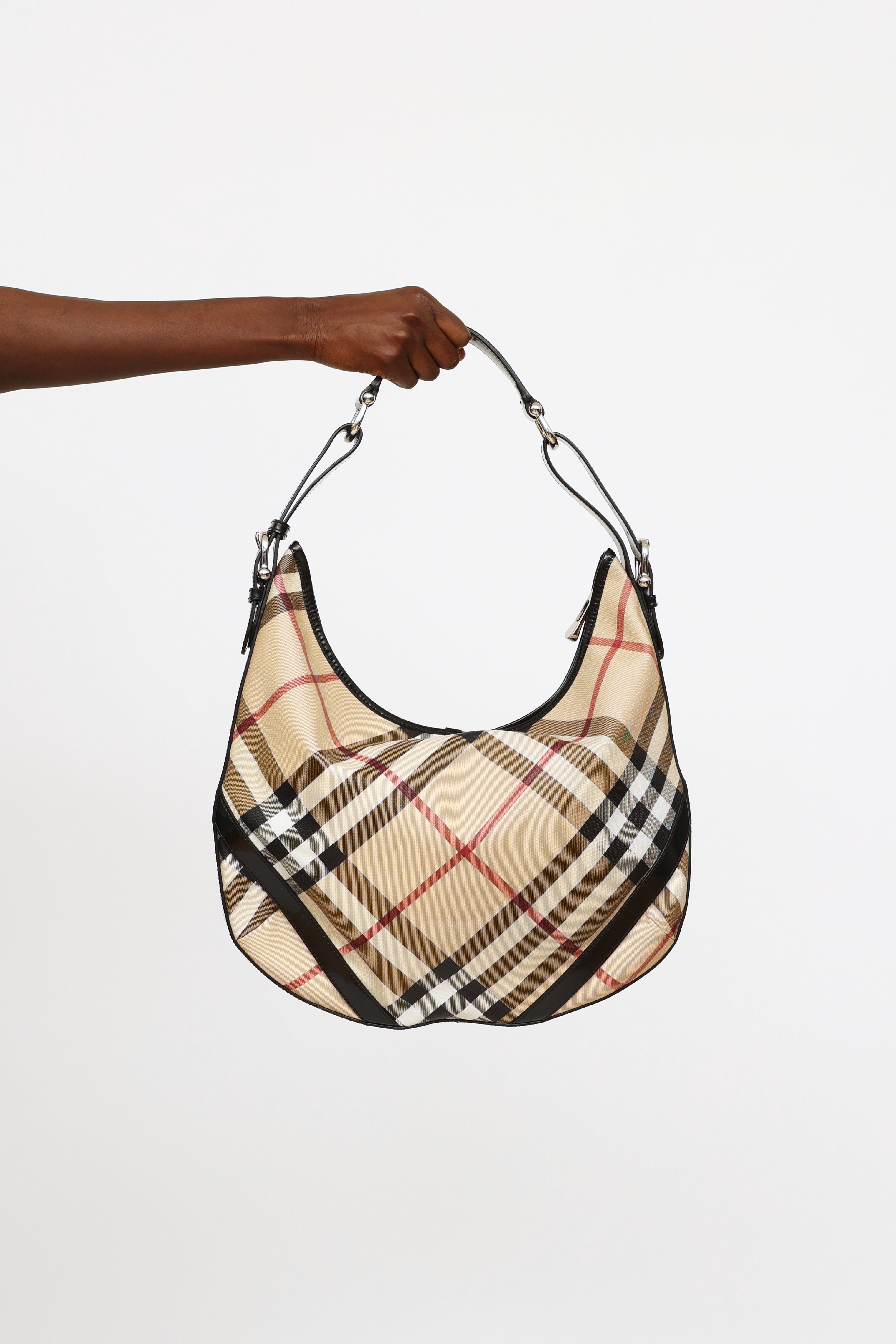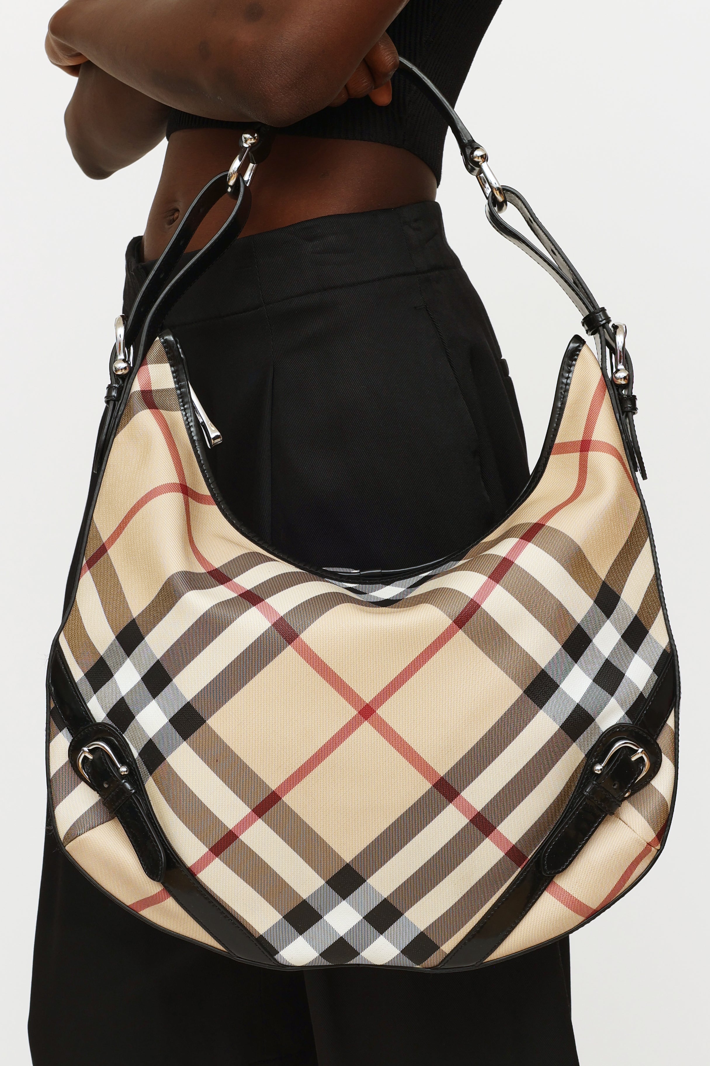 Pre-loved Burberry Nova Check Barton shoulder bag featuring signature nova check exterior with black leather trim, rounded shape, single shoulder strap with adjustable buckle and horse-bit detailing, zip closure at top, dual faux buckles on bottom front and silver-tone hardware. Interior features one main compartment and three slip pockets.