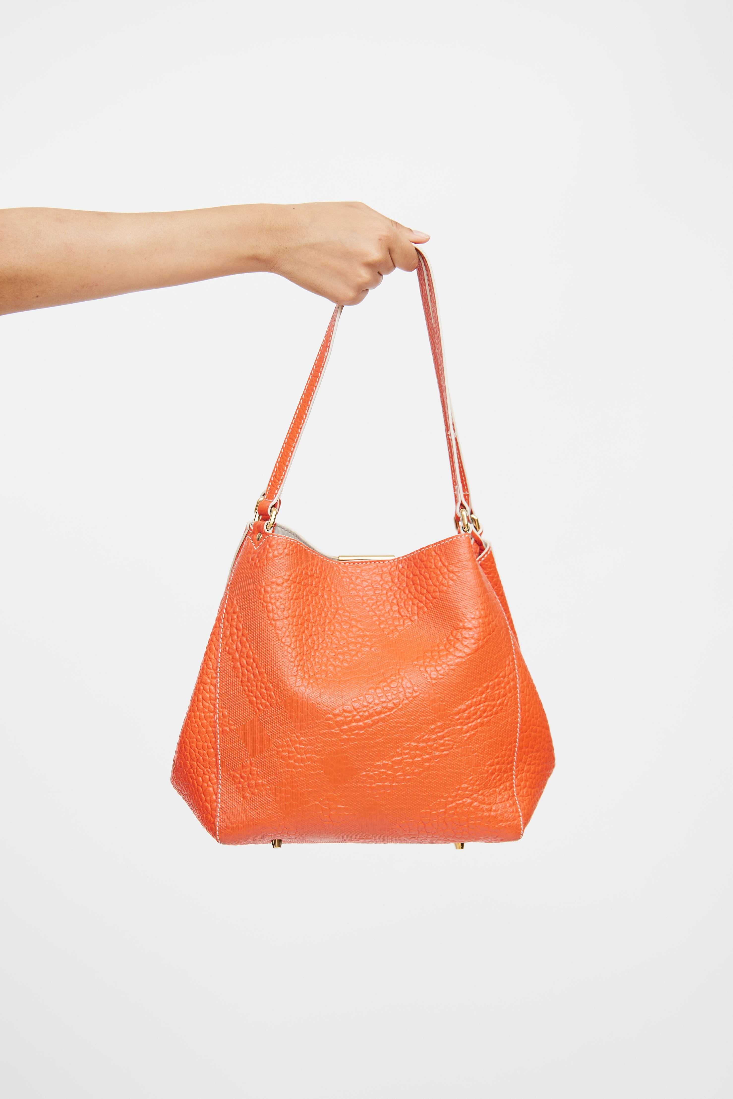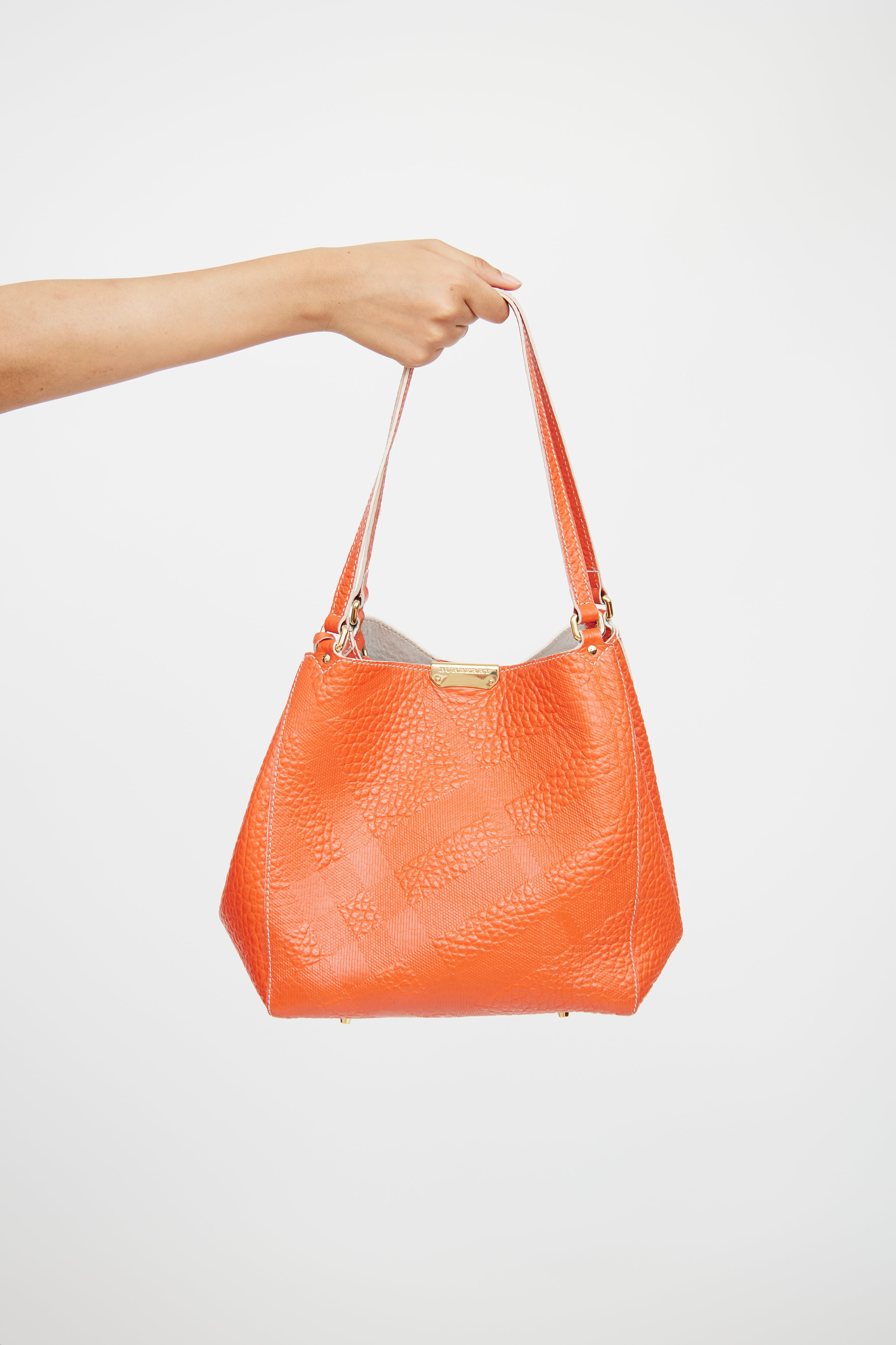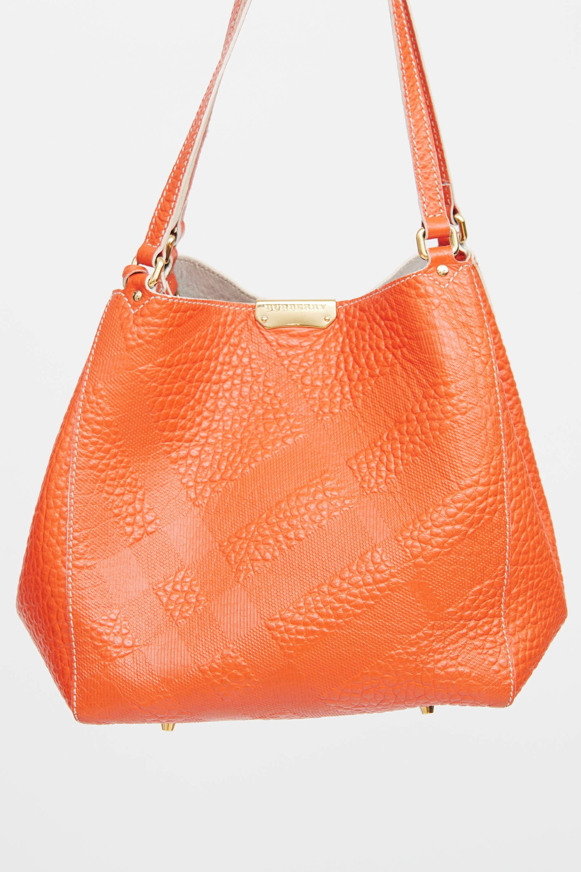 Pre-owned Burberry orange Canterbury tote bag featuring embossed leather, gold tone hardware, protective feet at base, dual handles, magnetic snap closure, one main compartment, detachable orange zipper pouch and detachable logo tag.