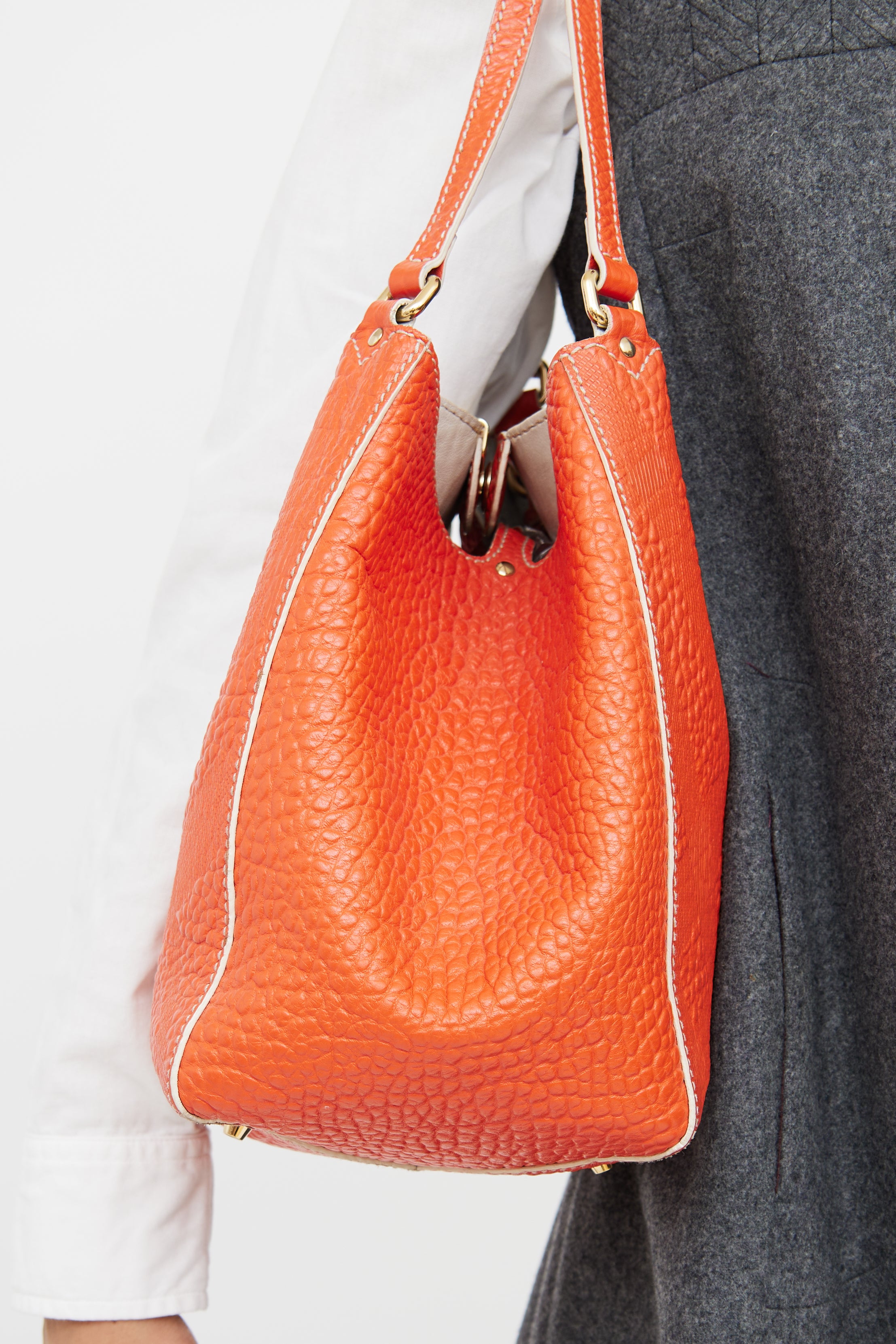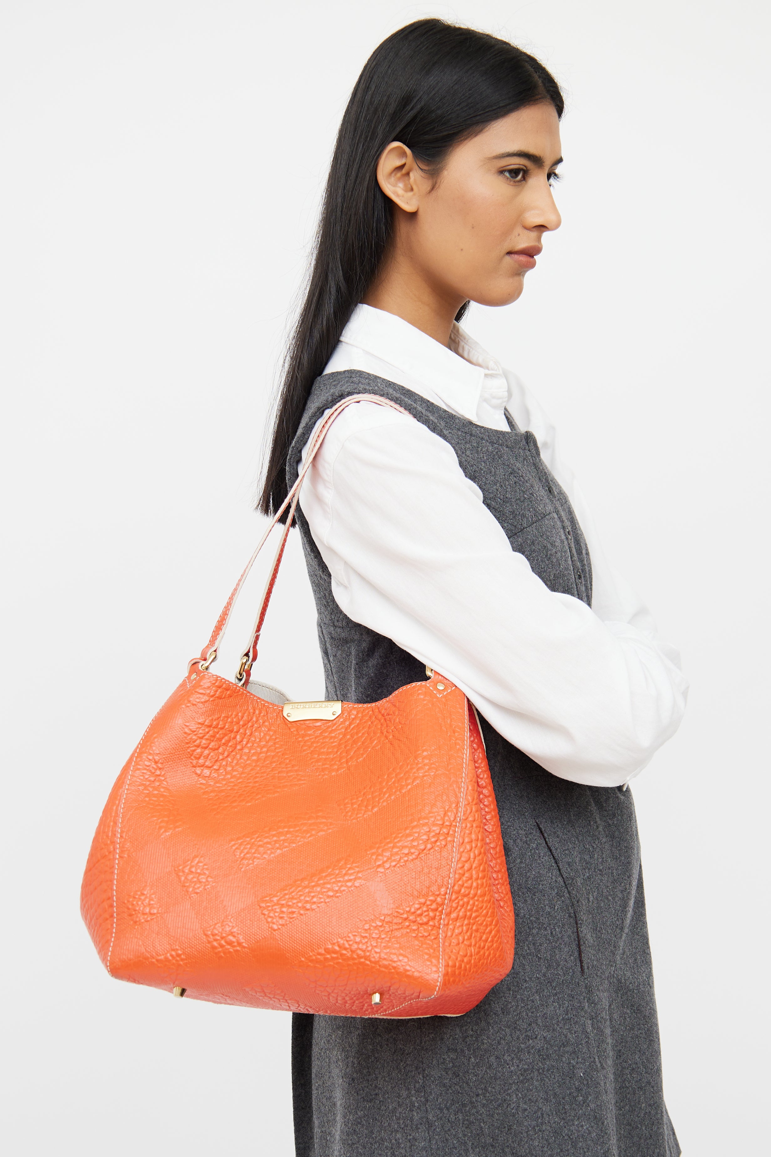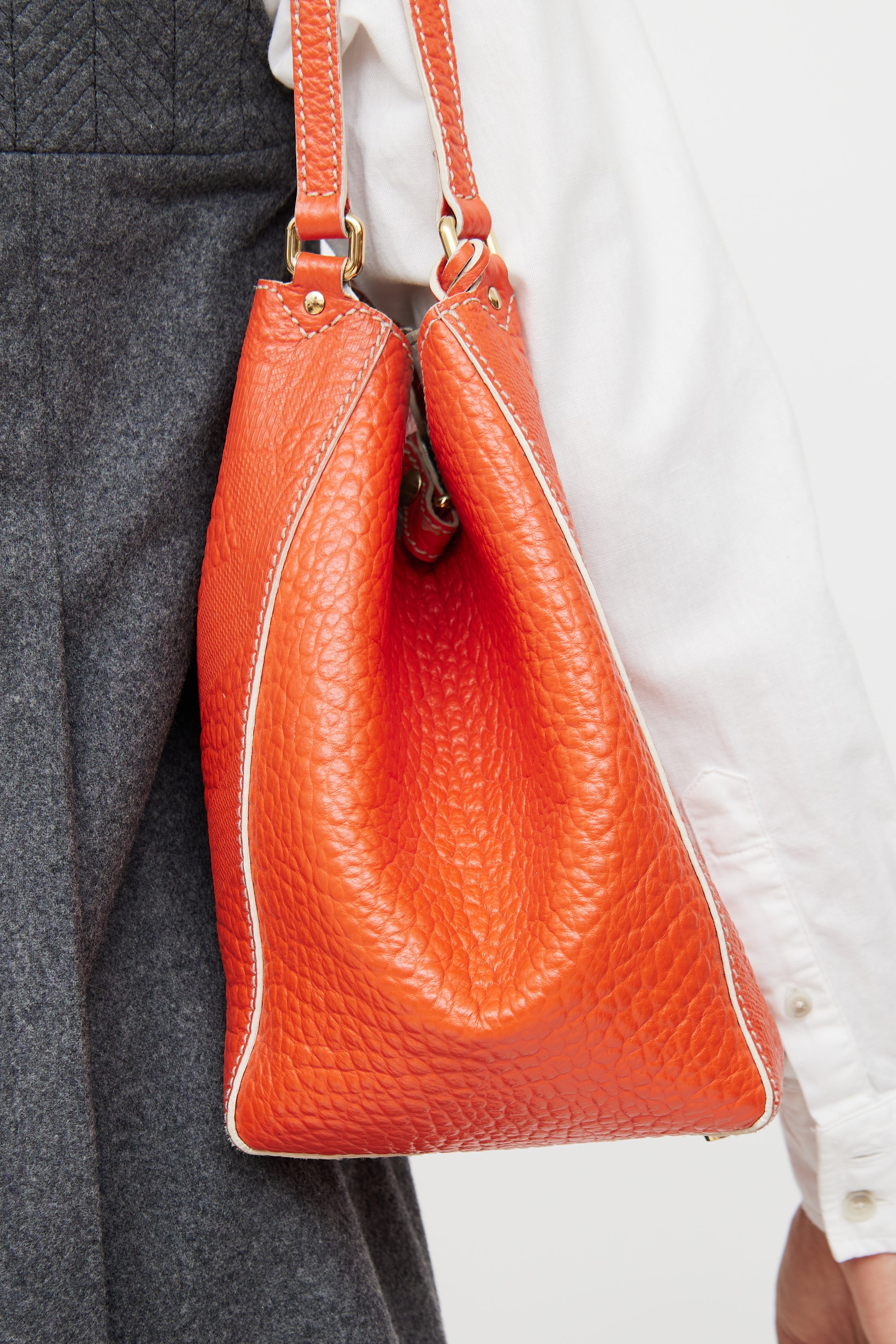 Pre-owned Burberry orange Canterbury tote bag featuring embossed leather, gold tone hardware, protective feet at base, dual handles, magnetic snap closure, one main compartment, detachable orange zipper pouch and detachable logo tag.