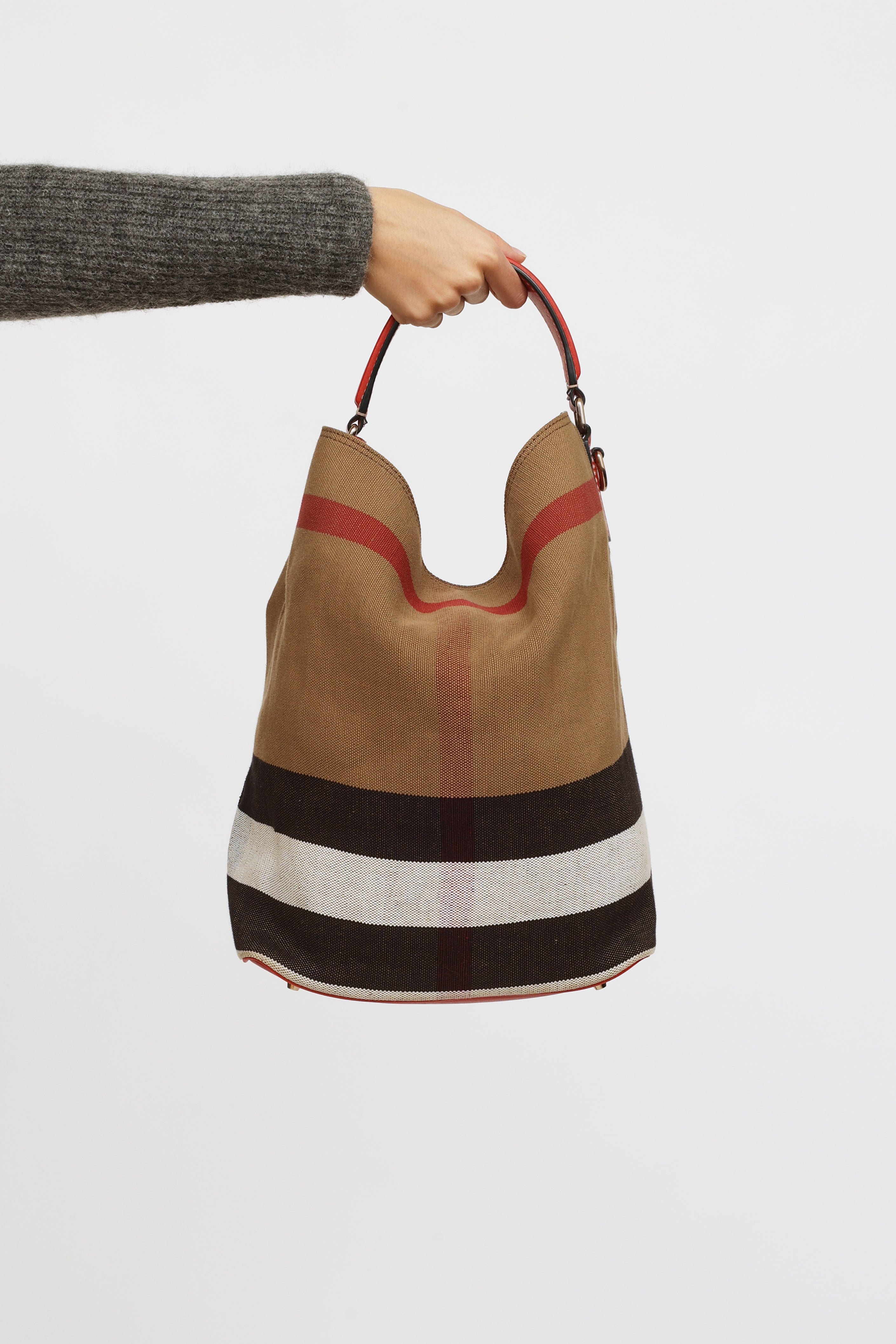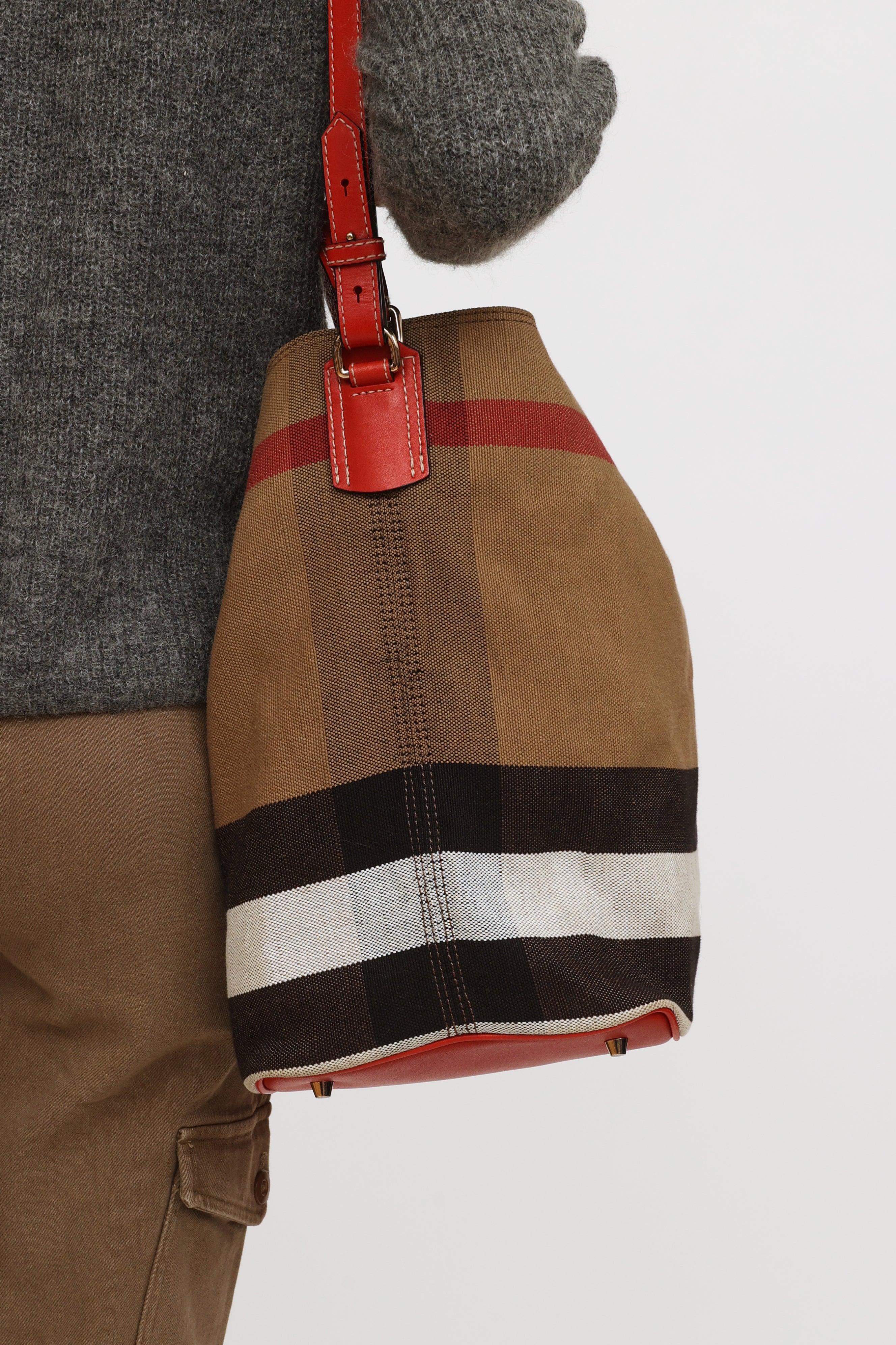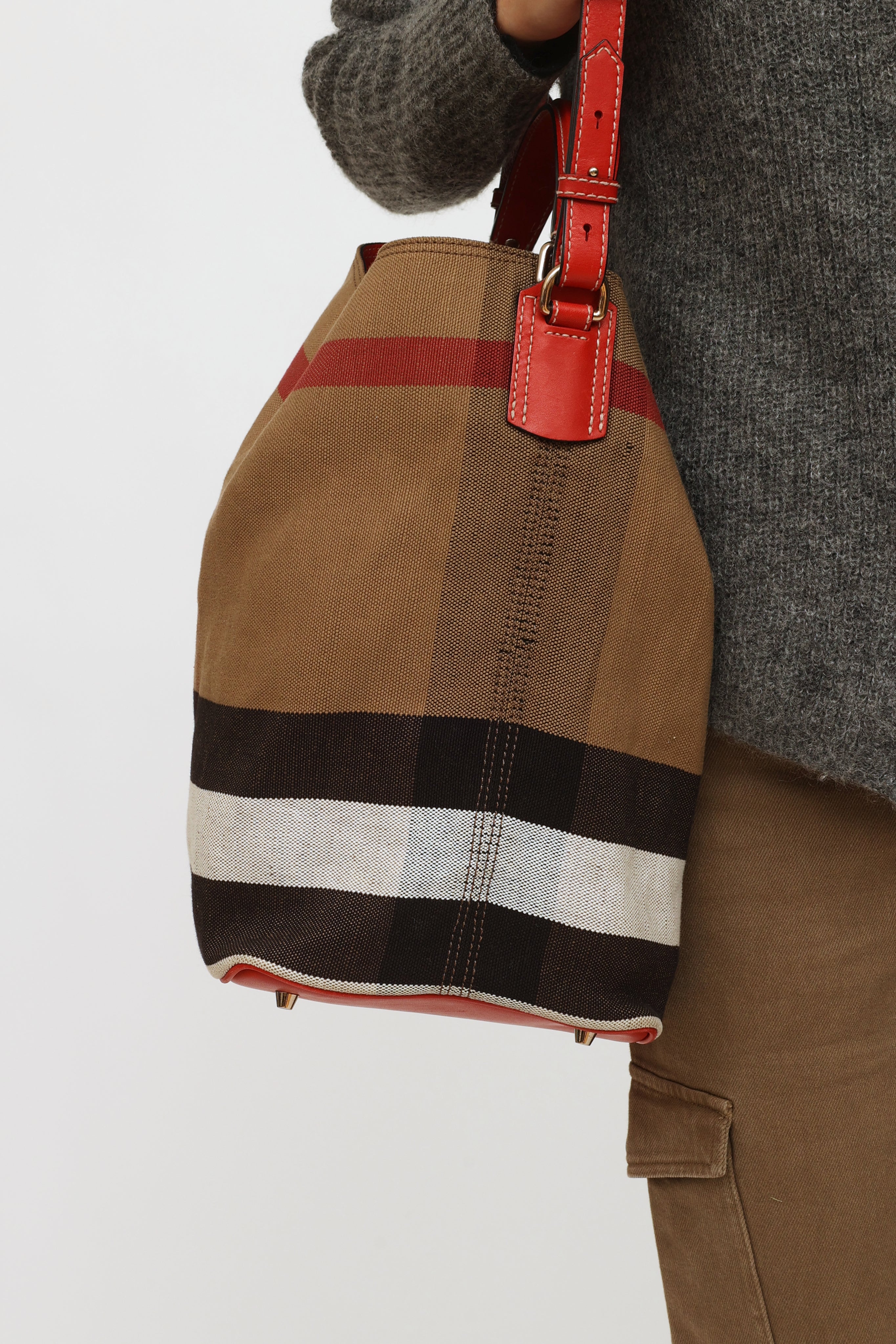 Pre-owned Burberry red & brown Ashby bucket bag featuring Mega Check print, gold tone hardware, red leather trim, protective feet along base, single flat top handle and removable flat shoulder strap. Interior includes removable pouch and lobster clasp top closure.