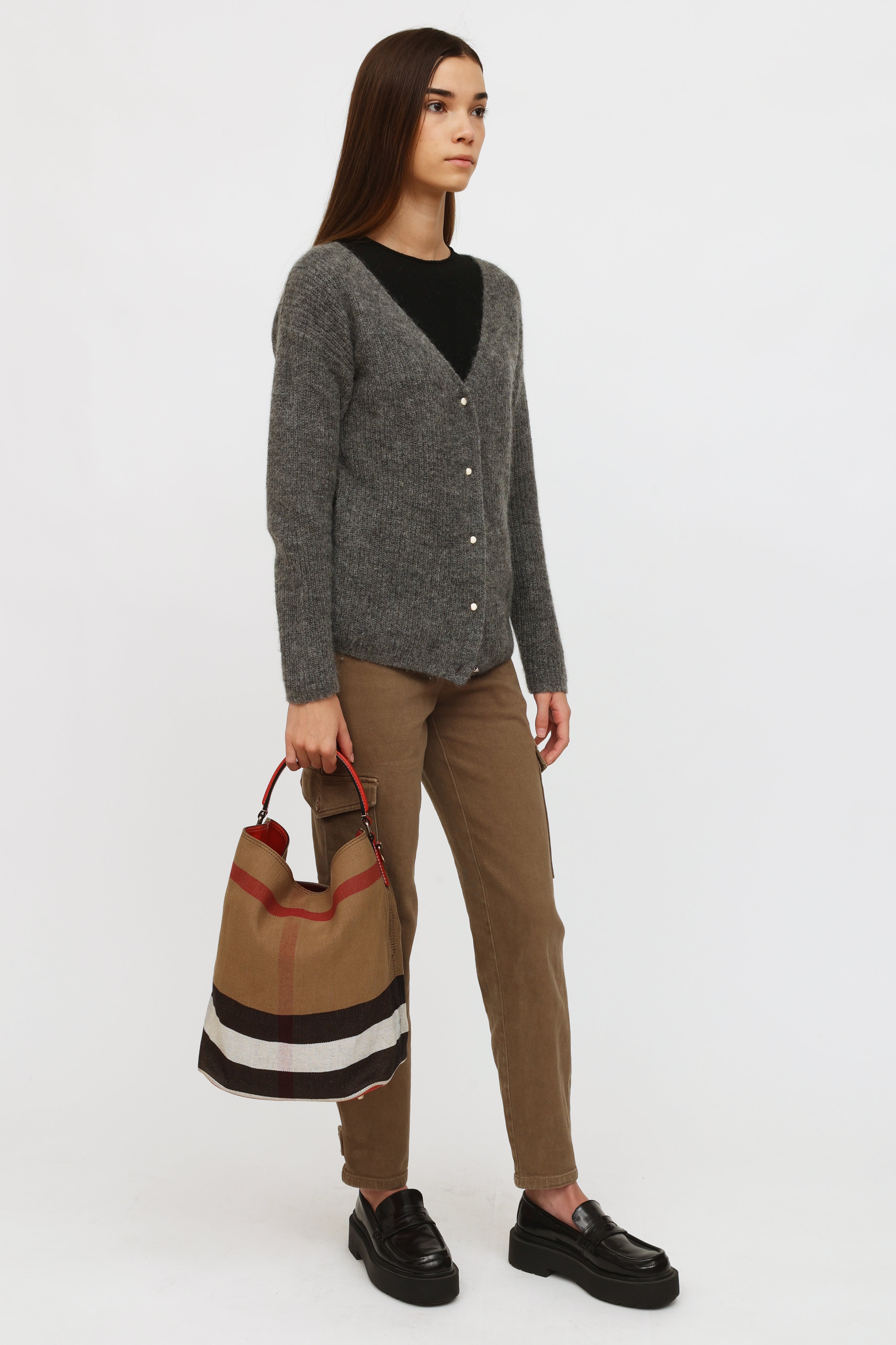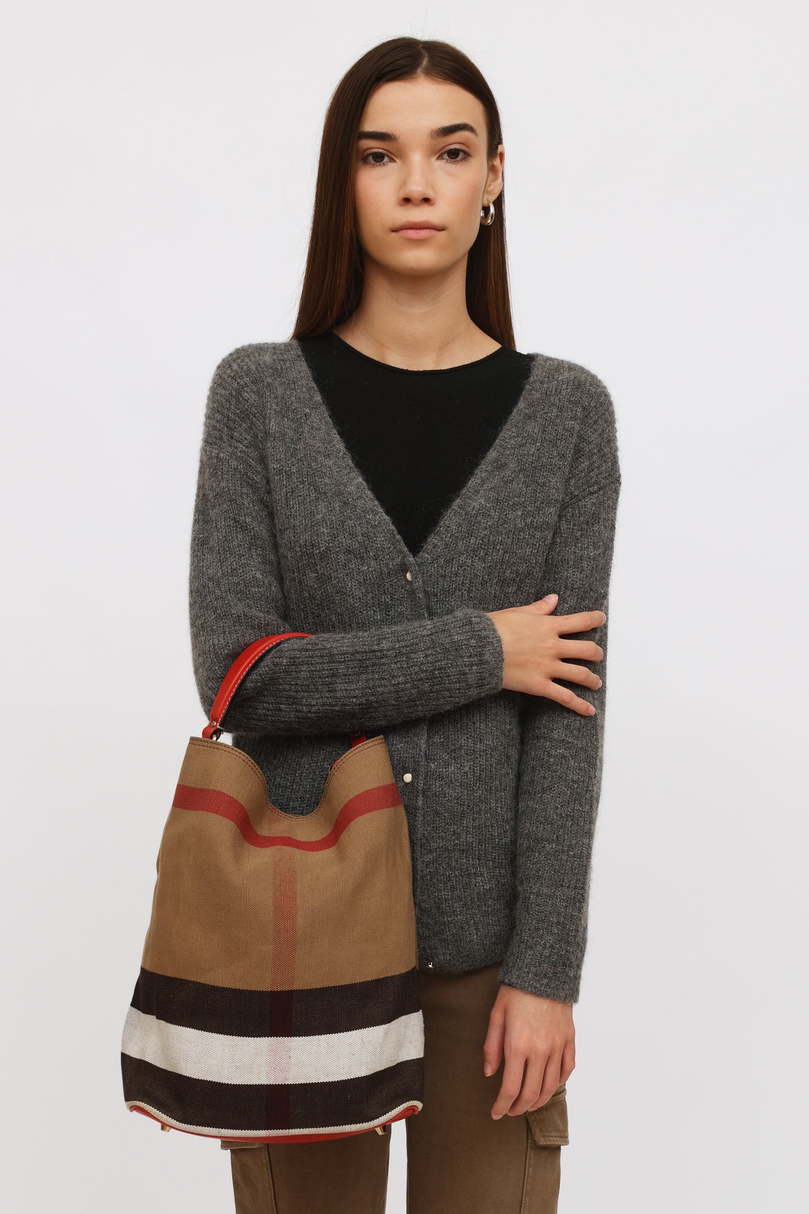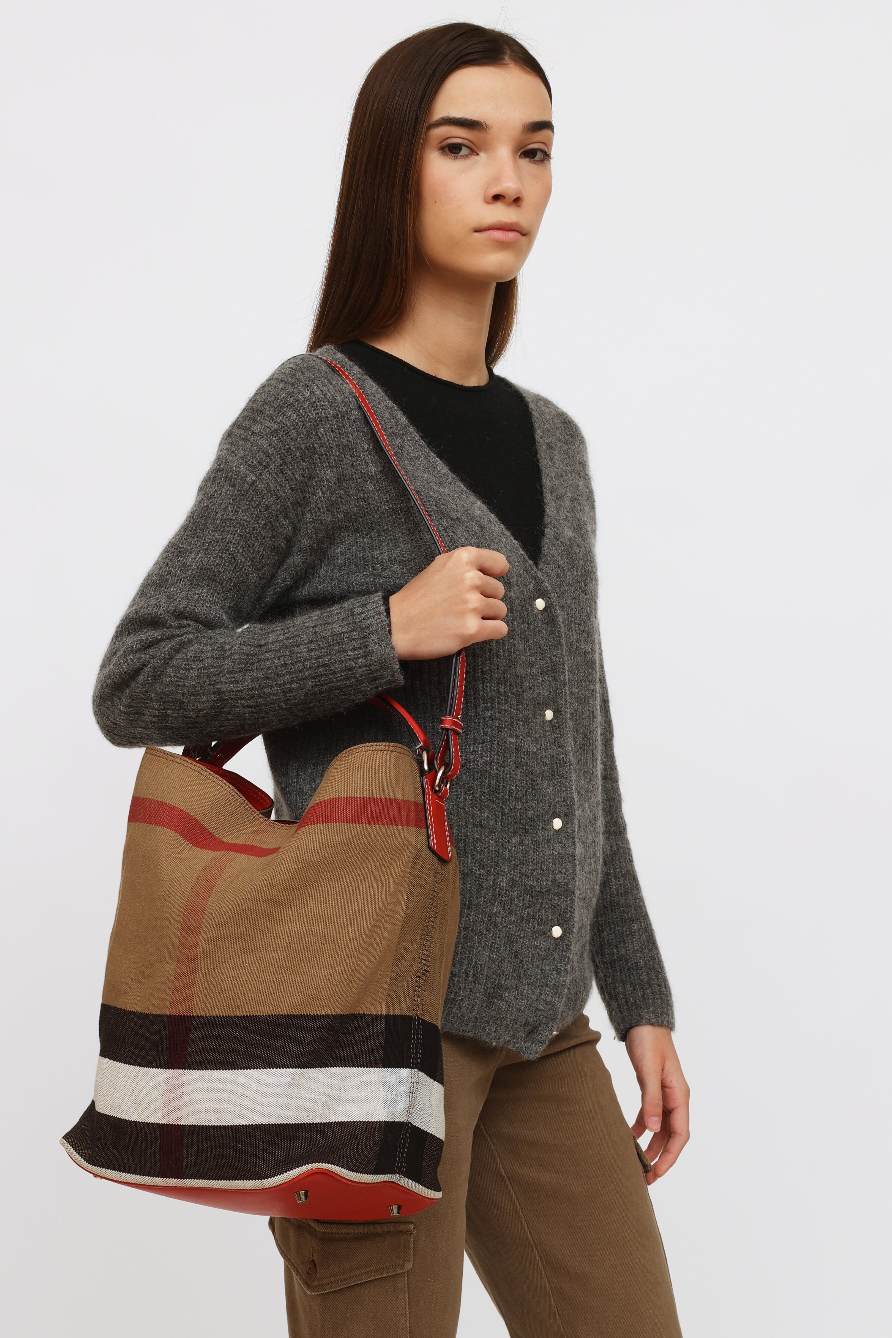 Pre-owned Burberry red & brown Ashby bucket bag featuring Mega Check print, gold tone hardware, red leather trim, protective feet along base, single flat top handle and removable flat shoulder strap. Interior includes removable pouch and lobster clasp top closure.