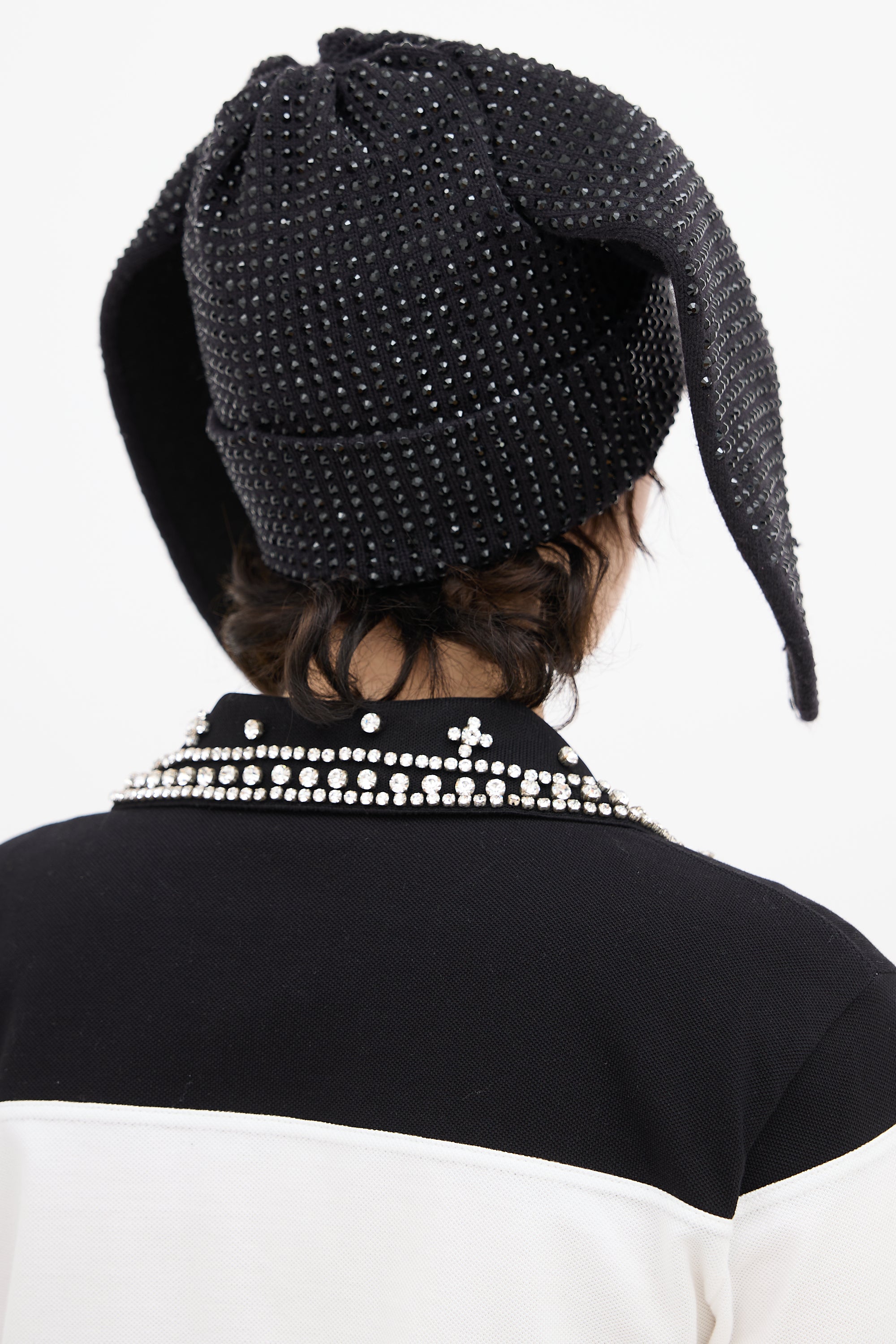 Burberry black wool Year of the Rabbit beanie featuring tonal crystal embellishments throughout, a rolled cuff, and rabbit ear attachments.