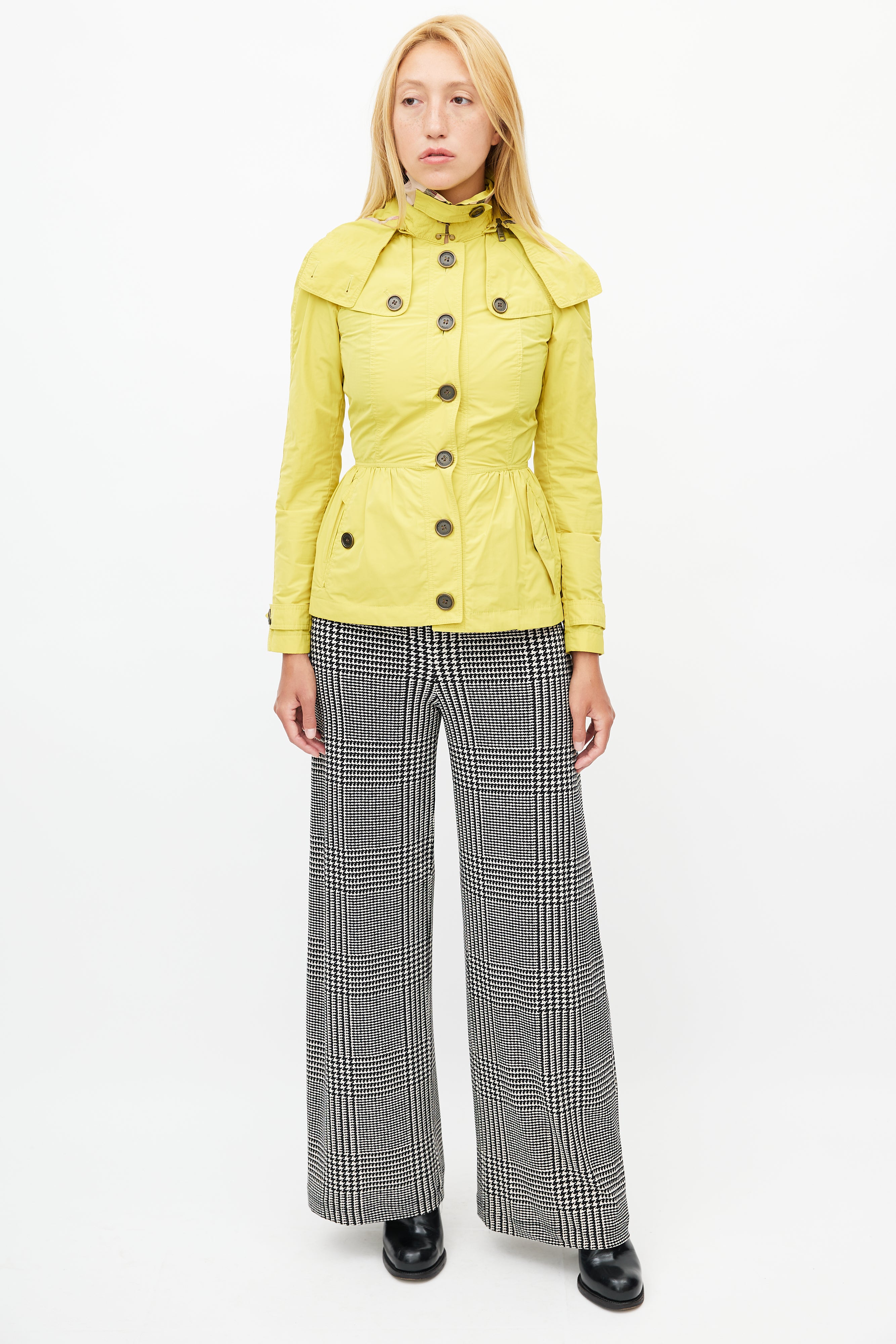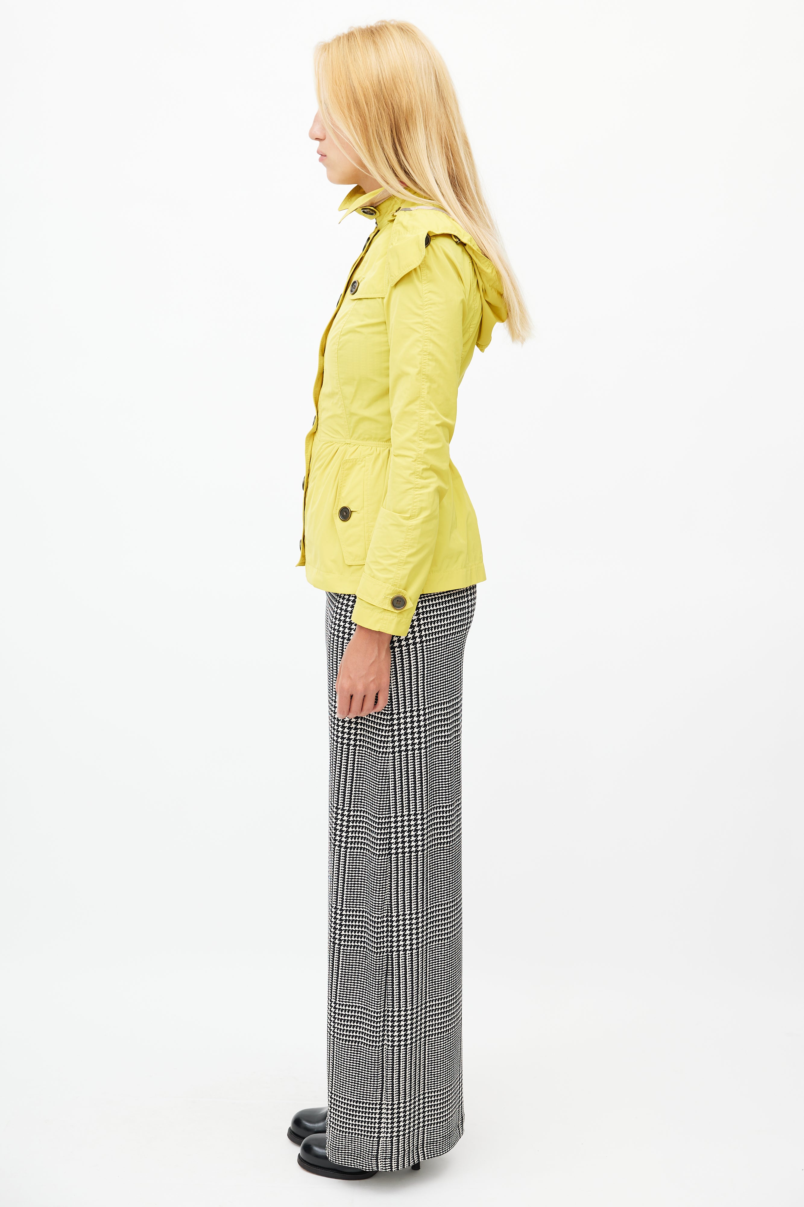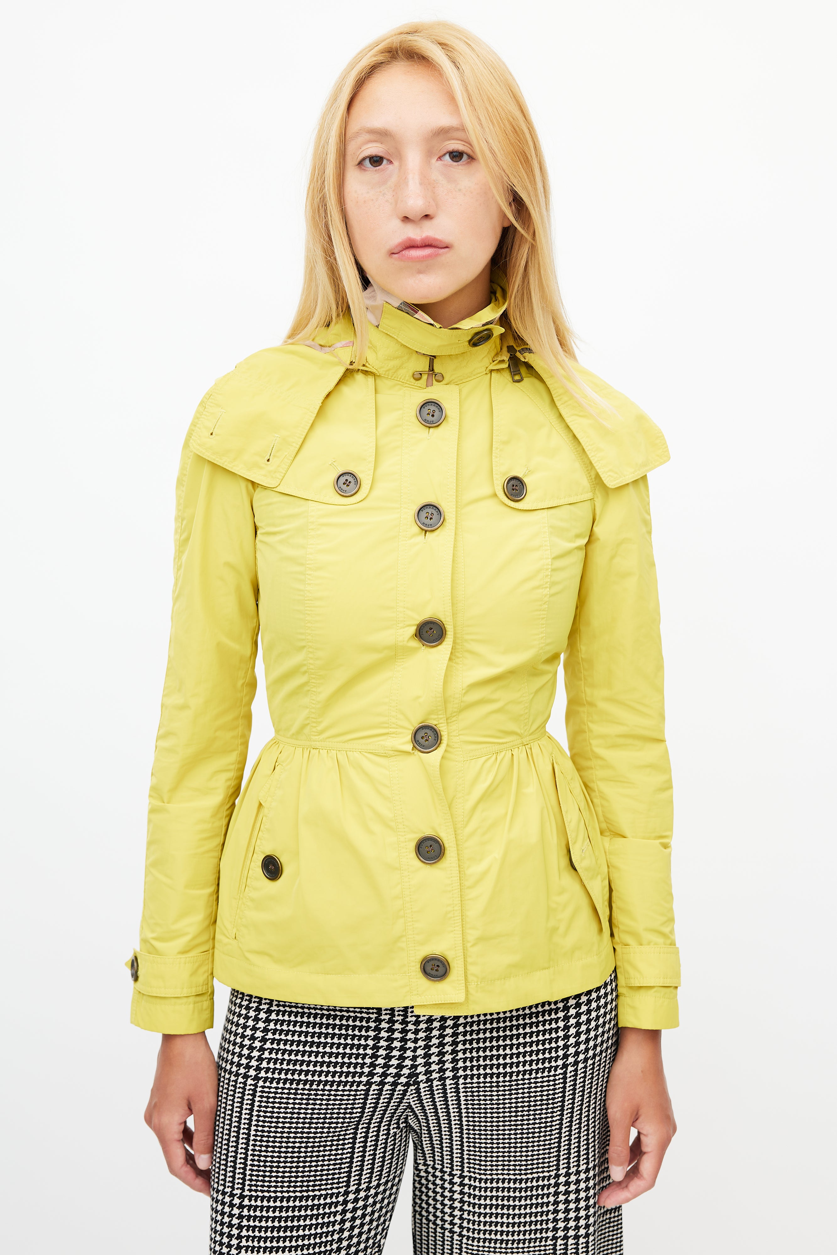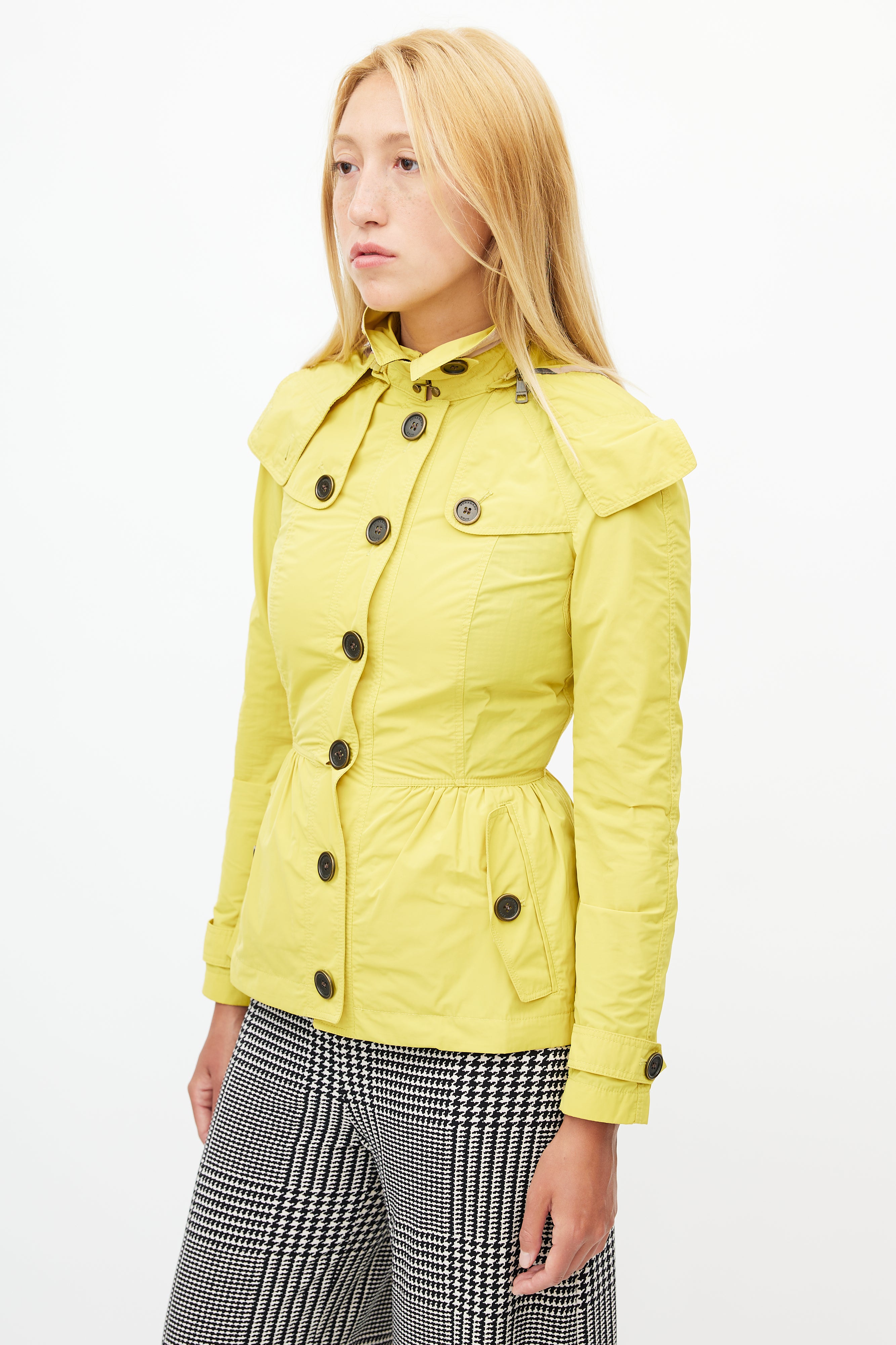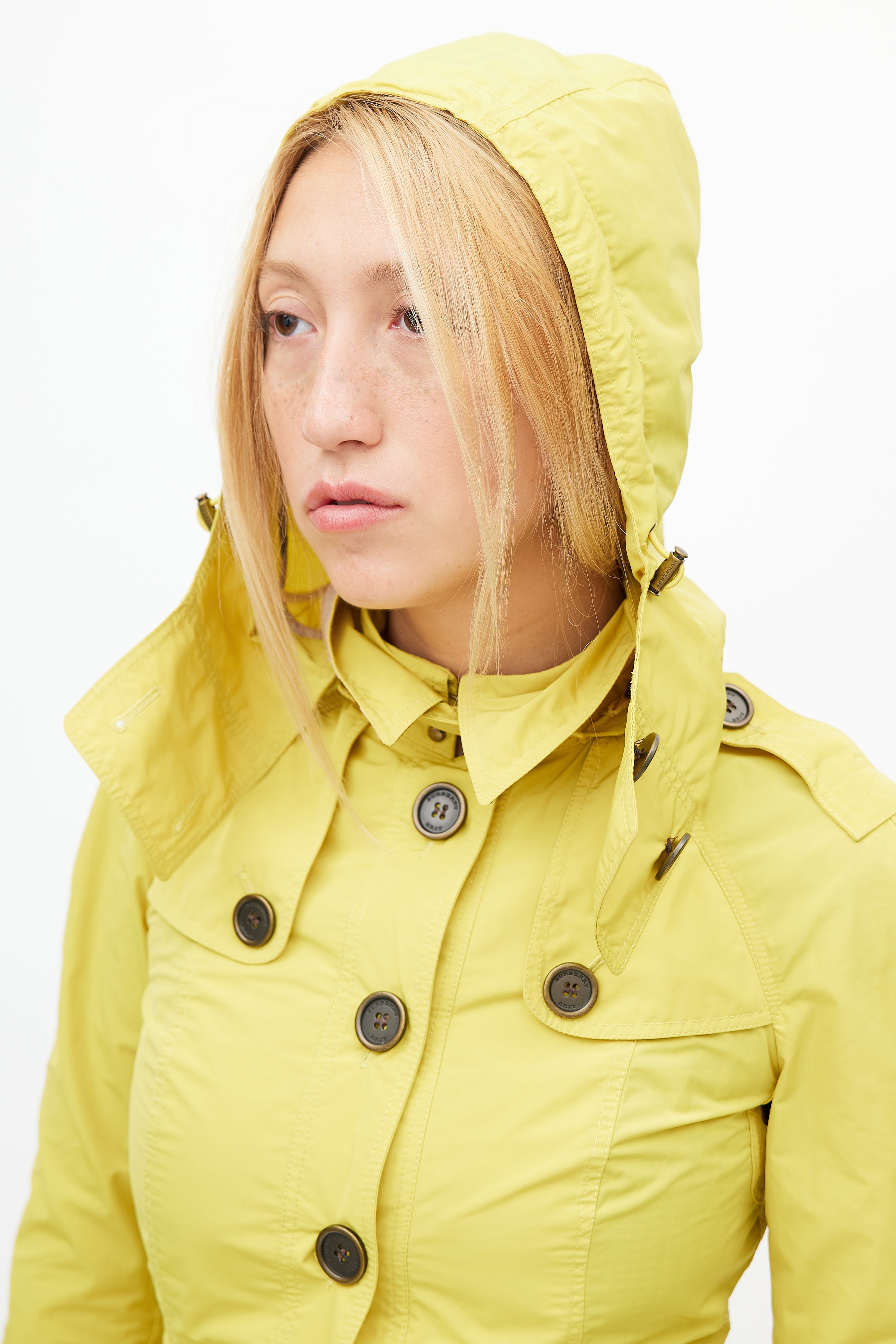 Pre-owned Burberry Brit yellow nylon short trench coat featuring a removable hood, pointed collar, two buttoned pockets at hip, long sleeves with buttoned cuffs, epaulets at shoulder, and button up front.