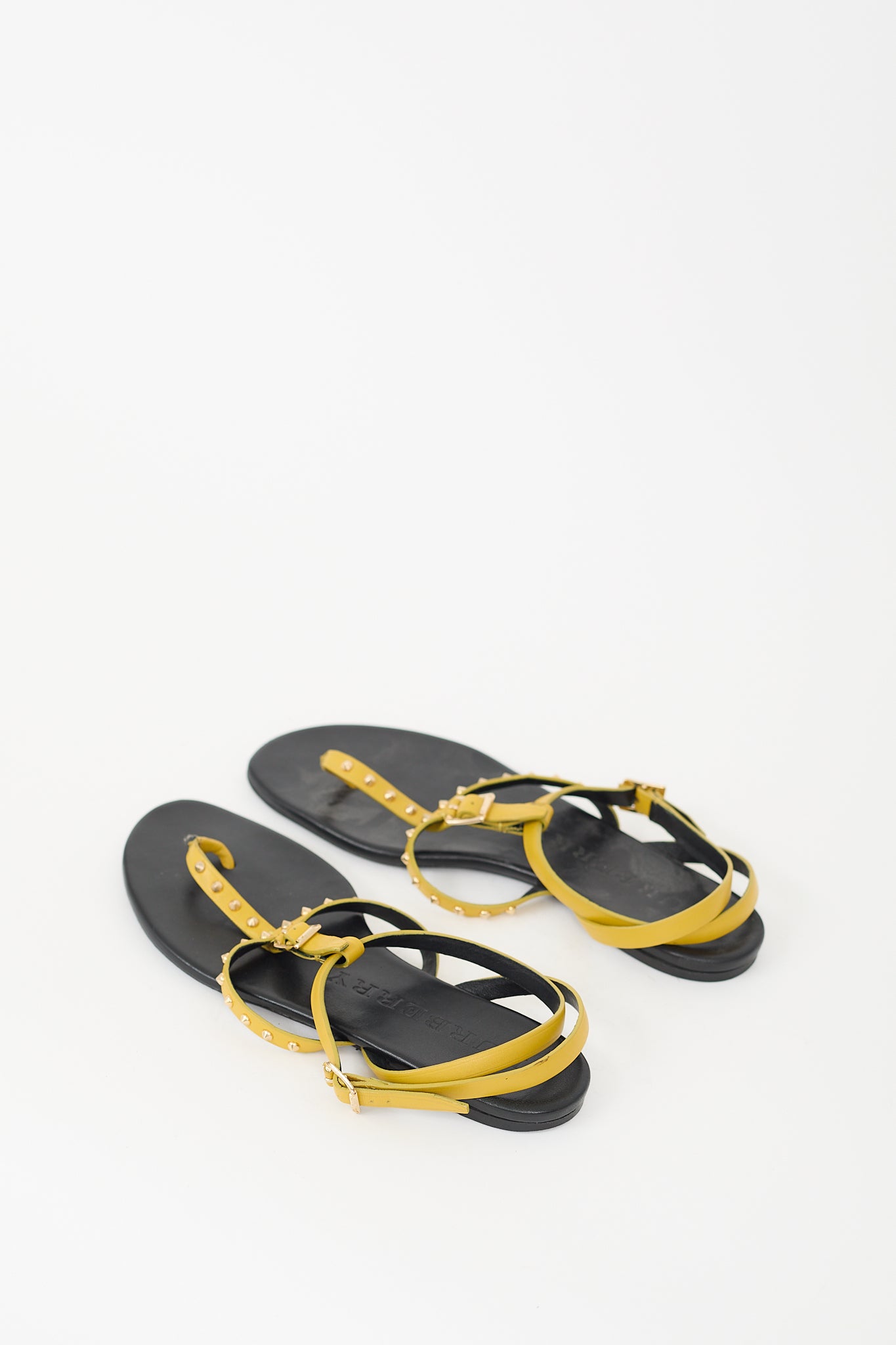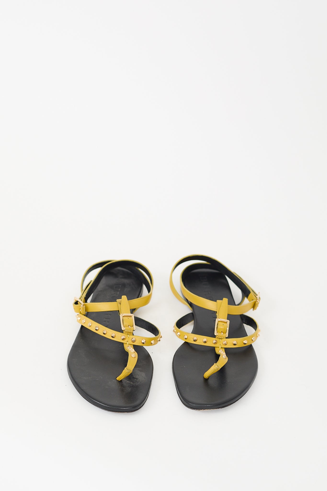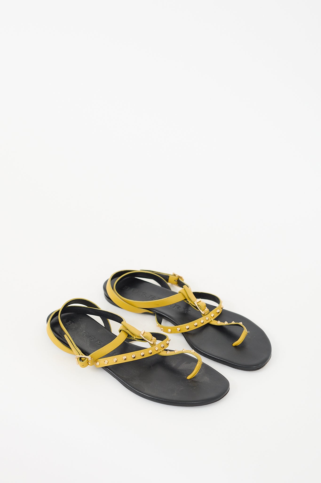Pre-owned Burberry yellow and black leather sandals featuring rounded toe, T-strap with gold tone spike studs, adjustable wrap around ankle strap with buckle closure, and leather insole with debossed logo. Comes with original box and dust bag.