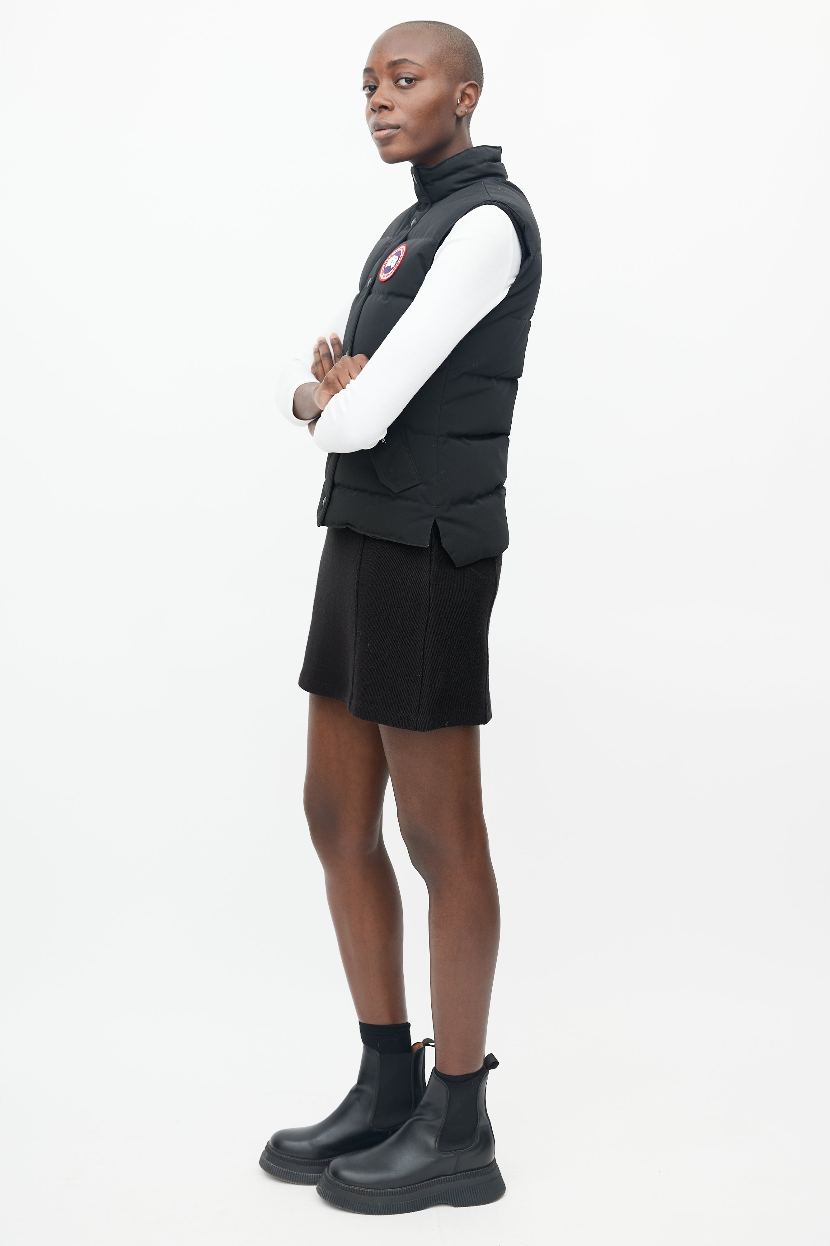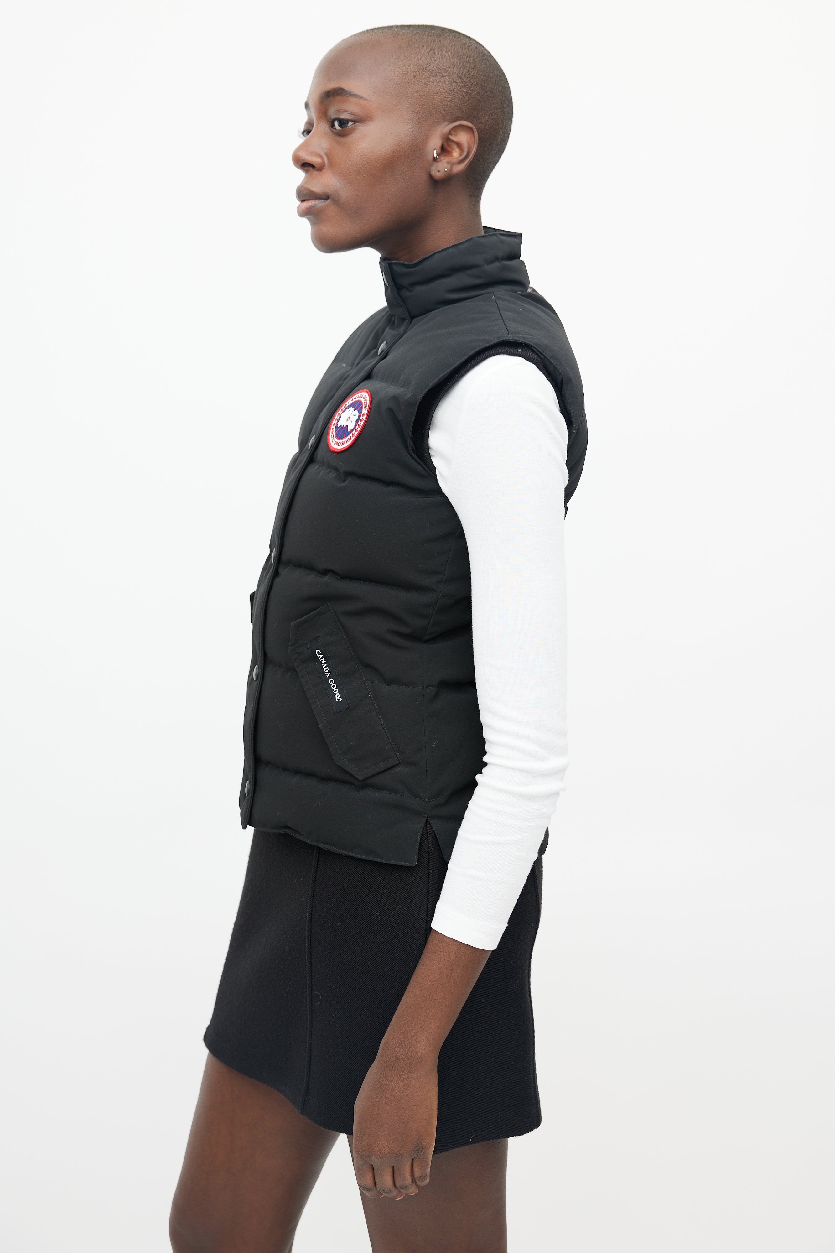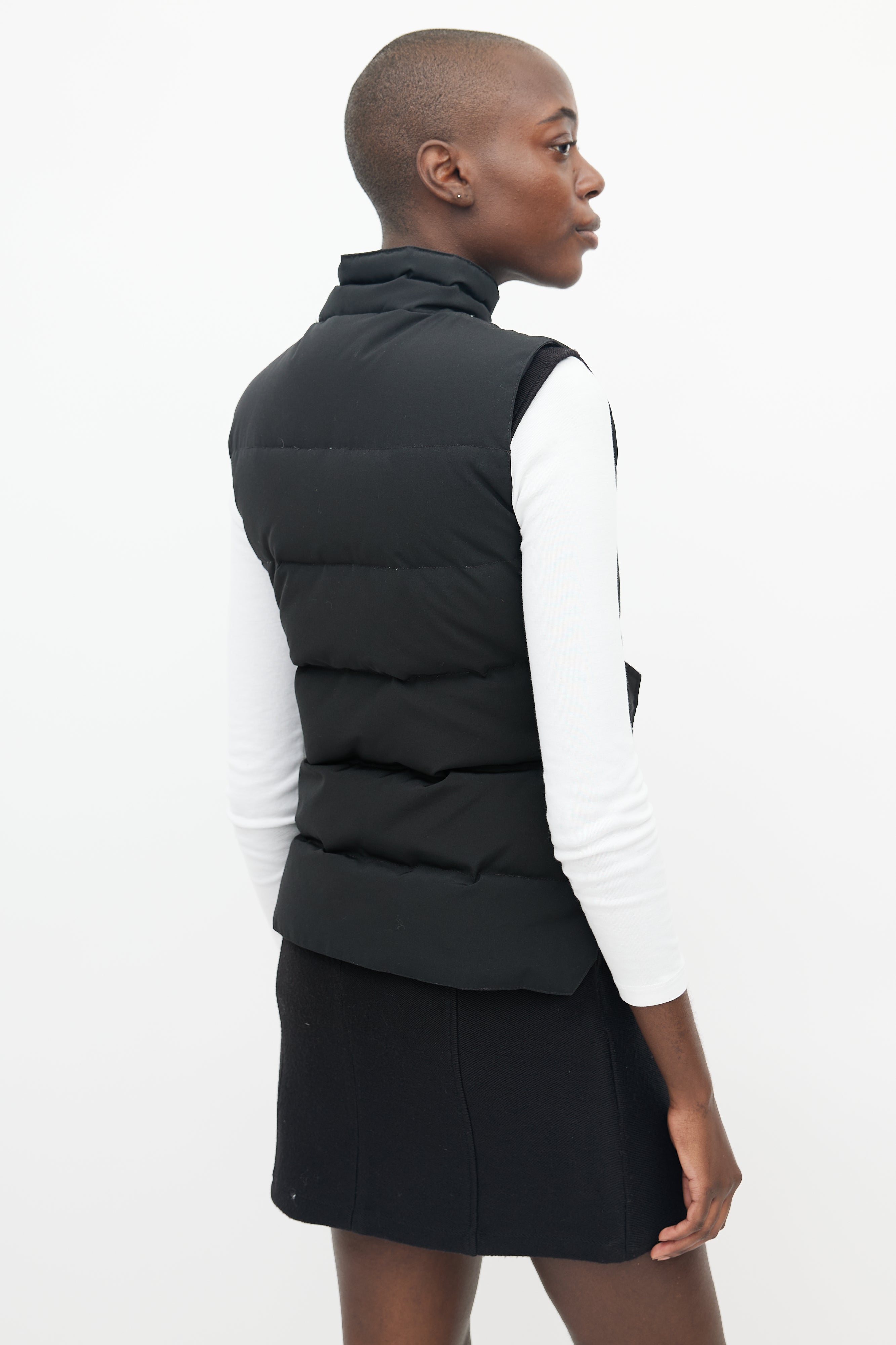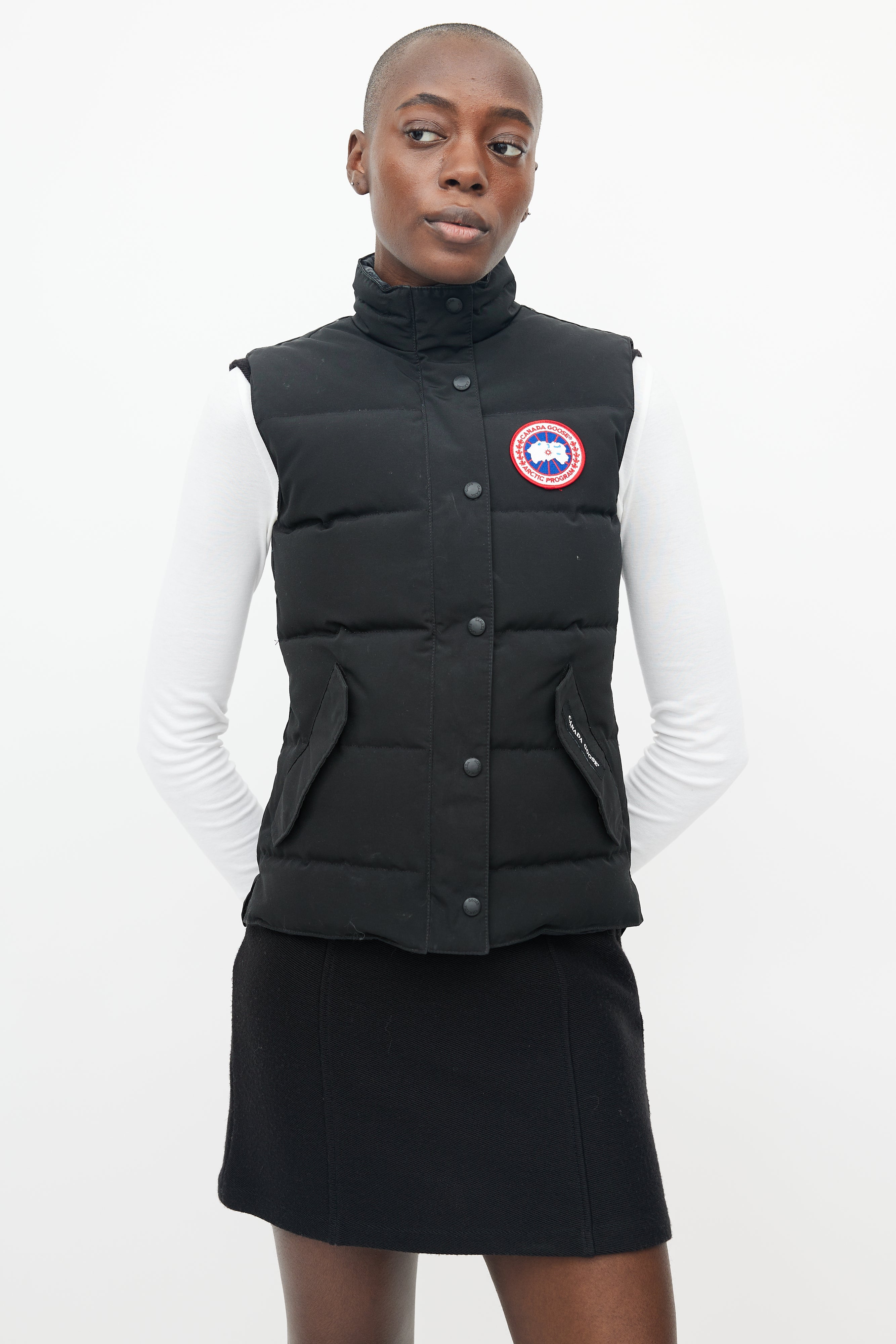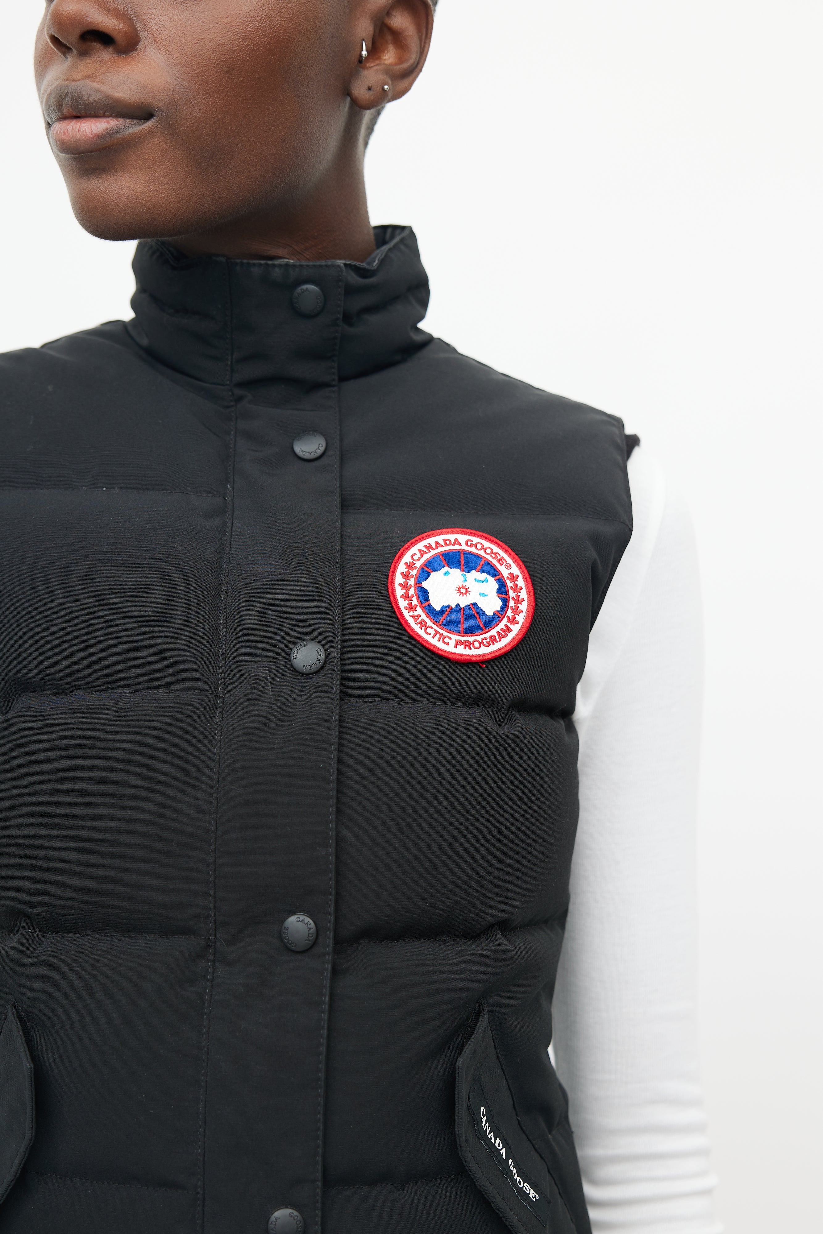 Pre-owned Canada Goose Freestyle Vest Heritage featuring down fill, two diagonal front pockets with Canada Goose label on left, front zip with high neck and snap button lapel and Canada Goose emblem at left chest exterior.