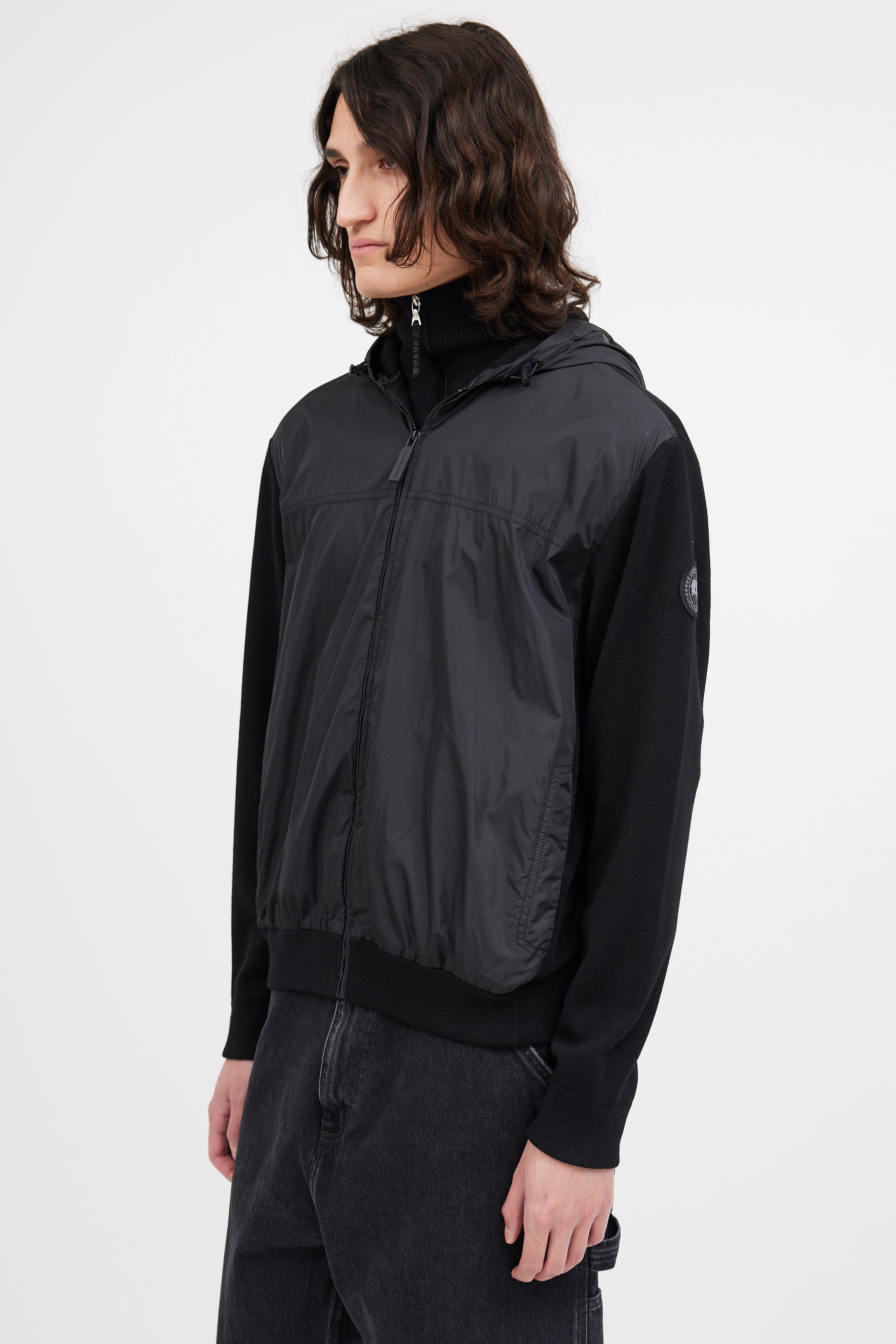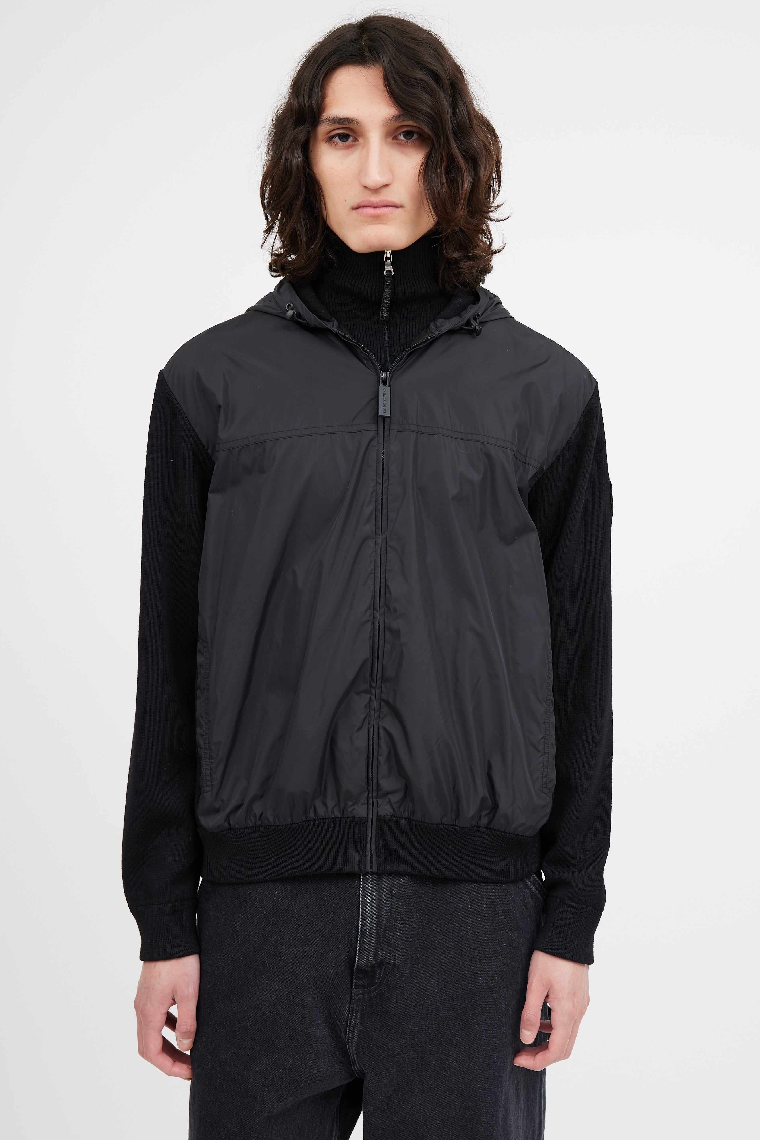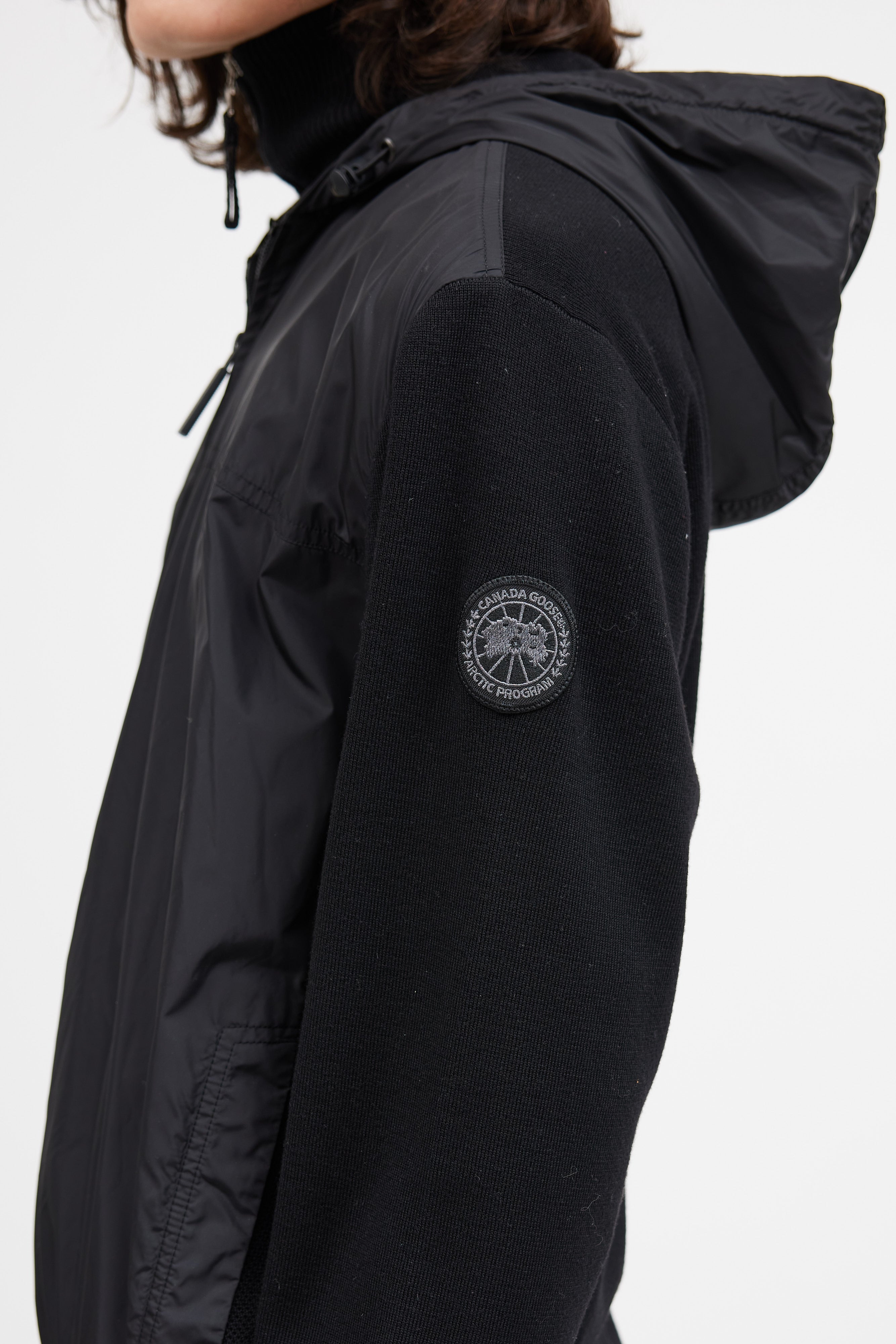 Pre-owned Canada Goose black nylon knit hybridge jacket featuring nylon front and hood, knit sleeves and back, zip front closure, cinched ribbed cuffs and hem, two button pockets at hip, and tonal logo patch at sleeve.