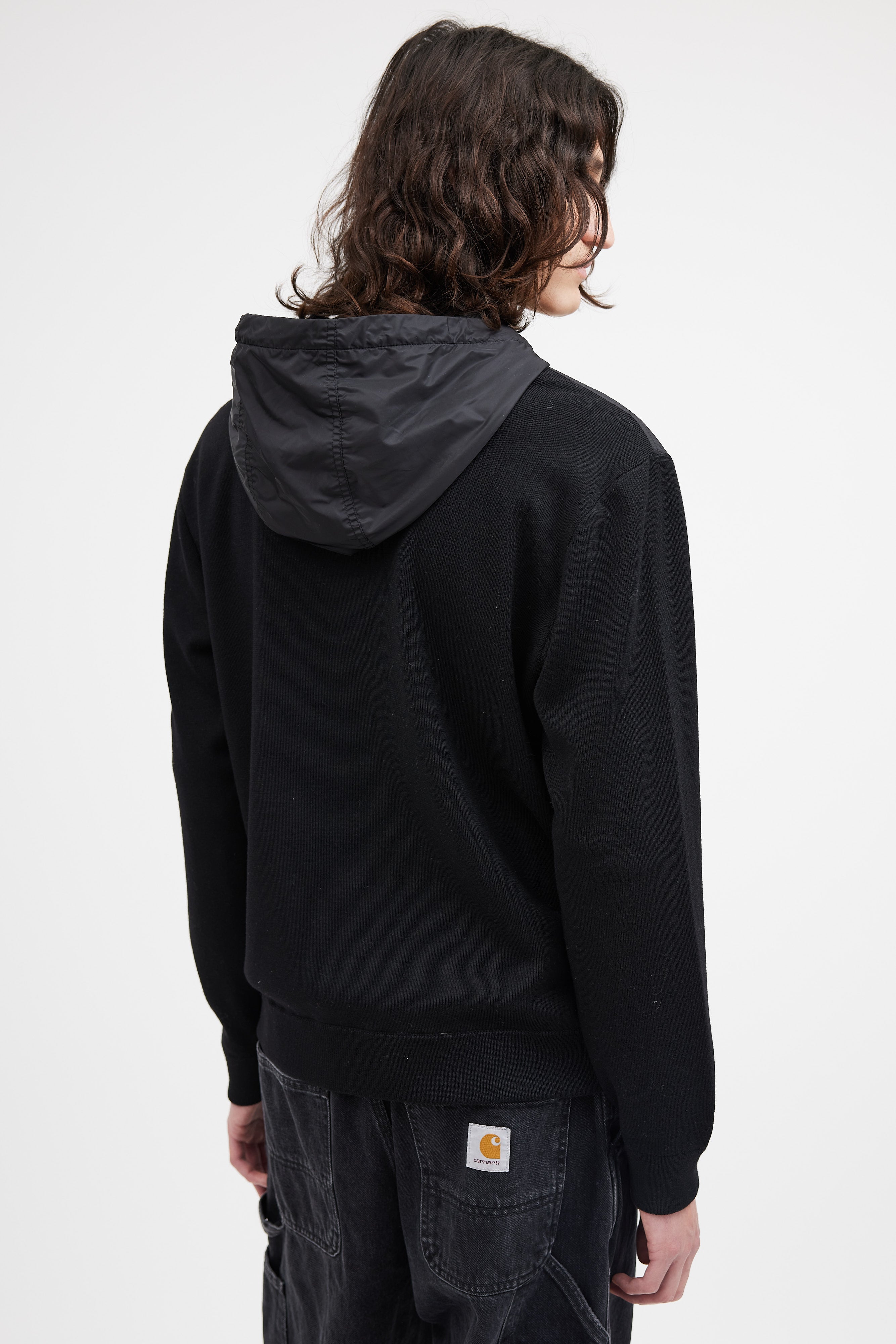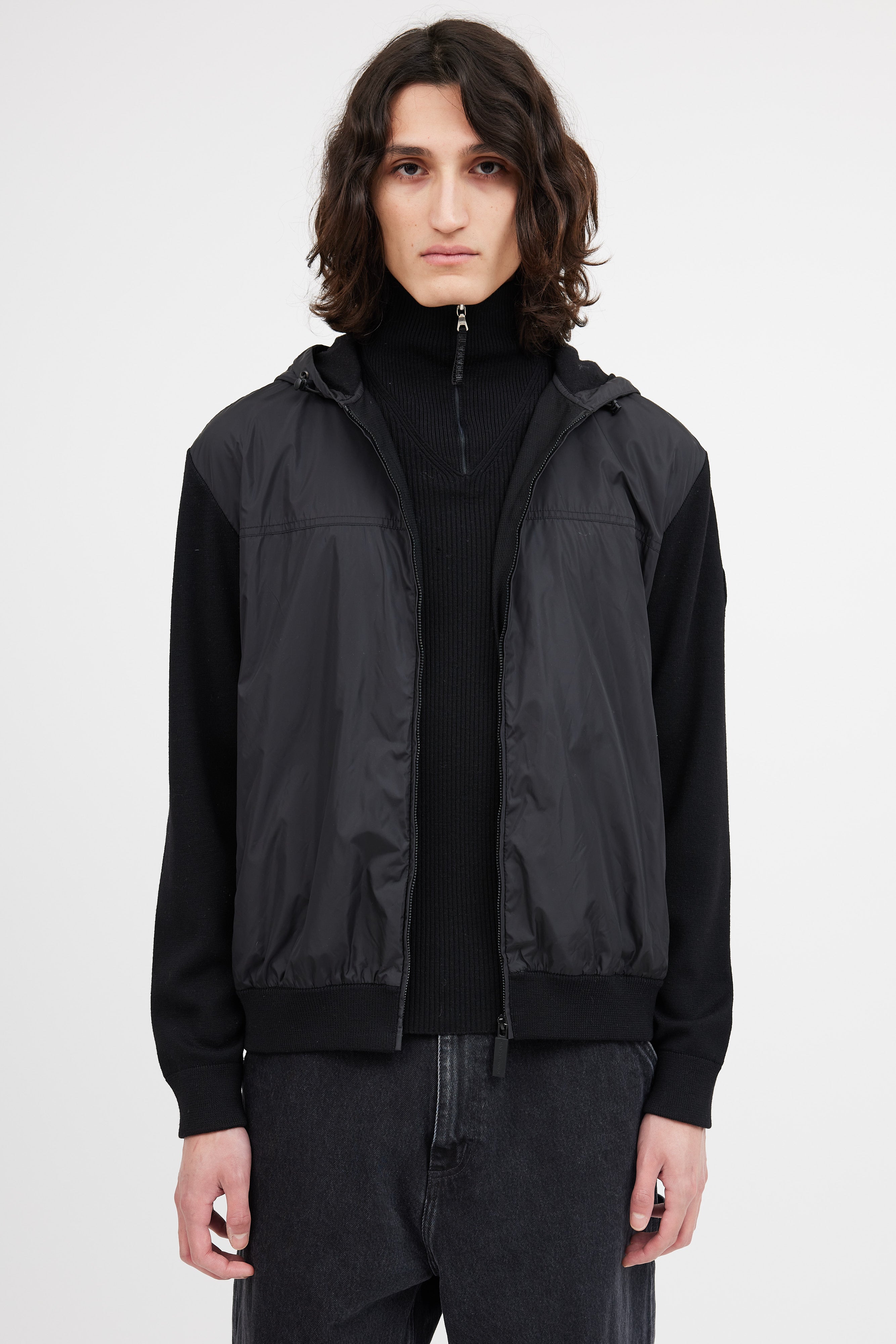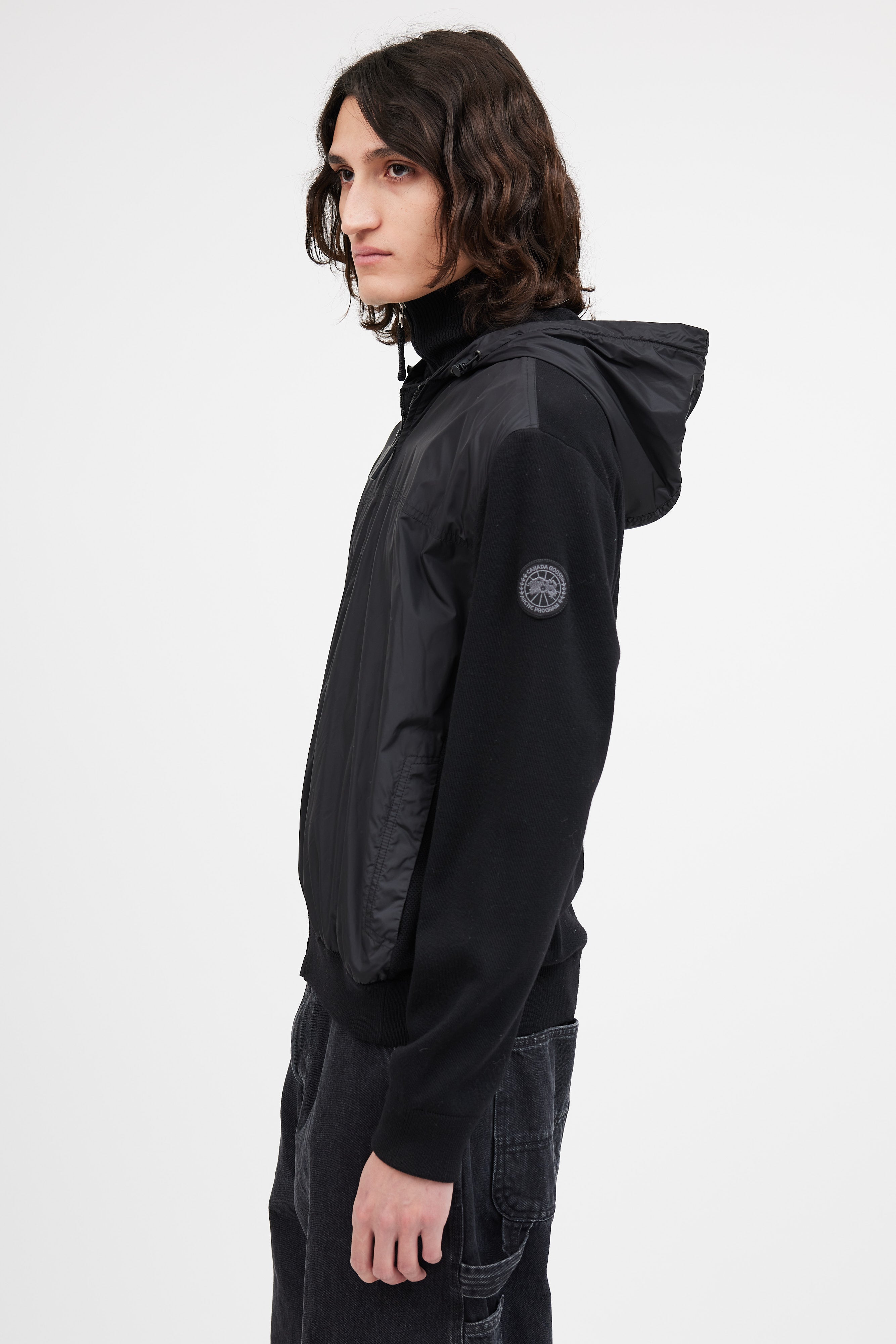 Pre-owned Canada Goose black nylon knit hybridge jacket featuring nylon front and hood, knit sleeves and back, zip front closure, cinched ribbed cuffs and hem, two button pockets at hip, and tonal logo patch at sleeve.