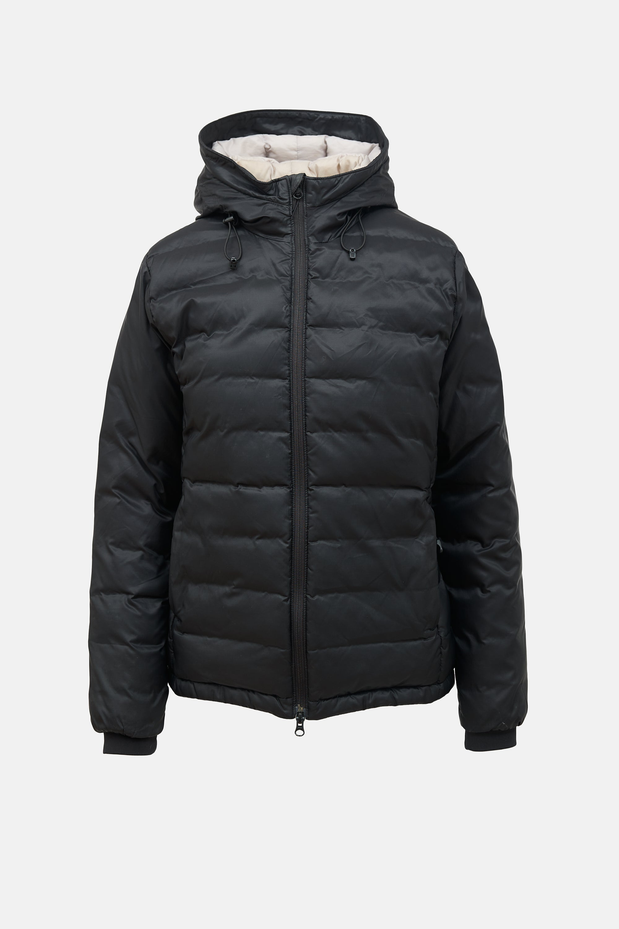 Pre-owned Canada Goose black down-filled Camp hoodie featuring a funnel neck, two way zip closure, drawcord hood, two zip pockets at front, signature red logo patch at left sleeve, and elasticized cuffs. Lined.