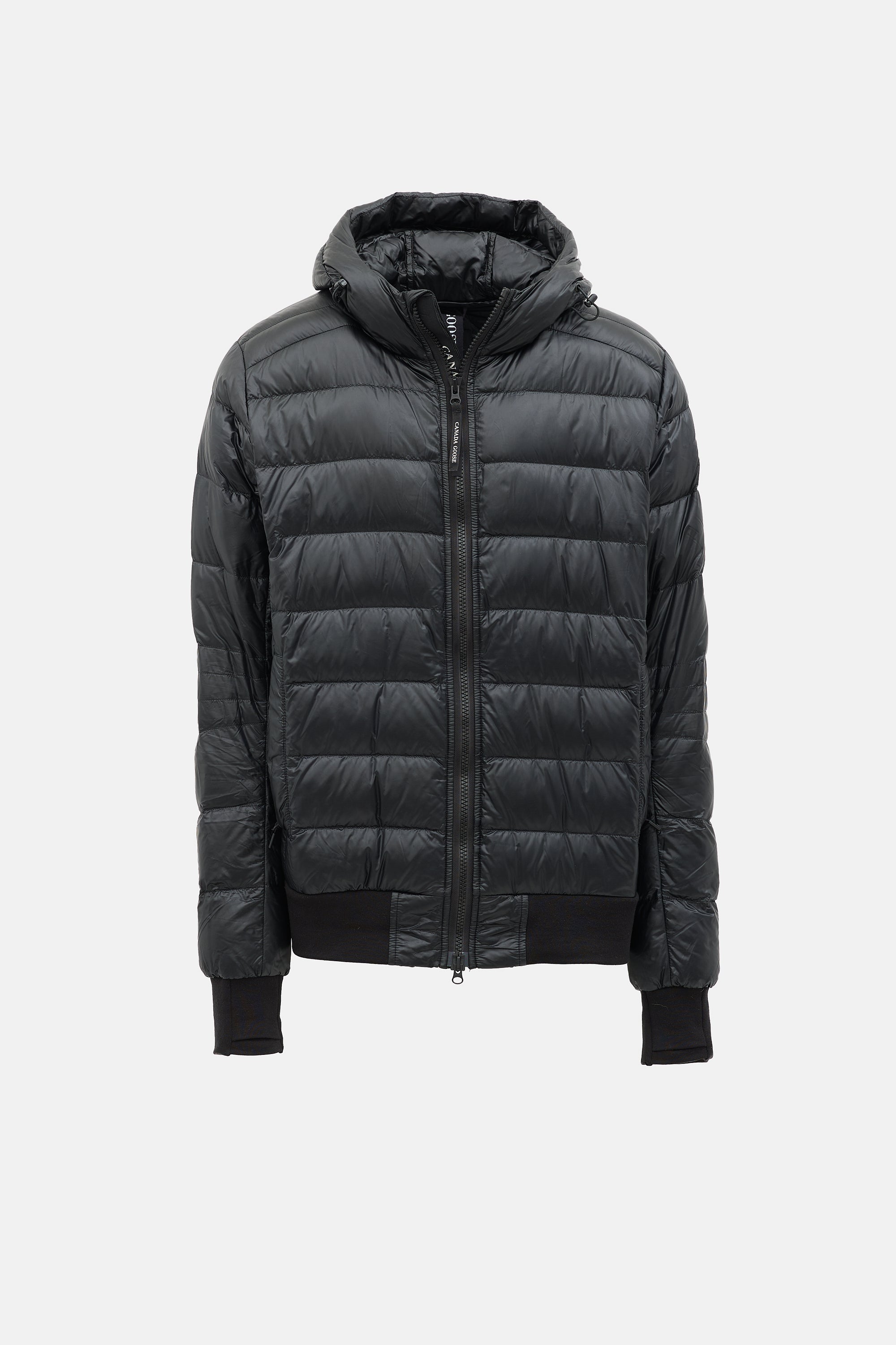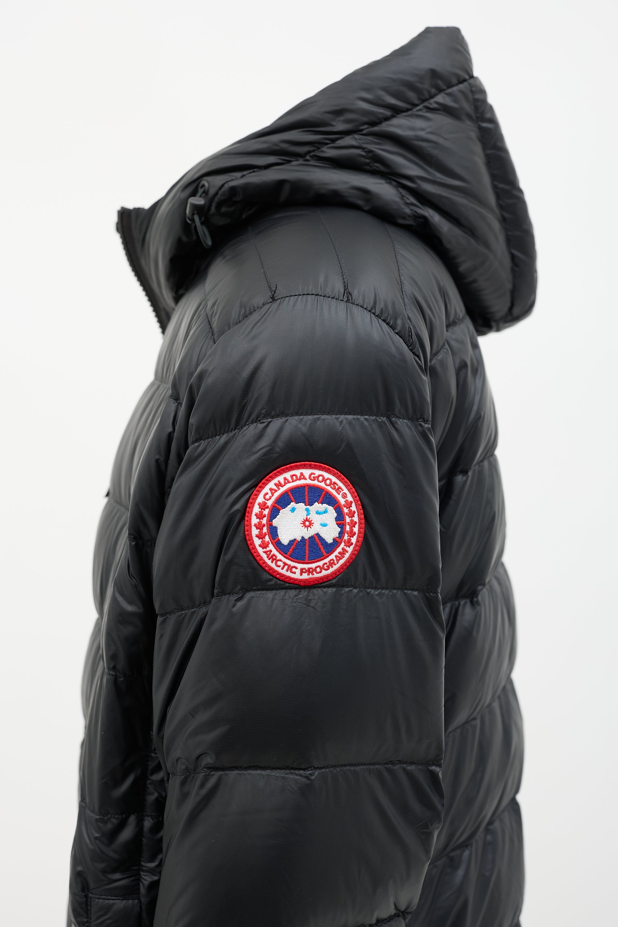 Pre-owned Canada Goose black down Crofton packable puffer jacket featuring drawcord hood, two way zip up front, two front zip pockets, two interior patch pockets, interior shoulder straps, logo patch at left arm, and ribbed hem and cuffs. Padded and lined.