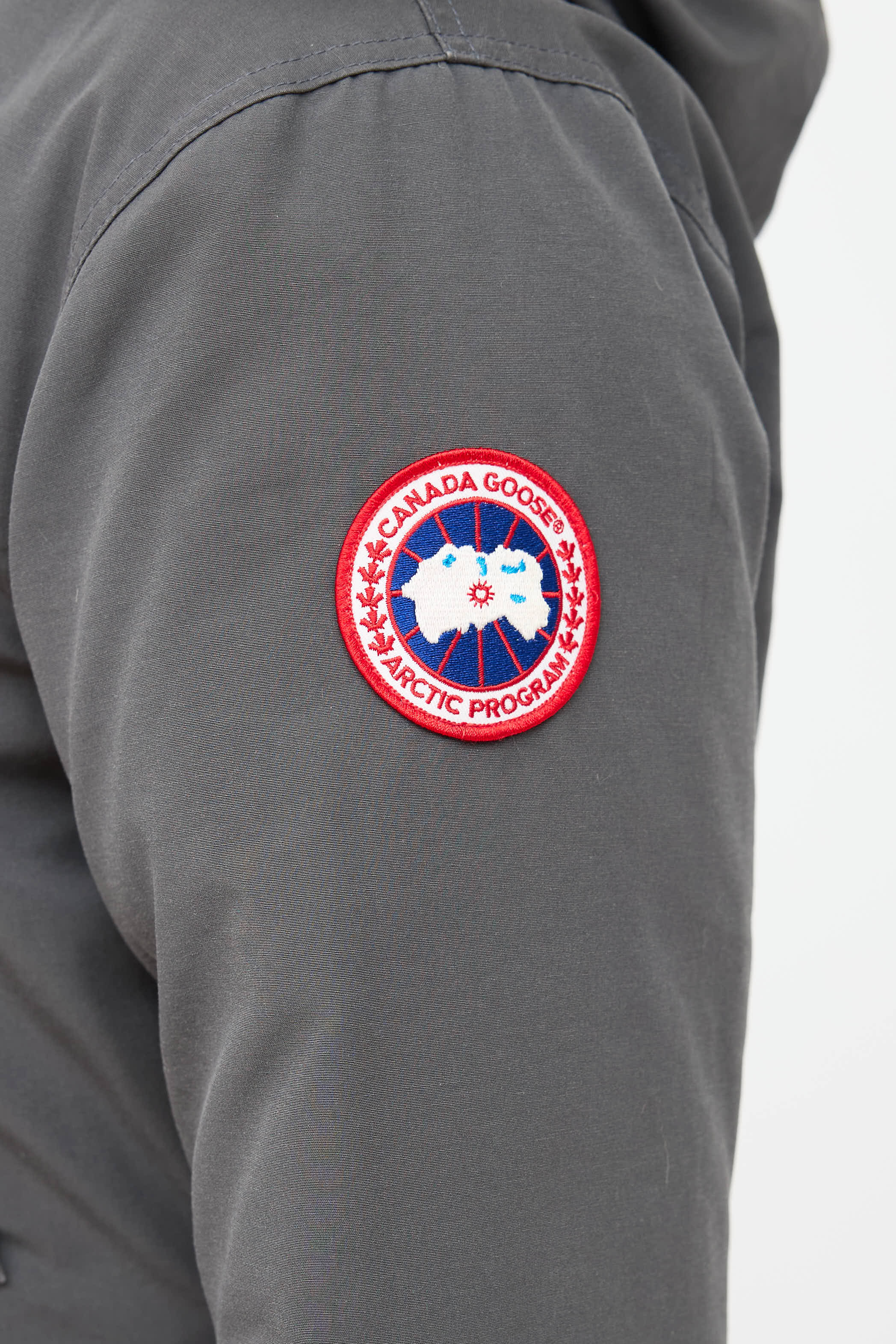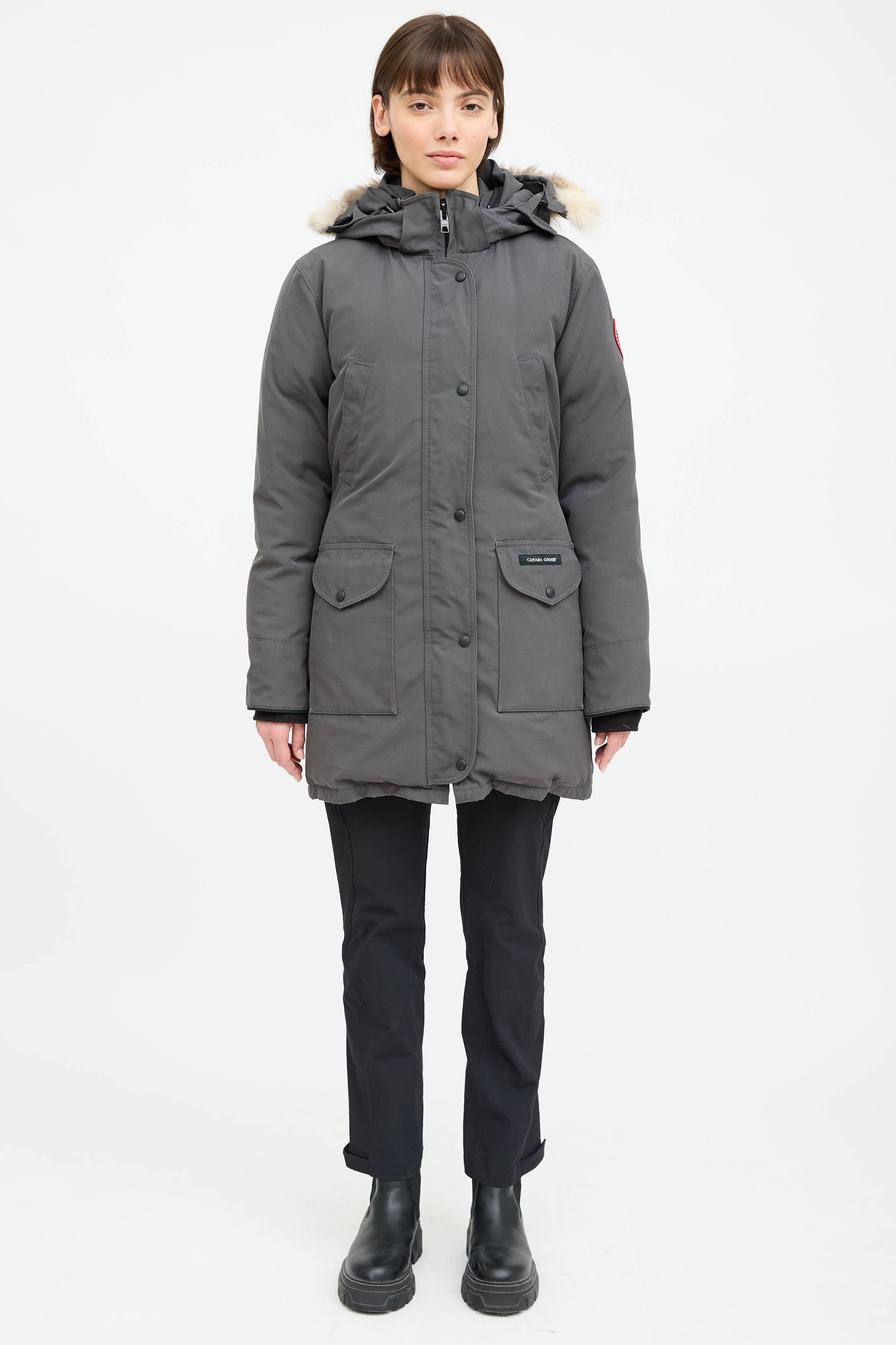 Pre-owned Canada Goose grey Trillium down parka featuring removeable hood with fur trim, drawstring on hood, webbed strap on back of hood, knit cuffs, zip closure with snap buttons, dual slip pockets on chest, dual flap pockets on waist with snap button closure, logo patch on left sleeve, and cinched back of waist with interior drawstring.