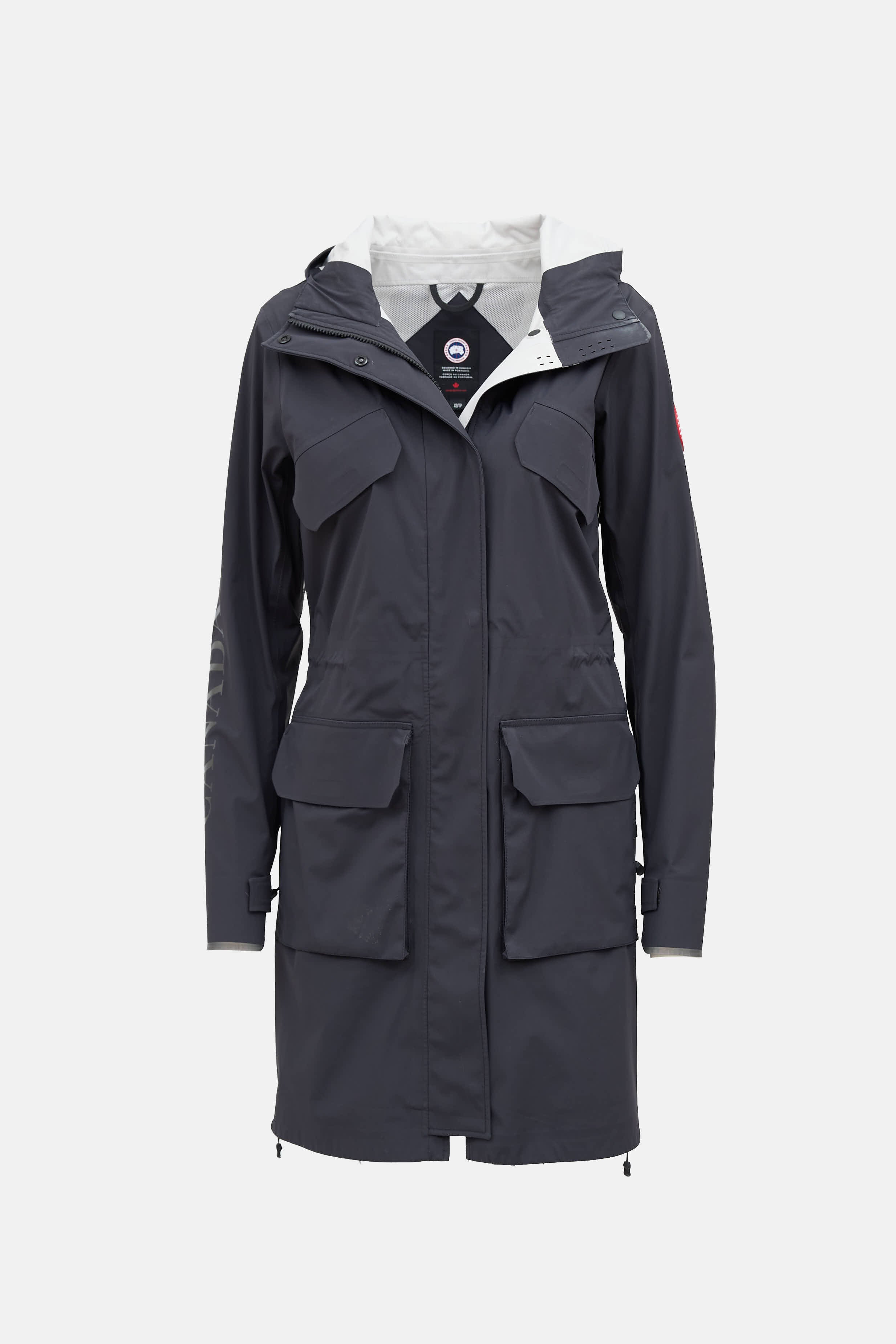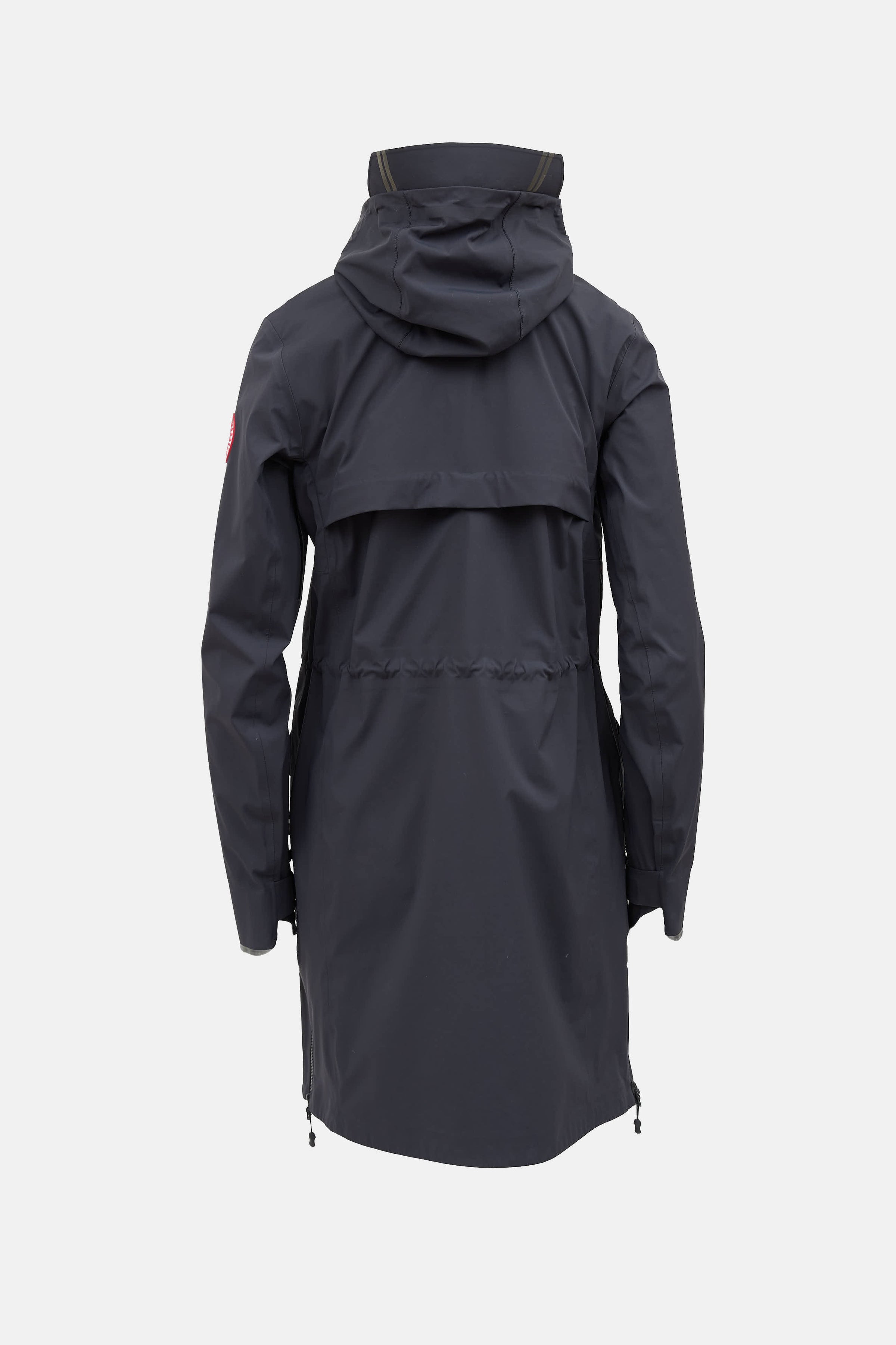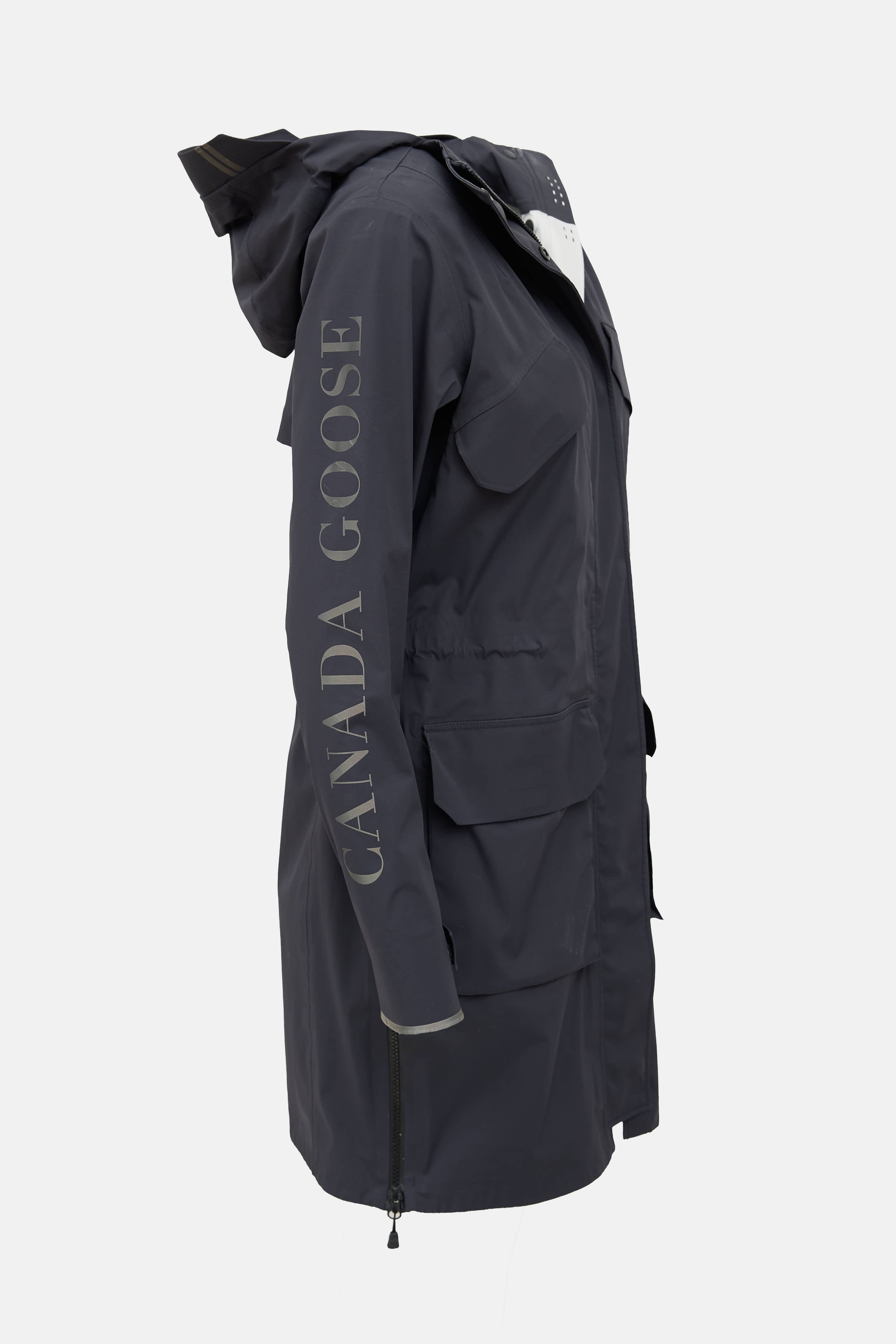 Pre-owned Canada Goose black Seaboard rain jacket featuring attached hood, stand collar, double zip front, flap pockets at front, zipped underarms, rubber patch on left sleeve and at back, logo at right sleeve, and interior drawstring at waist.