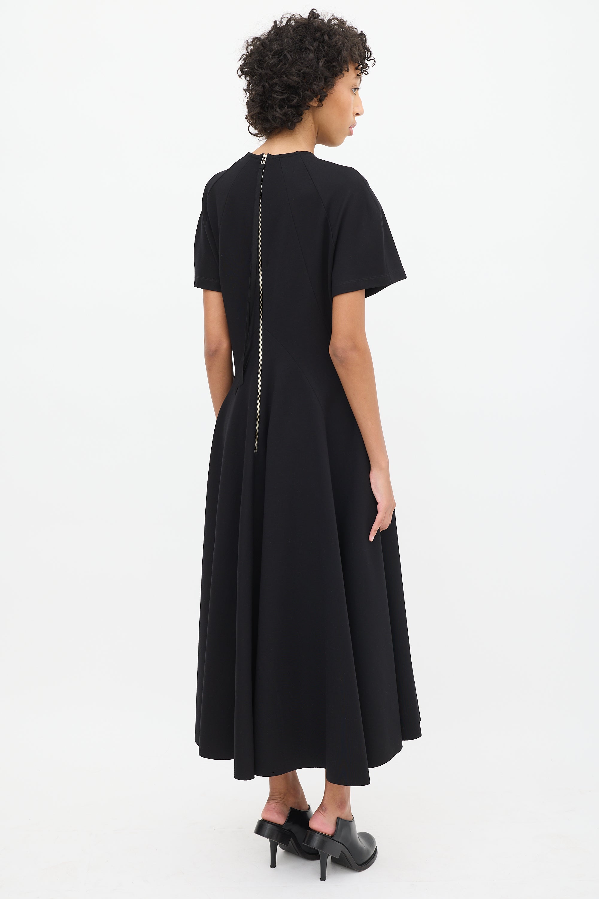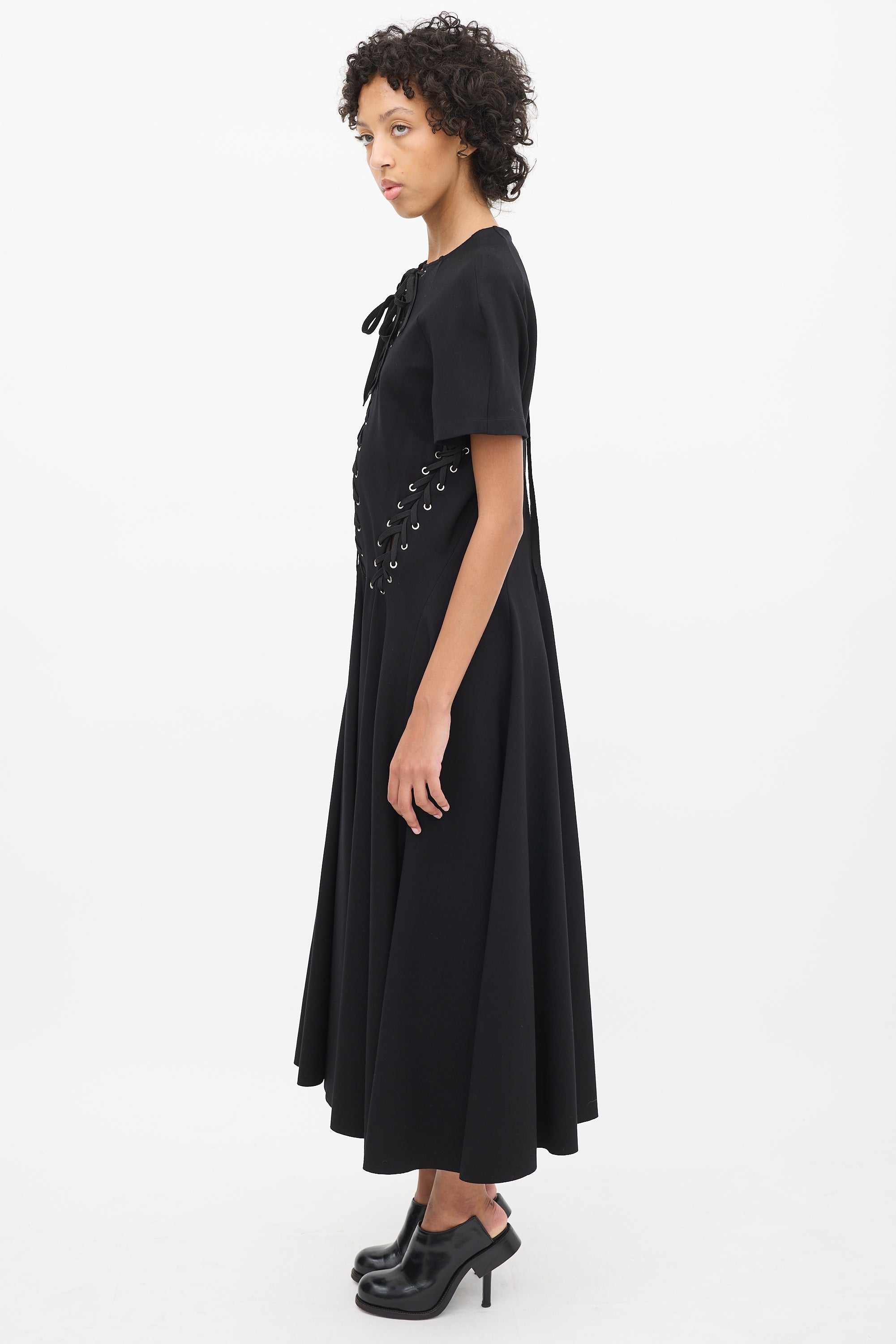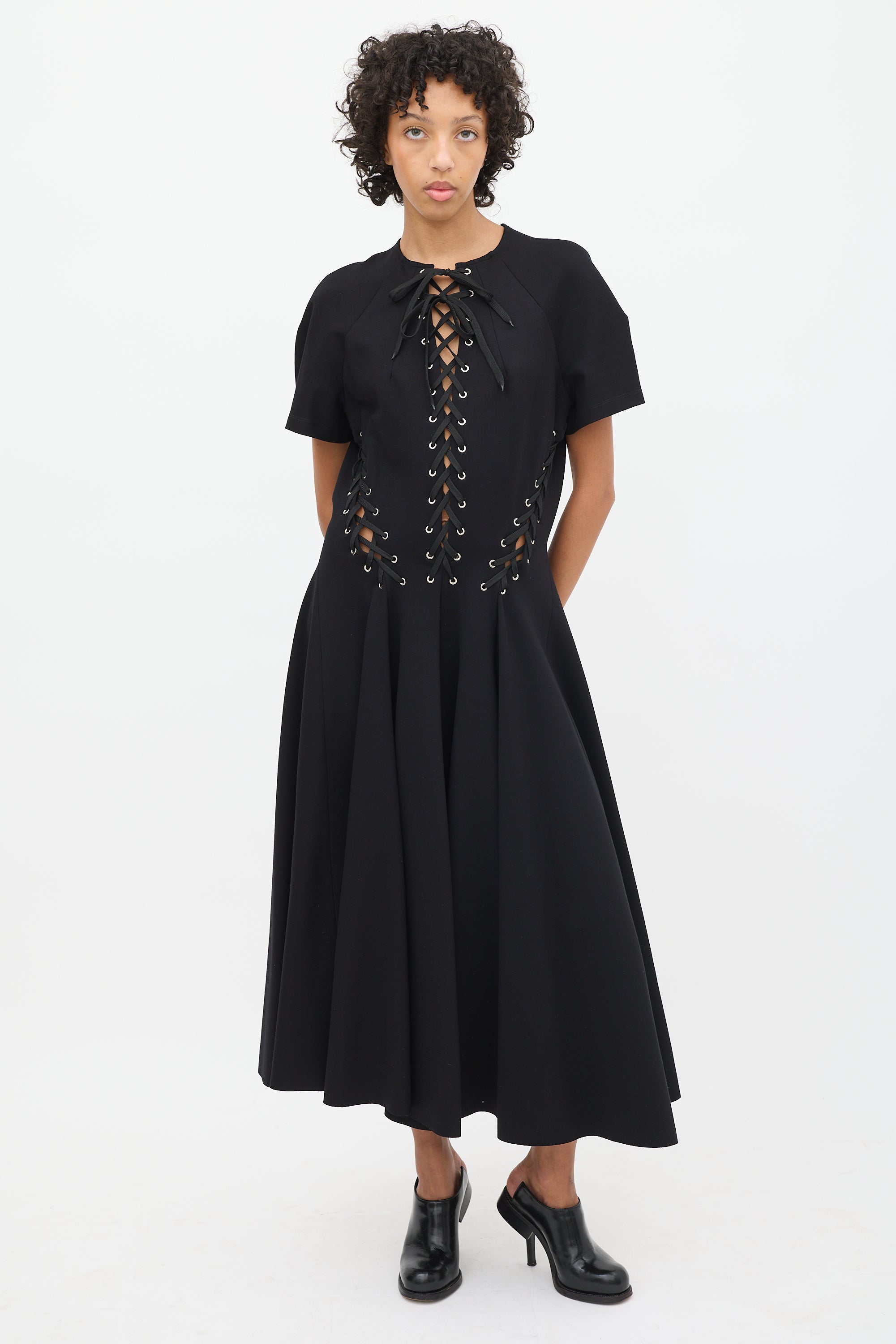 Pre-owned UNTTLD black midi dress featuring a round neckline, panelled construction, lace up detailing throughout upper, A-line skirt, short sleeves, and back zip.