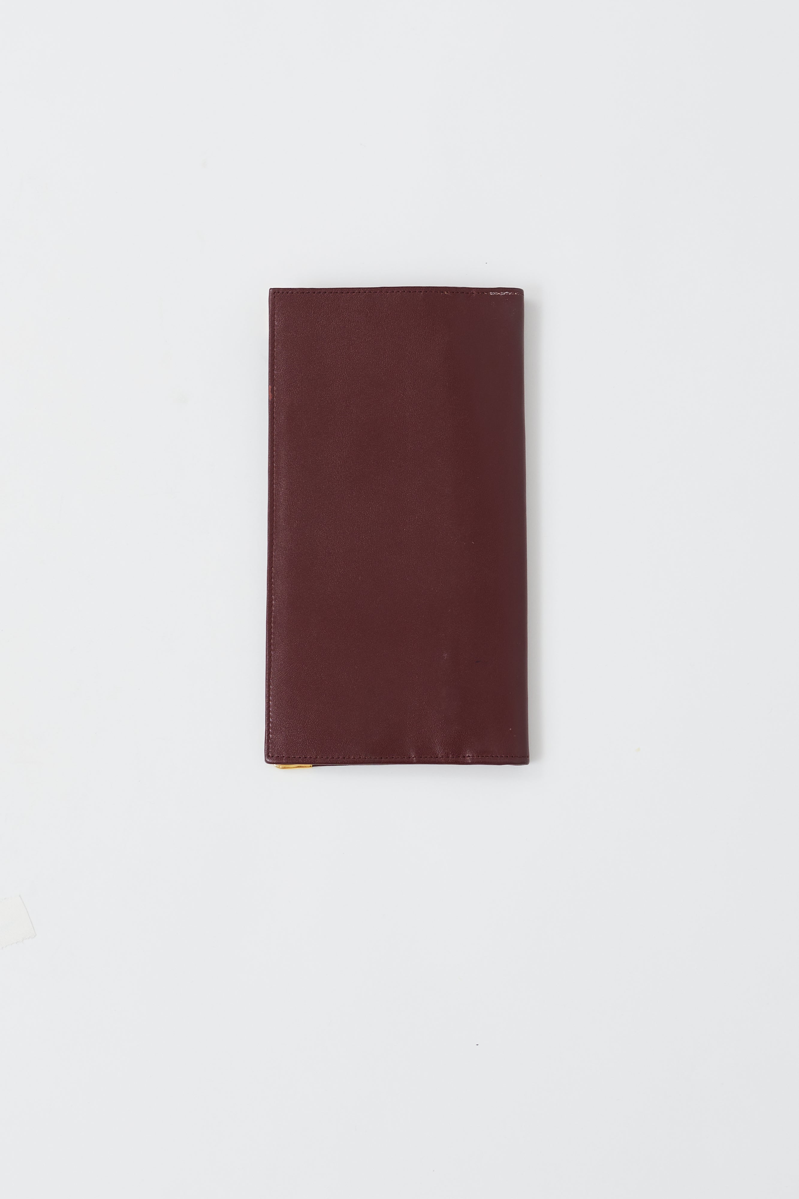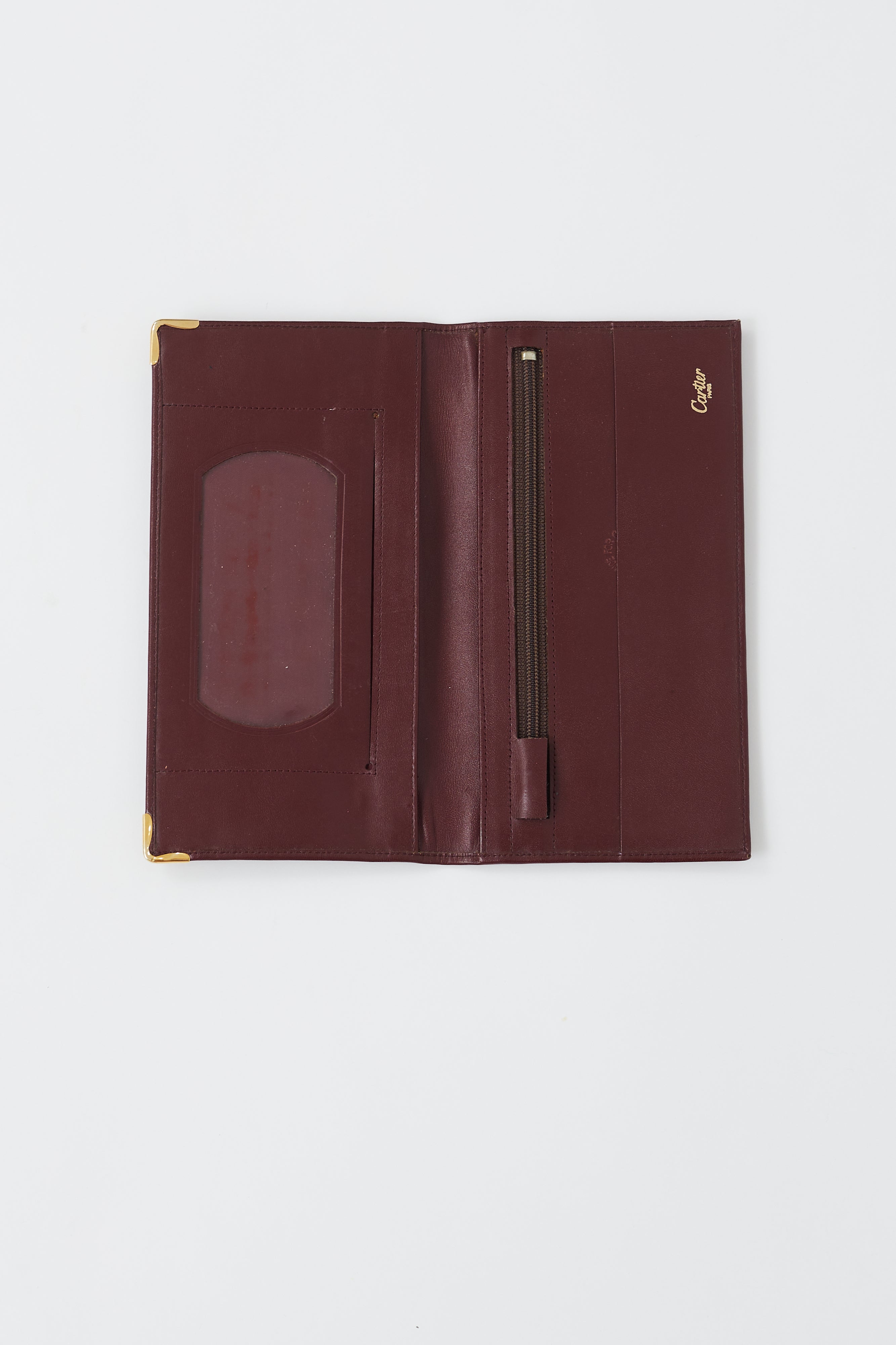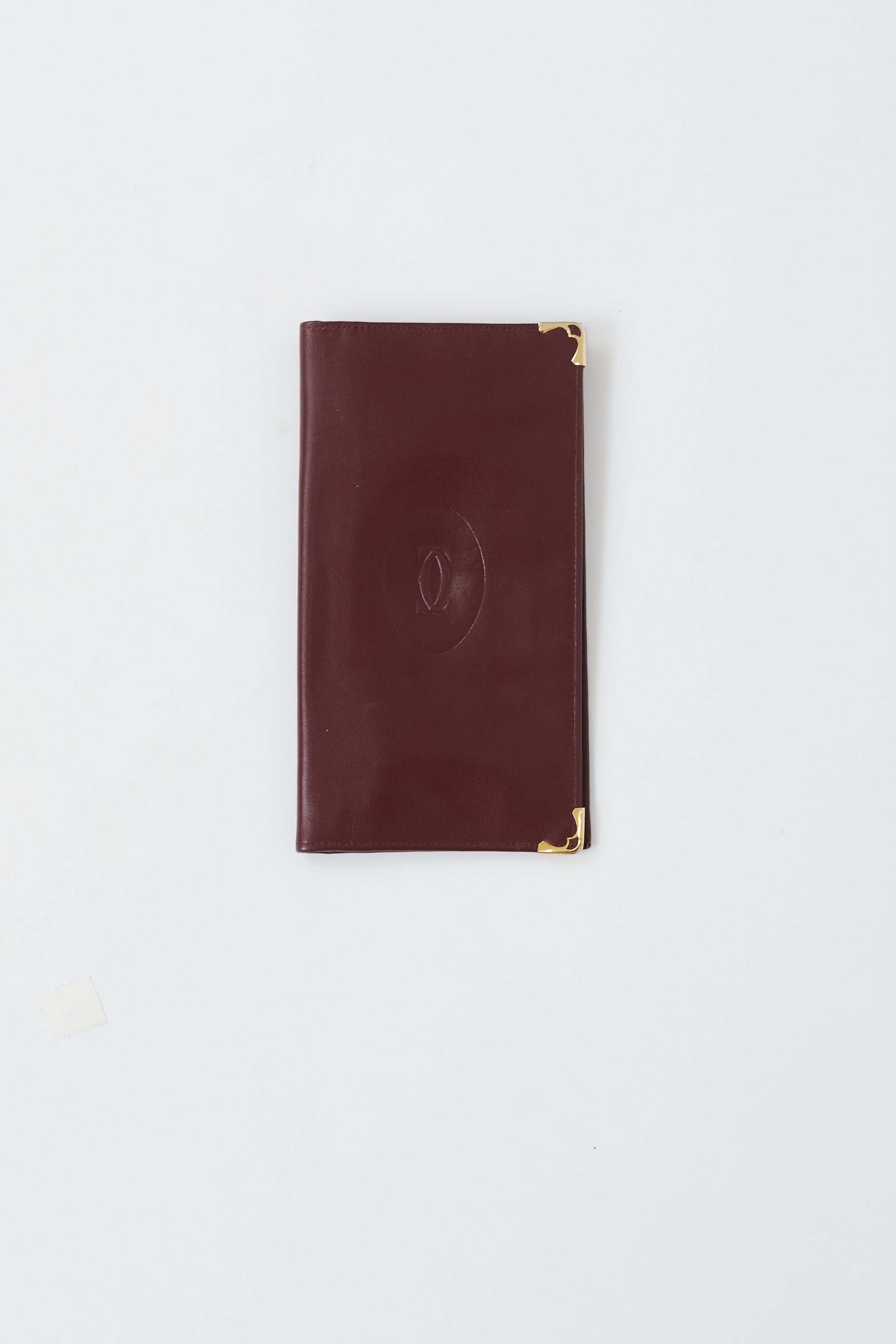 Pre-owned vintage Cartier burgundy leather card holder featuring gold tone metal trim at front, embossed logo at face, three slip pockets, one ID pocket, one zip pocket, and gold logo stamp inside.