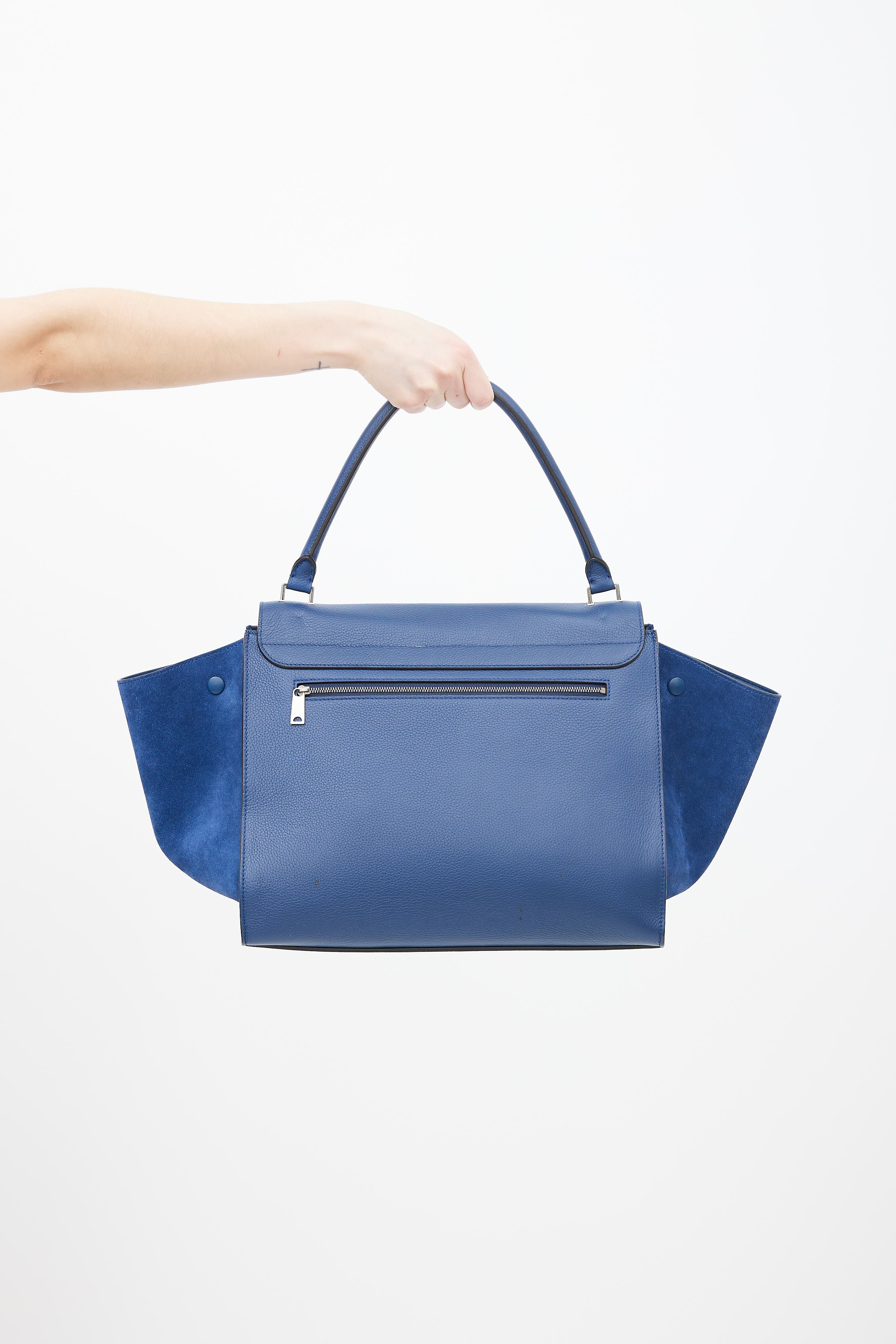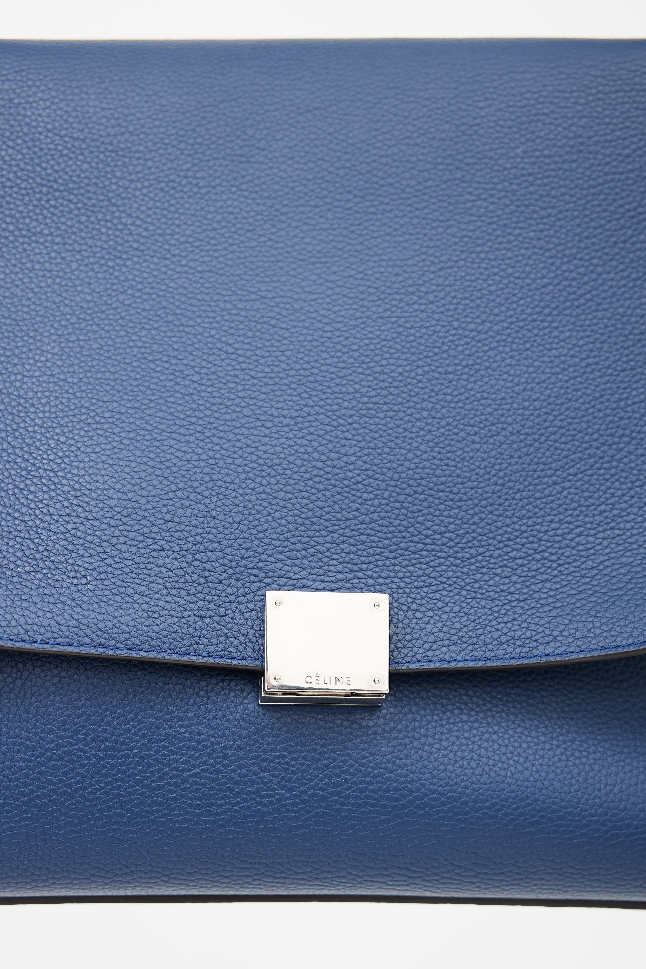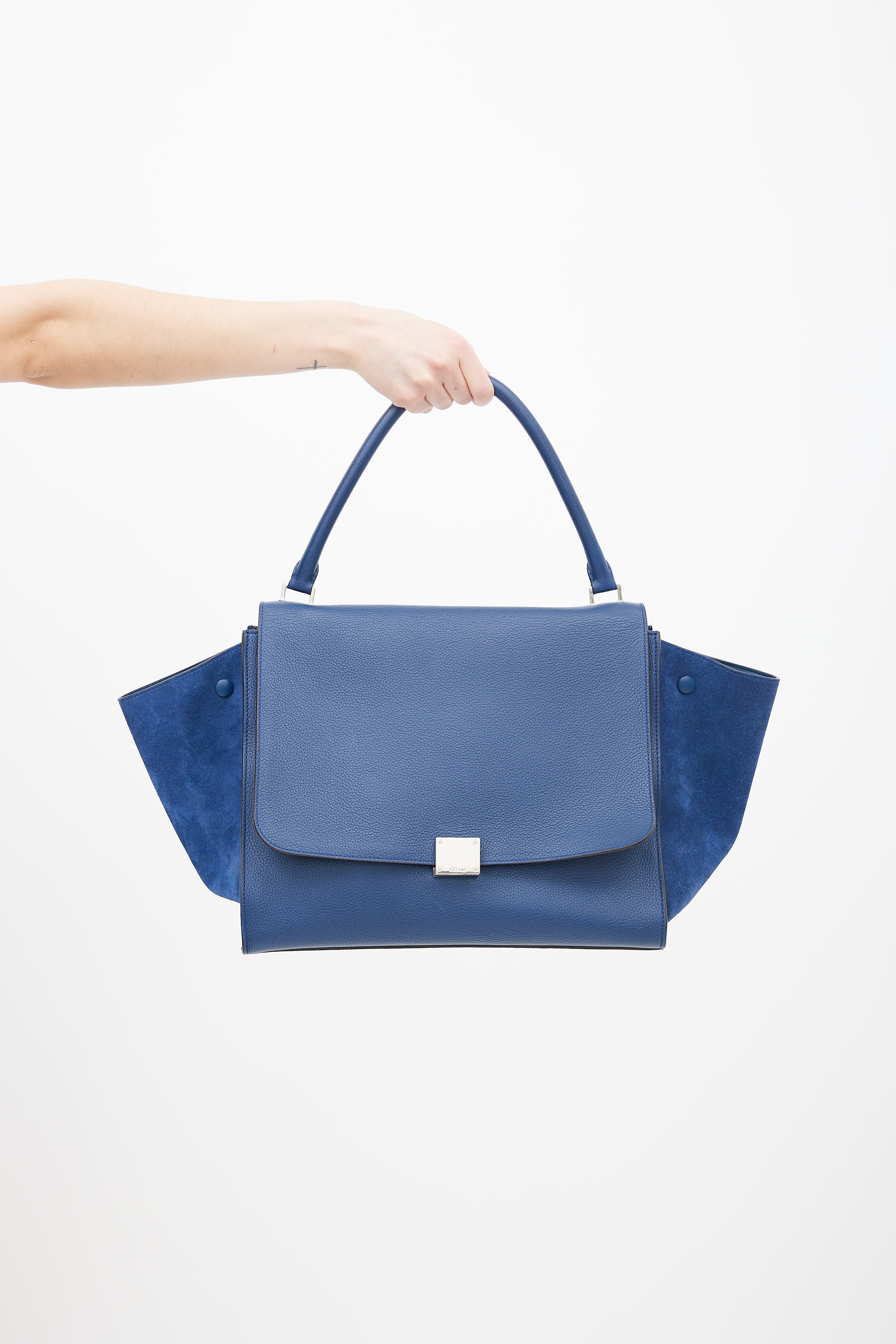 Pre-owned Celine Trapeze bag in blue featuring structured top handle, top flap with clasp closure, silver tone hardware, top zip closure, expandable side wings with snap button fastening, zip pocket at back, single main compartment, two slot pockets, and silver tone logo stamp under flap.