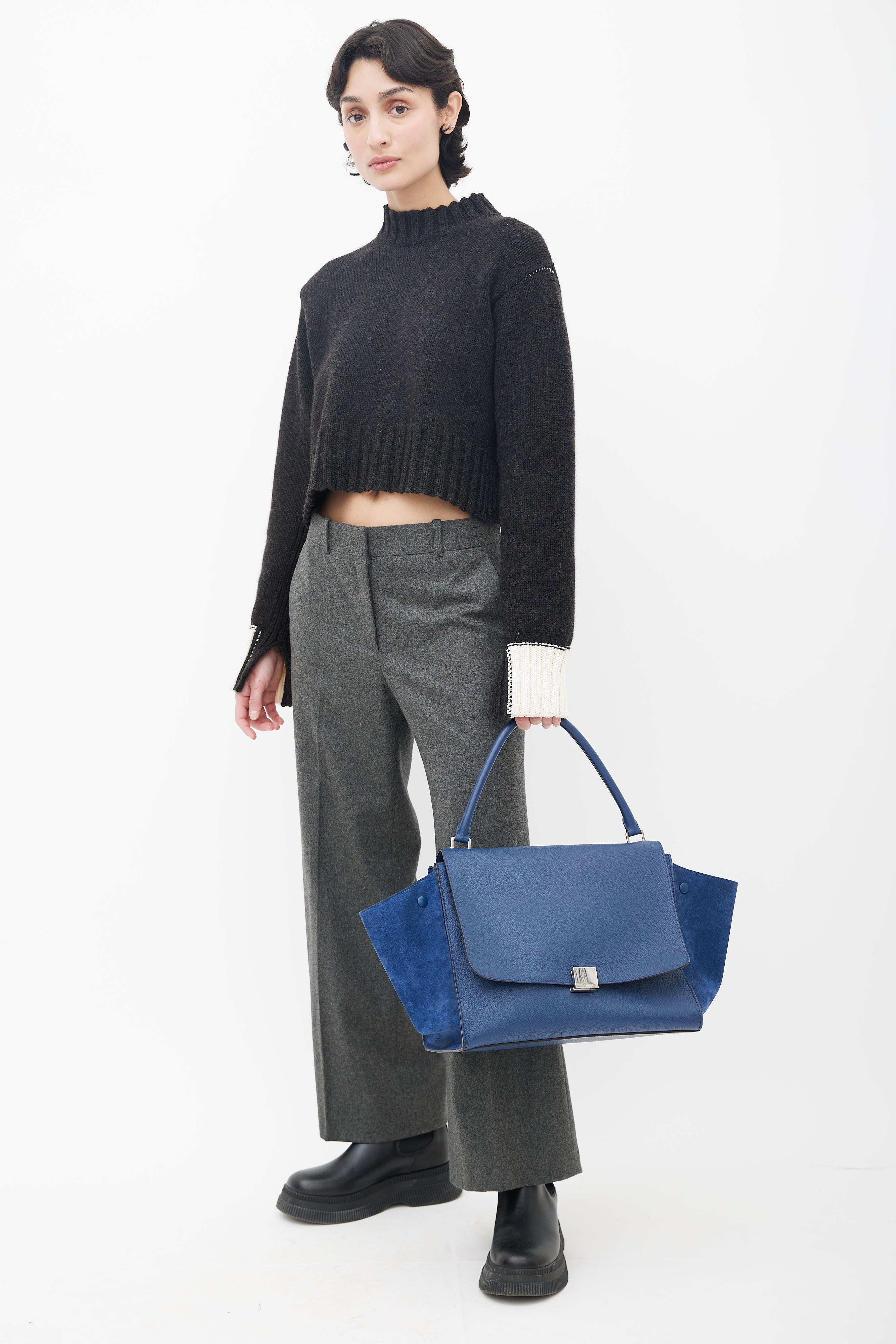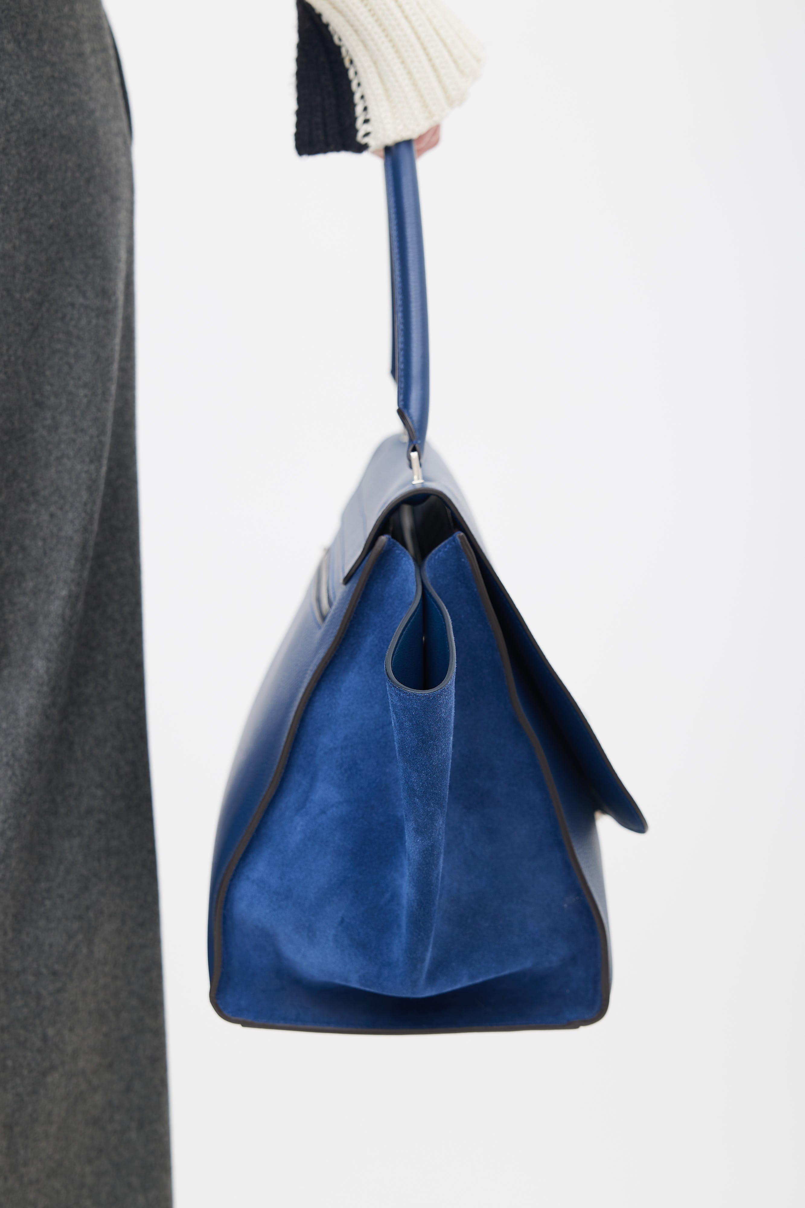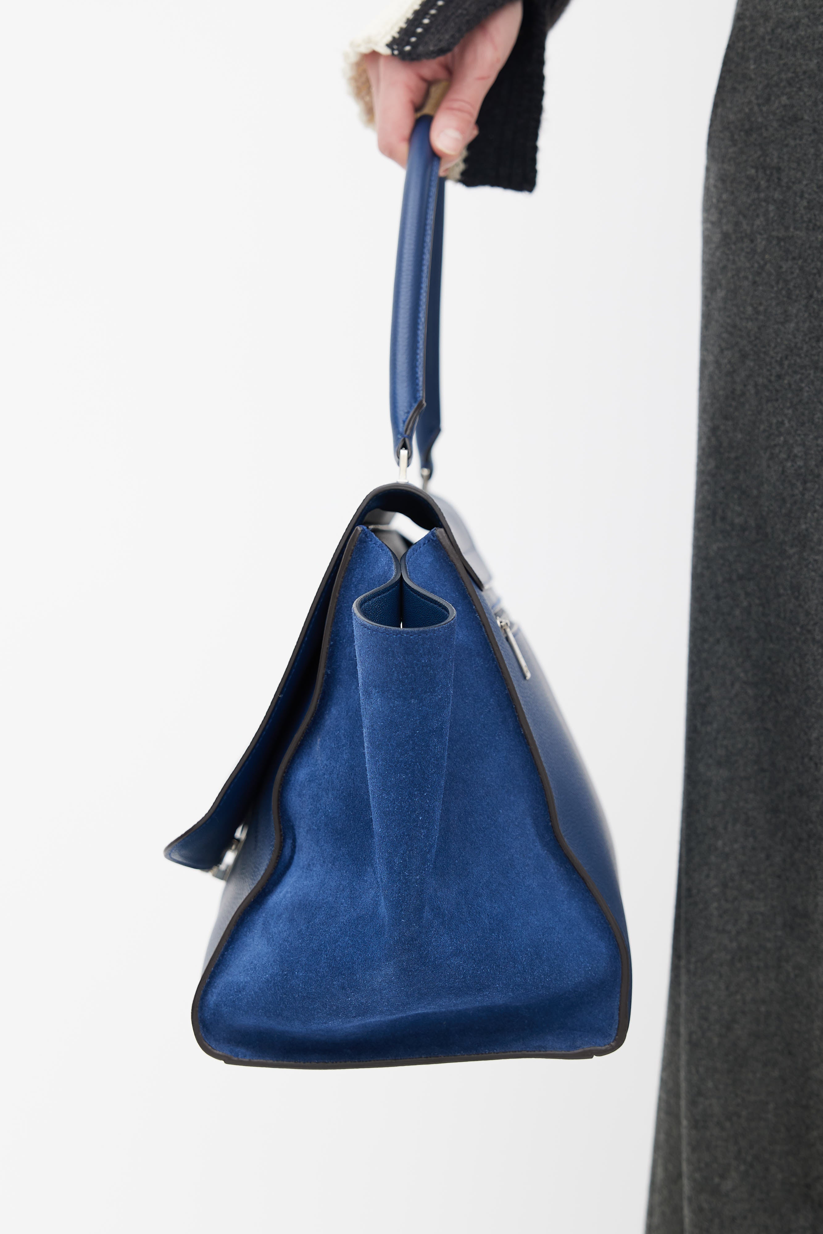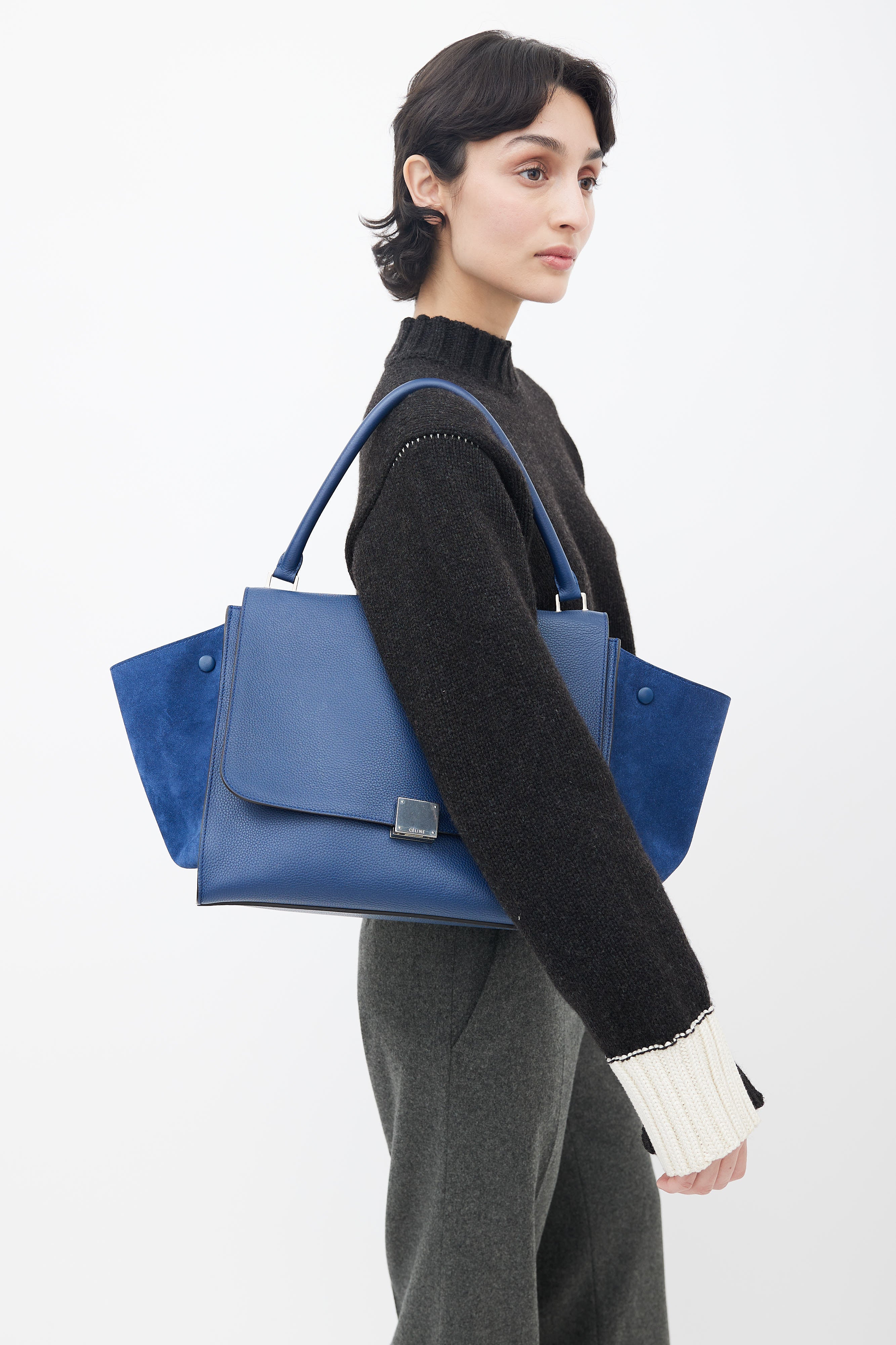 Pre-owned Celine Trapeze bag in blue featuring structured top handle, top flap with clasp closure, silver tone hardware, top zip closure, expandable side wings with snap button fastening, zip pocket at back, single main compartment, two slot pockets, and silver tone logo stamp under flap.