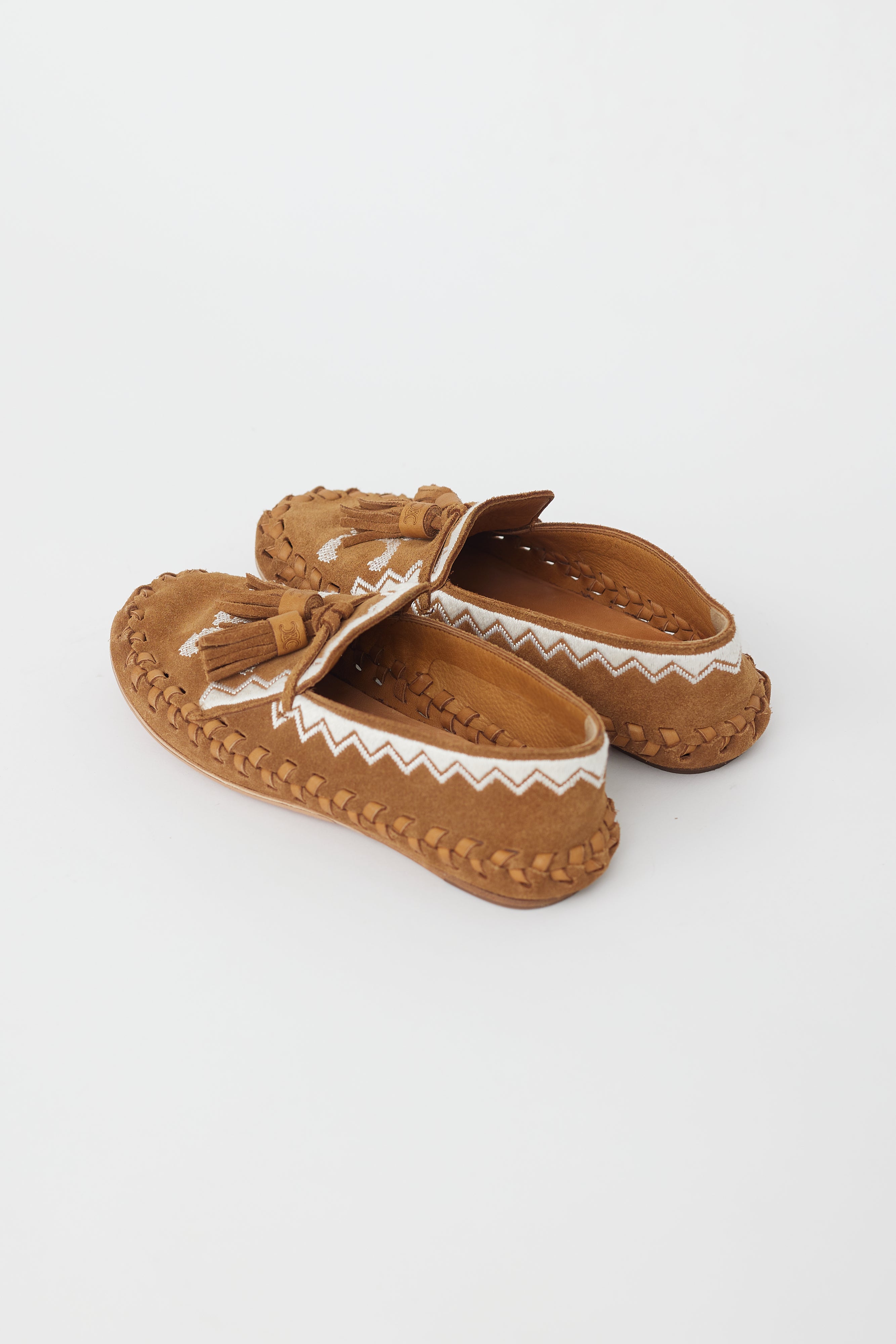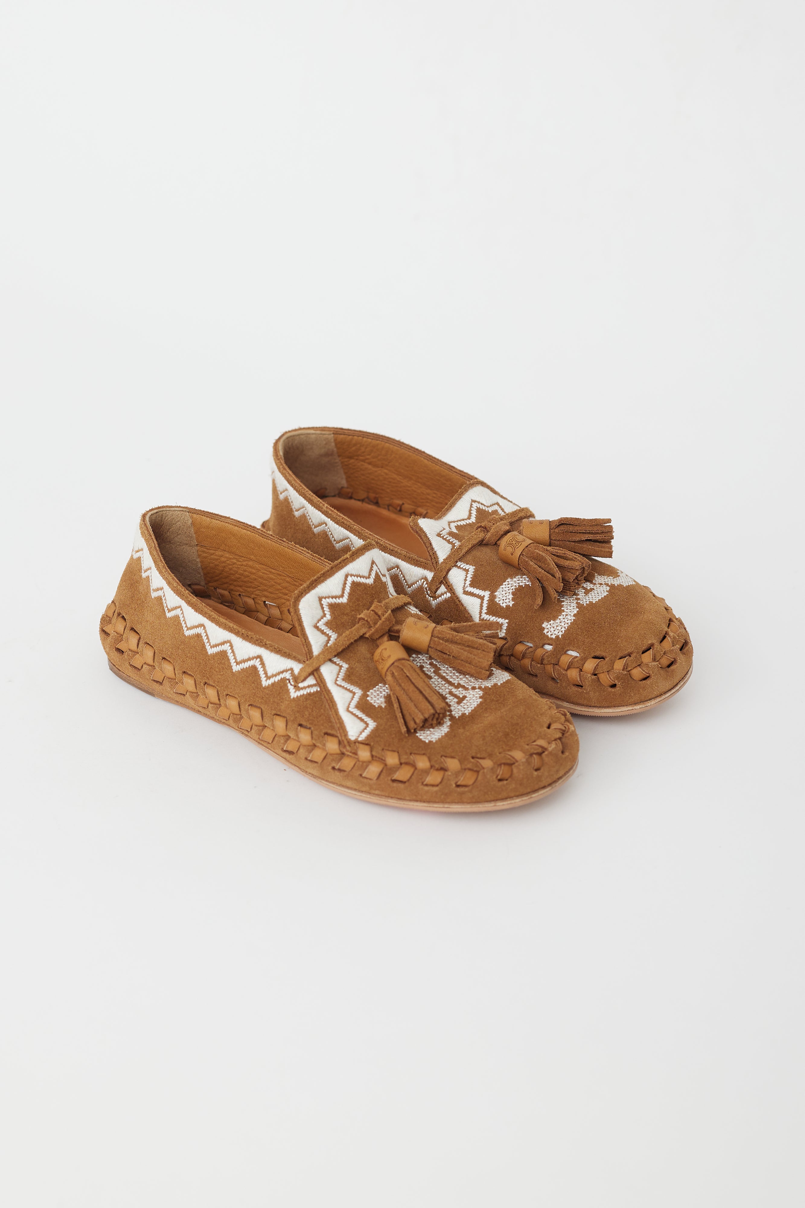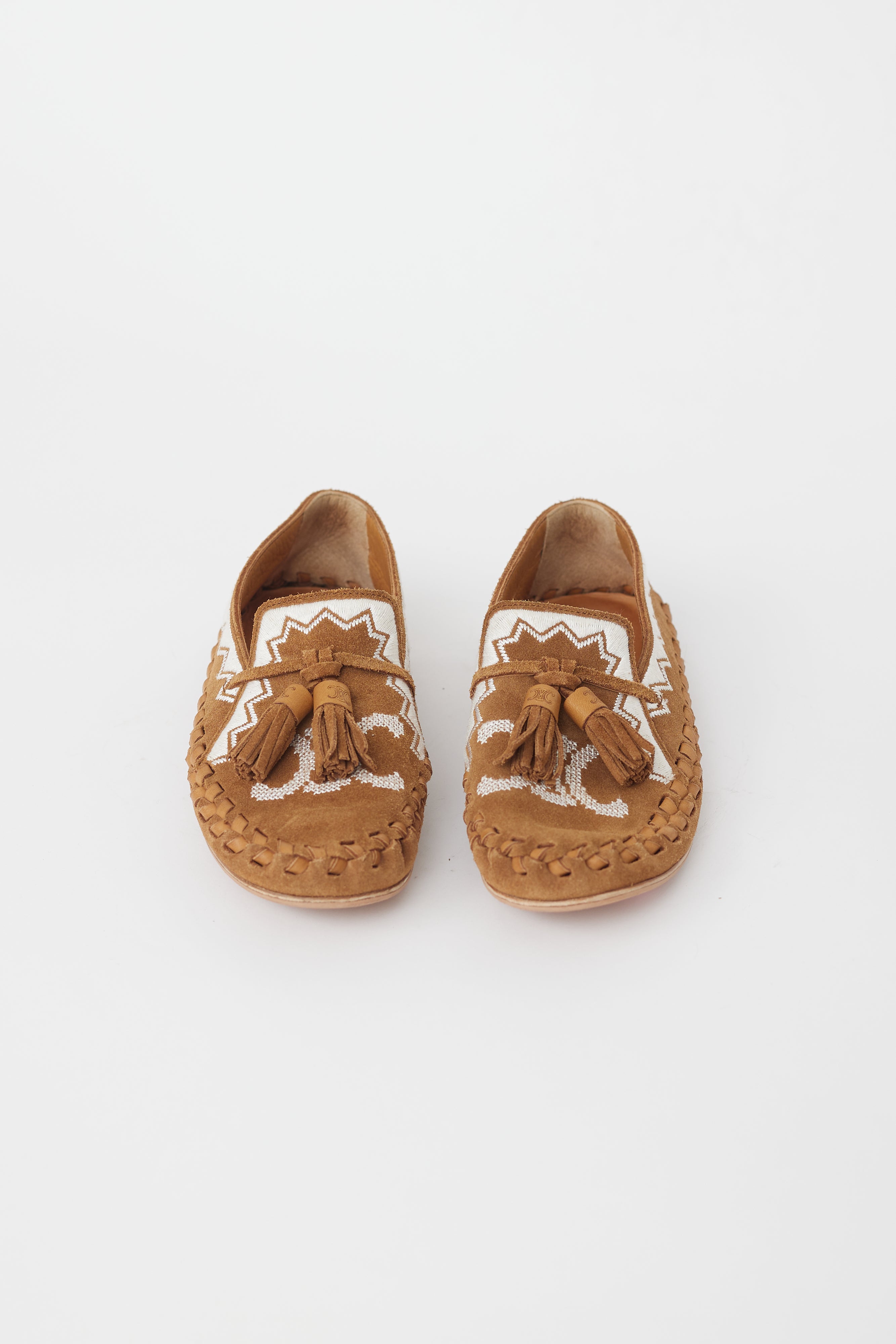 Pre-owned Celine brown suede Marlou moccasin flats featuring rounded toe, braided trim, white embroidered trim and Triomphe logo throughout, slip on entry, and tassel fringe at front with logo. Comes with original dust bag.
