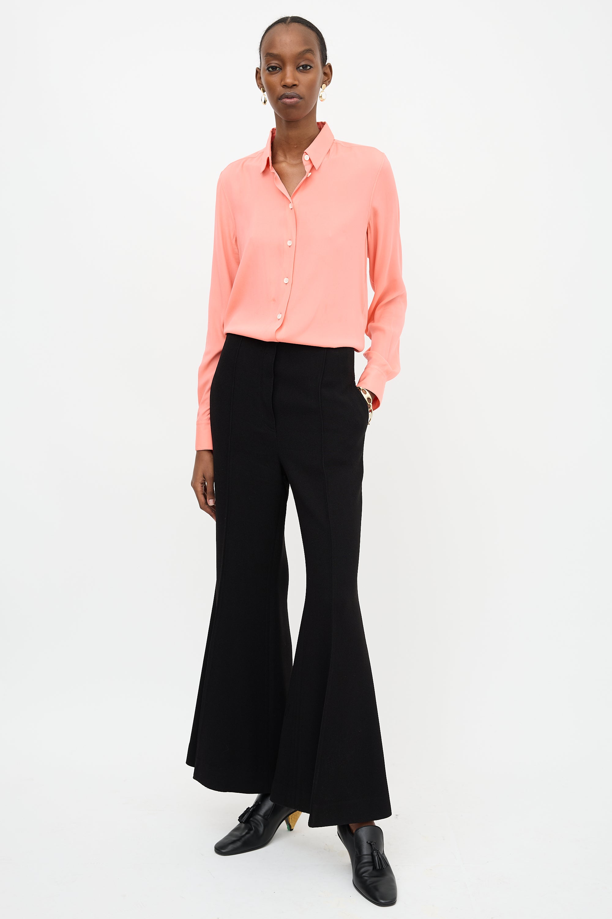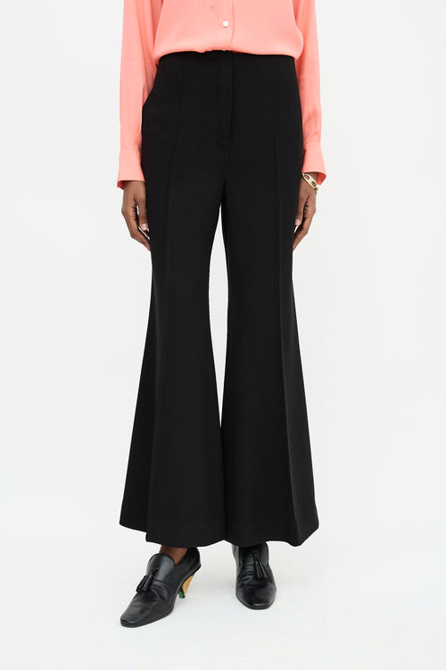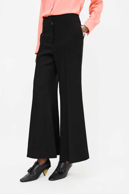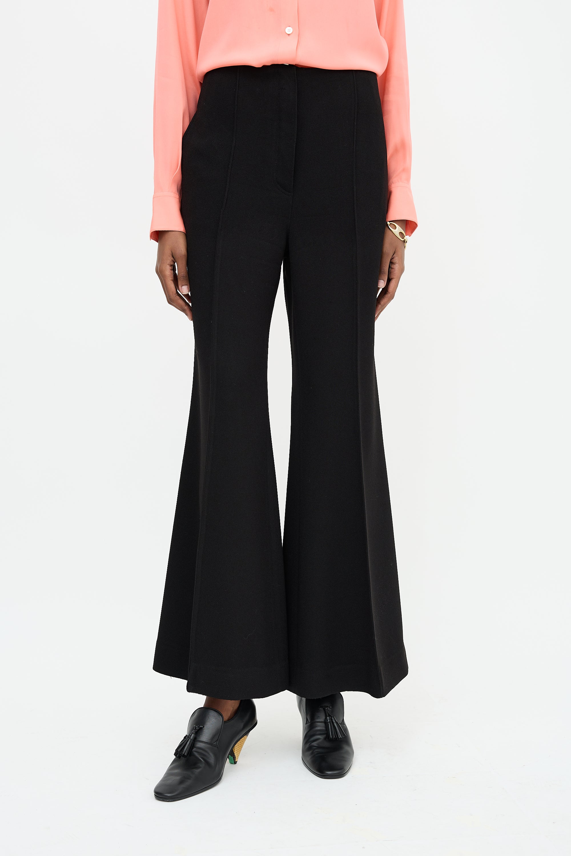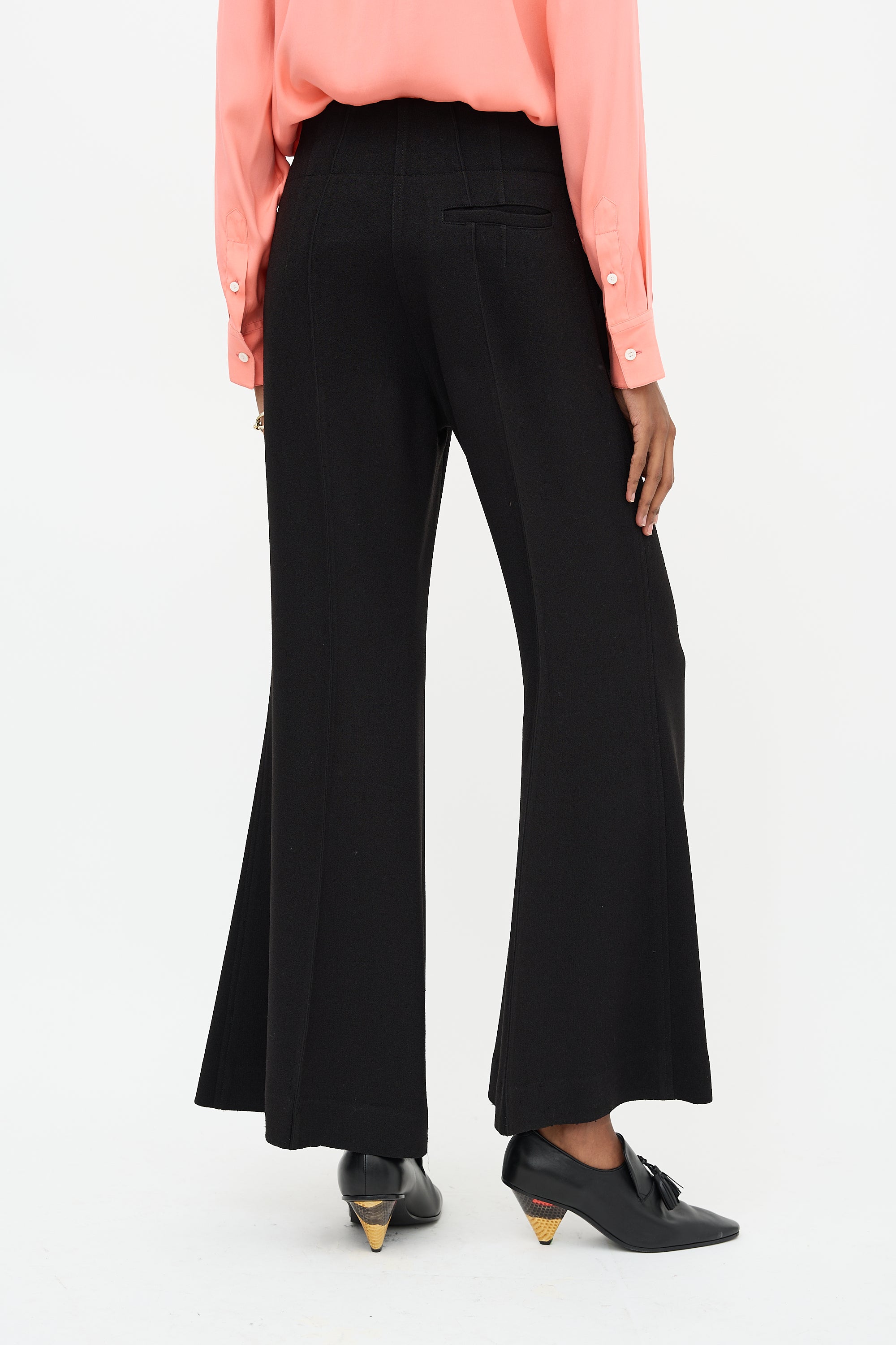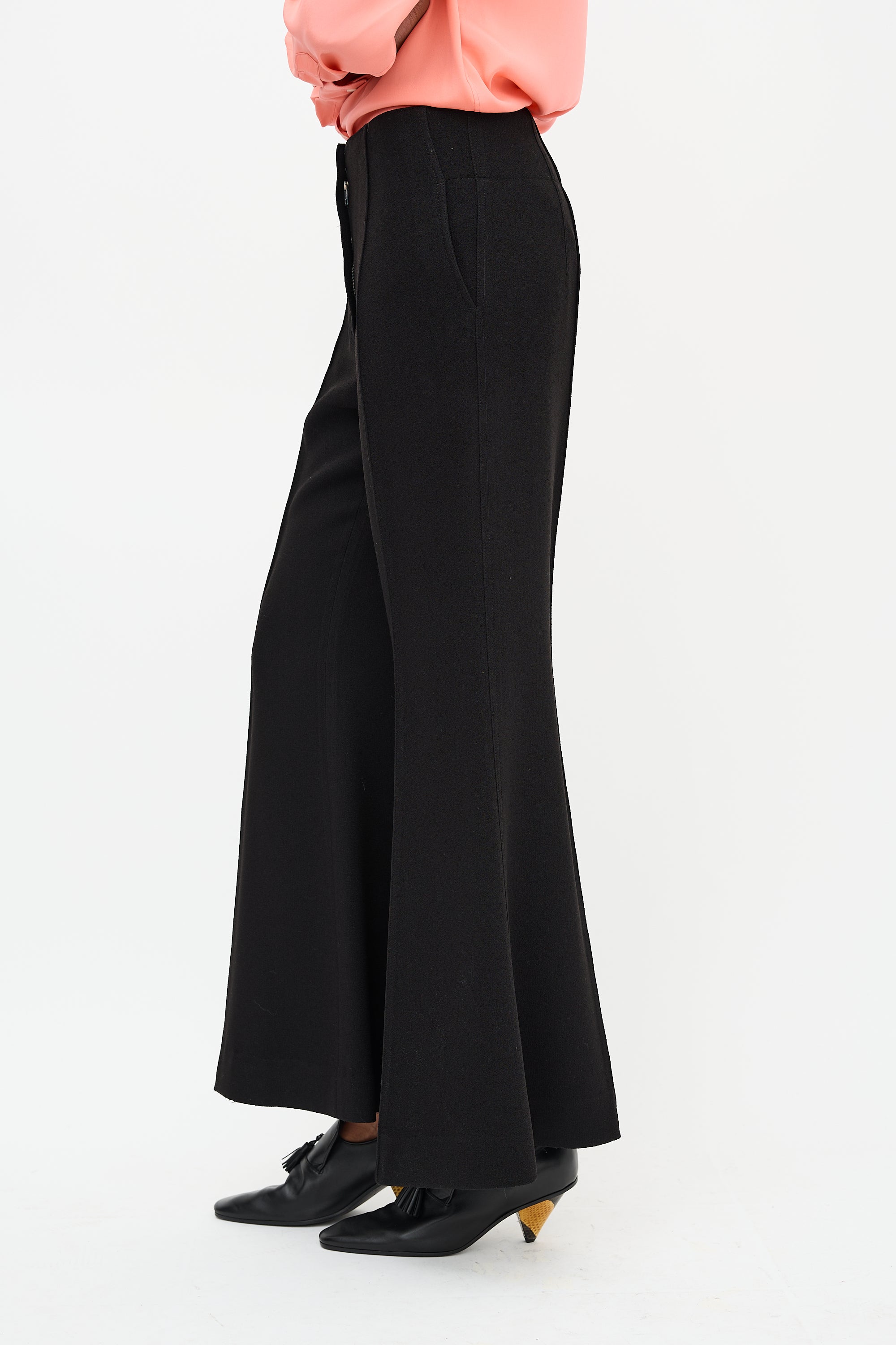 Pre-owned Celine black trousers featuring a zip fly with hook fastening, two slash pockets at hip, one welt pocket at back, seam piping down leg, and a wide flared leg.